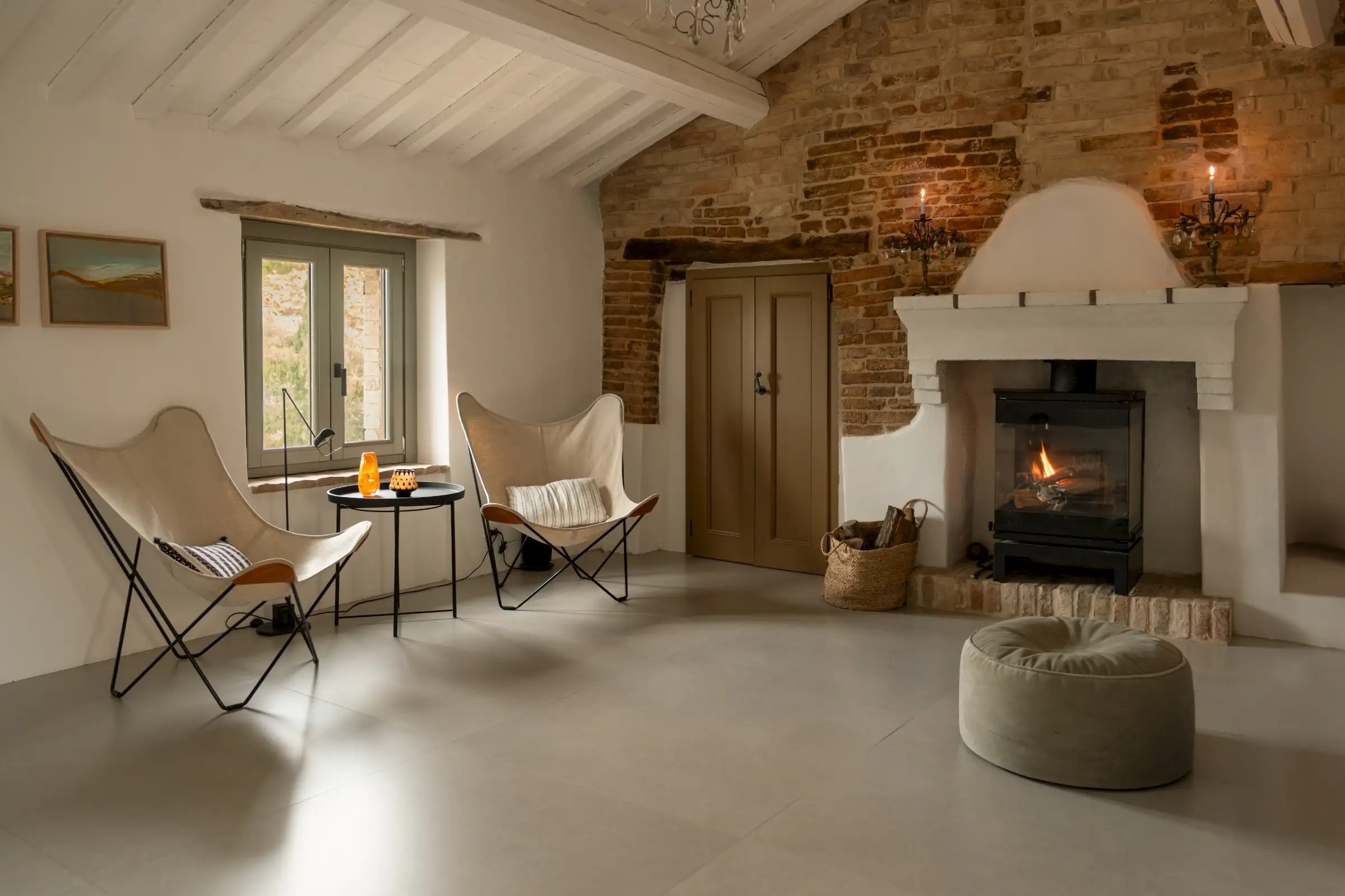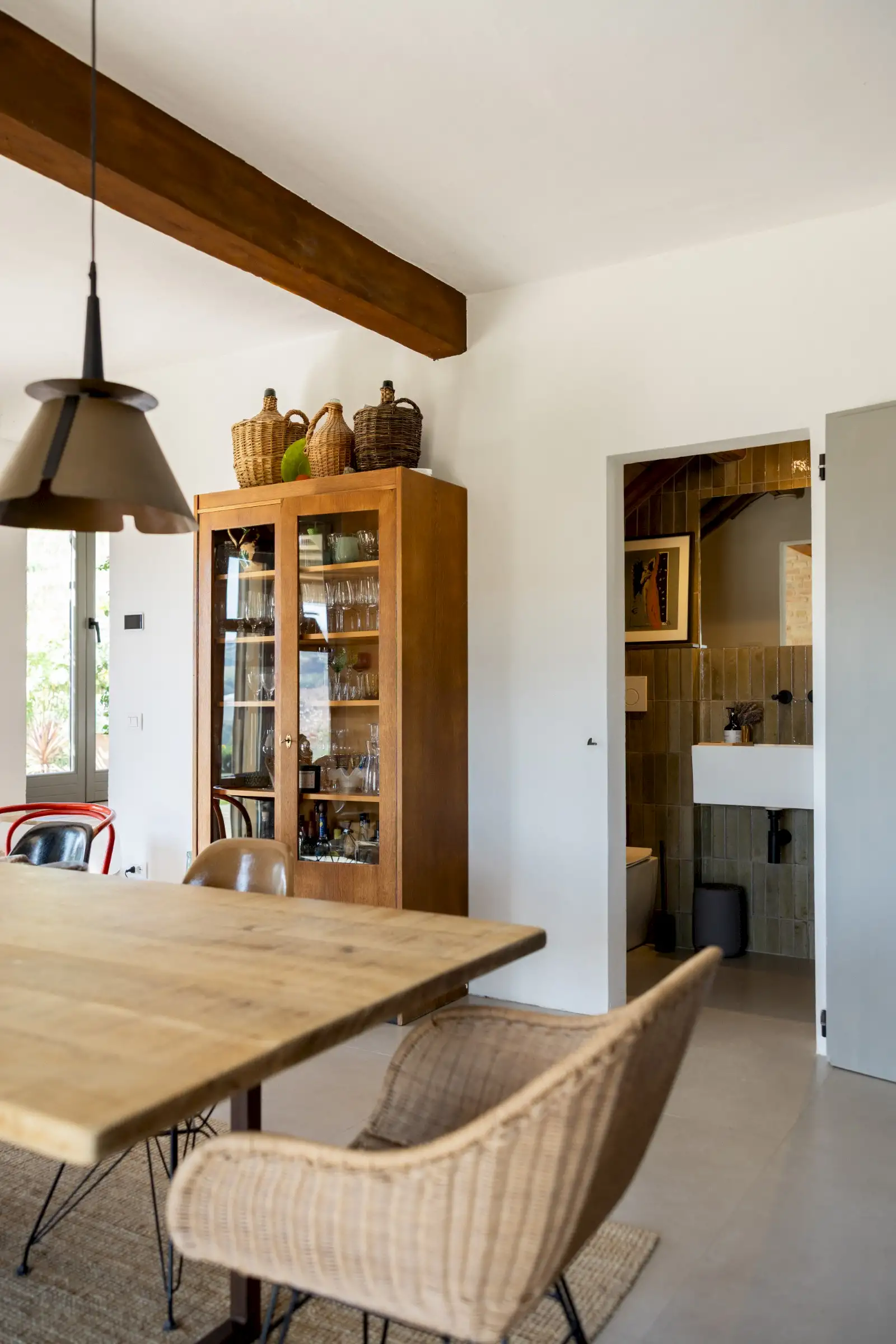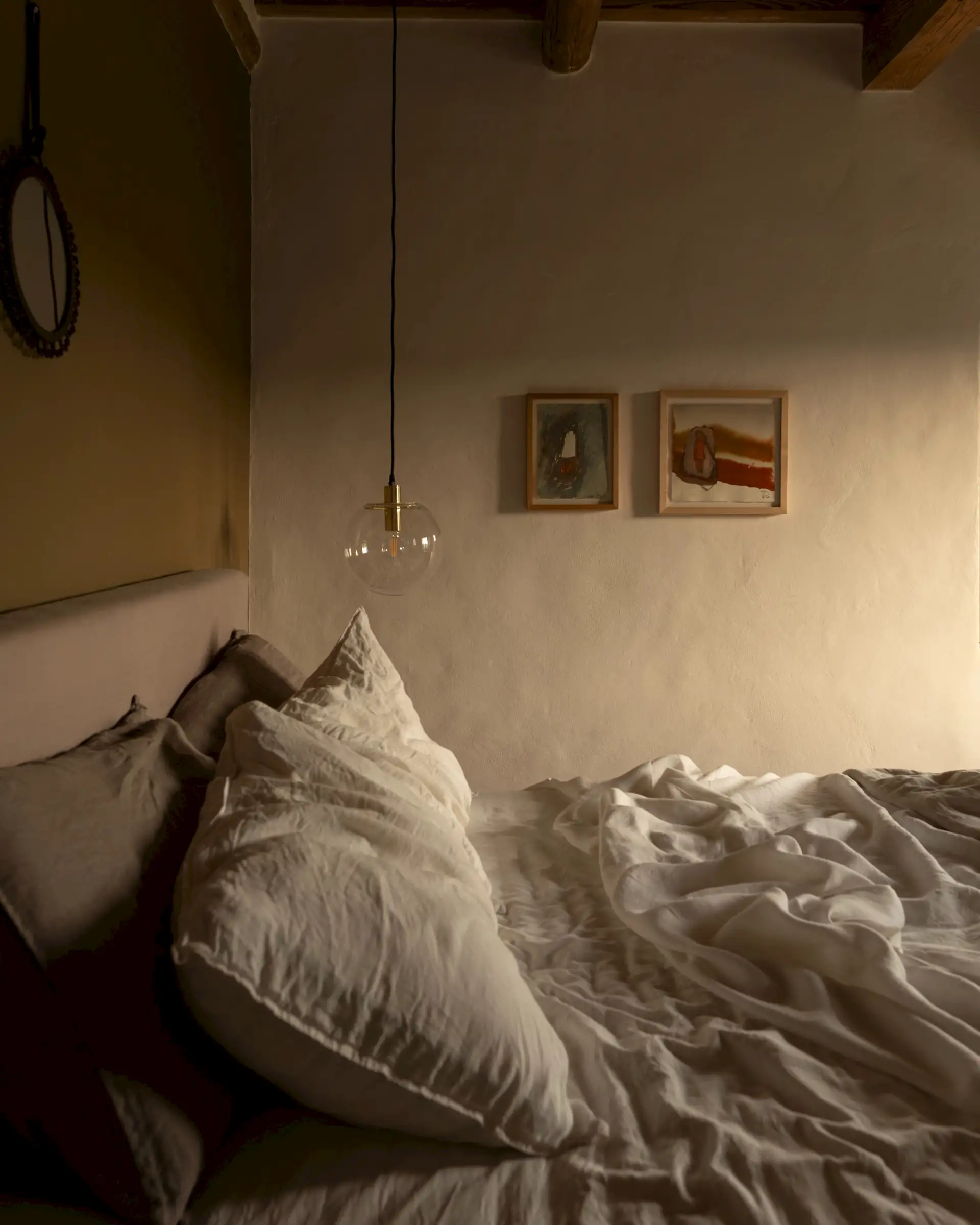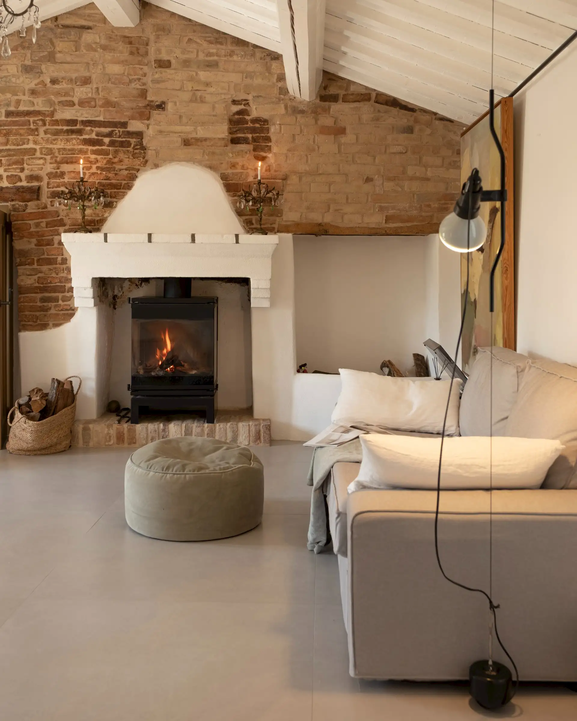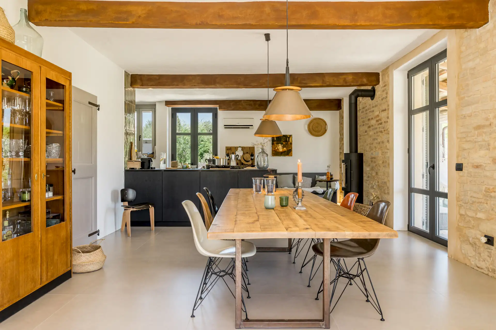 Everything that could be preserved was, including the beamed ceilings and rough stone walls. Vintage finds, handcrafted furniture and original artwork followed. Then in came the new: sleek concrete floors with underfloor heating, local tiles and select design pieces by Kartell, Casa Lumi and Charles Eames.
