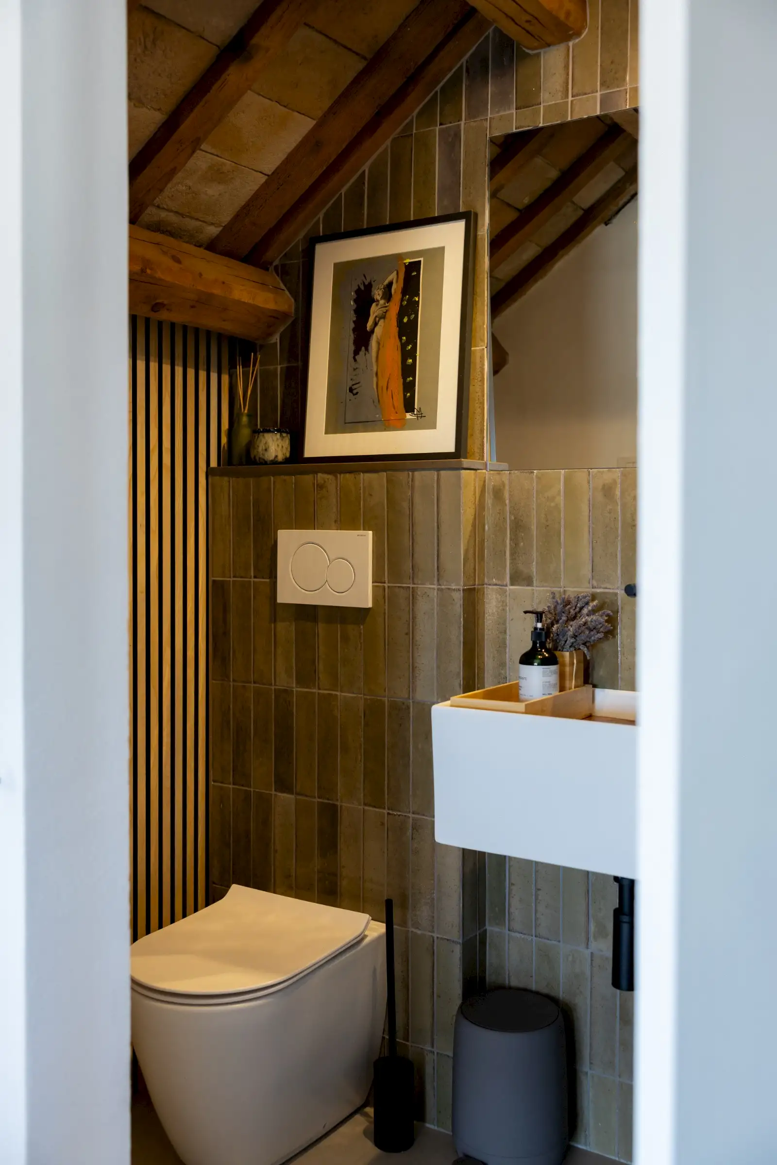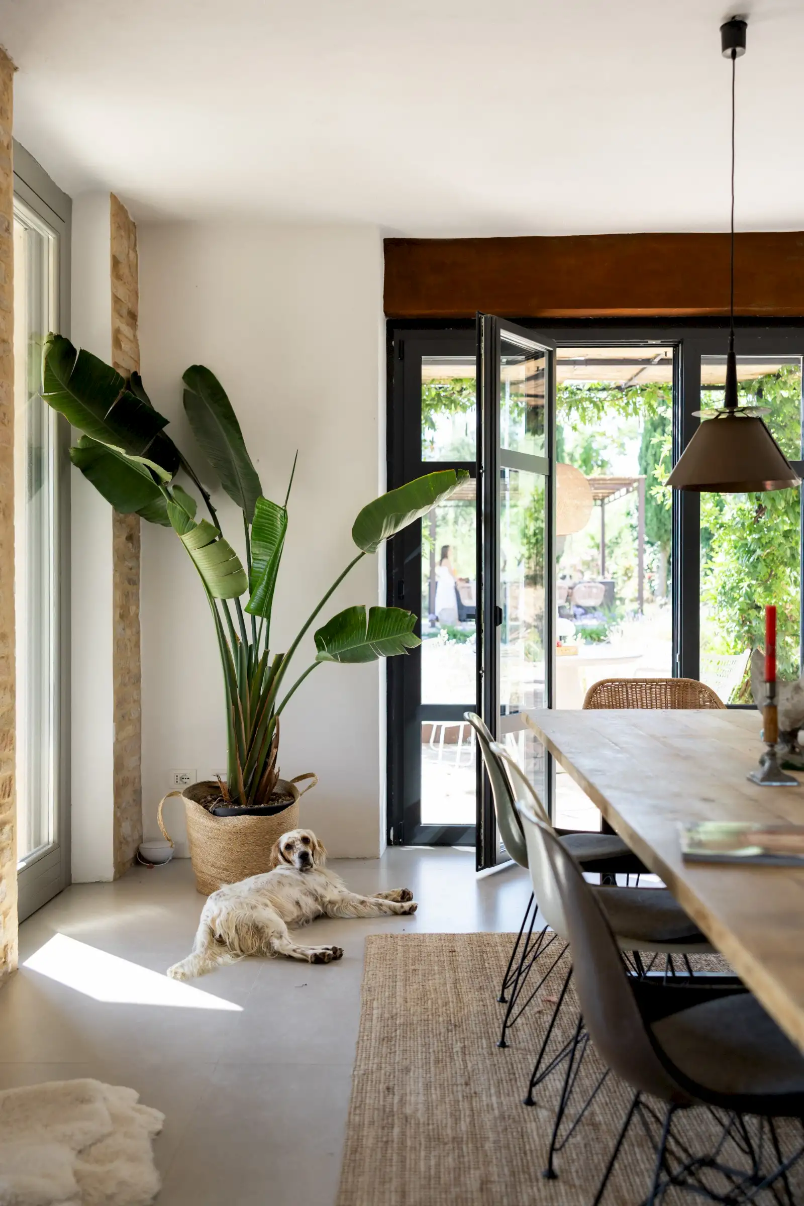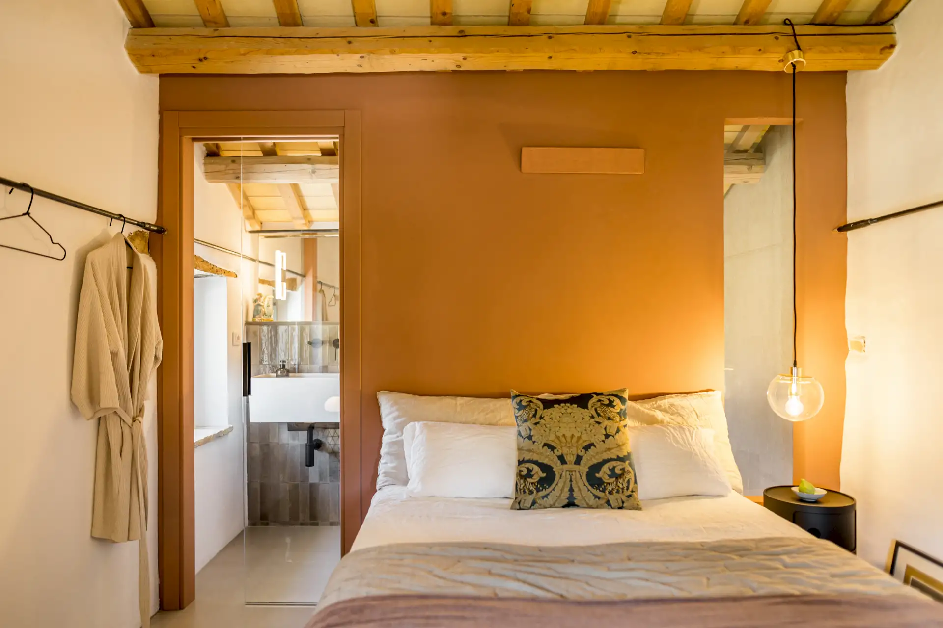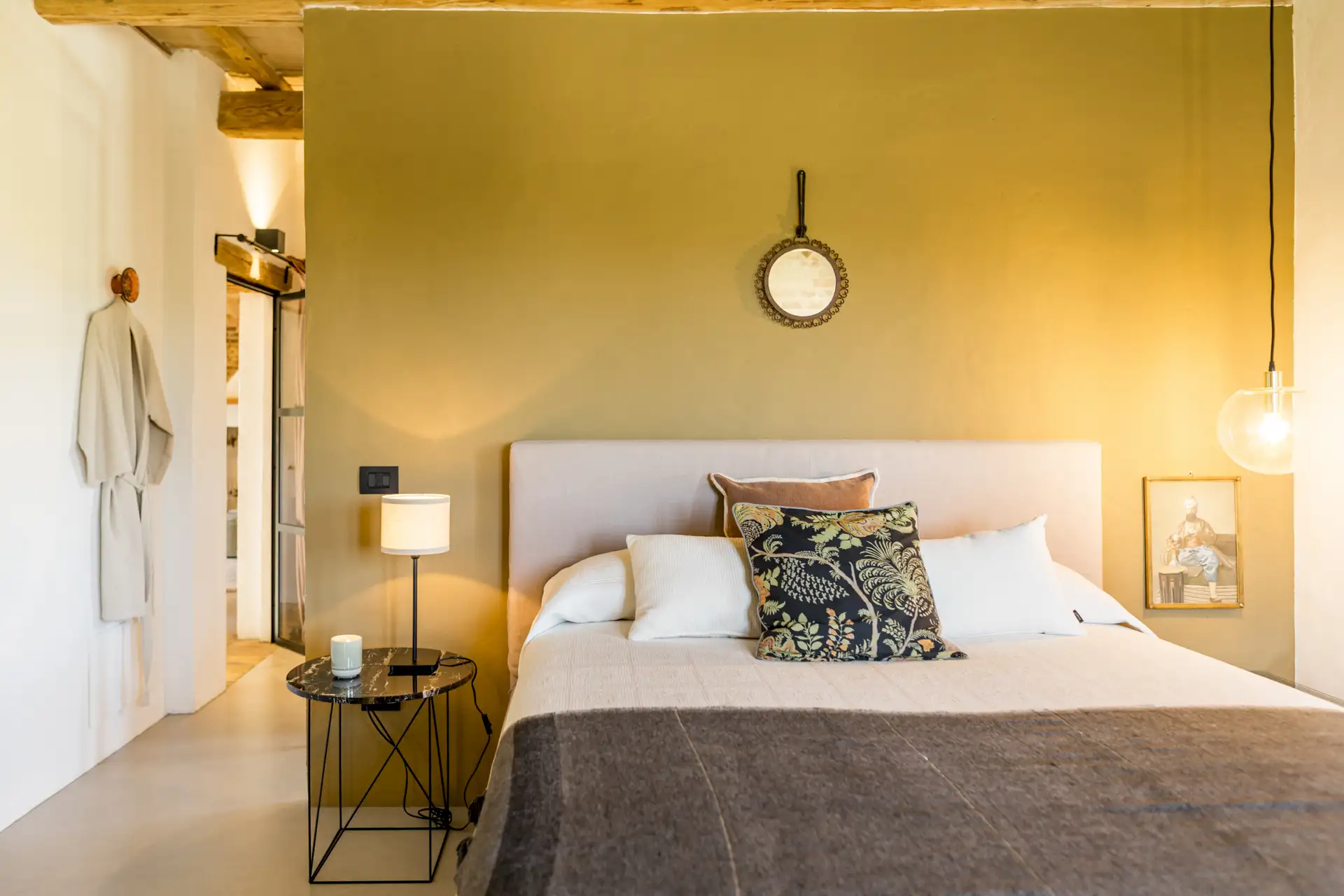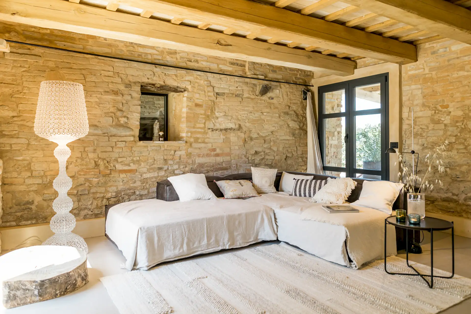 Everything that could be preserved was, including the beamed ceilings and rough stone walls. Vintage finds, handcrafted furniture and original artwork followed. Then in came the new: sleek concrete floors with underfloor heating, local tiles and select design pieces by Kartell, Casa Lumi and Charles Eames.