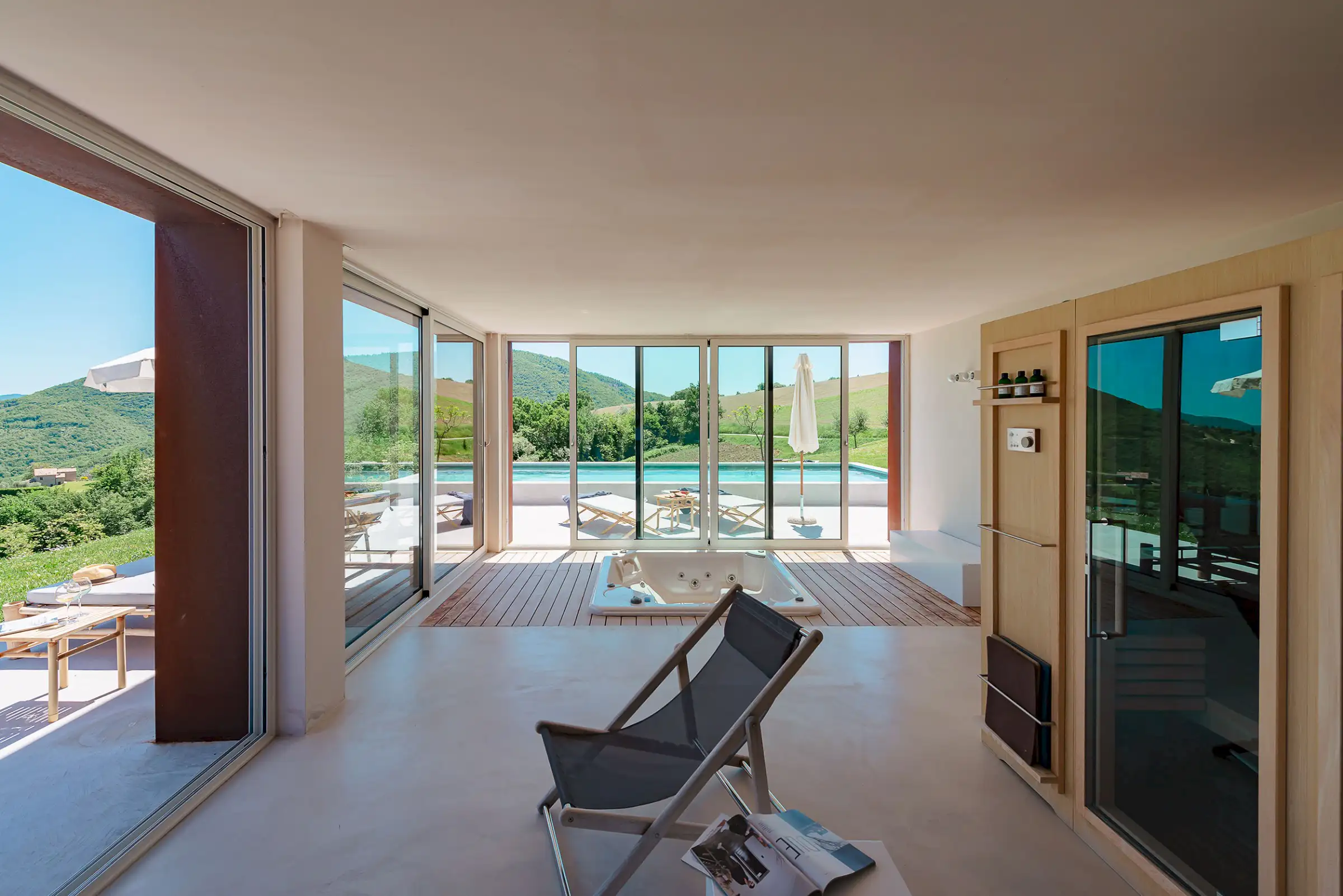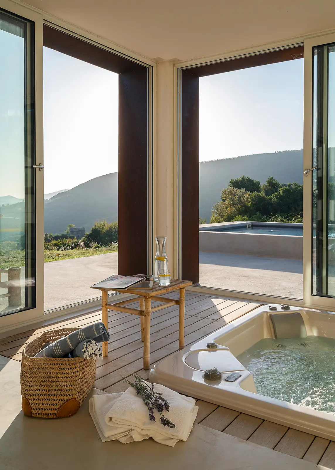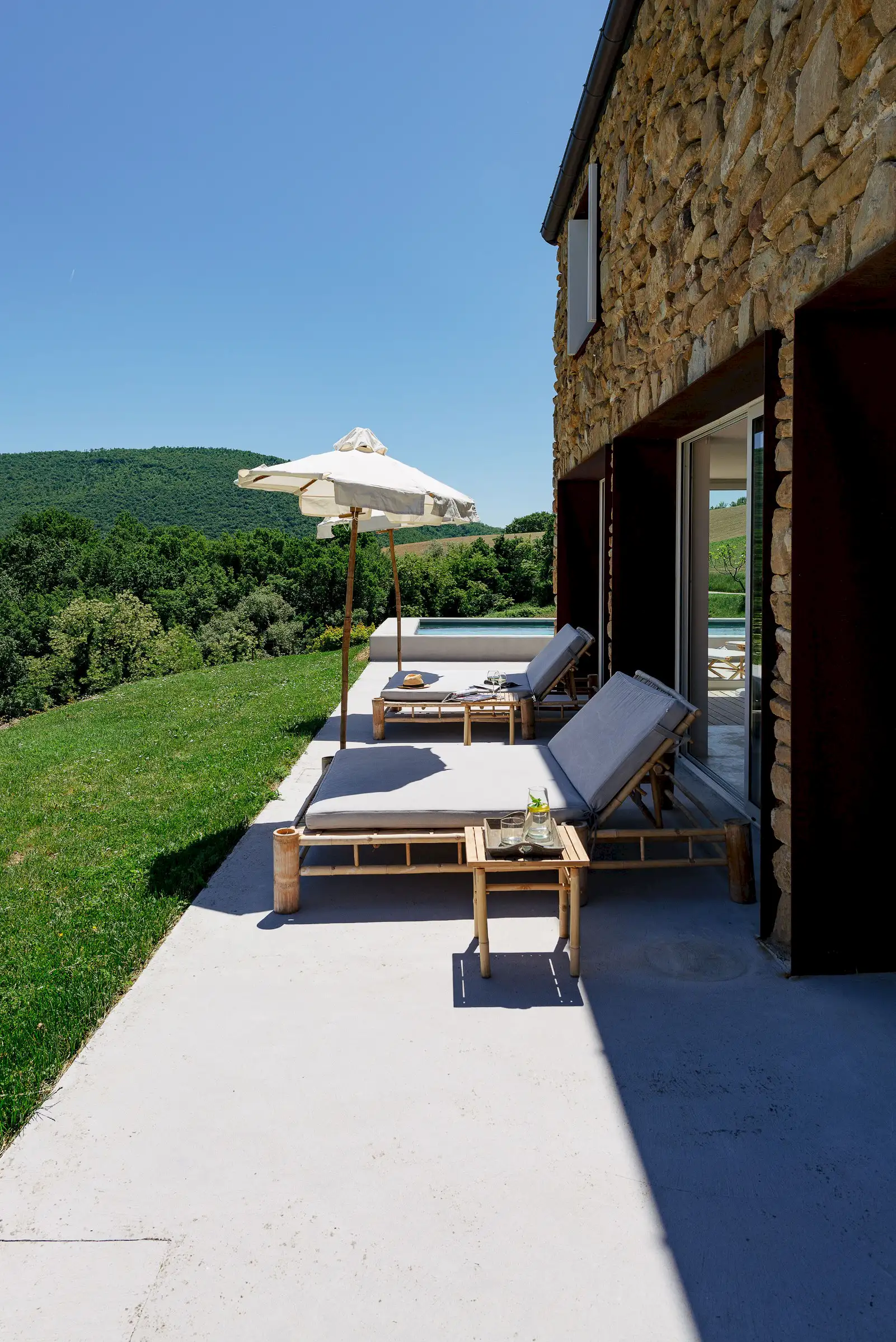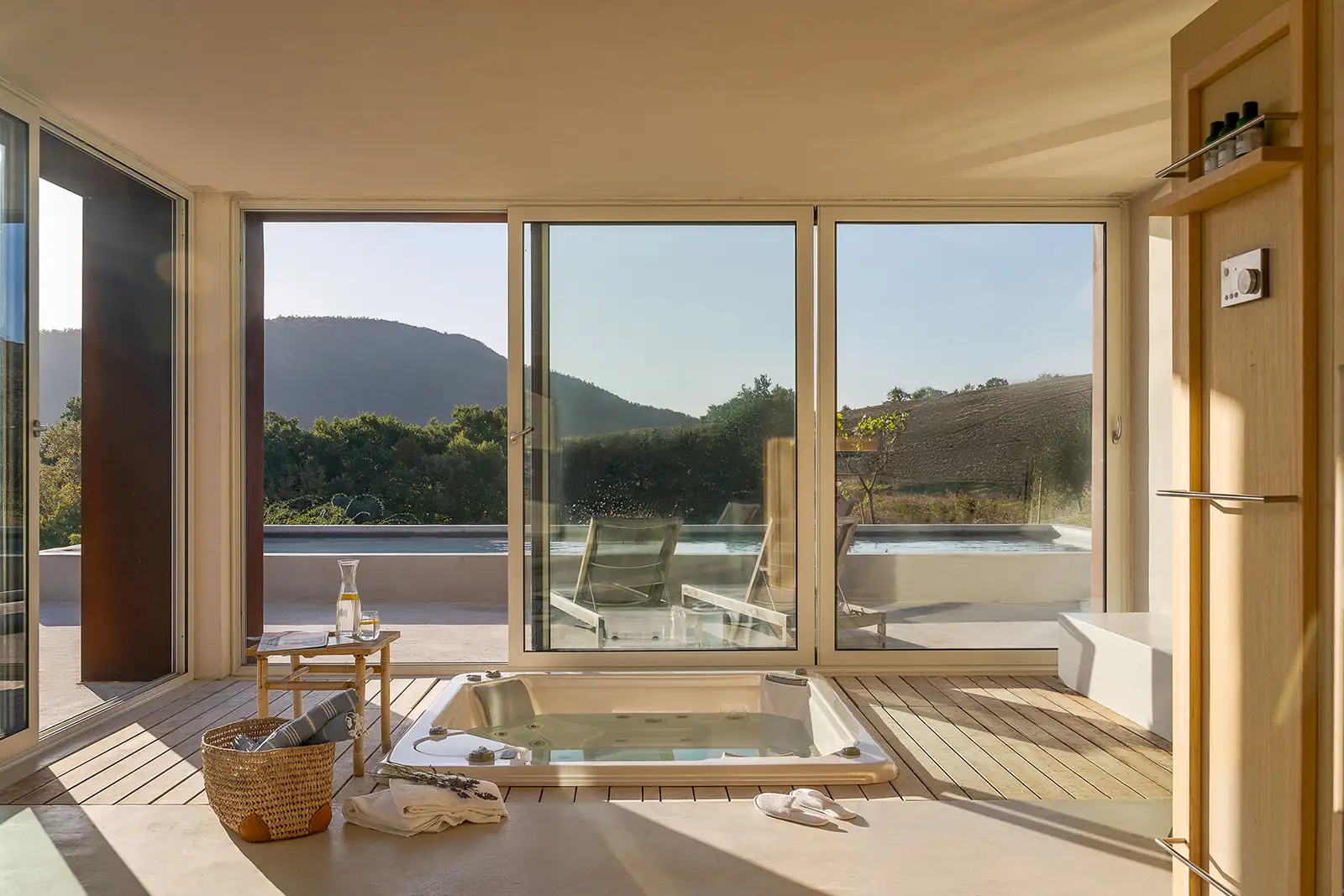 Guests are indulged by the spacious layout that includes a two-storey main building with a breathtaking entrance, an impressively large living room, a state-of-the-art kitchen and three double bedrooms upstairs. This is attached to a smaller two-storey farmhouse (Annex 1) with three further bedrooms, one of which is a fabulous principal suite. A further, stand-alone building (Annex 2) houses a yoga studio, Jacuzzi, sauna and hammam on the ground floor. Here, glass doors open to the pool at one end and to the expansive view over the surrounding hills along the longer wall, while upstairs there's a large, family-sized bedroom. All rooms have a floor-cooling system.