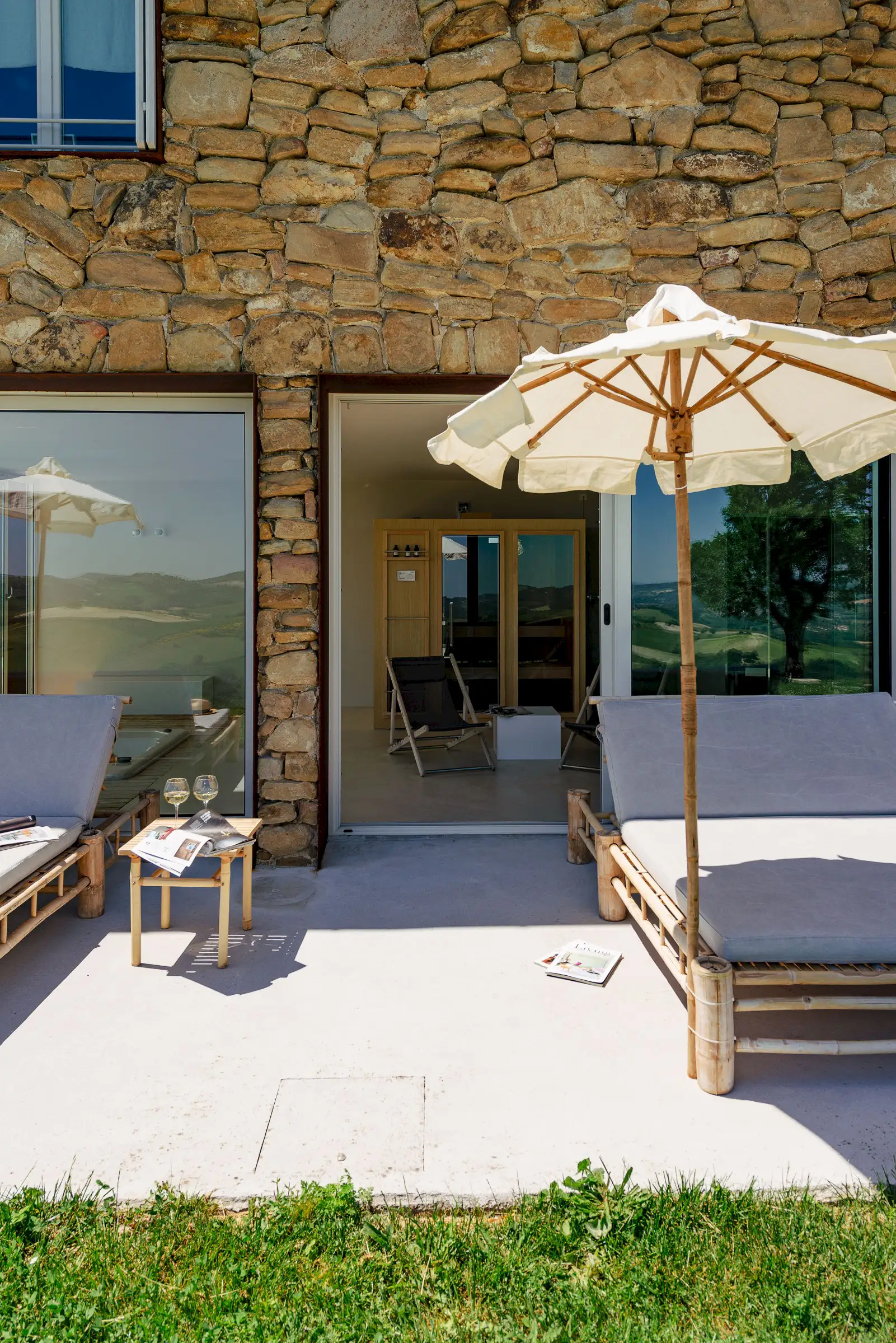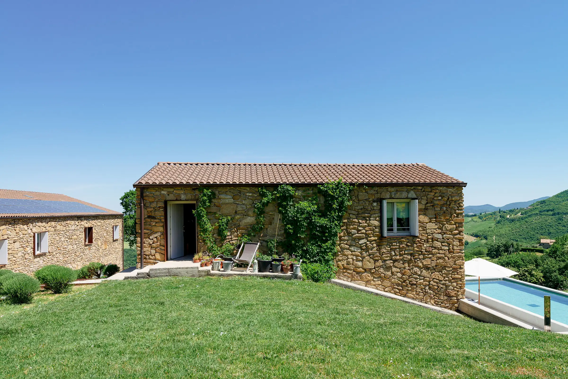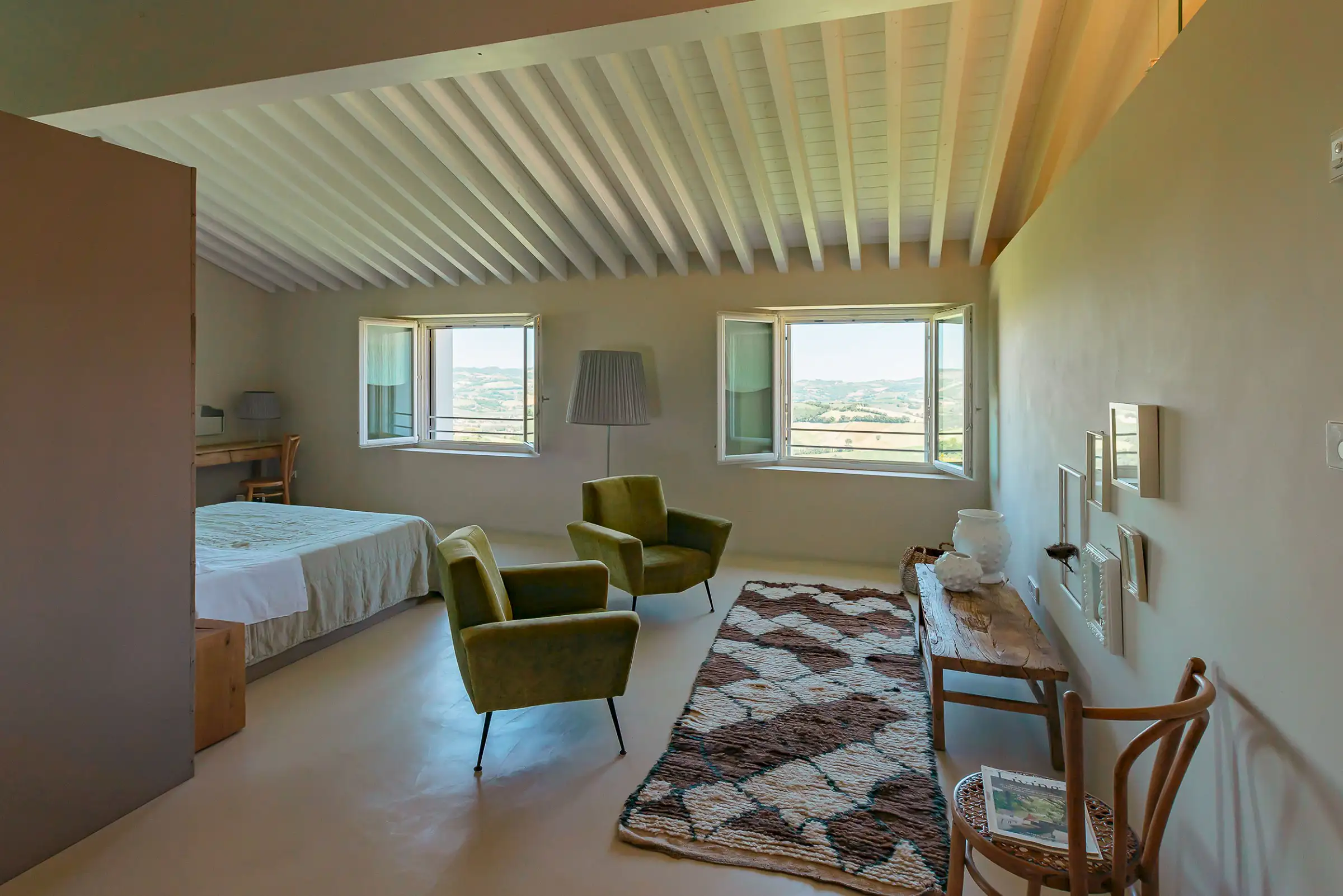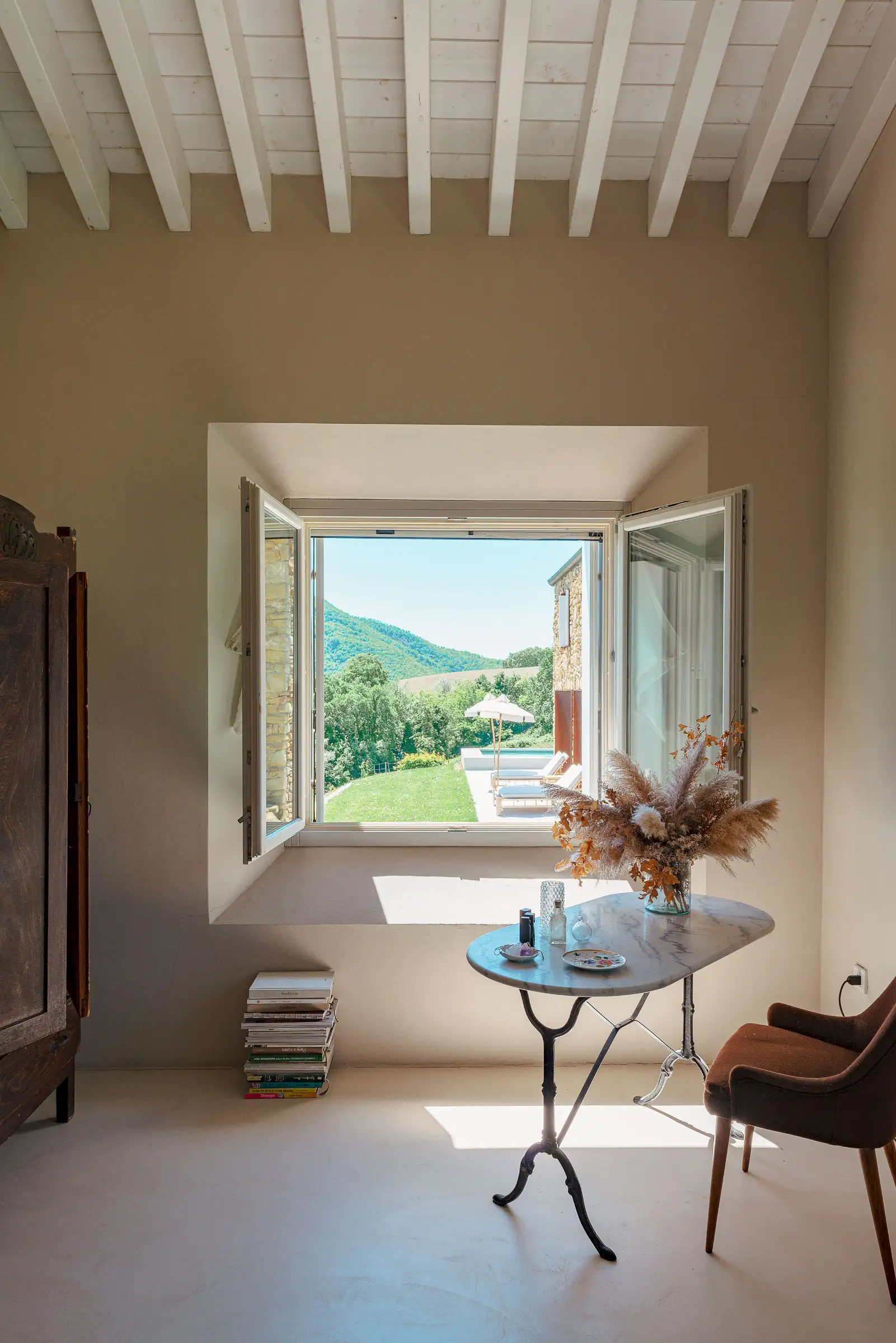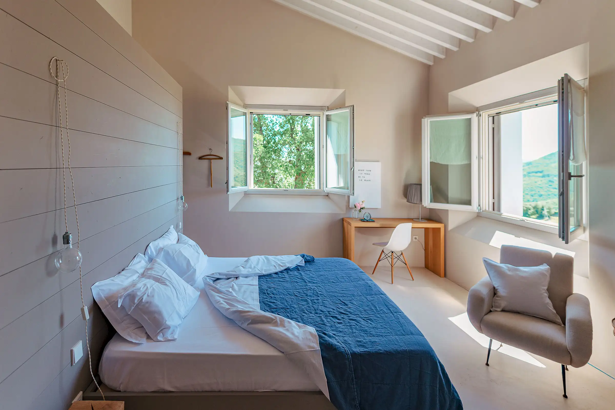 Guests are indulged by the spacious layout that includes a two-storey main building with a breathtaking entrance, an impressively large living room, a state-of-the-art kitchen and three double bedrooms upstairs. This is attached to a smaller two-storey farmhouse (Annex 1) with three further bedrooms, one of which is a fabulous principal suite. A further, stand-alone building (Annex 2) houses a yoga studio, Jacuzzi, sauna and hammam on the ground floor. Here, glass doors open to the pool at one end and to the expansive view over the surrounding hills along the longer wall, while upstairs there's a large, family-sized bedroom. All rooms have a floor-cooling system.