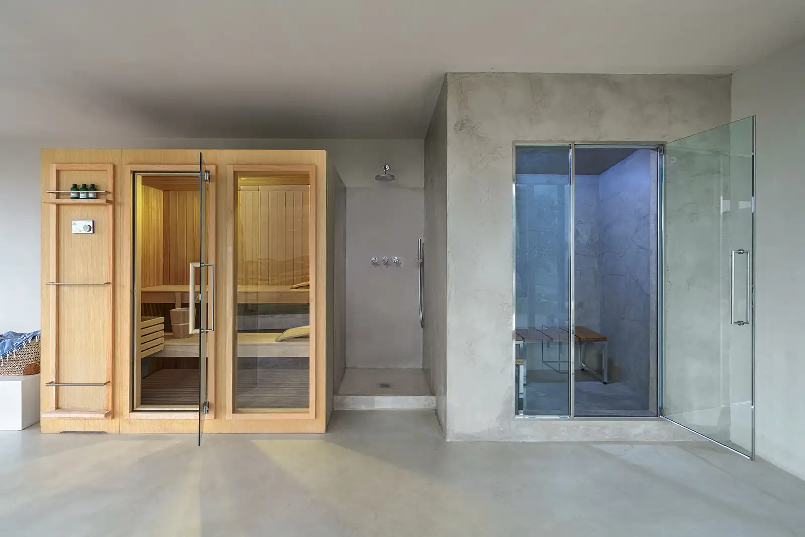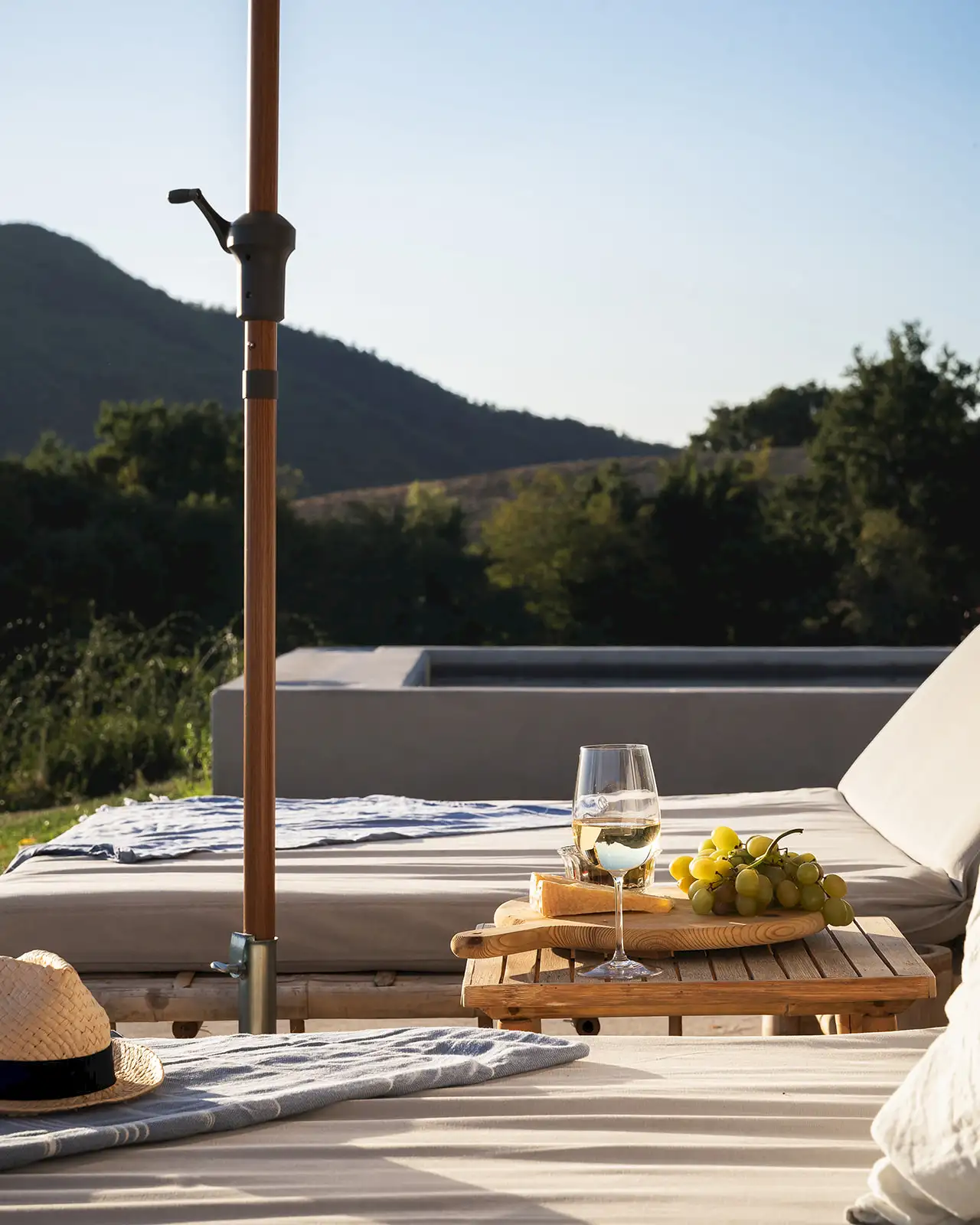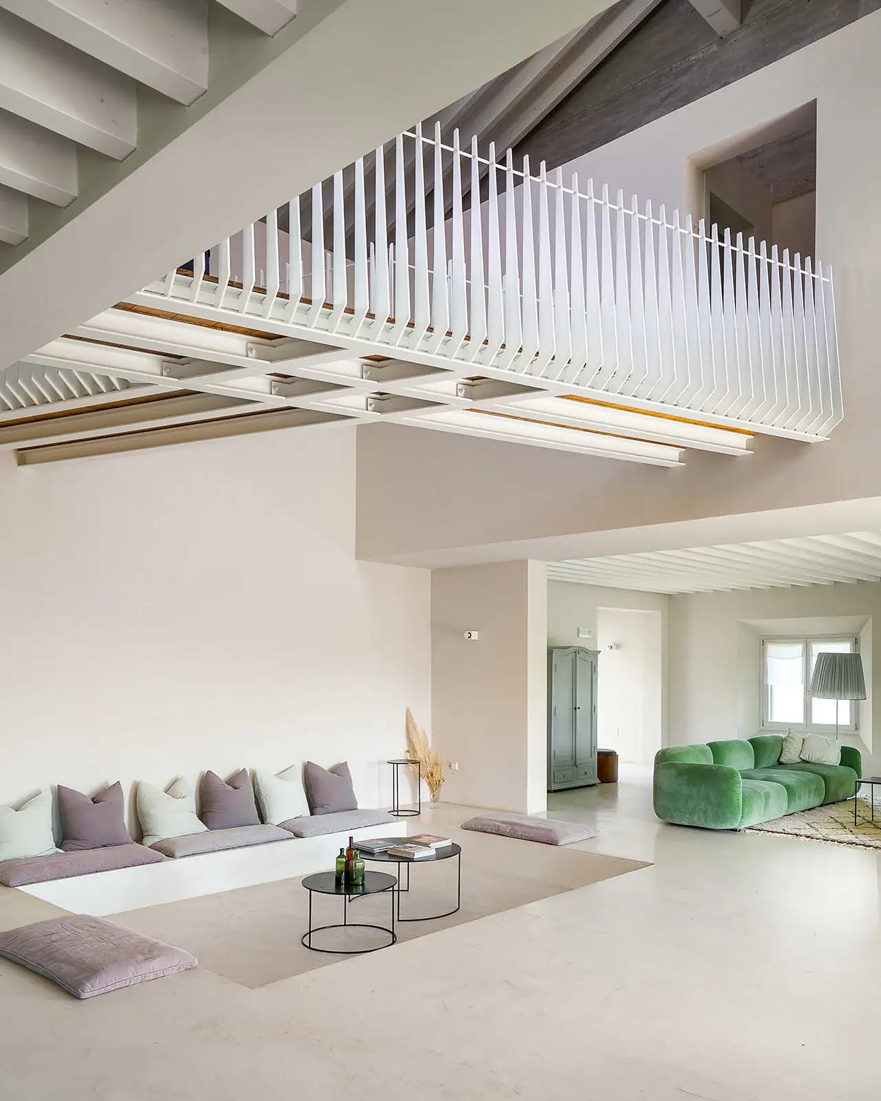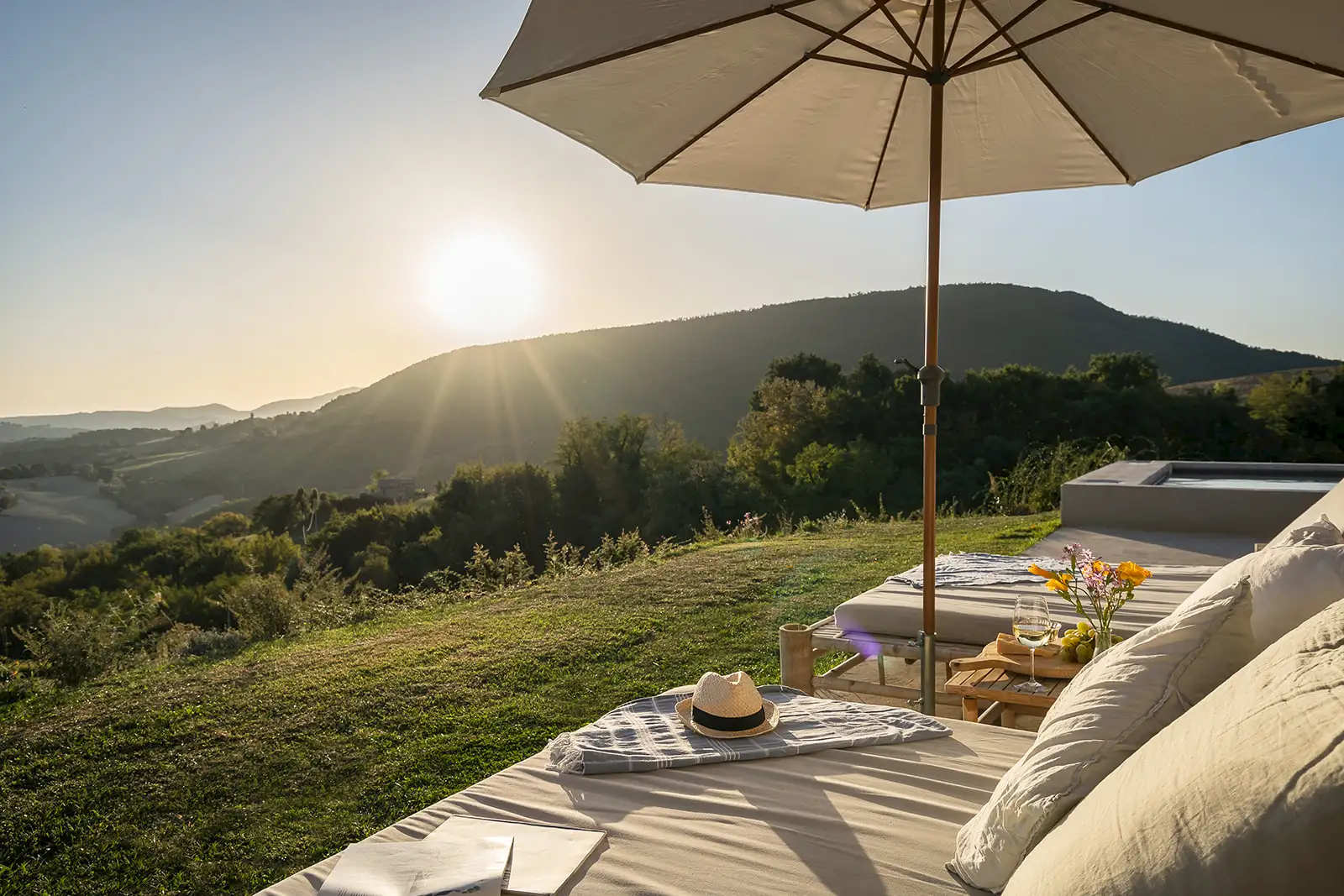 Guests are indulged by the spacious layout that includes a two-storey main building with a breathtaking entrance, an impressively large living room, a state-of-the-art kitchen and three double bedrooms upstairs. This is attached to a smaller two-storey farmhouse (Annex 1) with three further bedrooms, one of which is a fabulous principal suite. A further, stand-alone building (Annex 2) houses a yoga studio, Jacuzzi, sauna and hammam on the ground floor. Here, glass doors open to the pool at one end and to the expansive view over the surrounding hills along the longer wall, while upstairs there's a large, family-sized bedroom. All rooms have a floor-cooling system.
