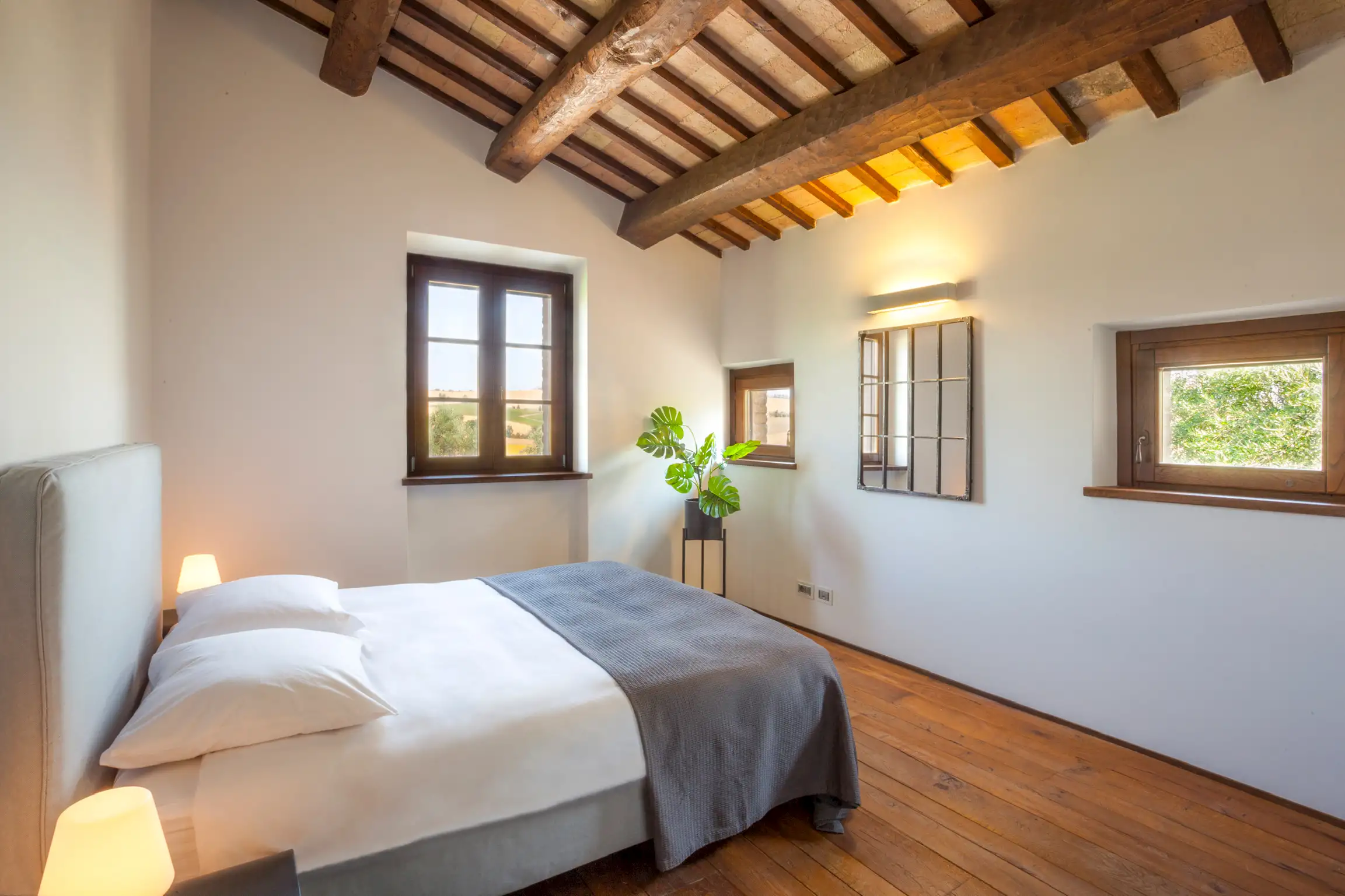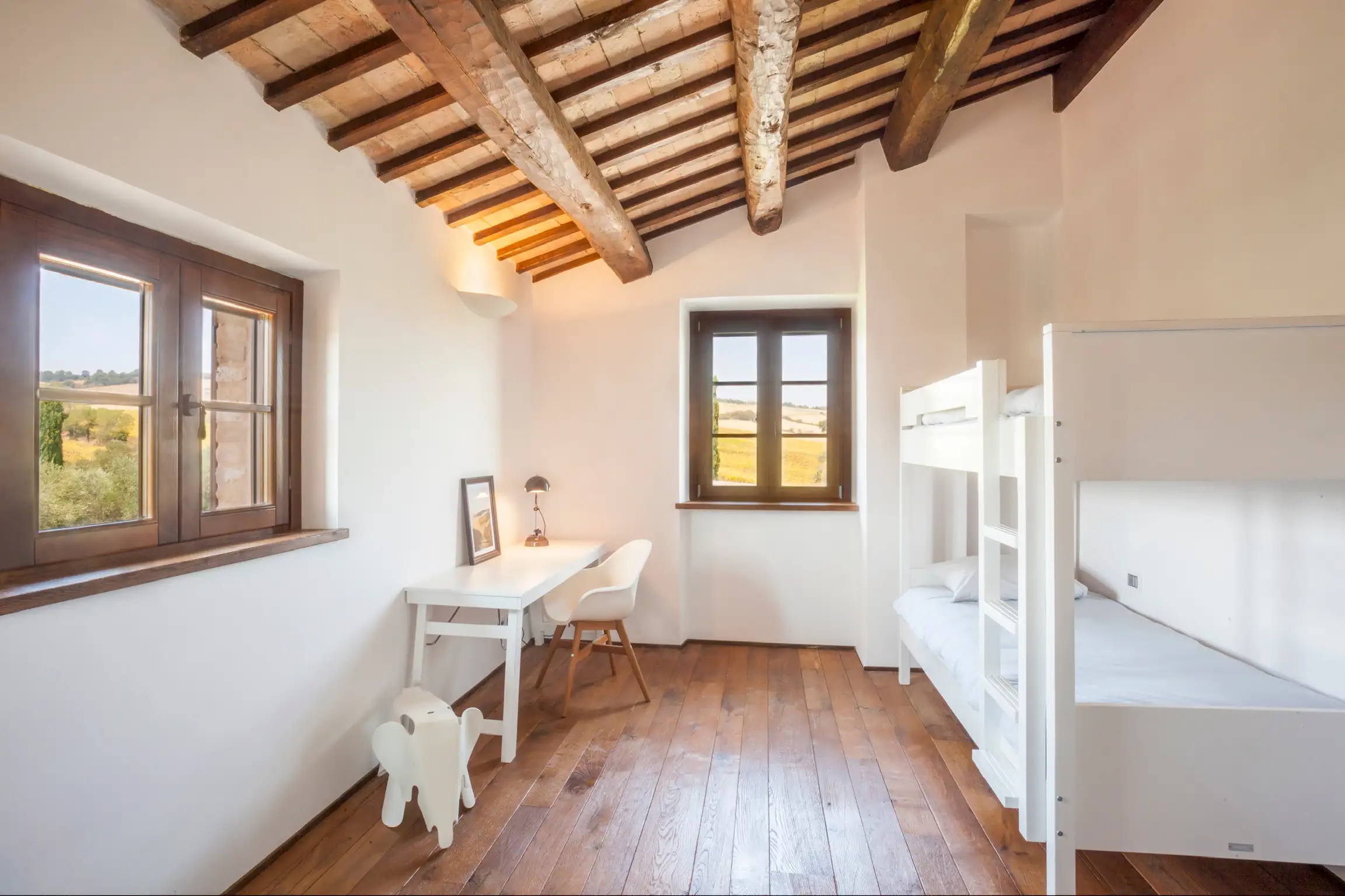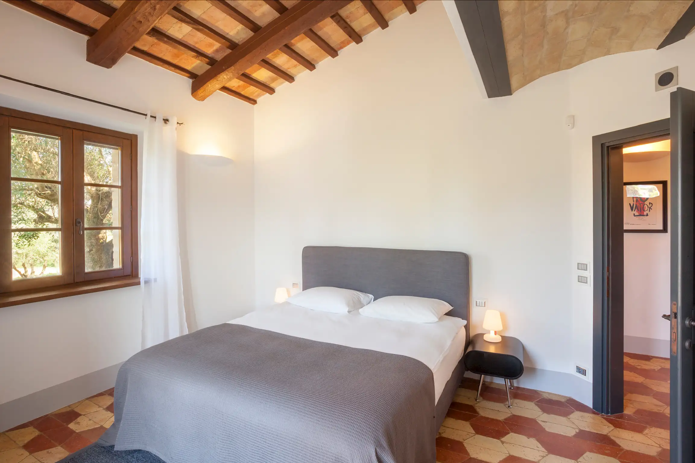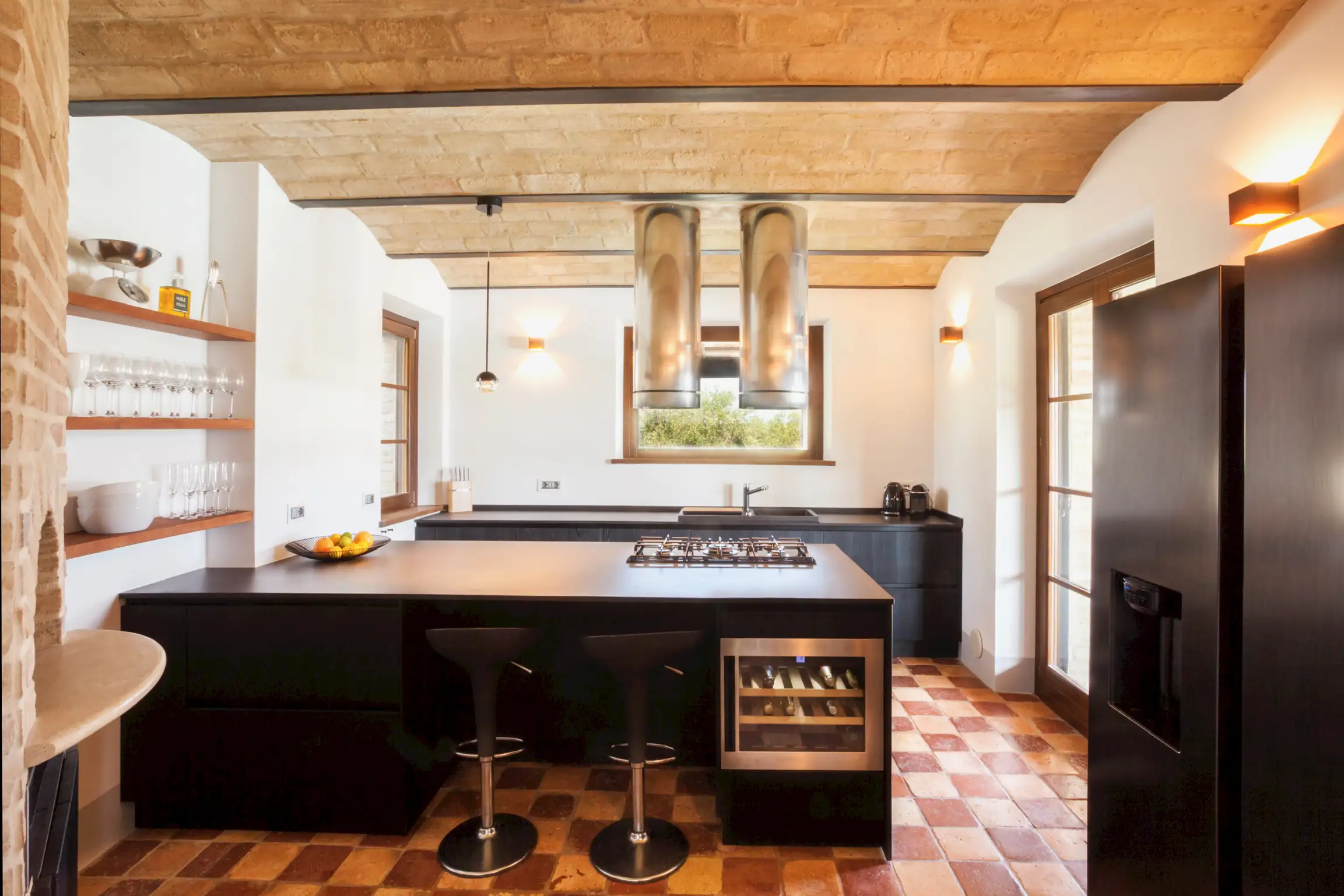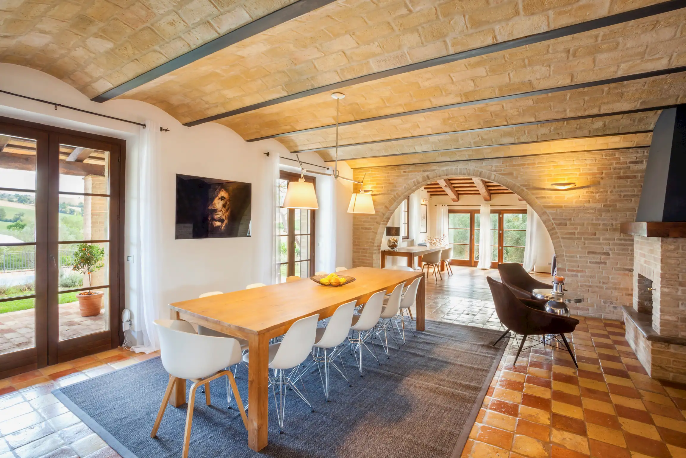 Carefully renovated to retain original features such as barrel-vaulted ceilings, wooden beams and cotto floors, the light and spacious interior includes furniture and lighting by design brands such as Vitra, EMU and Foscarini.