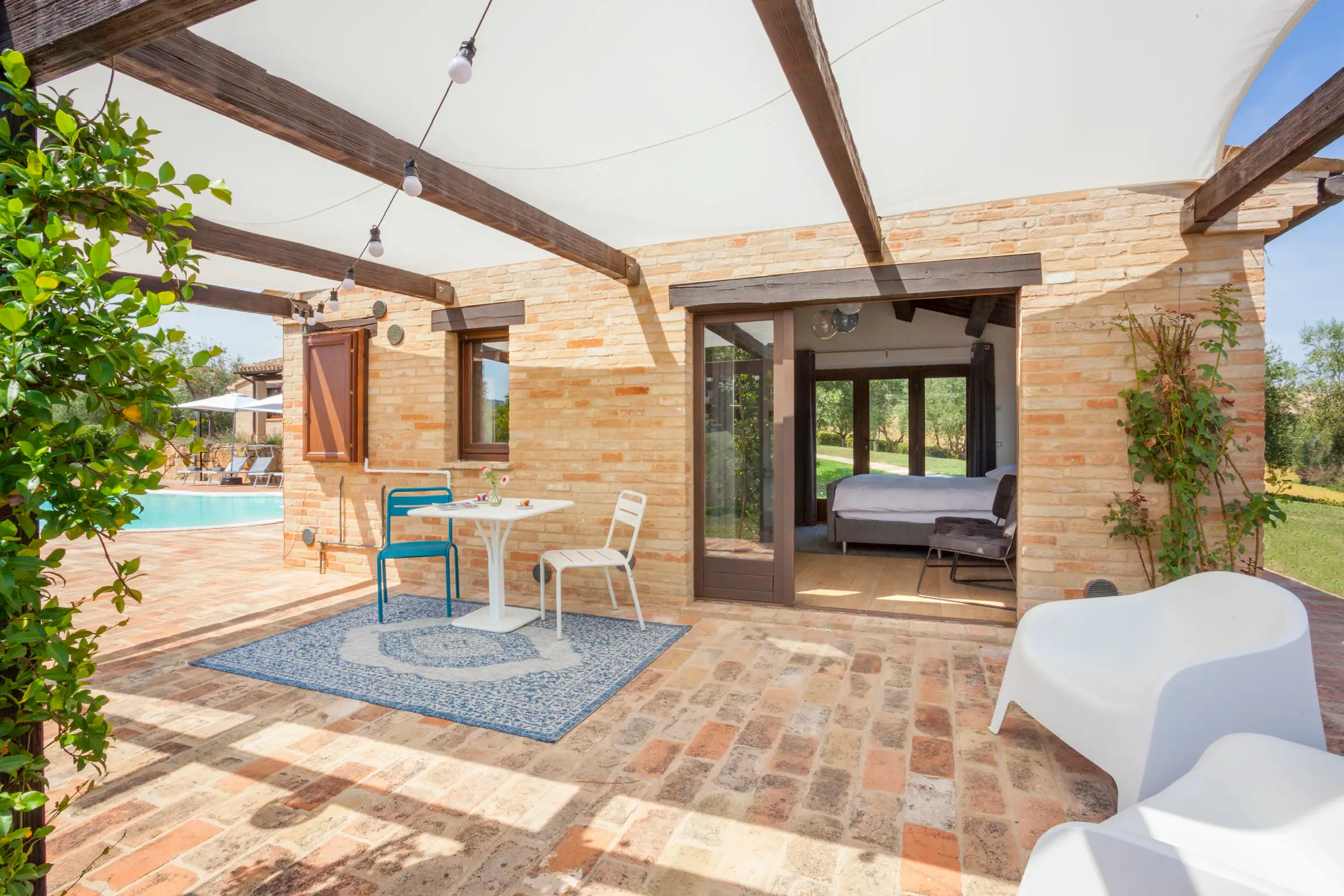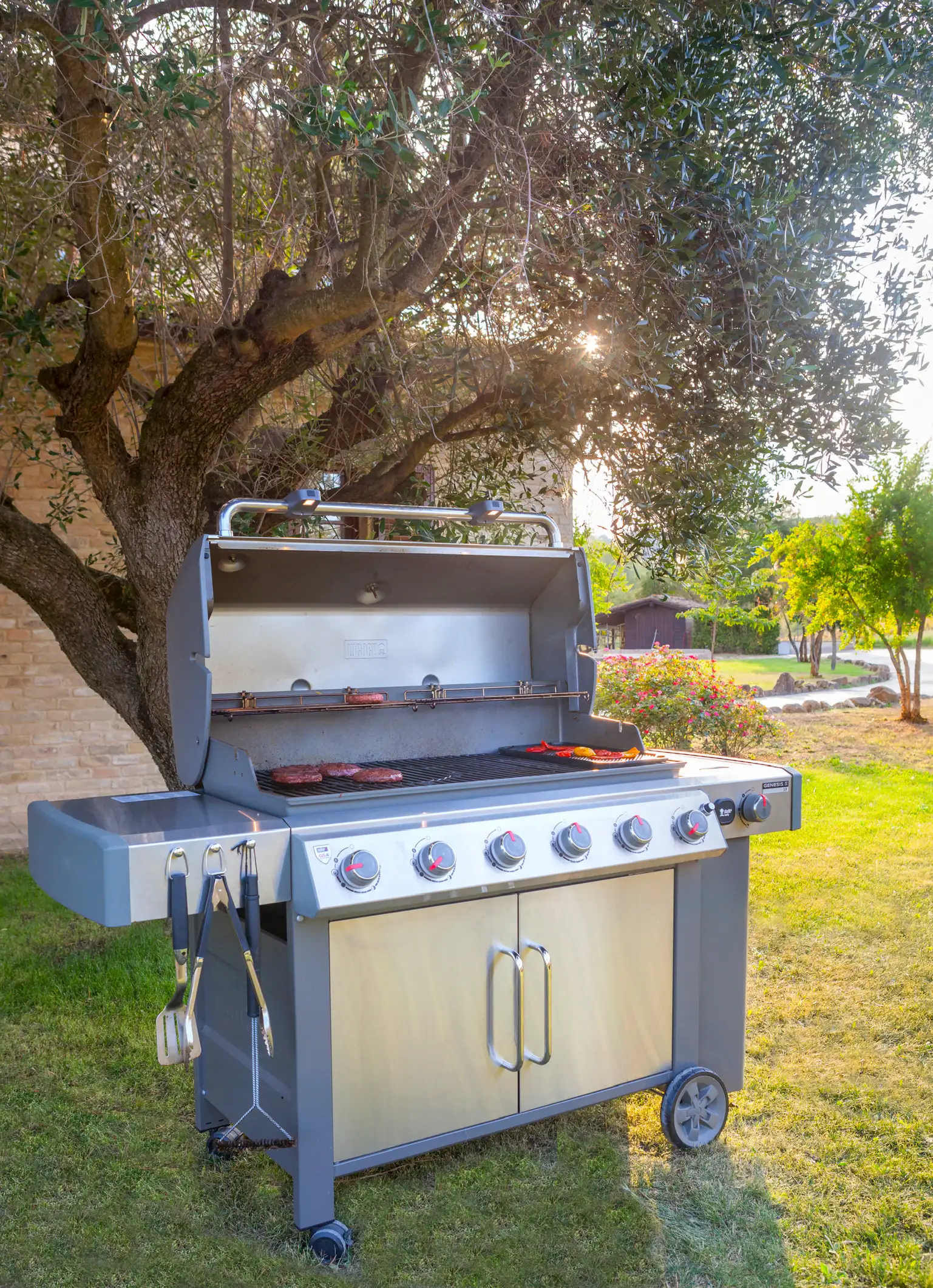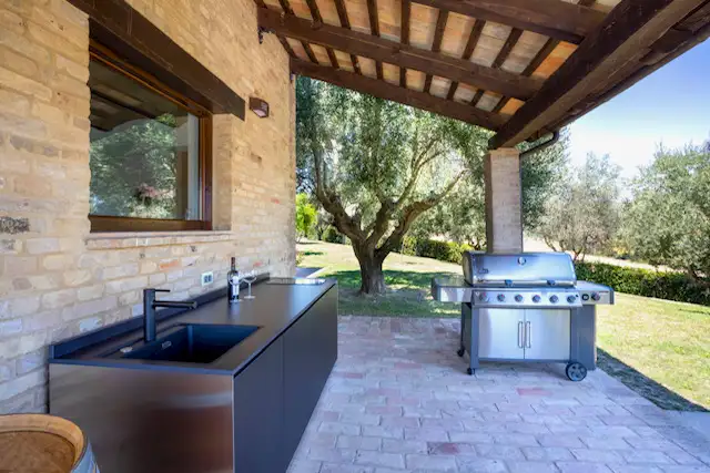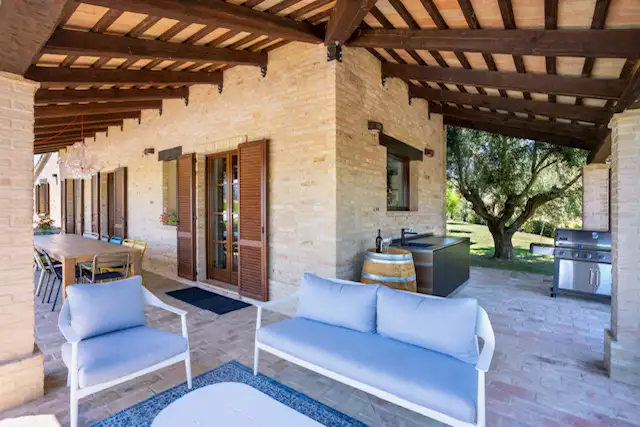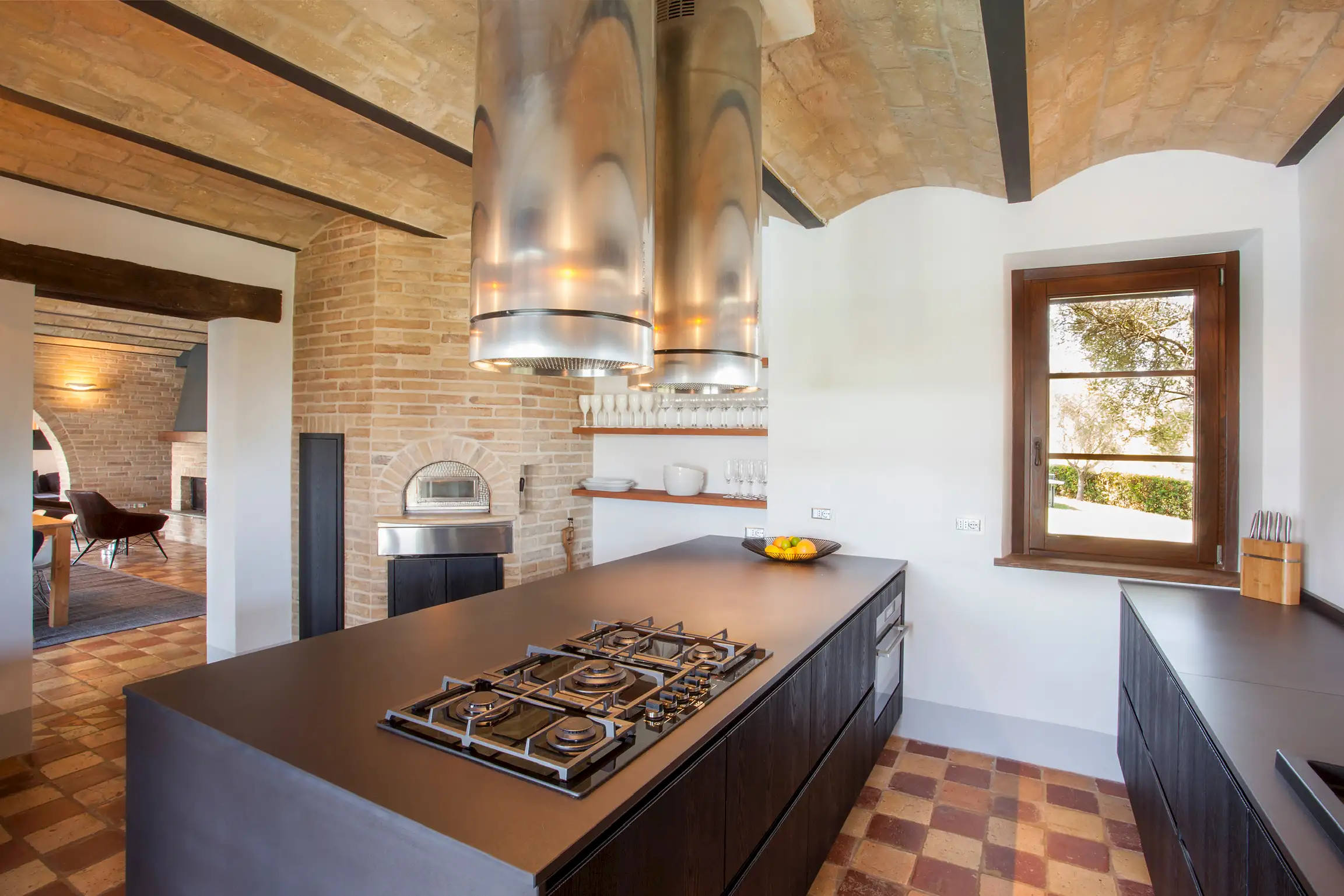 There are six bedrooms and five bathrooms in the main villa and a further double en-suite in the separate guest house by the pool. This being Italy, food takes pride of place and guests have the luxury of a built-in pizza oven in the sleek indoor kitchen as well as a covered outdoor kitchen with a large Weber gas BBQ.