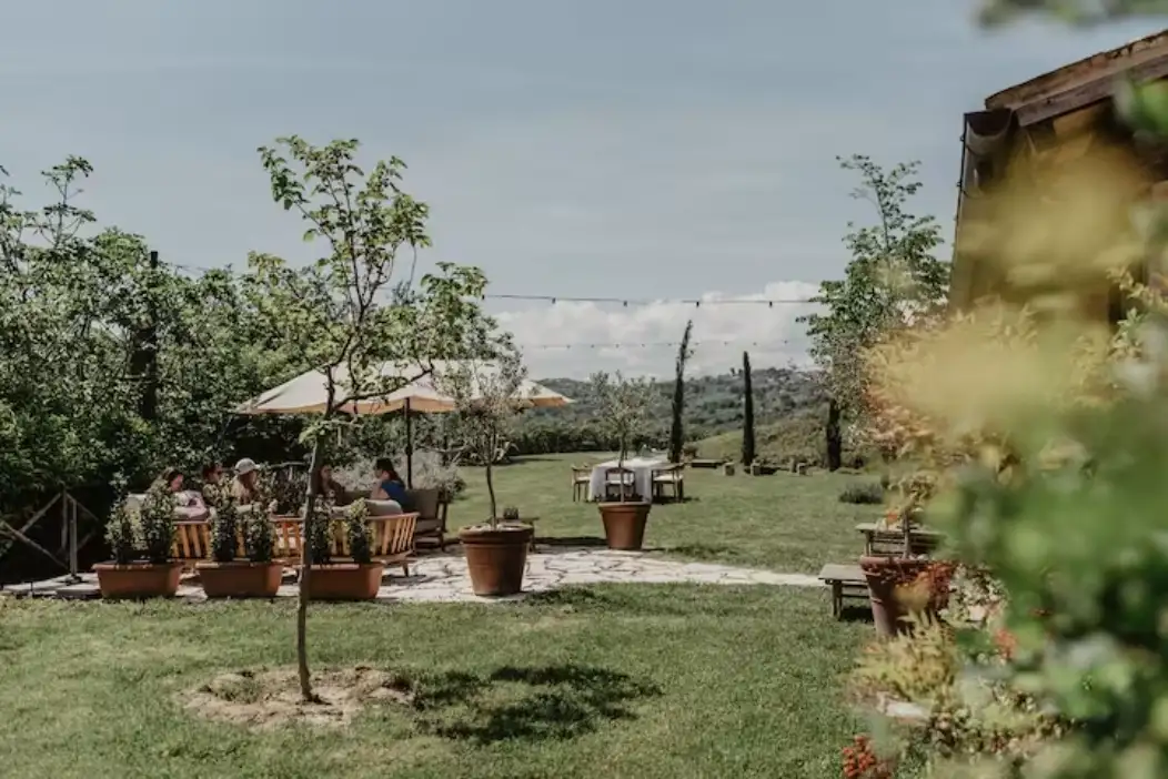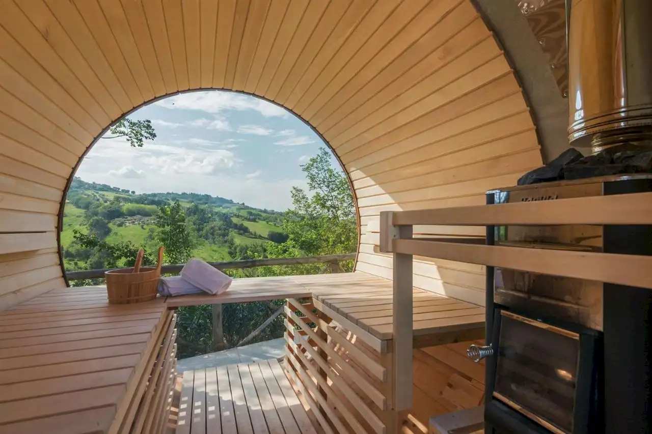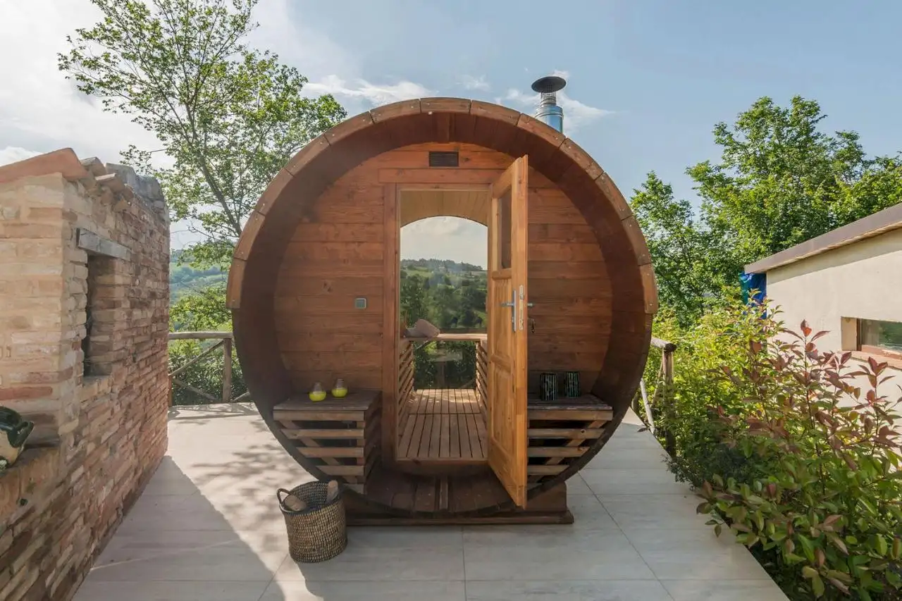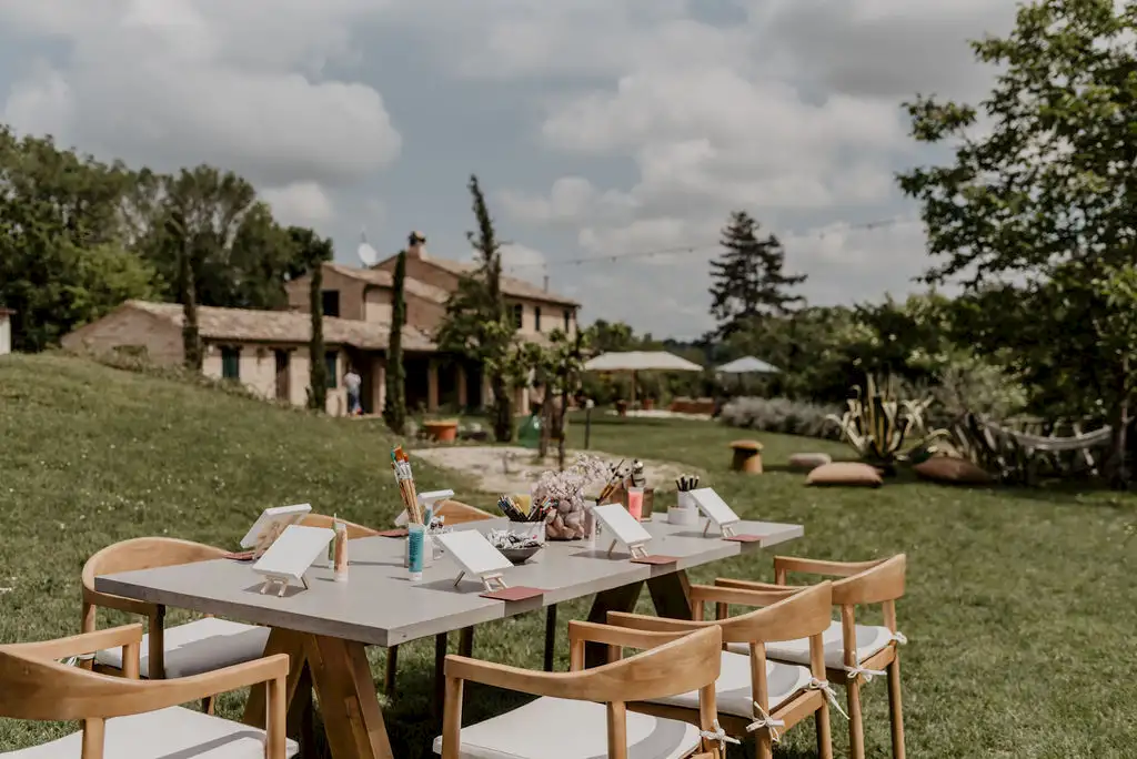 Santamaria sits on a hilltop clearing in the glorious rolling wooded landscape of Le Marche, just half an hour from the coast.
