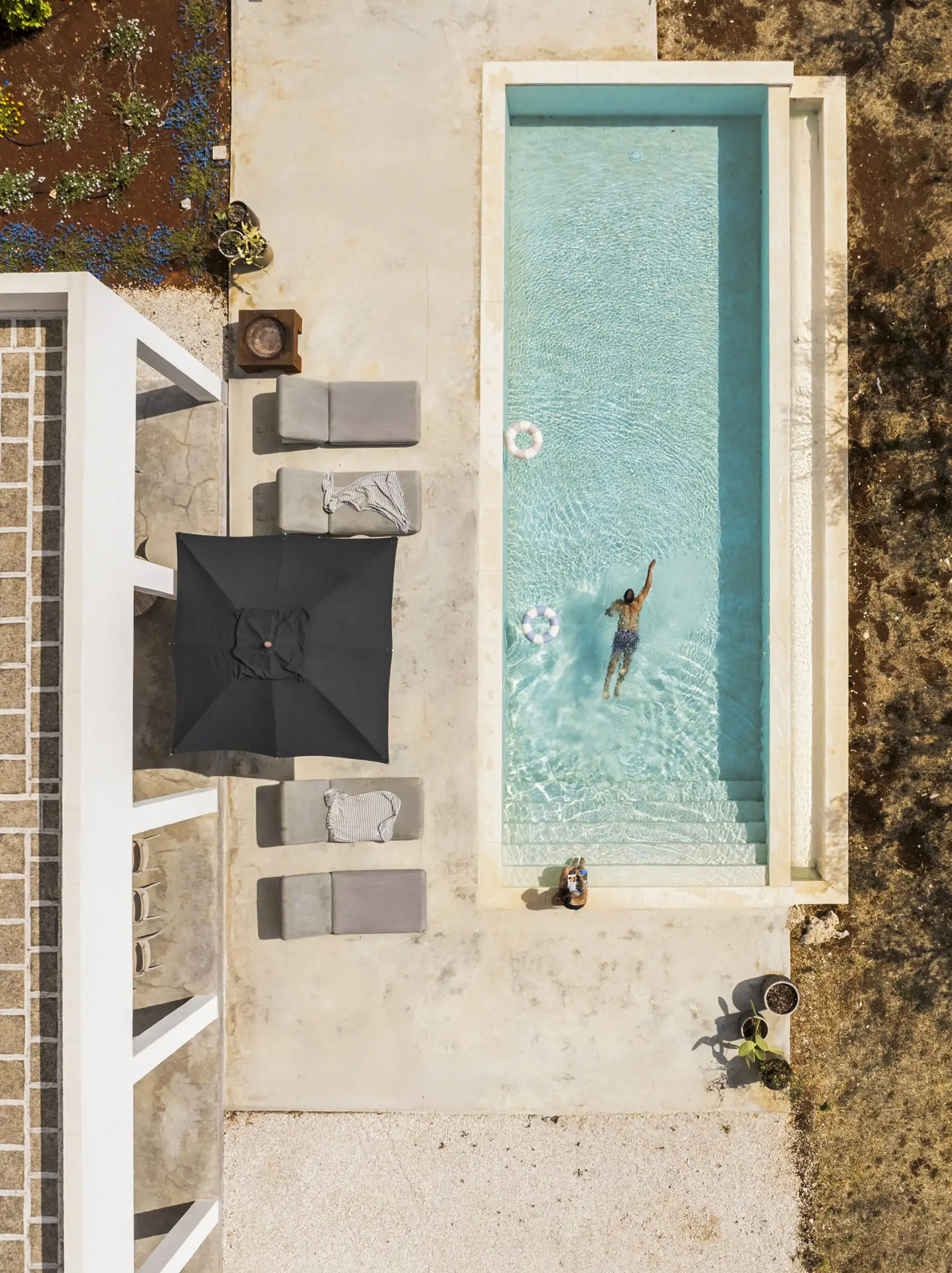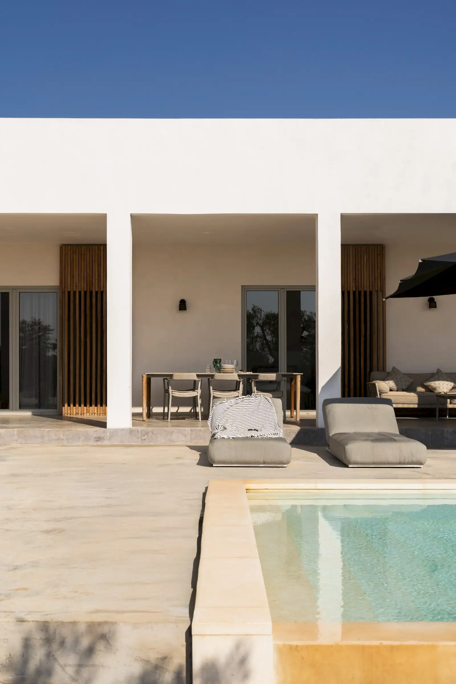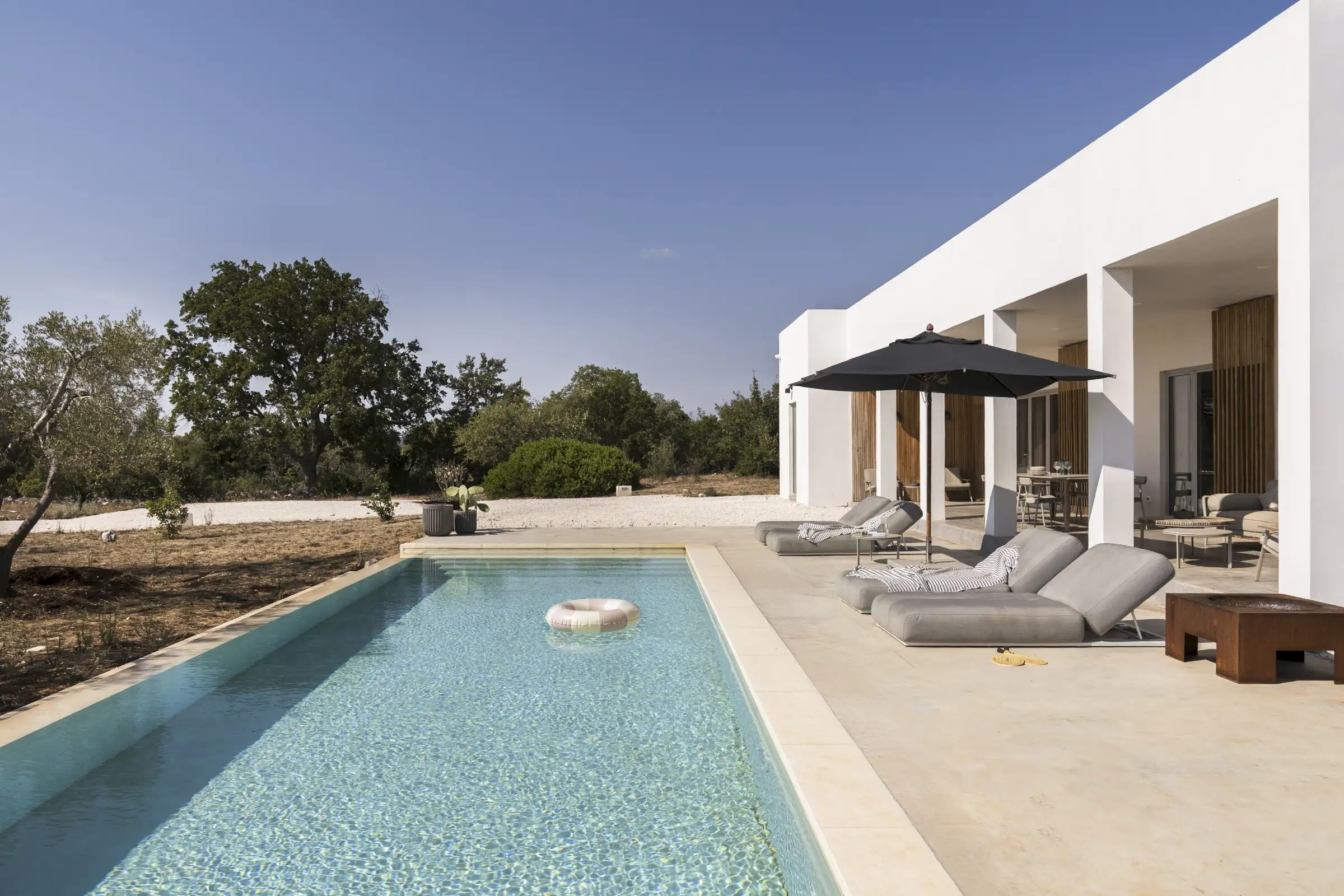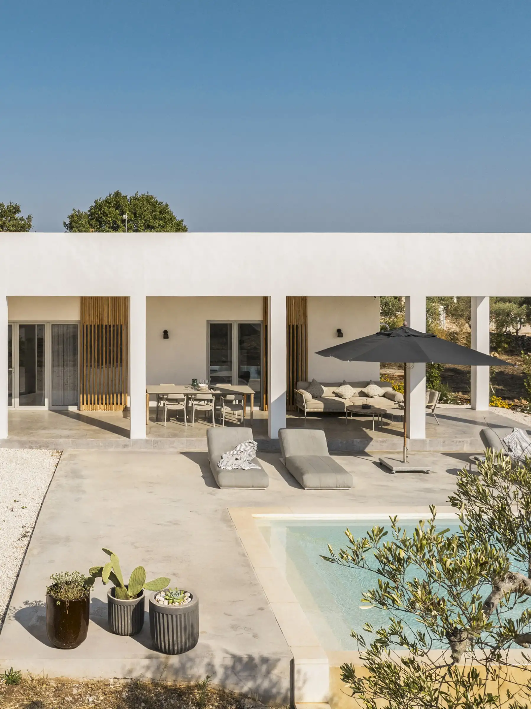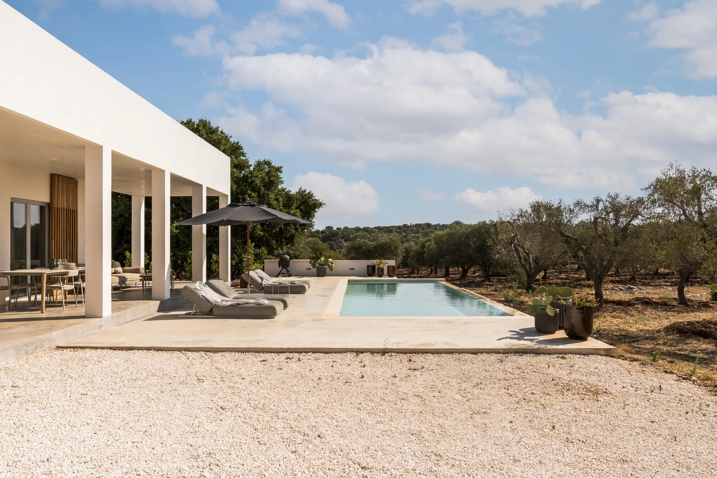 The house is reached down a lane through the olive groves. The rich green of the trees and the red of the soil are showcased perfectly by the smooth whiteness of the villa, while pale wood vertical batons on the pool side of the house offer shade as well as a connection between the landscape and the architecture. The pool is close to the house – perfect for barefoot gliding from villa to sunbed to pool. With internal steps that stretch the width of the pool, guests can lounge in the shallows and swim lengths, too. There’s an outdoor shower, a BBQ, and a dining table and sofa on the veranda.