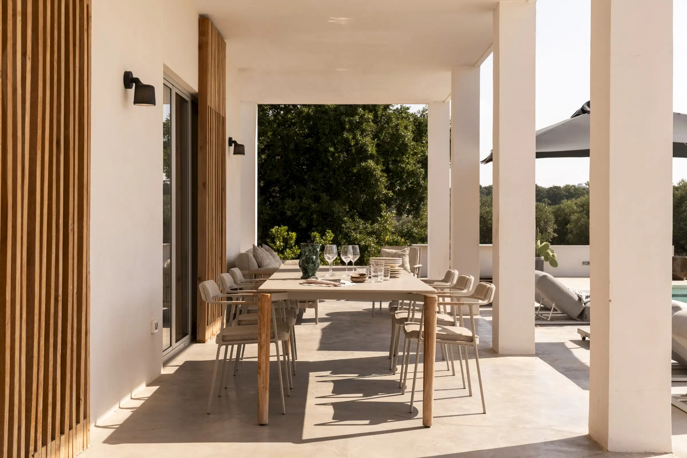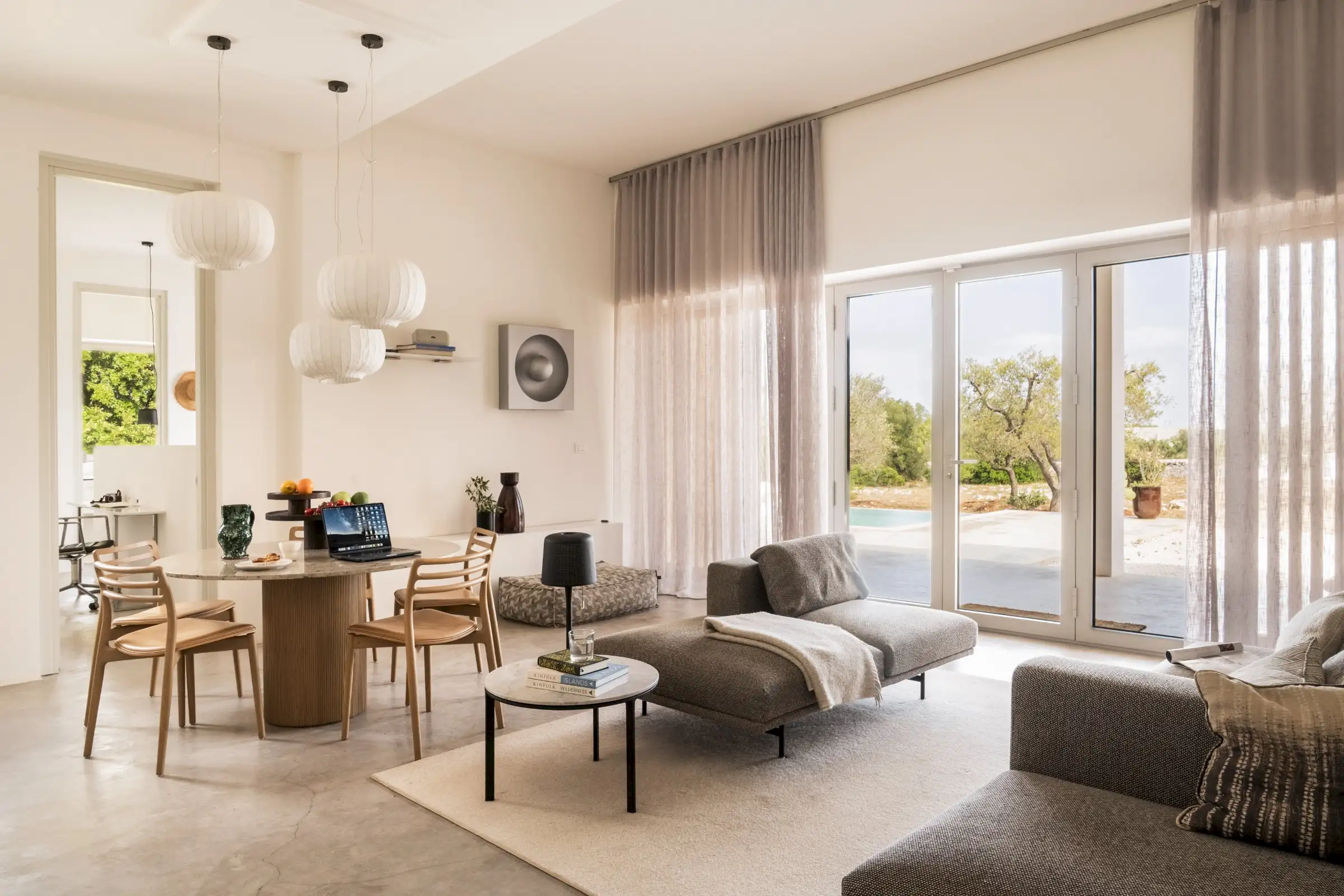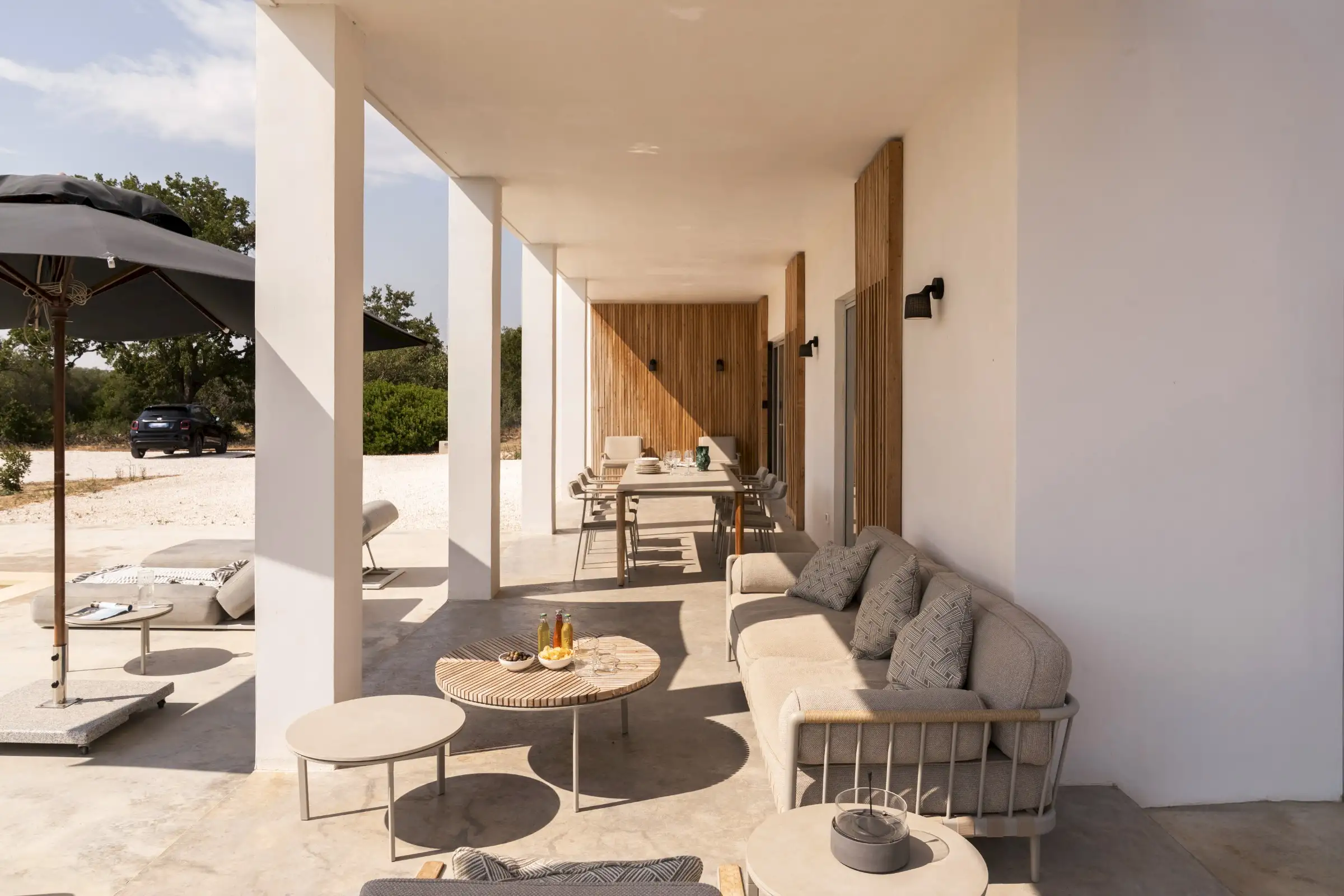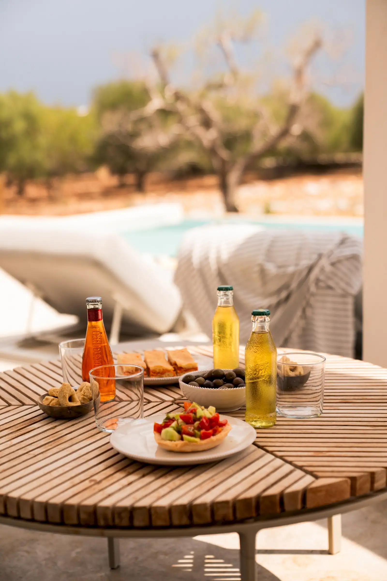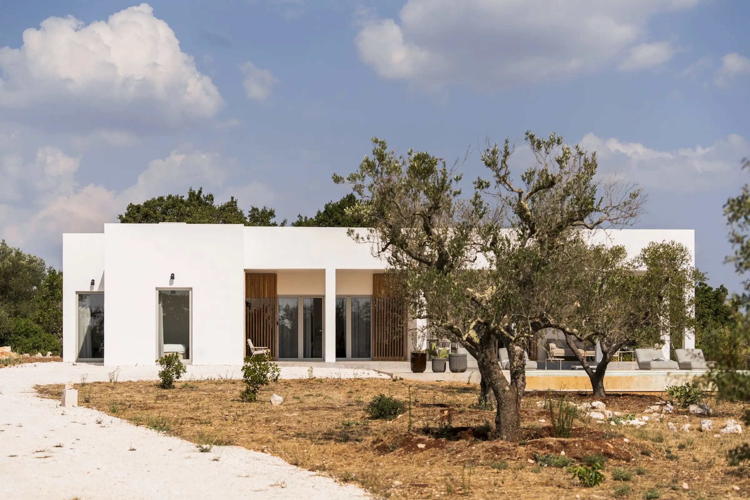 The house is reached down a lane through the olive groves. The rich green of the trees and the red of the soil are showcased perfectly by the smooth whiteness of the villa, while pale wood vertical batons on the pool side of the house offer shade as well as a connection between the landscape and the architecture. The pool is close to the house – perfect for barefoot gliding from villa to sunbed to pool. With internal steps that stretch the width of the pool, guests can lounge in the shallows and swim lengths, too. There’s an outdoor shower, a BBQ, and a dining table and sofa on the veranda.