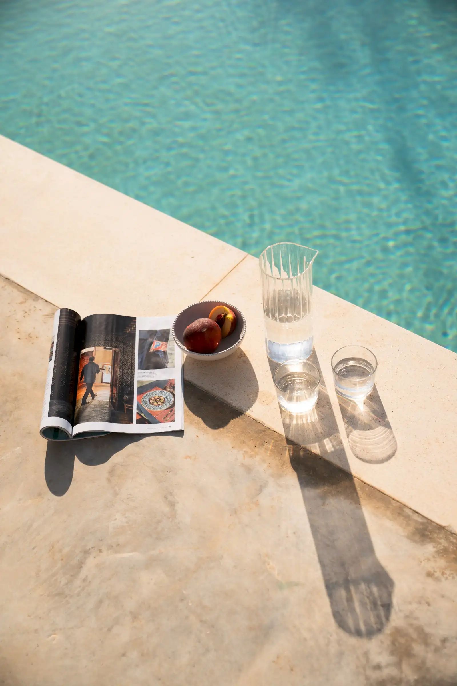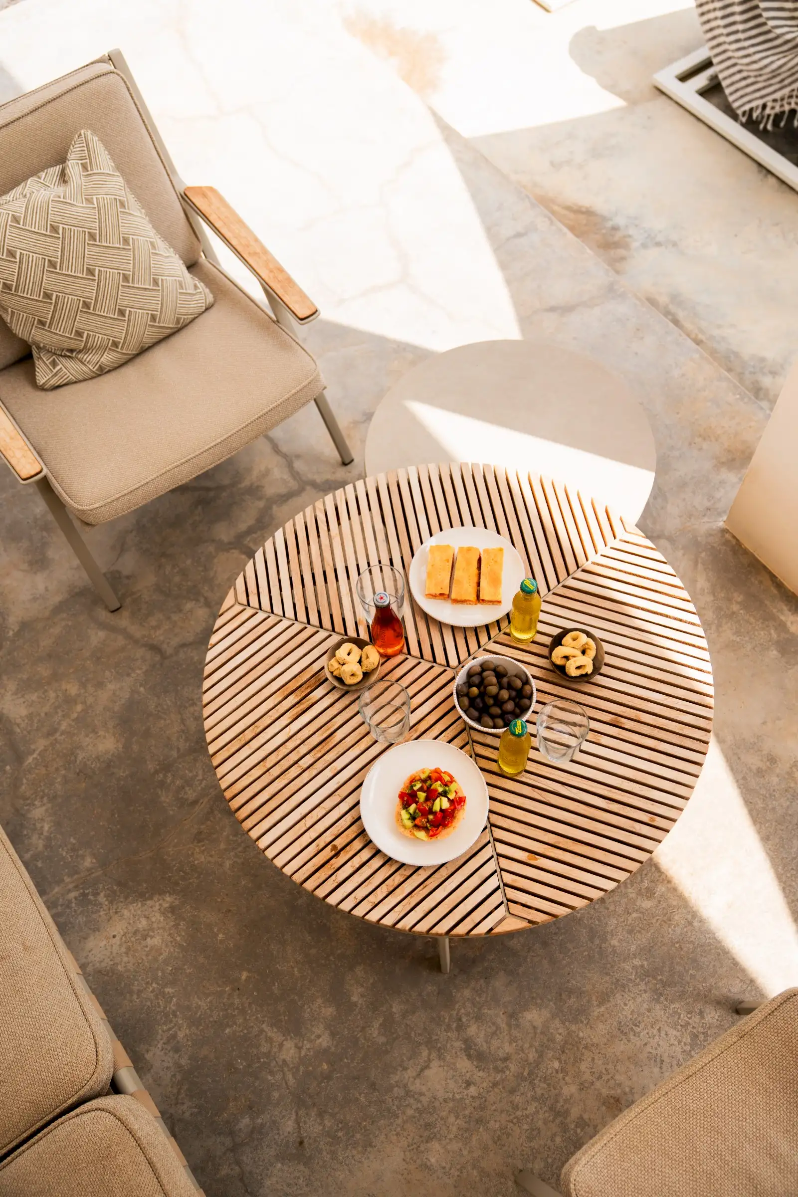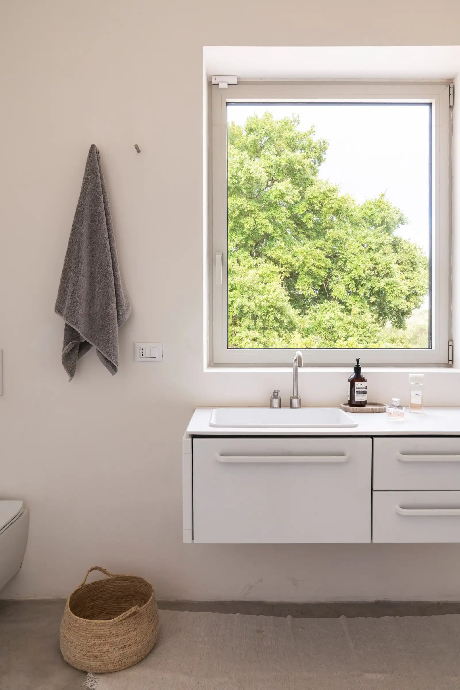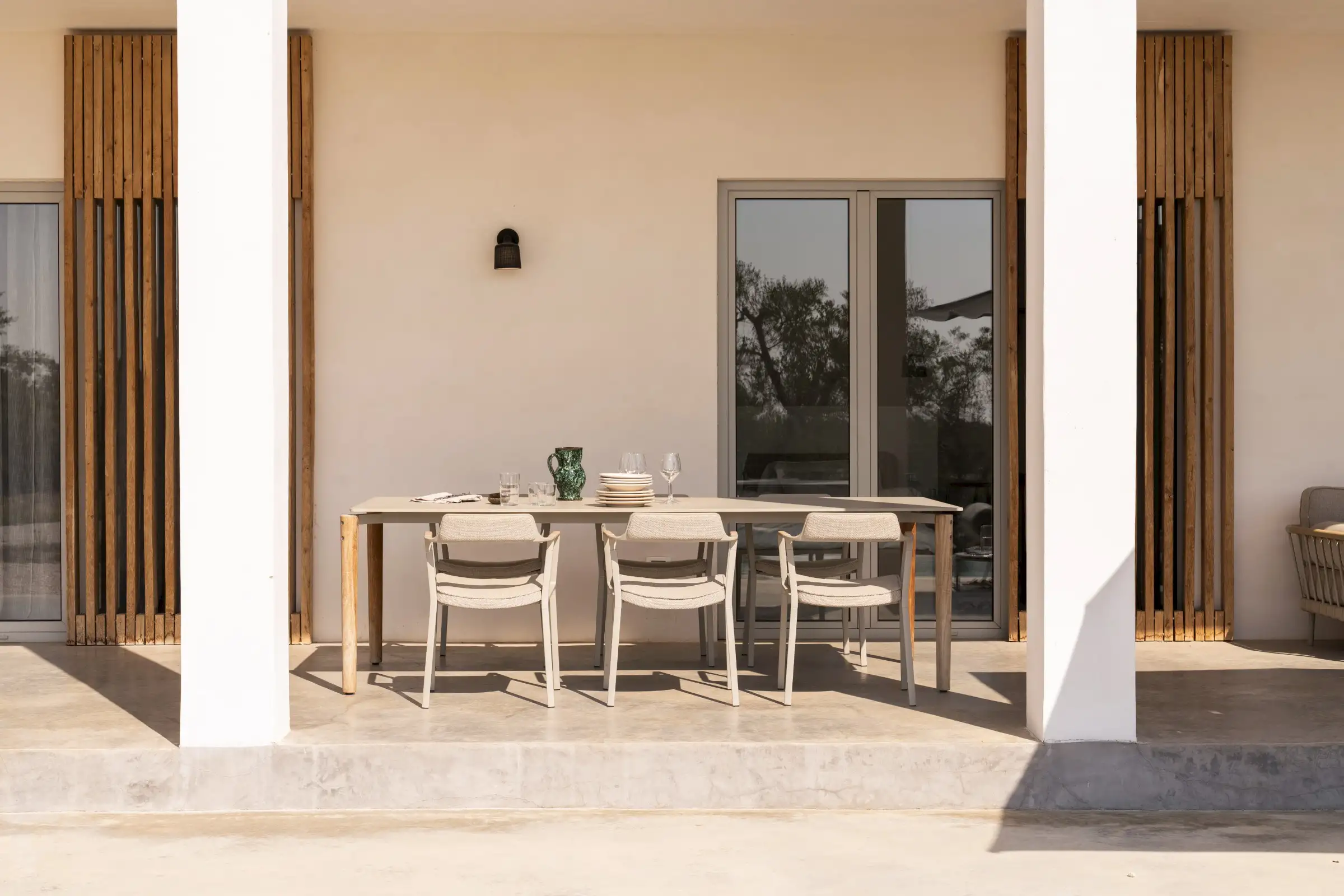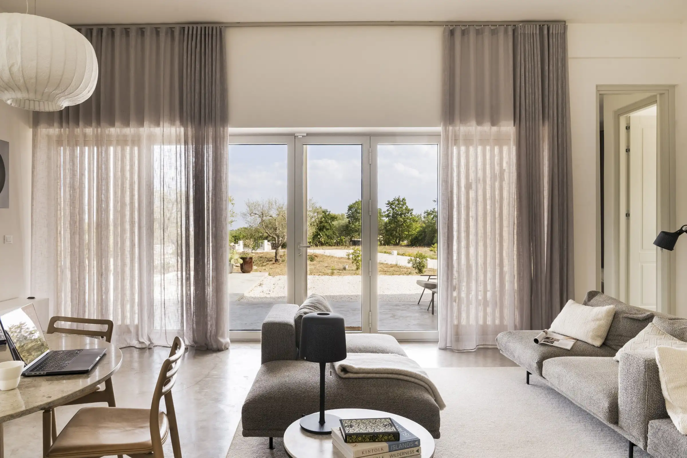 The house is reached down a lane through the olive groves. The rich green of the trees and the red of the soil are showcased perfectly by the smooth whiteness of the villa, while pale wood vertical batons on the pool side of the house offer shade as well as a connection between the landscape and the architecture. The pool is close to the house – perfect for barefoot gliding from villa to sunbed to pool. With internal steps that stretch the width of the pool, guests can lounge in the shallows and swim lengths, too. There’s an outdoor shower, a BBQ, and a dining table and sofa on the veranda.