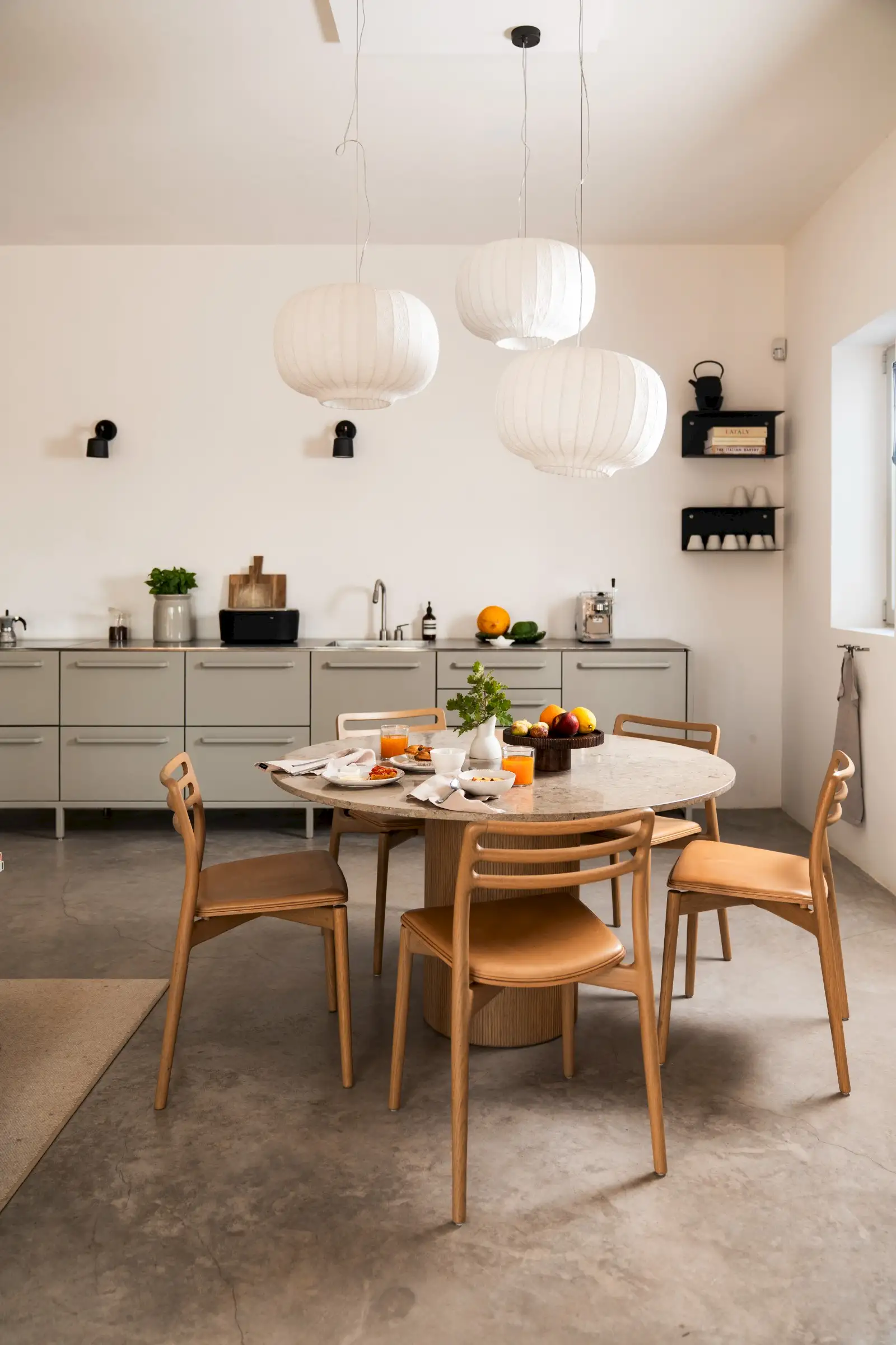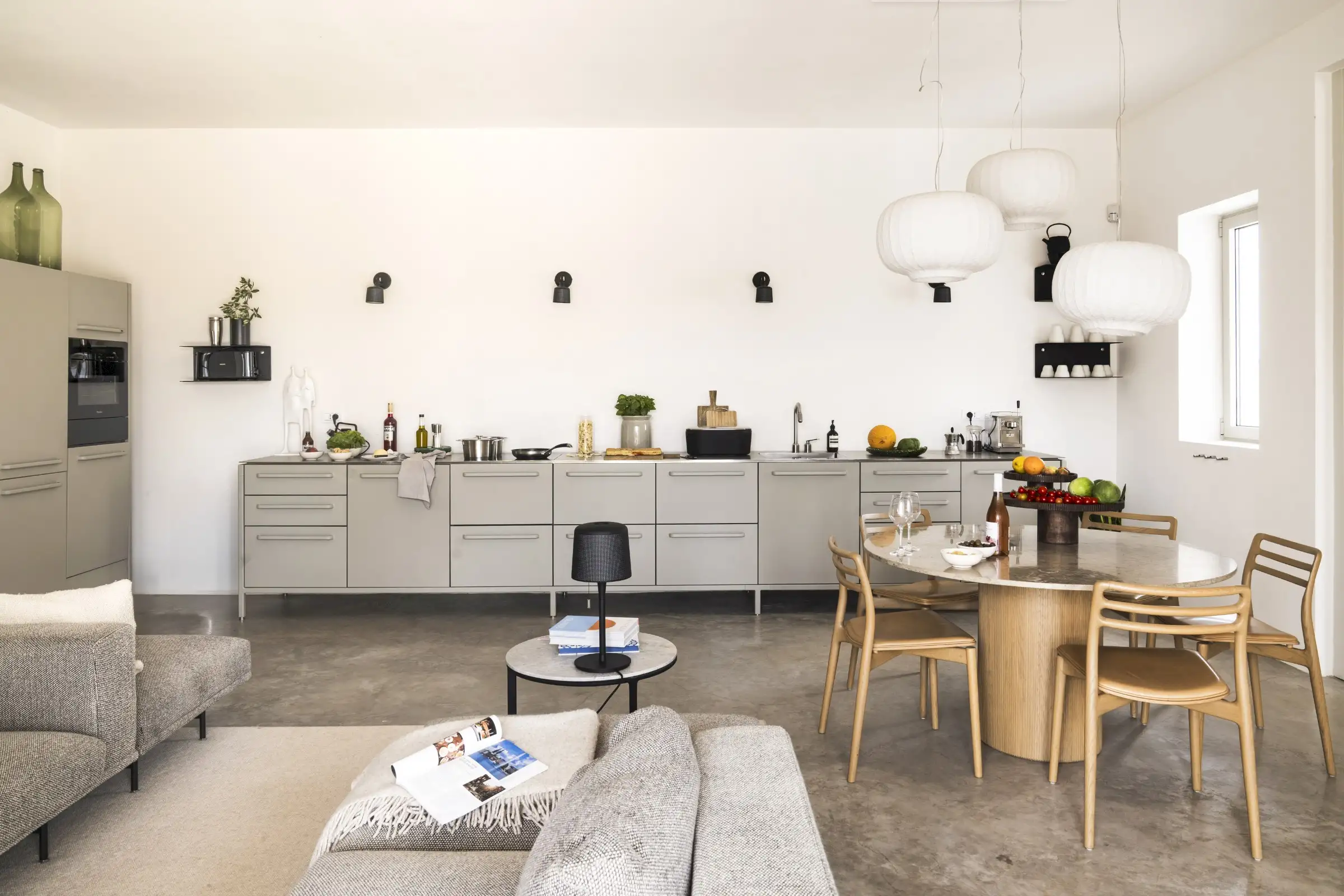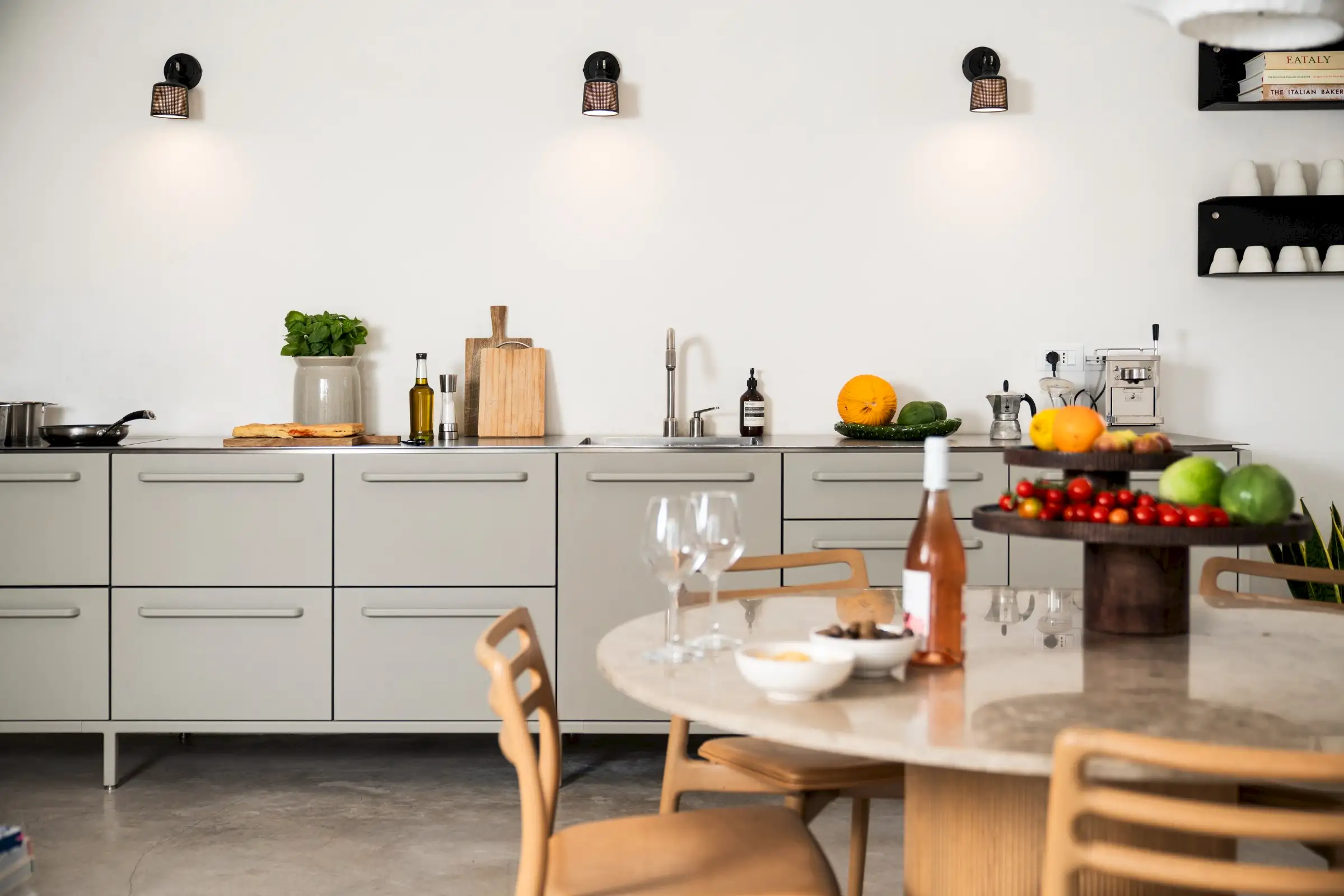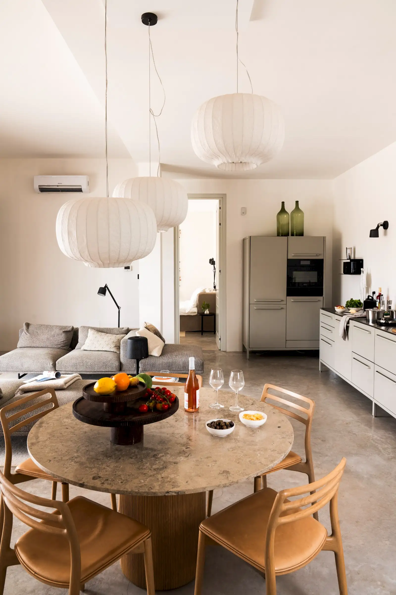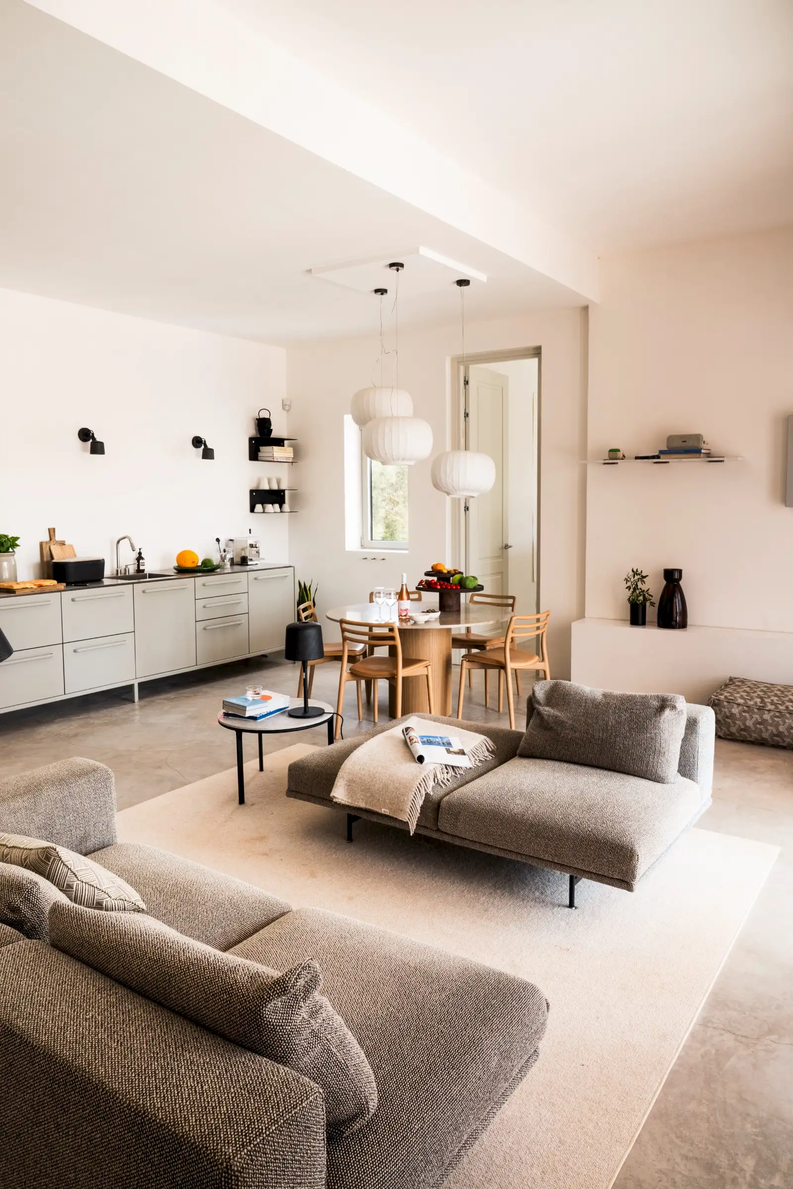 The kitchen is simple yet well-equipped – a run of pale grey units along a wall of the main living space that perfectly combines form with function. Guests can eat at a round wood and marble dining table inside, or outside on the terrace where there is also a BBQ.