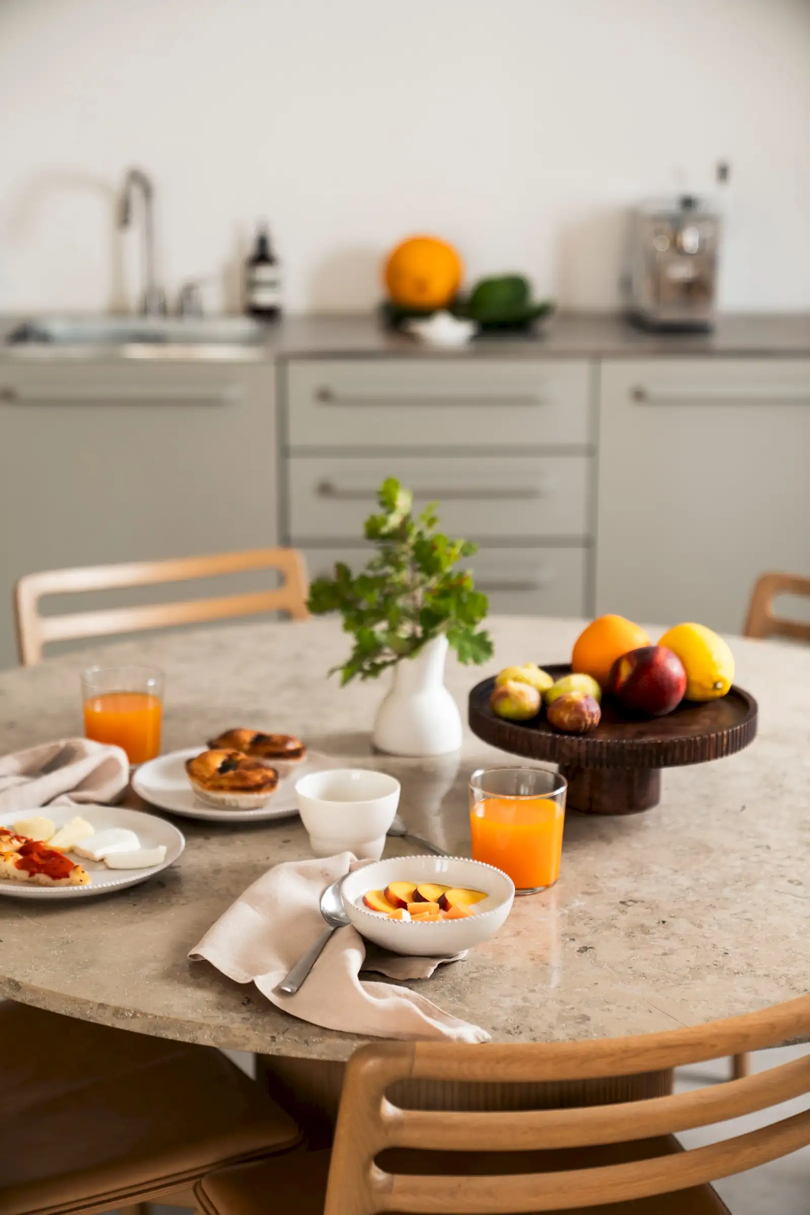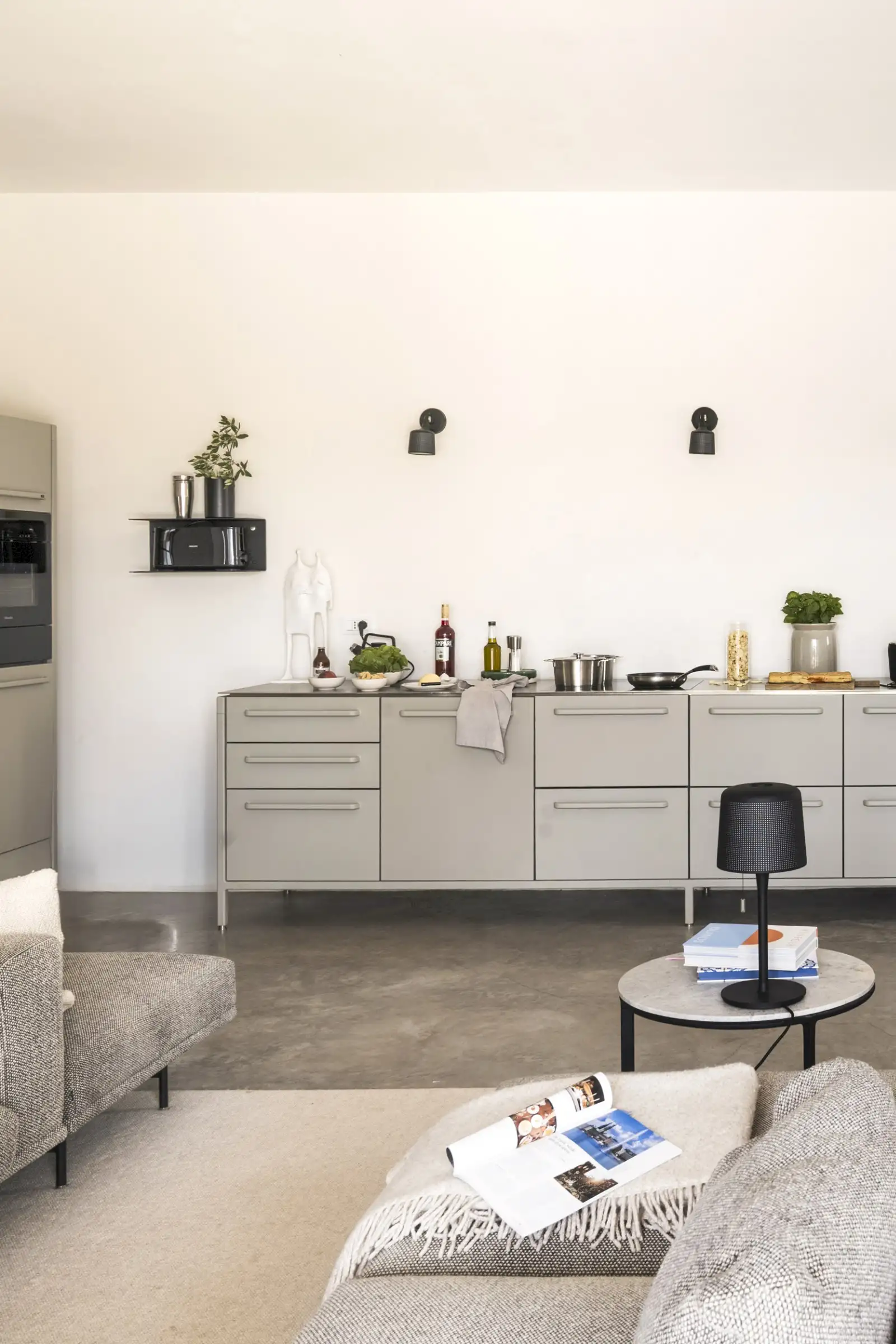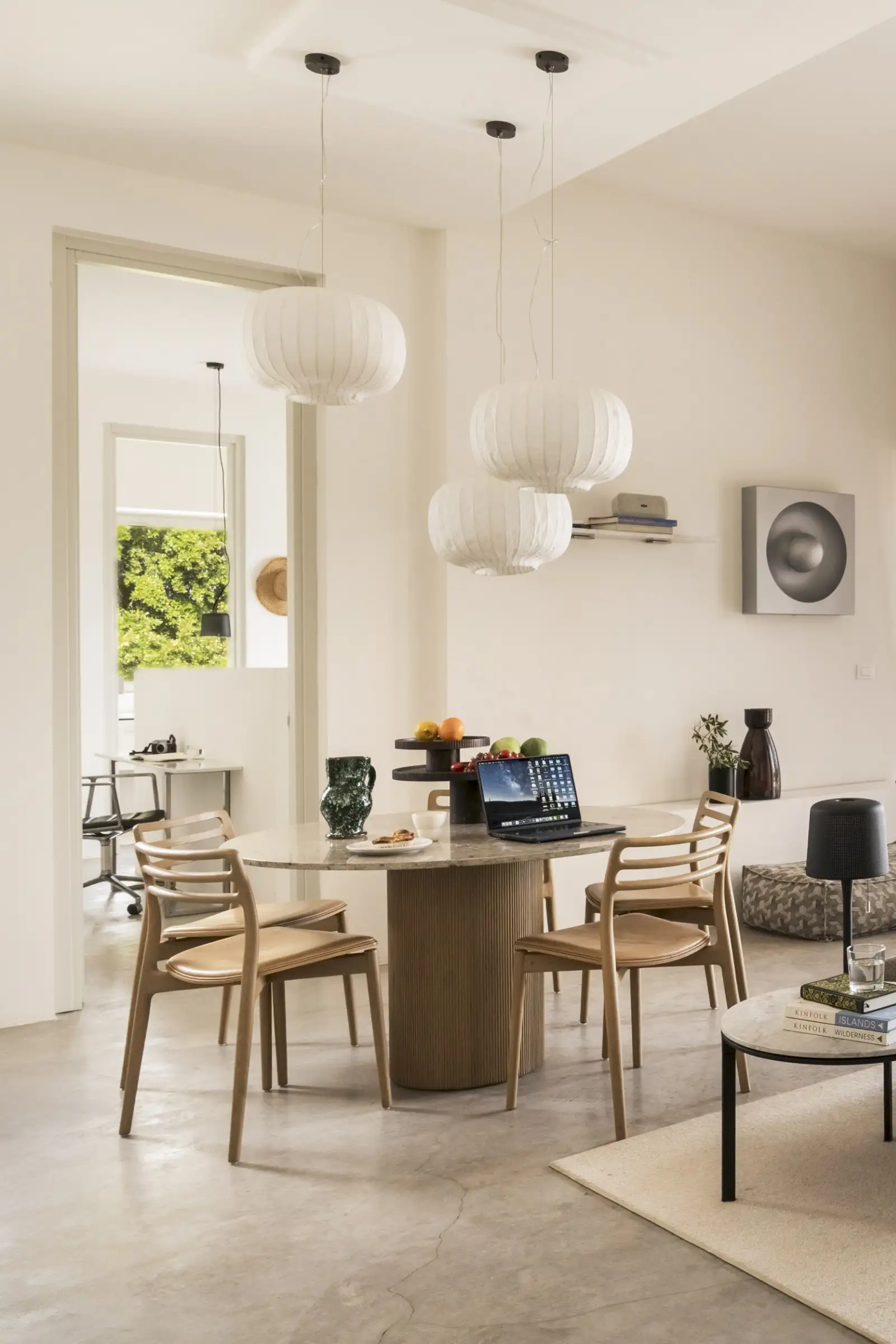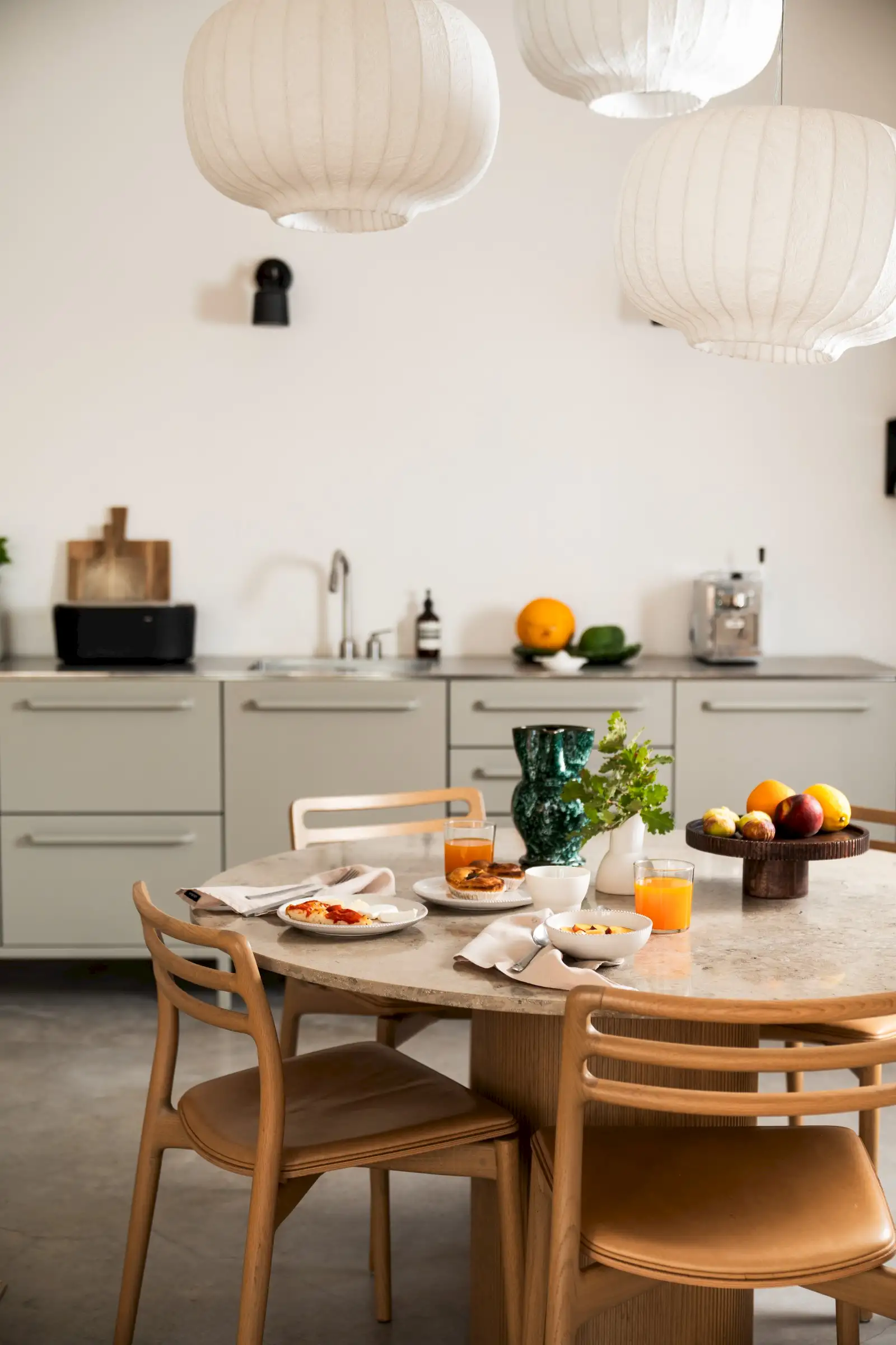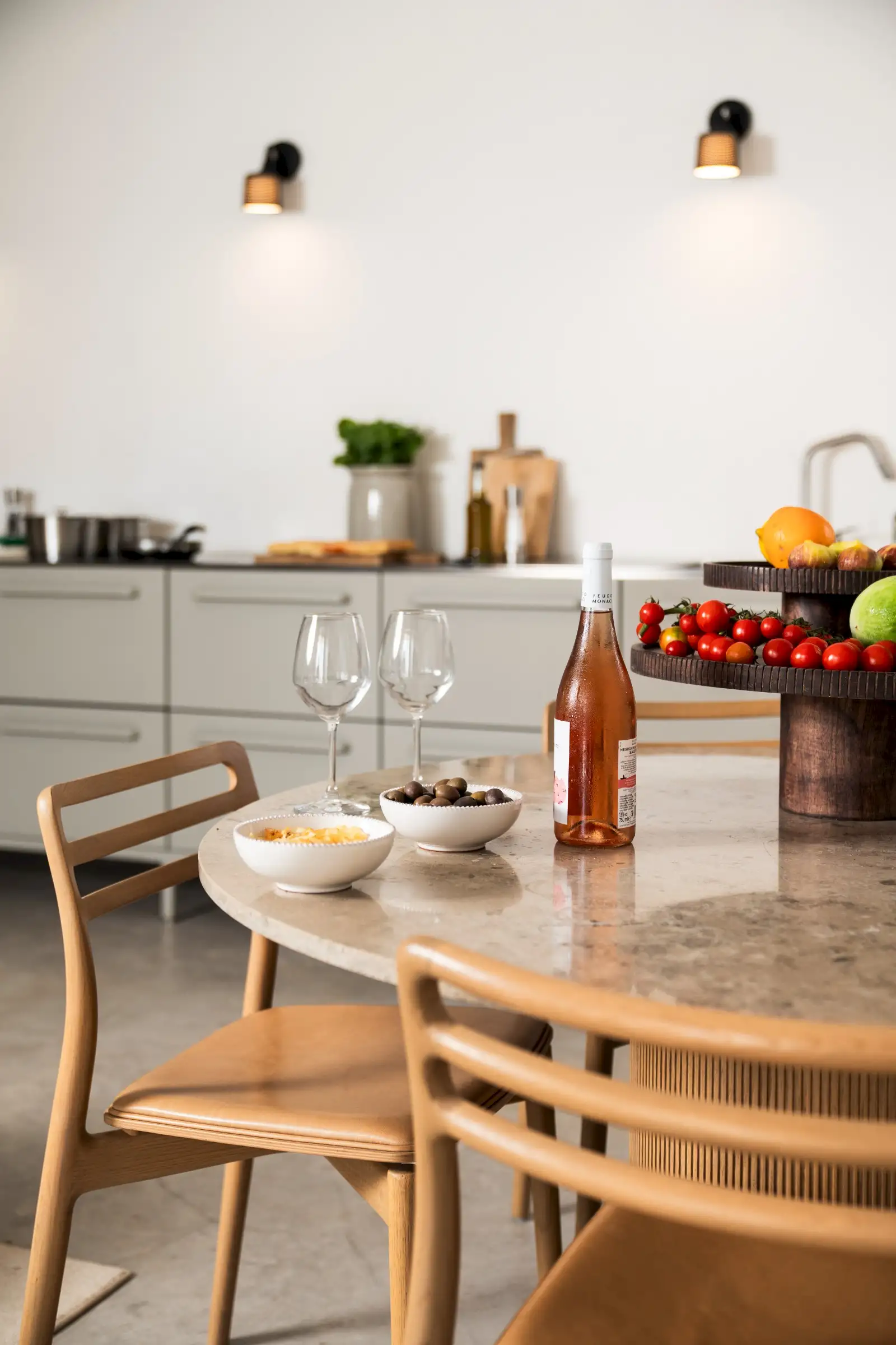 The kitchen is simple yet well-equipped – a run of pale grey units along a wall of the main living space that perfectly combines form with function. Guests can eat at a round wood and marble dining table inside, or outside on the terrace where there is also a BBQ.