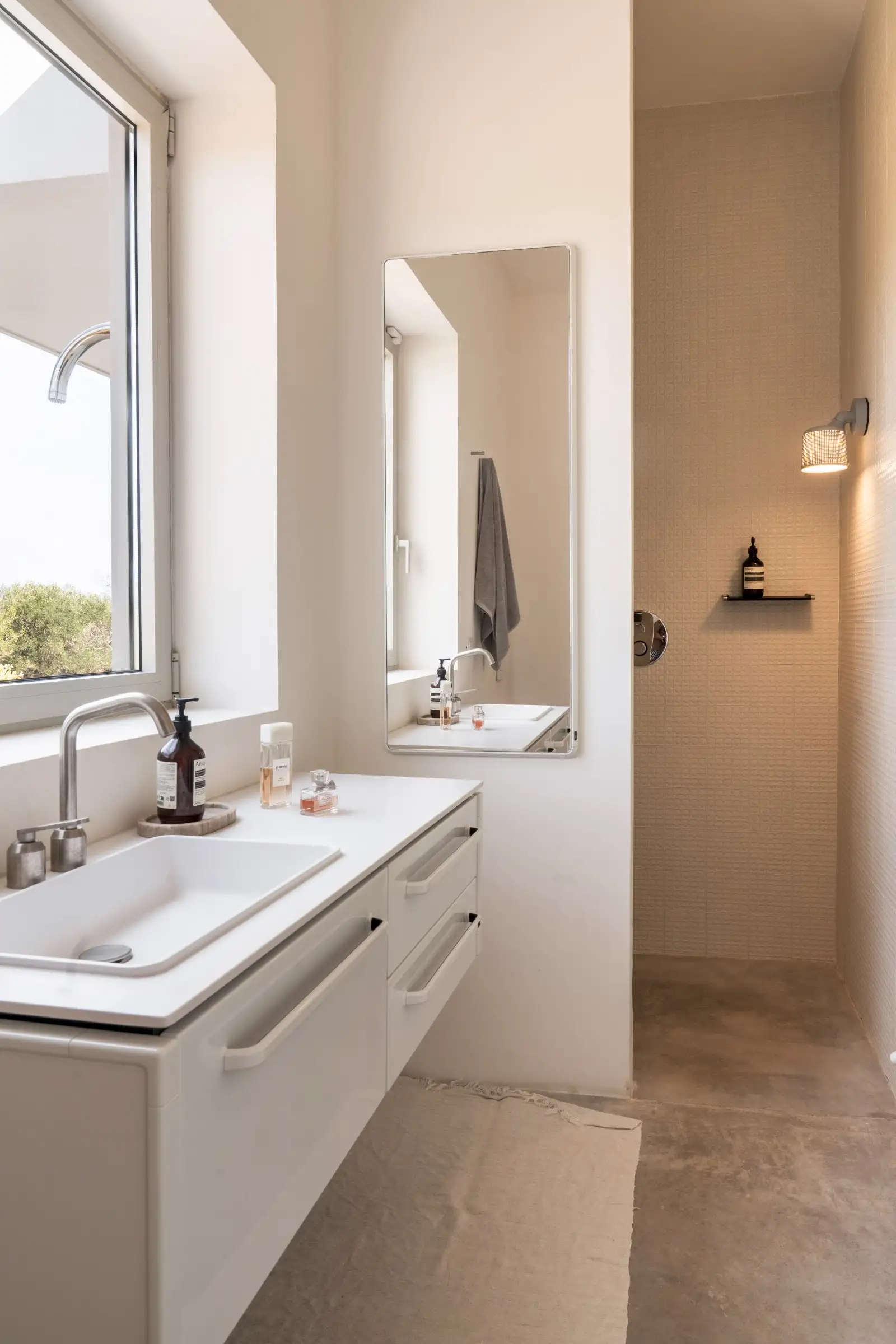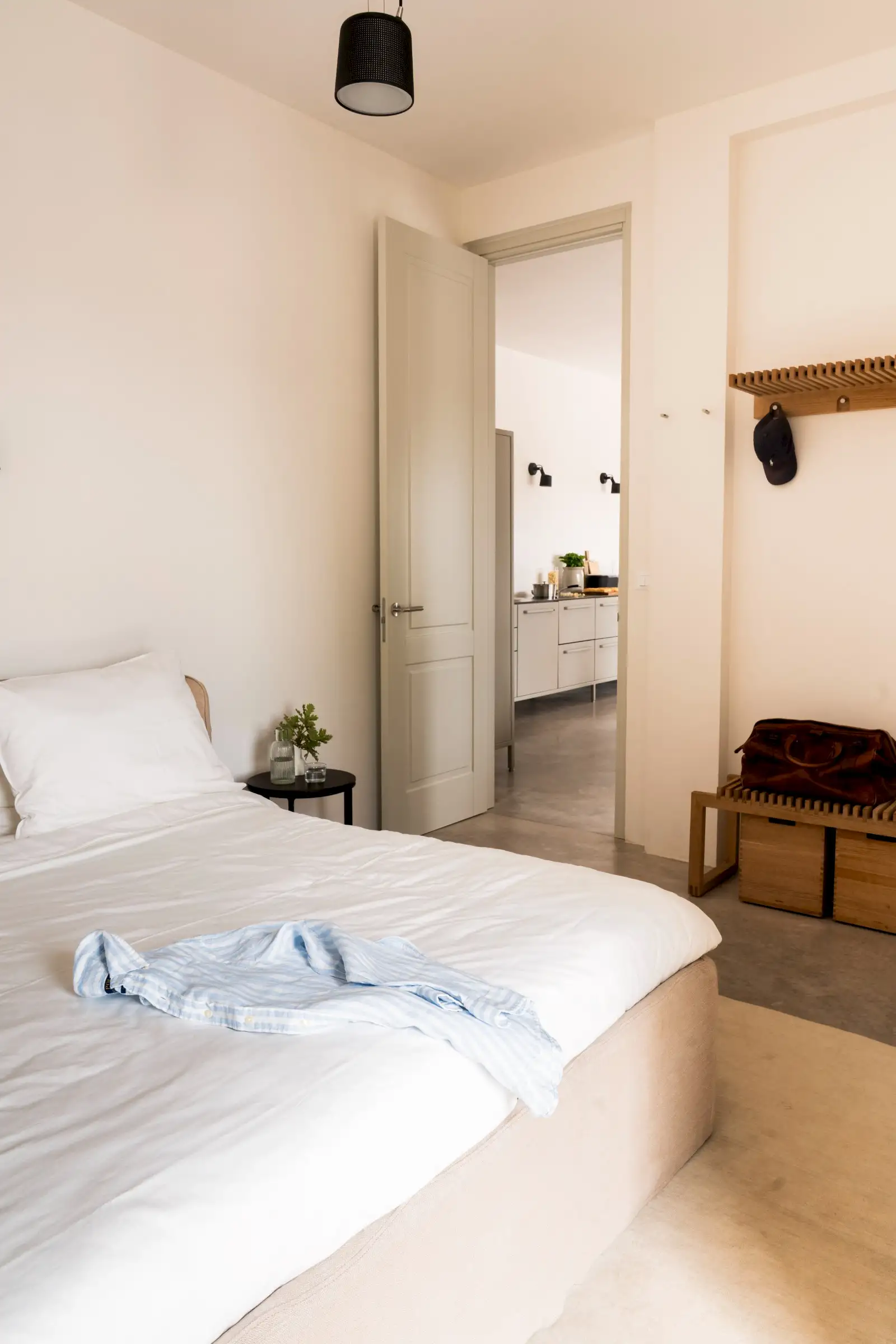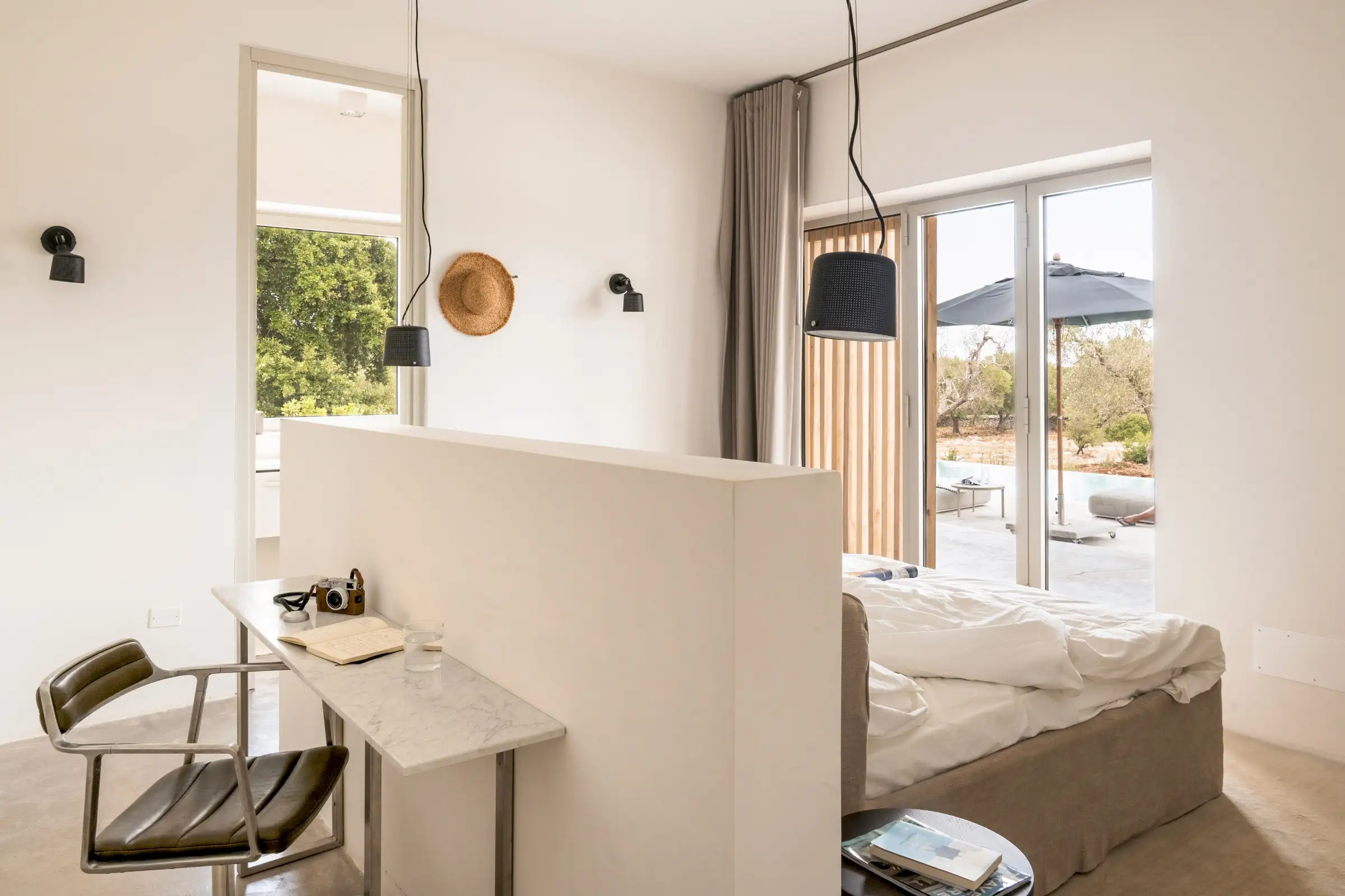 There are three double bedrooms, all with a minimalist aesthetic softened by beautiful linens and doors to the outside. The principal bedroom has a desk behind the headboard wall and is ensuite, while the other two bedrooms share a Jack and Jill bathroom.