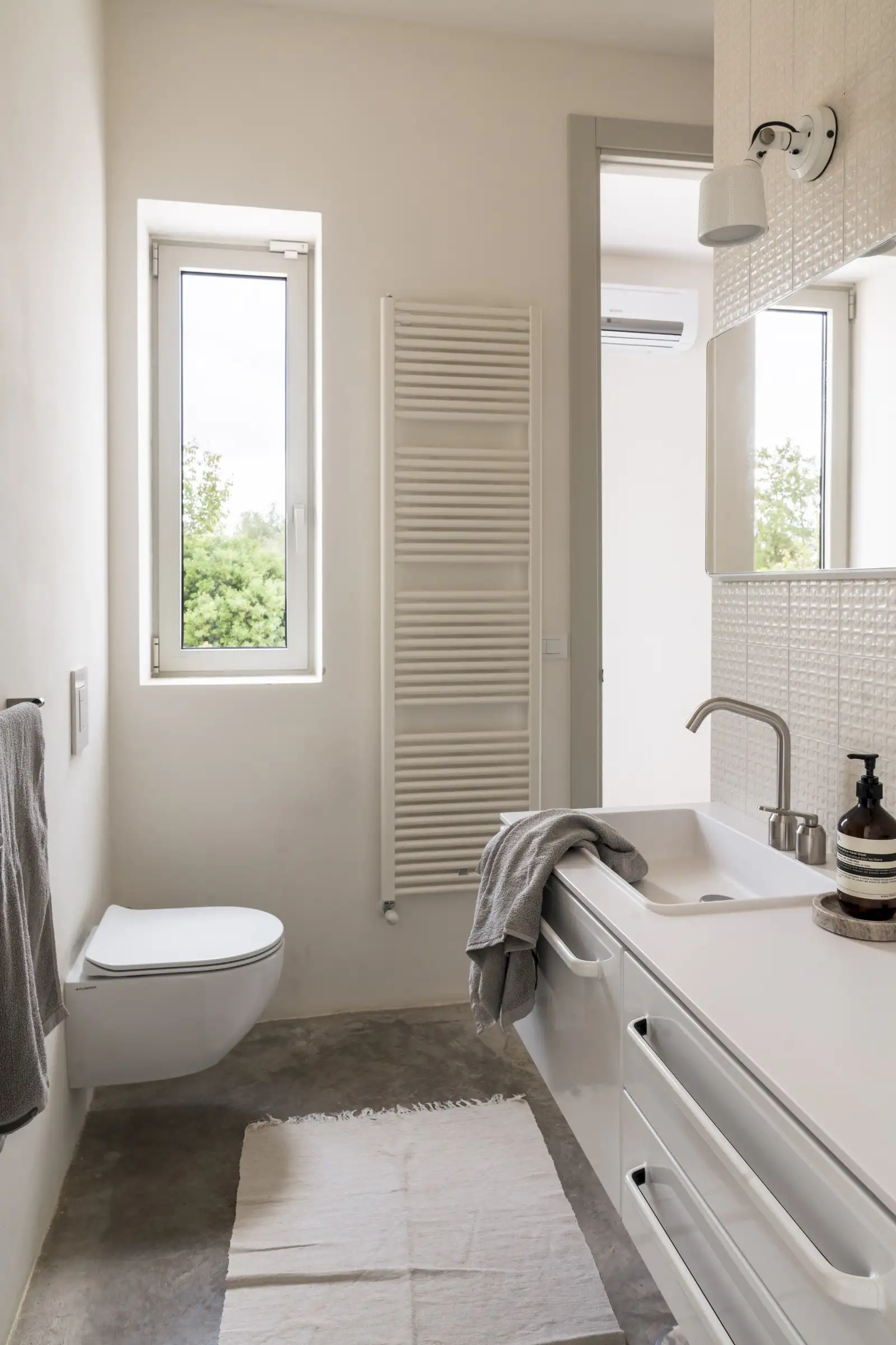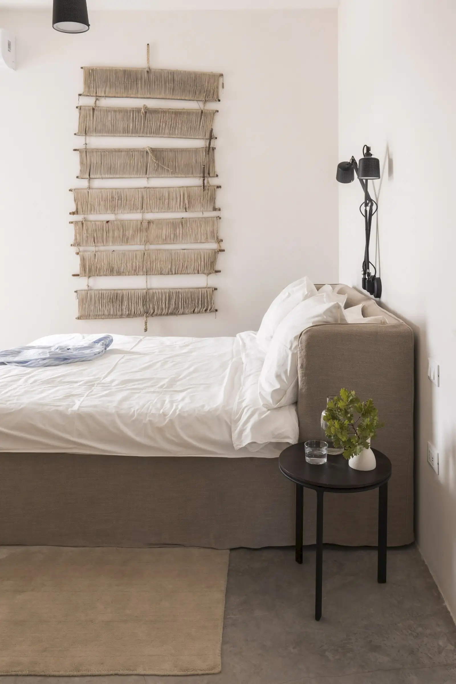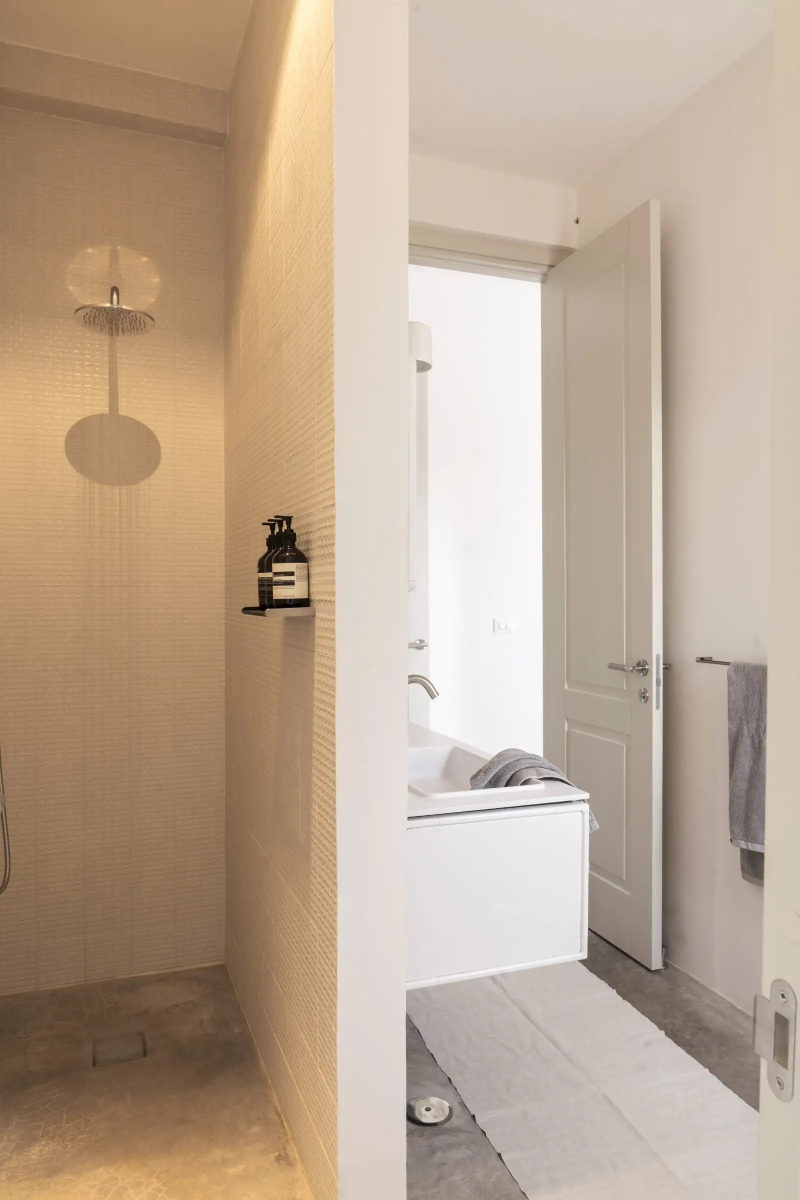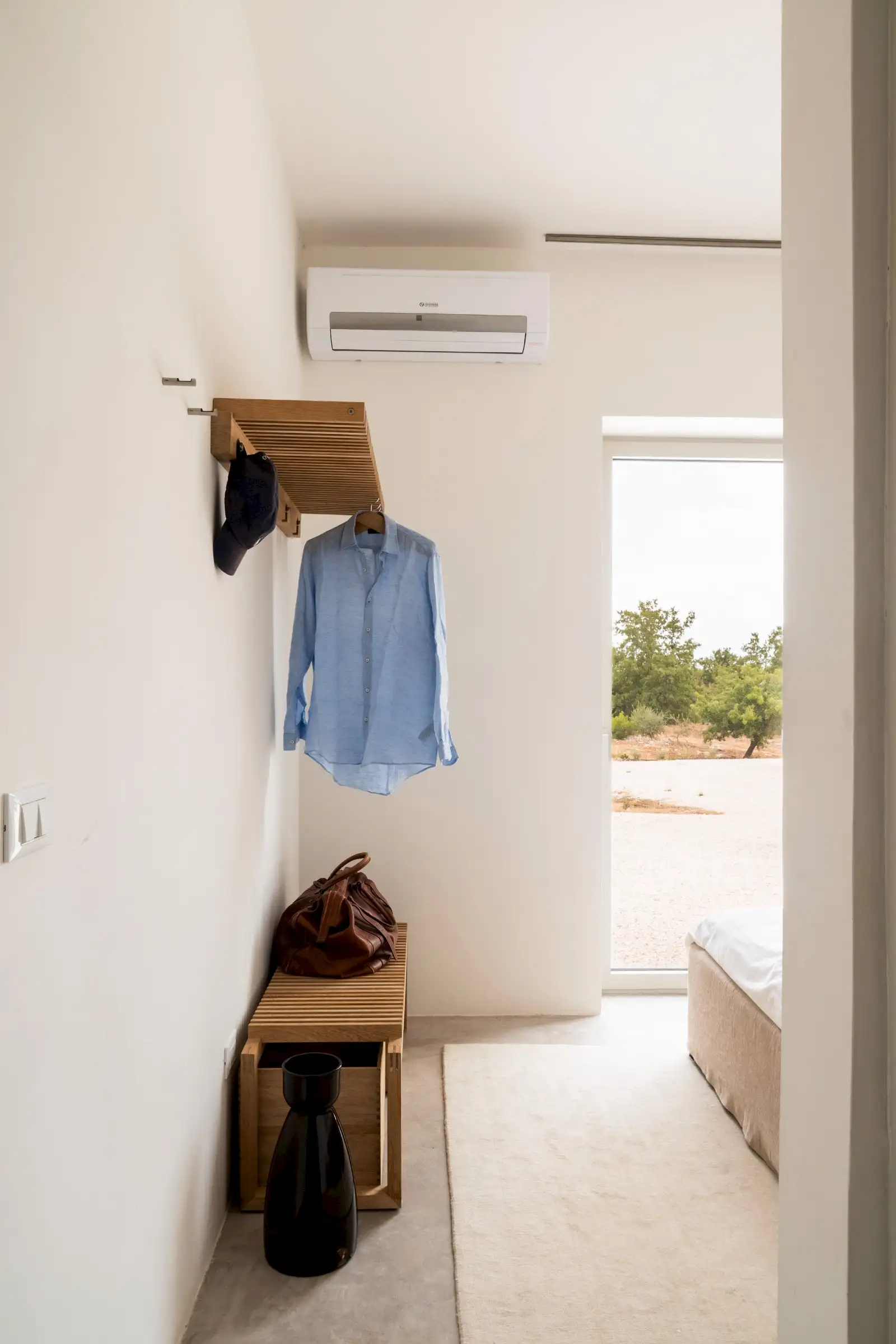 There are three double bedrooms, all with a minimalist aesthetic softened by beautiful linens and doors to the outside. The principal bedroom has a desk behind the headboard wall and is ensuite, while the other two bedrooms share a Jack and Jill bathroom.