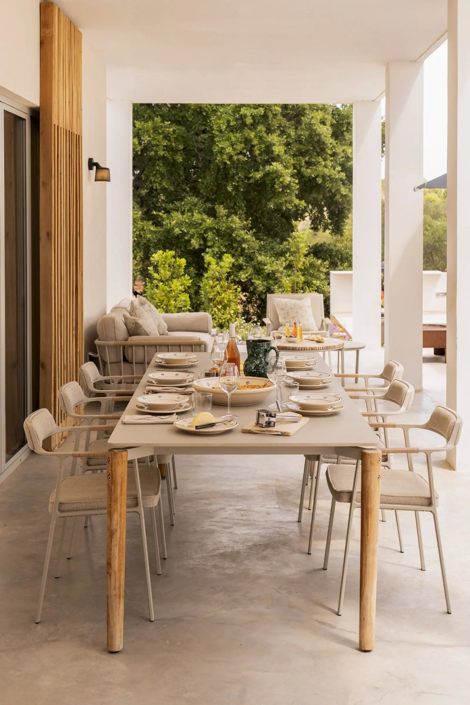 Smooth concrete floors flow from the open-plan living space and the three double bedrooms that surround it, out onto the large terrace. The glorious pool is surrounded by double sun beds – all cushion and softness, and covered dining and sitting areas make the most of the climate and the setting. At sunset, you can head up to the roof terrace for the best views.