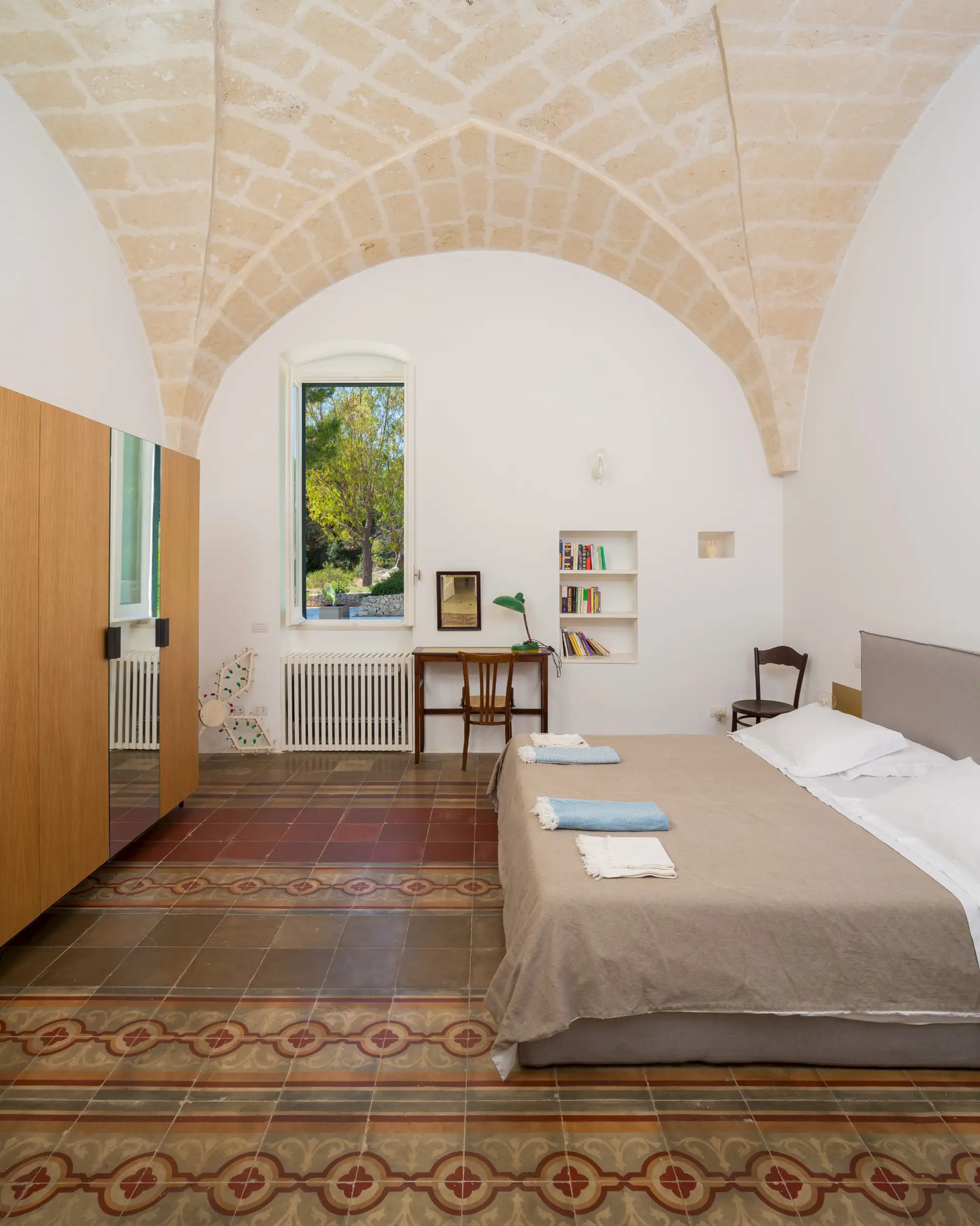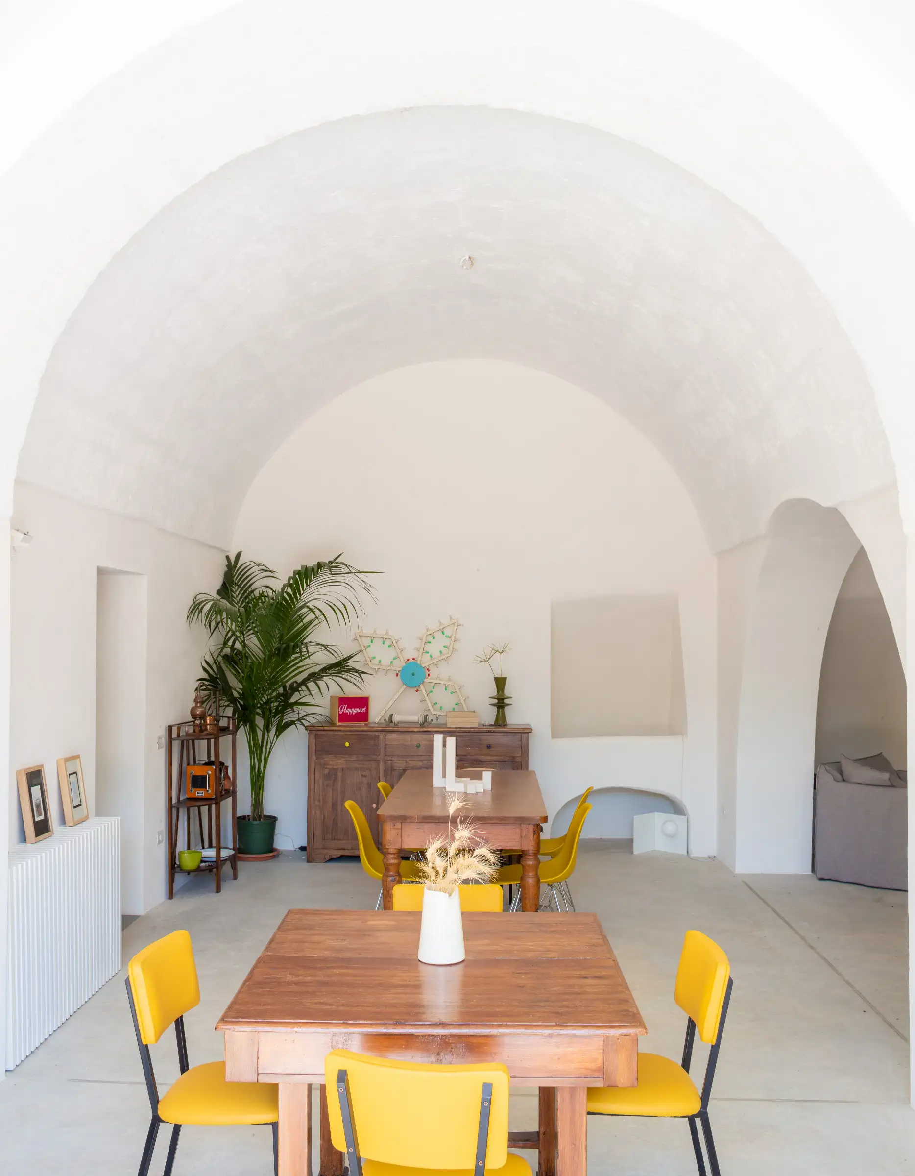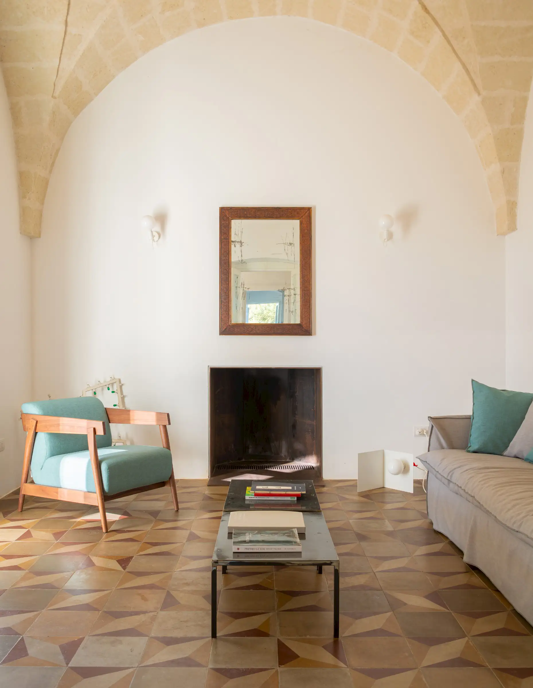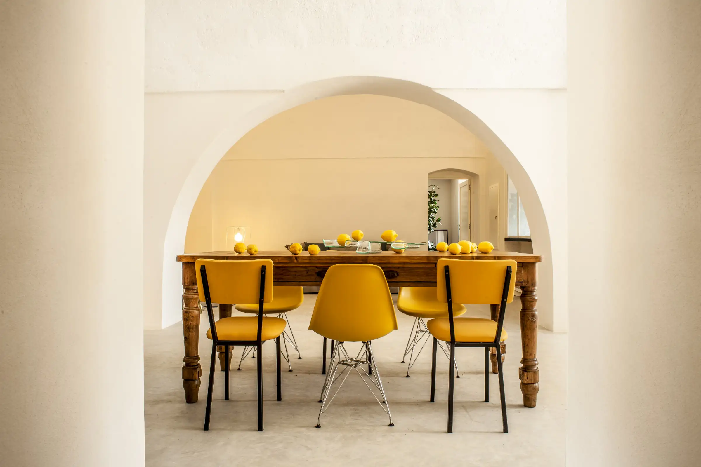 The beautiful proportions of the arched rooms and the subtle combination of white walls, elegant stone and shades of green create a calm space that encourages guests to melt into its charm. The furniture is a mix of traditional rustic and mid-century classic with soft citrus colours reflecting the surrounding landscape. The floor tiles alone are expansive works of original art.