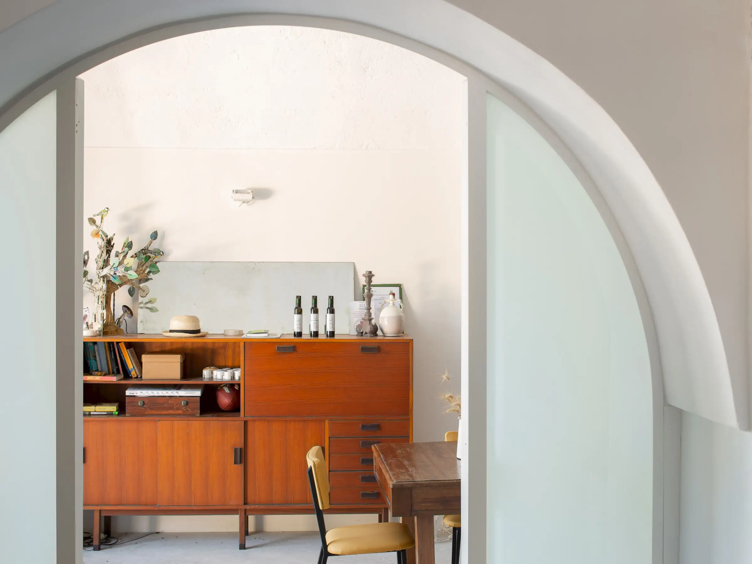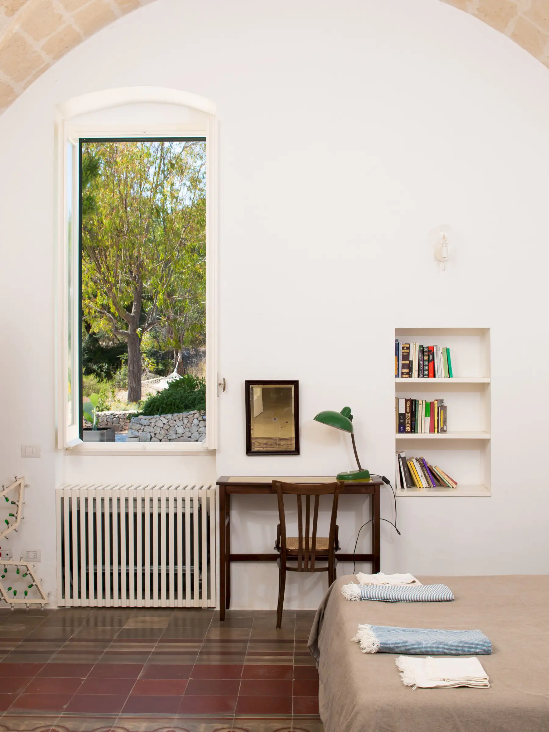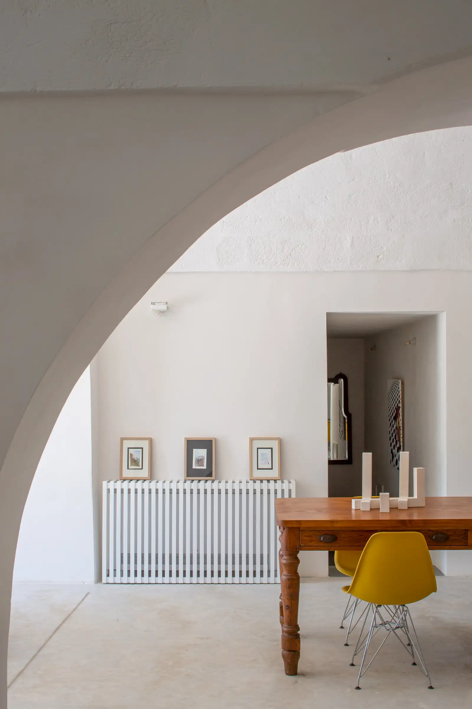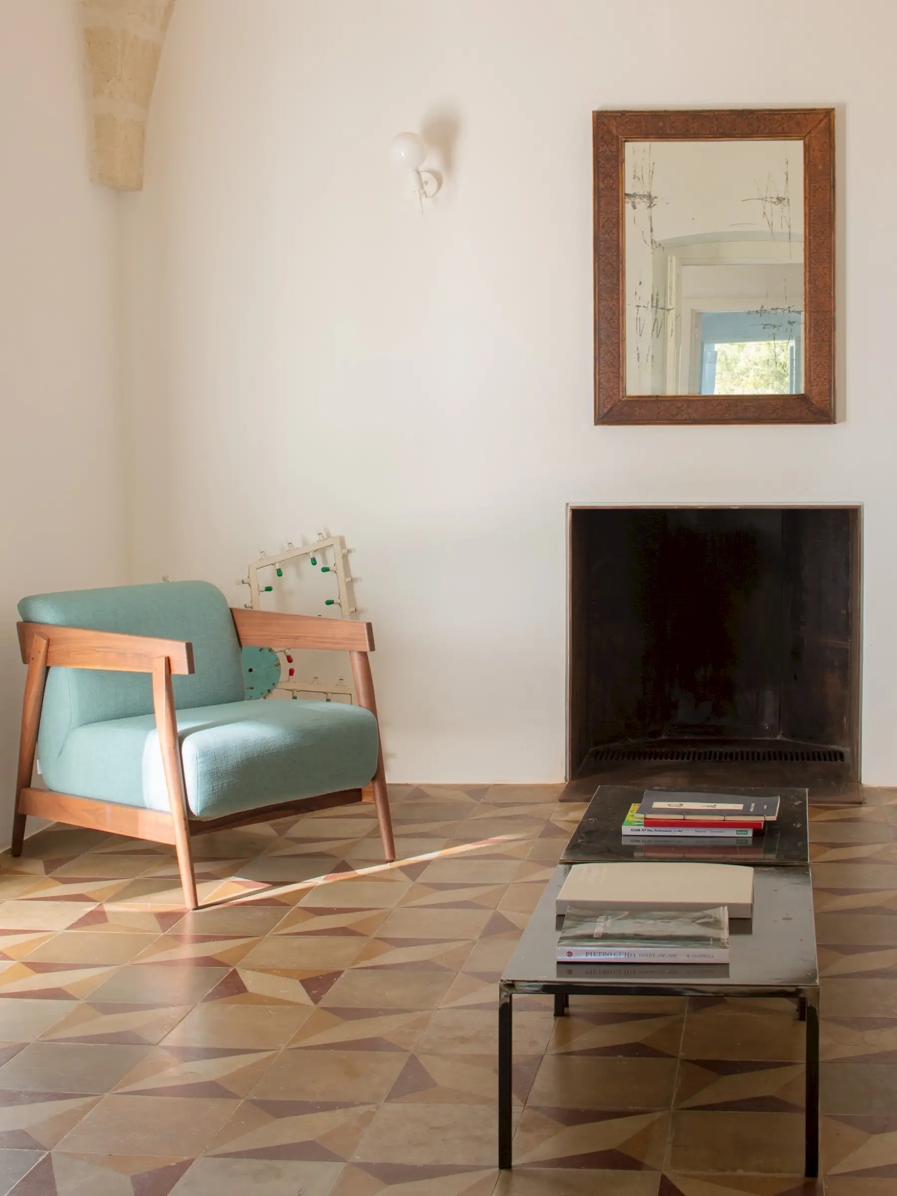 The beautiful proportions of the arched rooms and the subtle combination of white walls, elegant stone and shades of green create a calm space that encourages guests to melt into its charm. The furniture is a mix of traditional rustic and mid-century classic with soft citrus colours reflecting the surrounding landscape. The floor tiles alone are expansive works of original art.