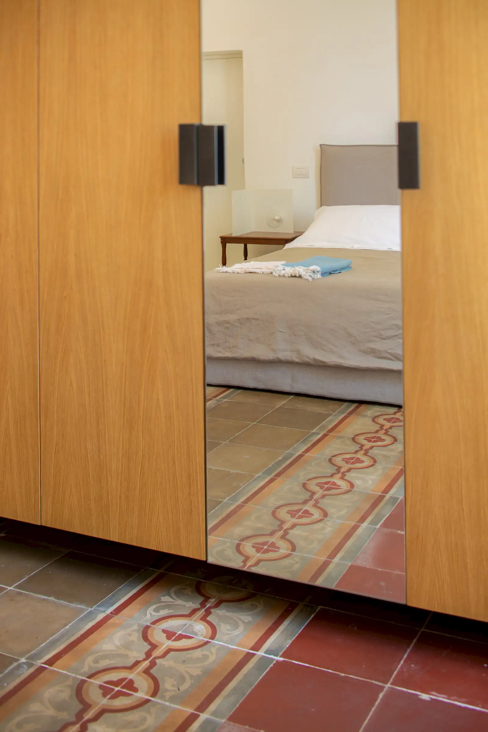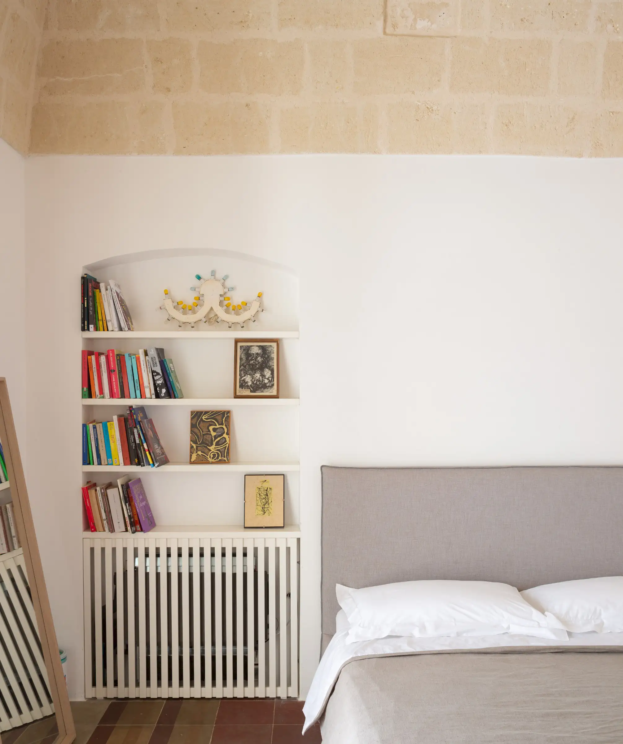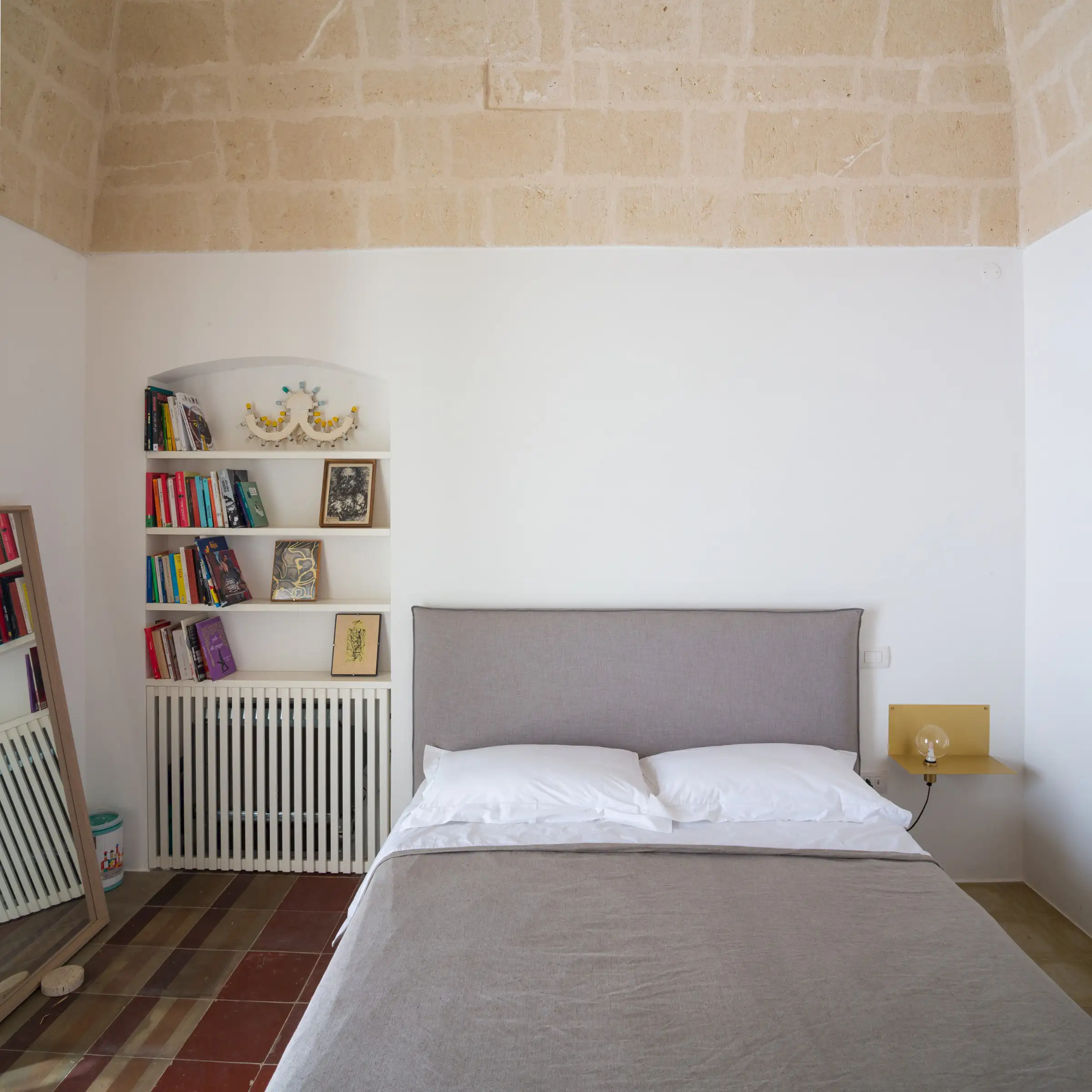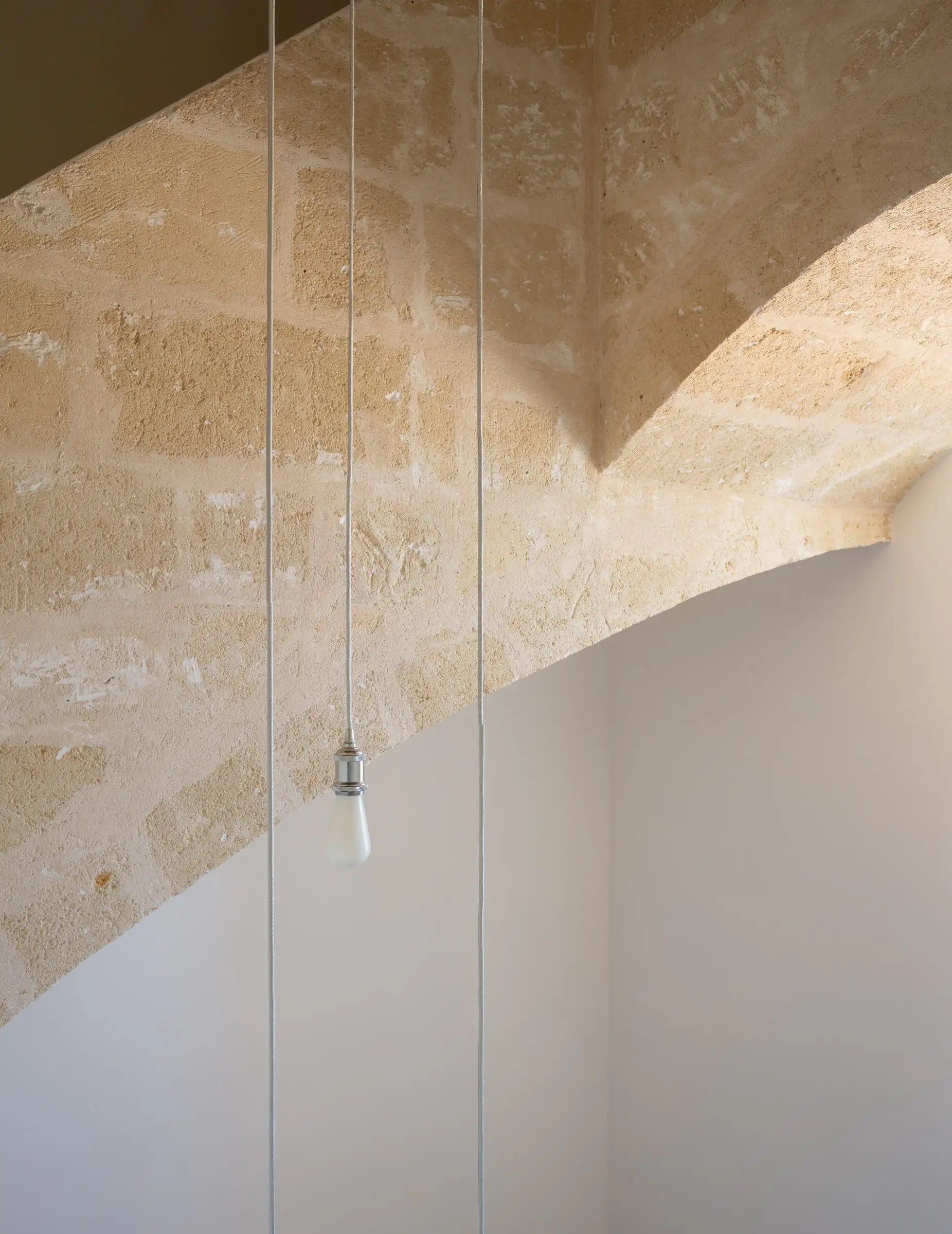 The beautiful proportions of the arched rooms and the subtle combination of white walls, elegant stone and shades of green create a calm space that encourages guests to melt into its charm. The furniture is a mix of traditional rustic and mid-century classic with soft citrus colours reflecting the surrounding landscape. The floor tiles alone are expansive works of original art.