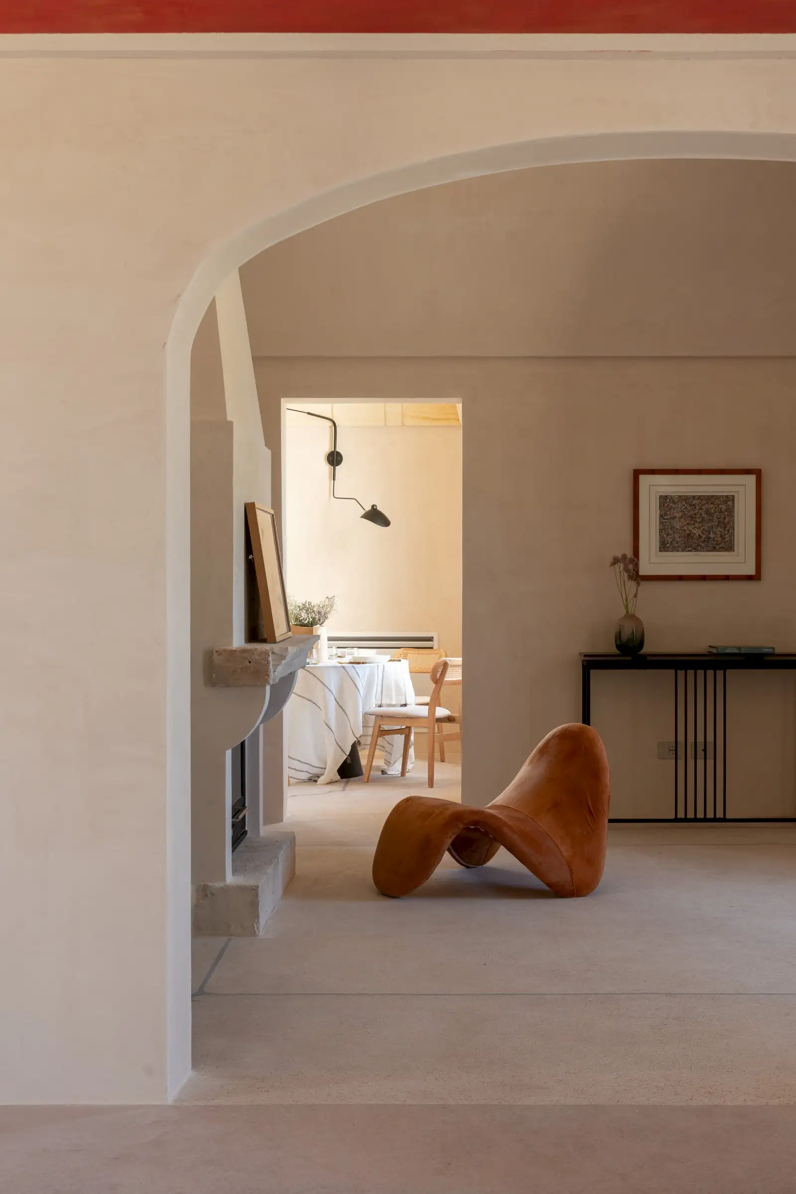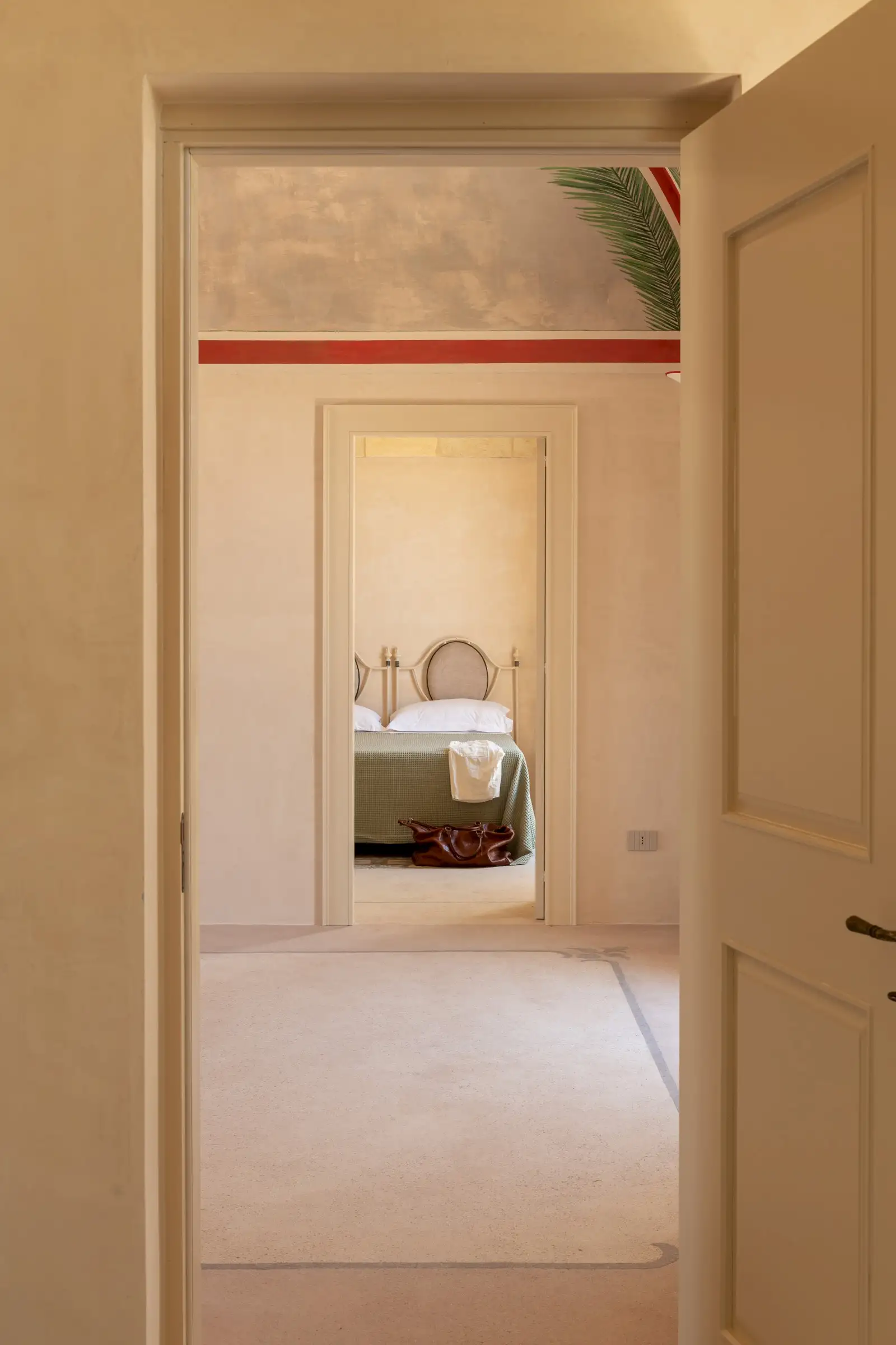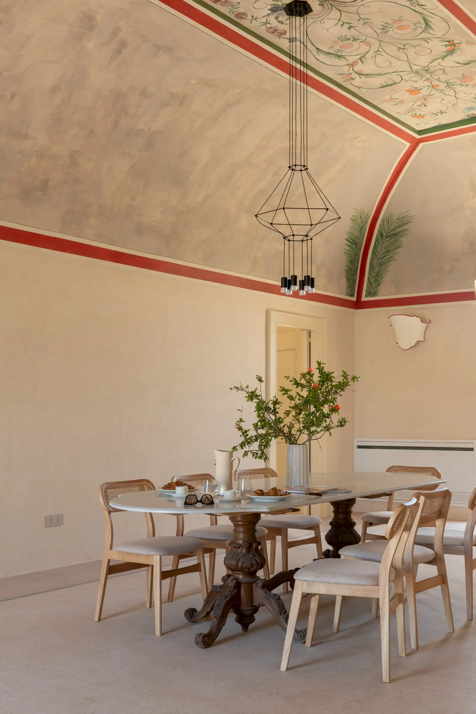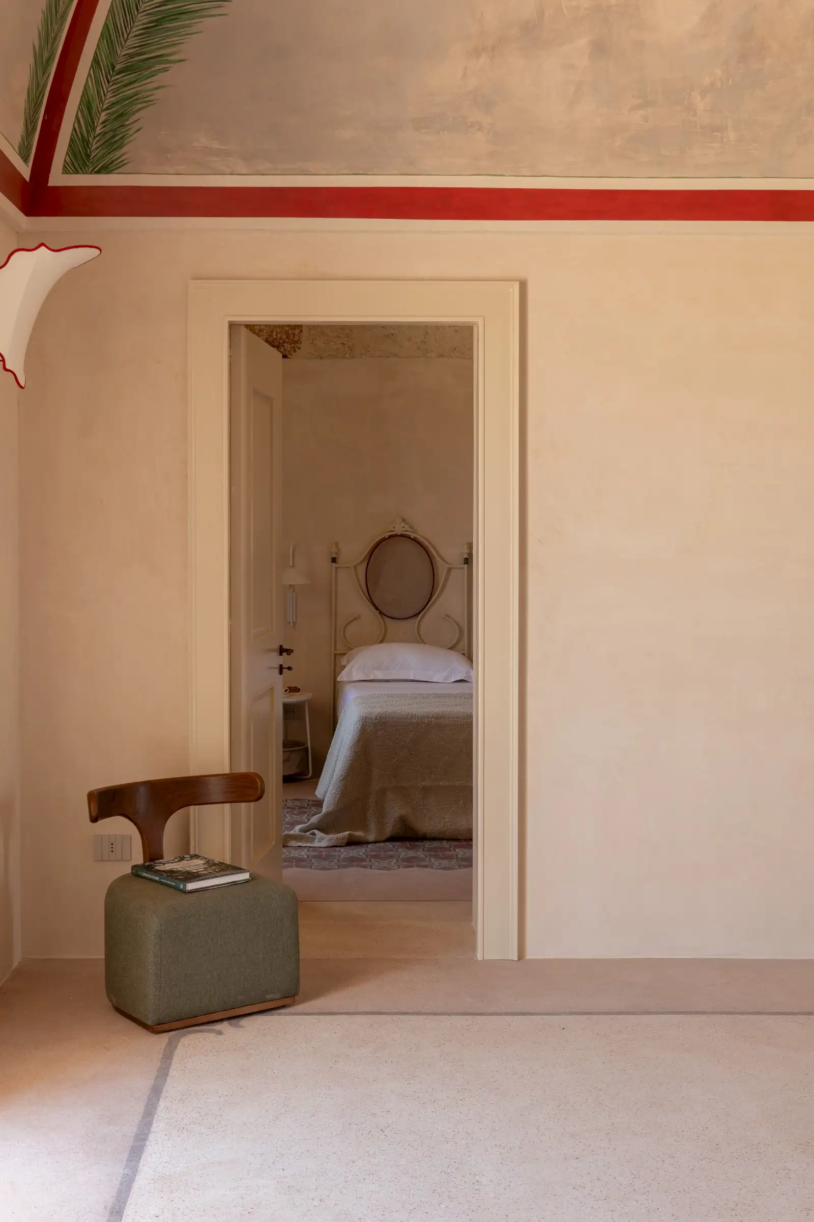 Terrazzo floors are artworks in themselves, with hexagonal tiles with a star design decorating the middle of one of the bedroom floors, while frescoes of palm leaves above a scarlet border are painted on the barrel-vault ceiling of the impressive ground-floor entrance hall. This is the limit of the decoration and the simplicity of the eclectic furniture, from antique to mid-century, paired with modern light fittings and shallow, fluted stone basins, offers a surprisingly cohesive, welcoming and gentle atmosphere.