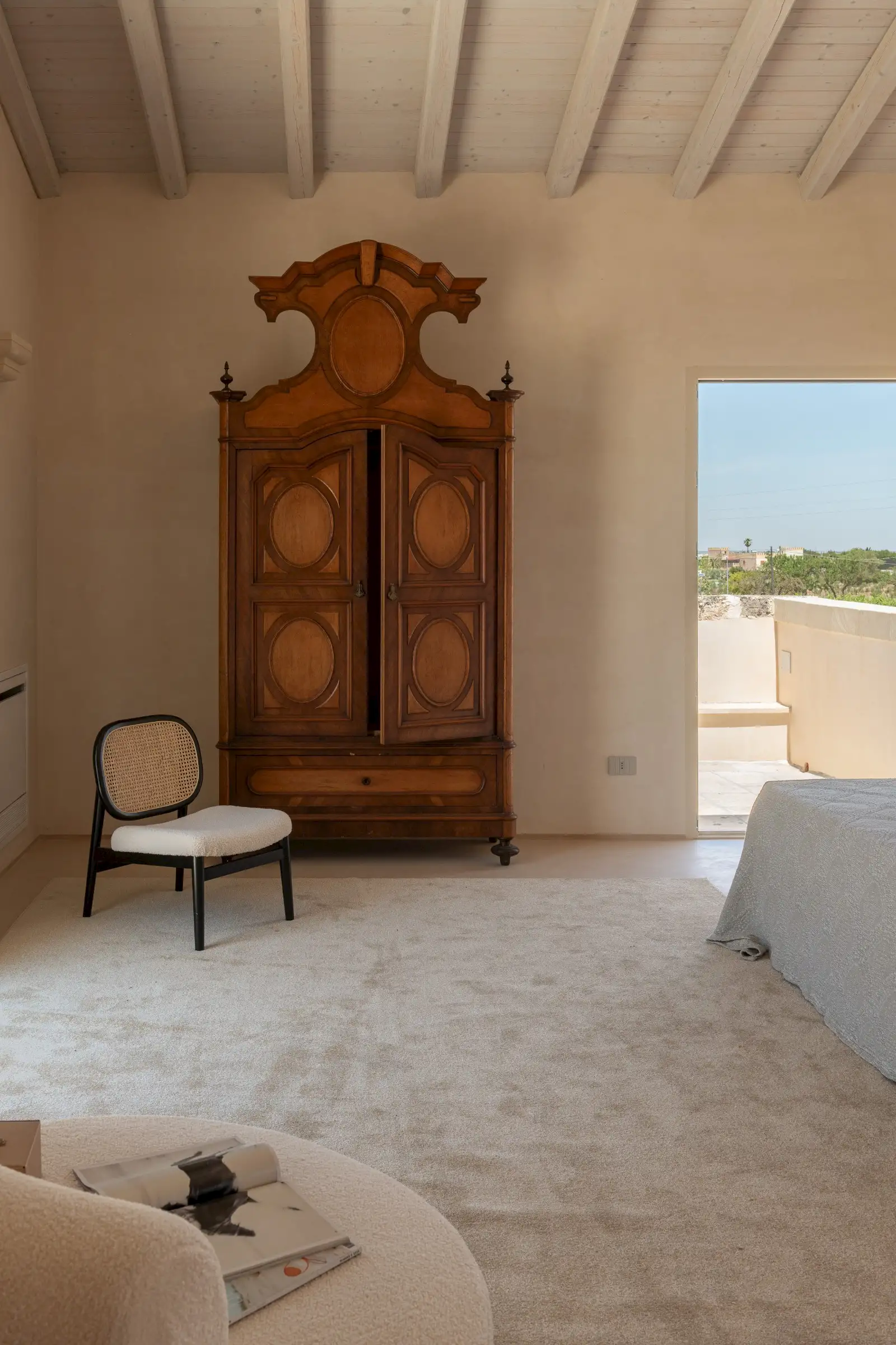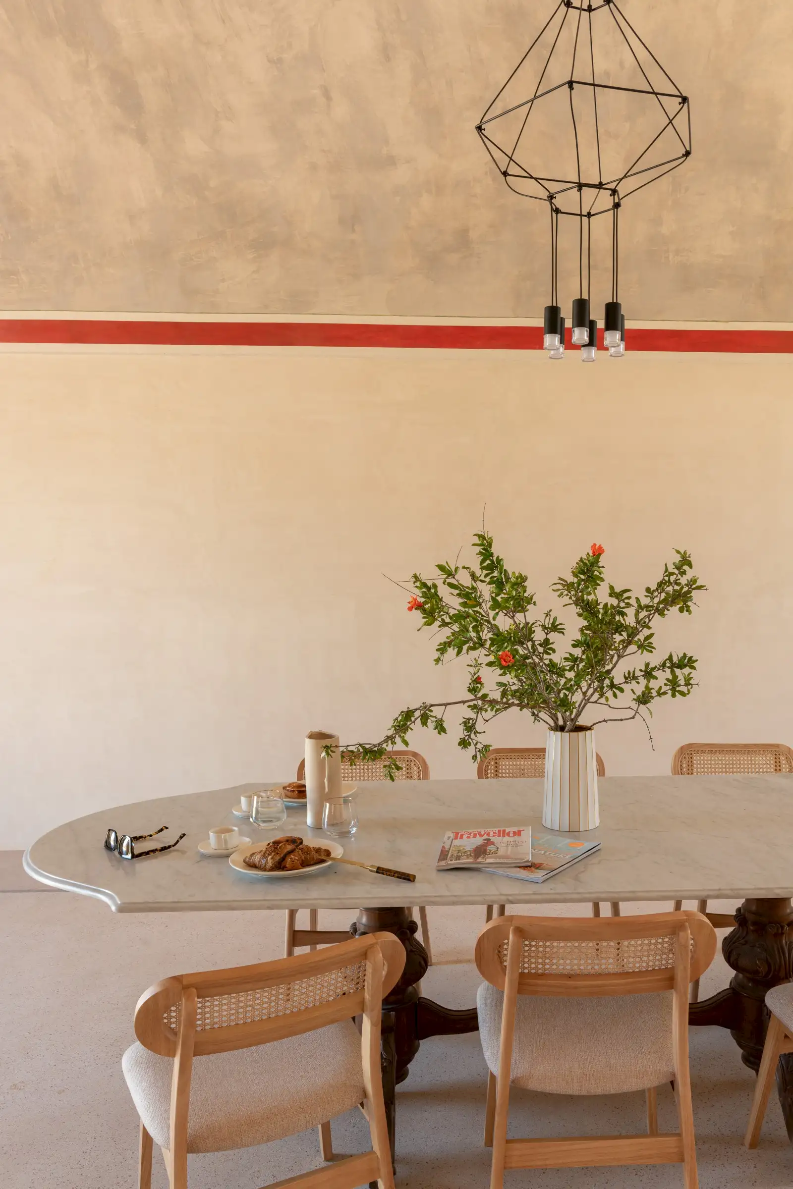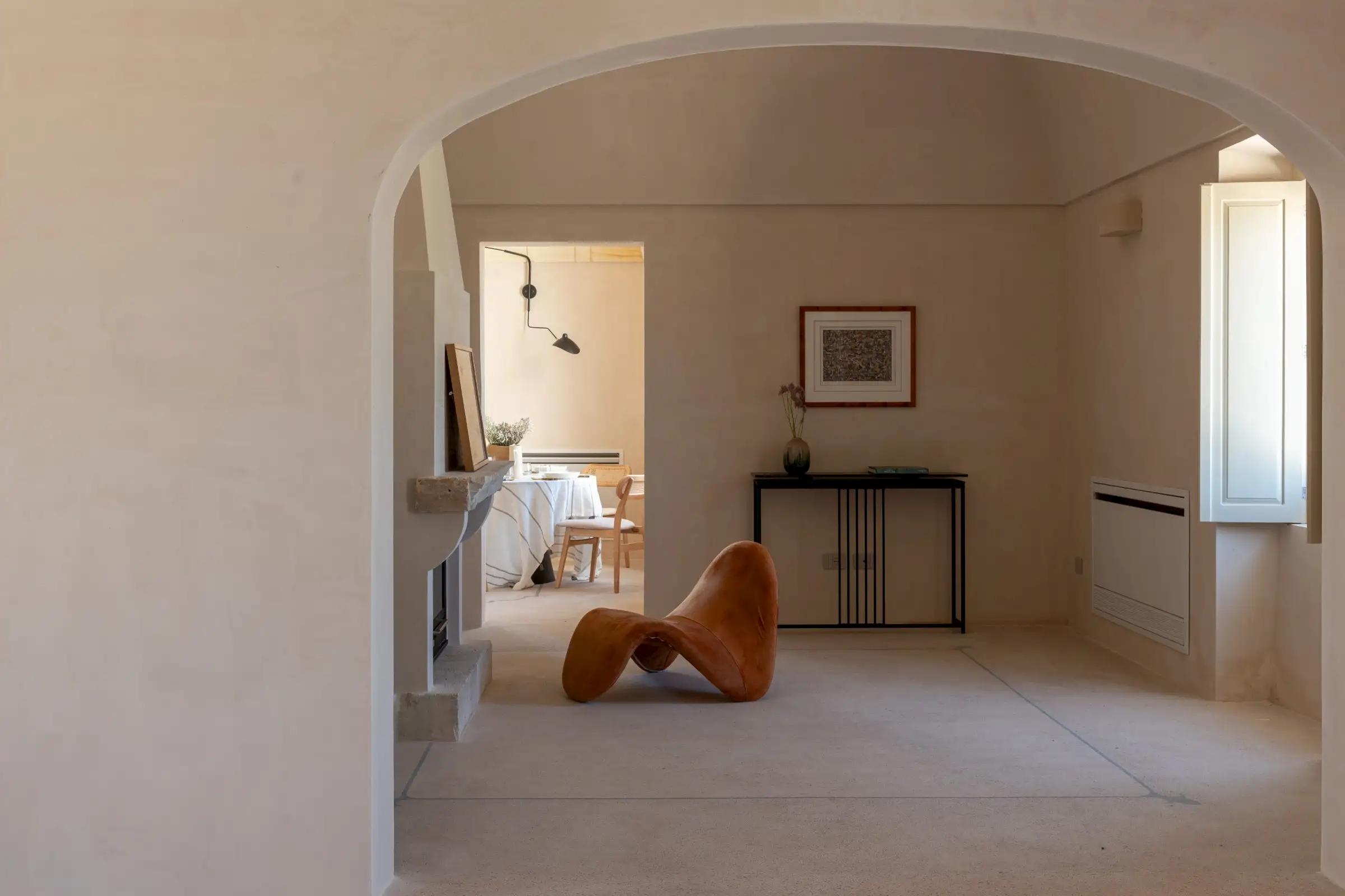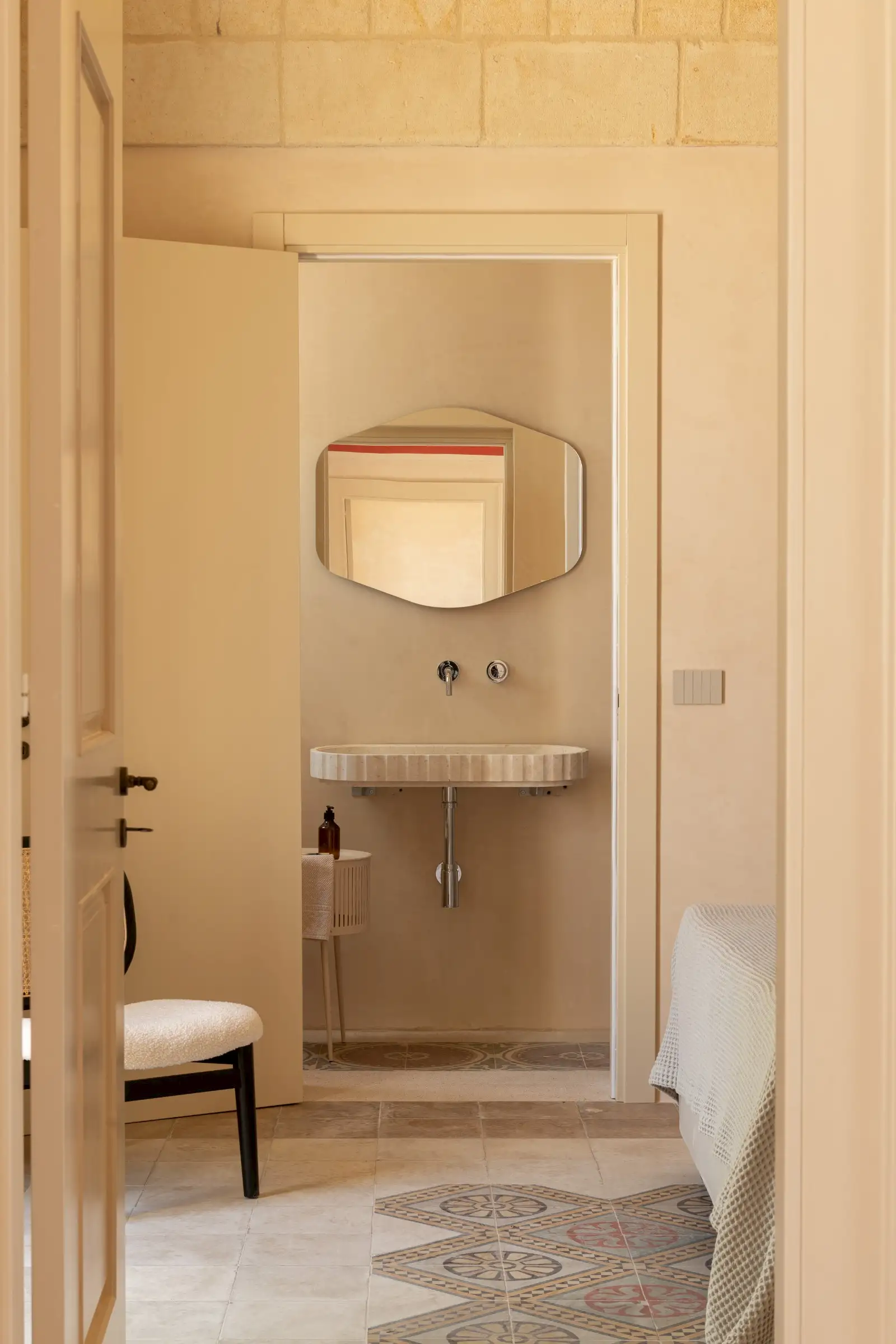Terrazzo floors are artworks in themselves, with hexagonal tiles with a star design decorating the middle of one of the bedroom floors, while frescoes of palm leaves above a scarlet border are painted on the barrel-vault ceiling of the impressive ground-floor entrance hall. This is the limit of the decoration and the simplicity of the eclectic furniture, from antique to mid-century, paired with modern light fittings and shallow, fluted stone basins, offers a surprisingly cohesive, welcoming and gentle atmosphere.