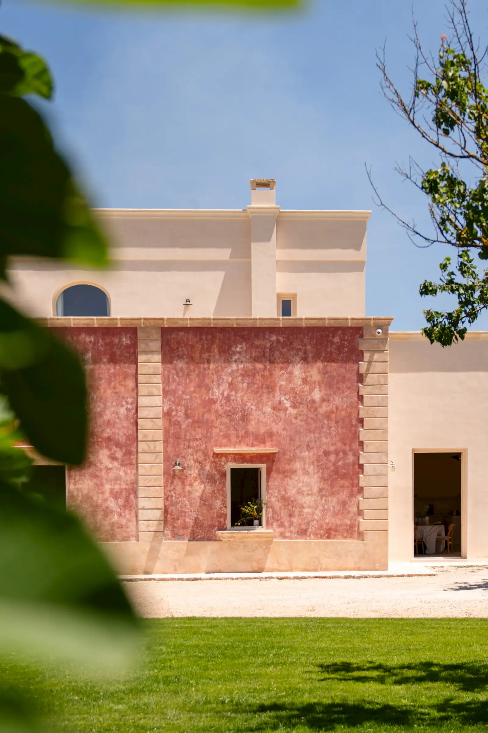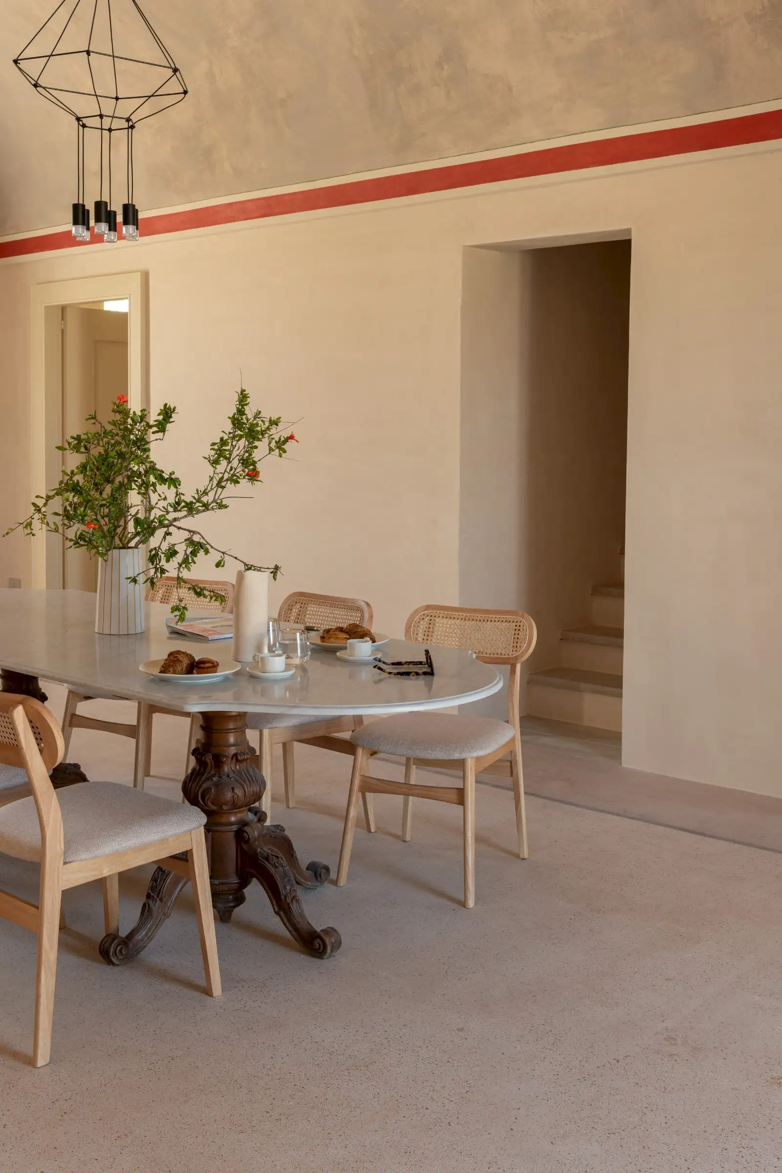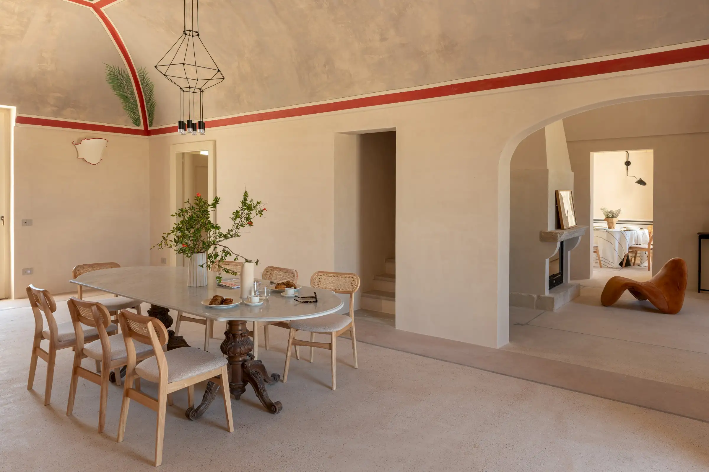 The villa makes the most of Puglia’s soft light, with its mottled vermillion façade and warm neutrals on the walls inside. Guests will be wowed by the generous entrance hall with its frescos and its magnificent central table – a thin sheet of beautifully veined marble on decoratively carved dark-wood legs.