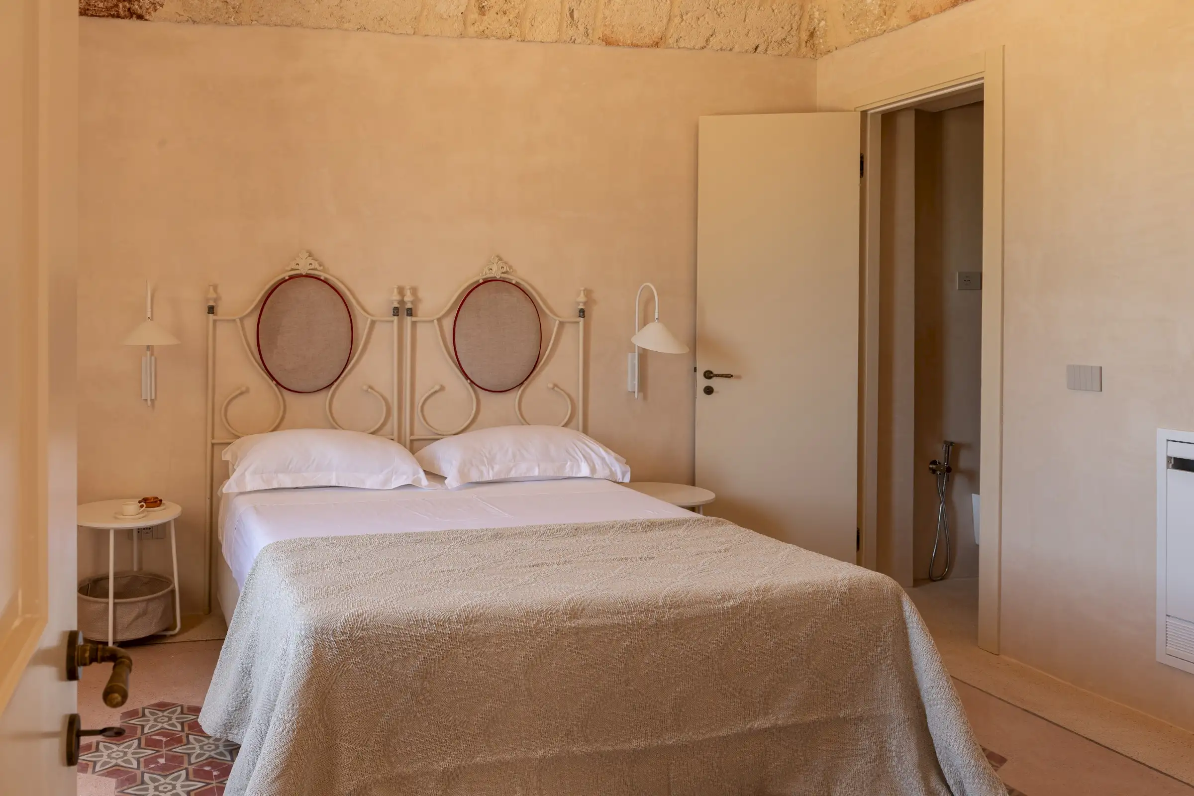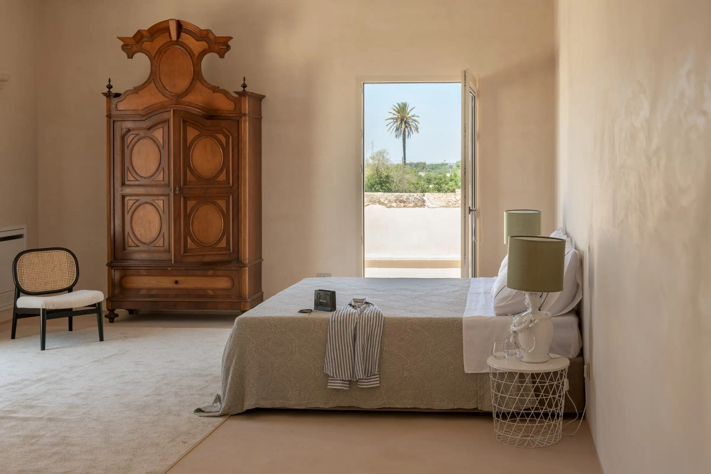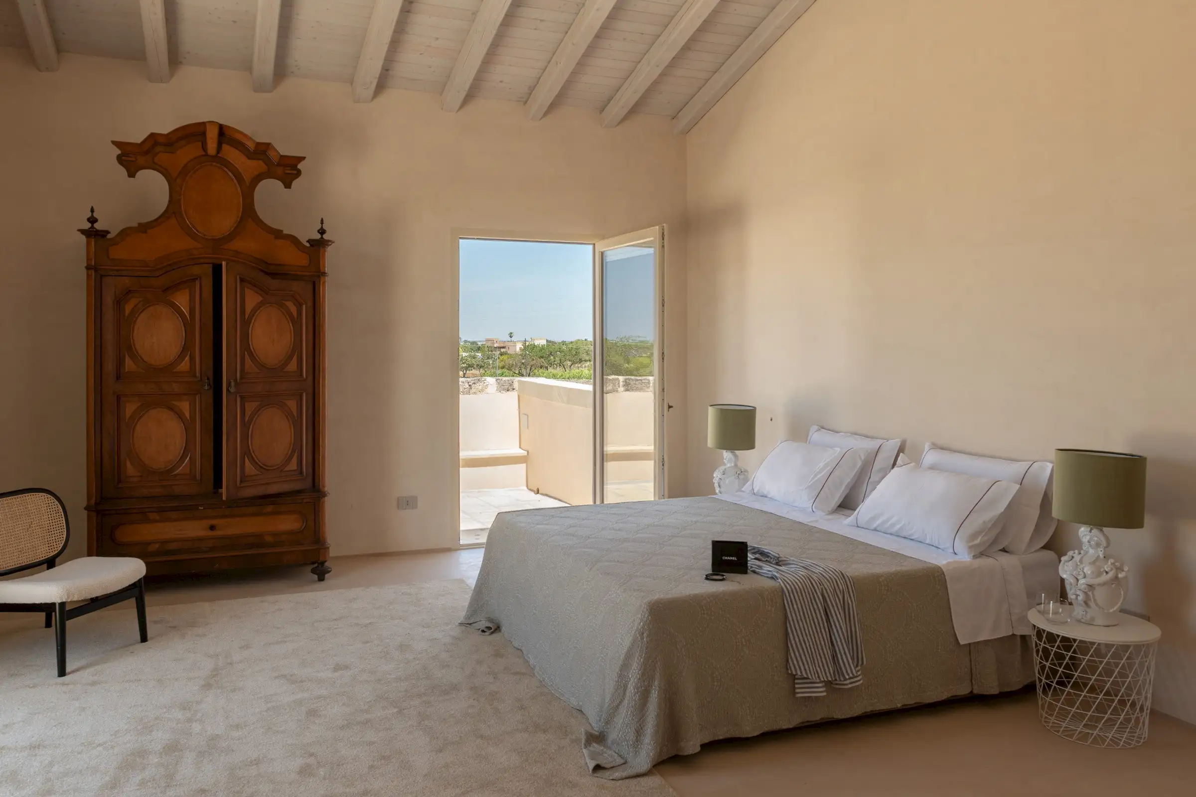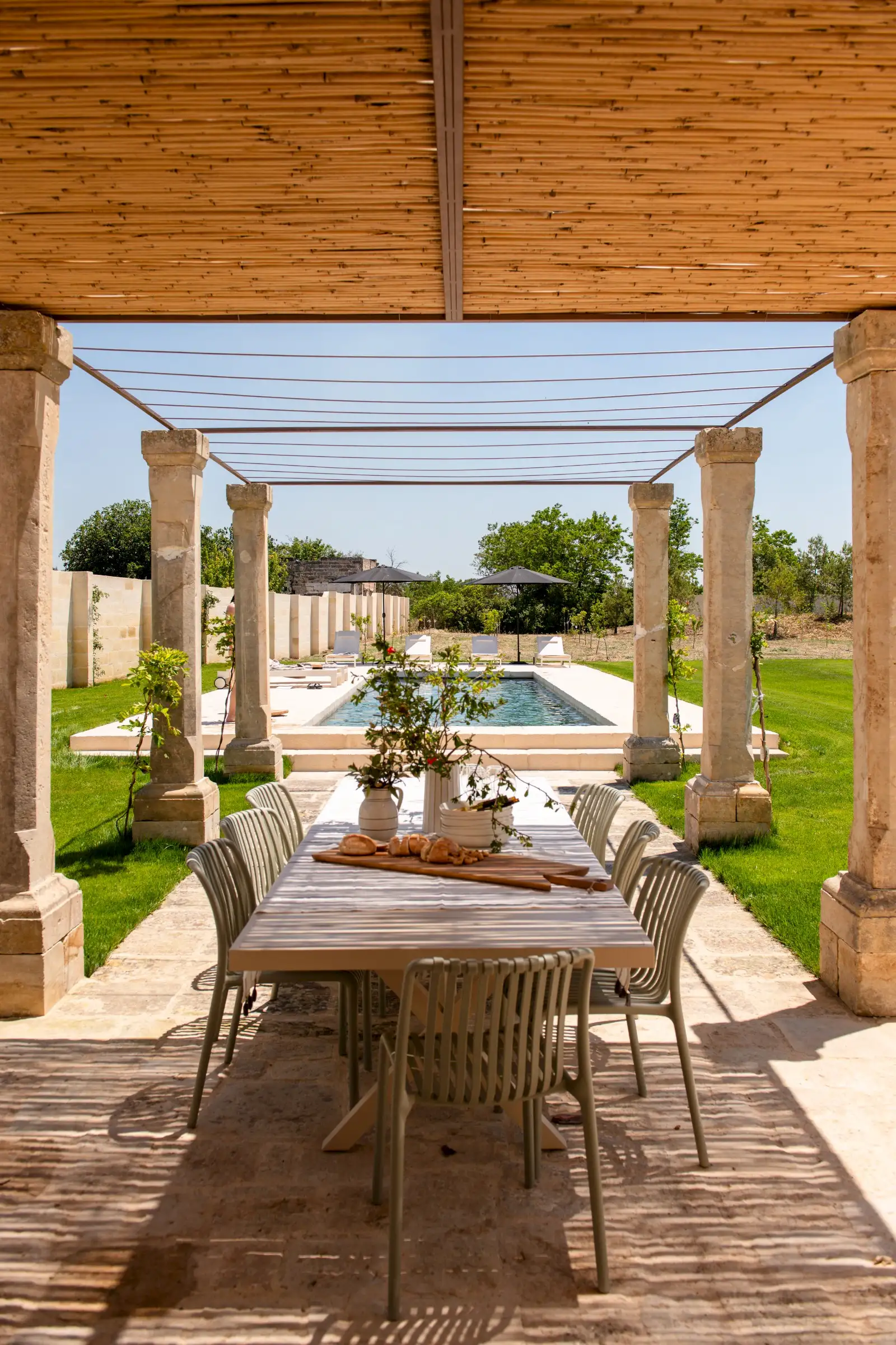 The villa makes the most of Puglia’s soft light, with its mottled vermillion façade and warm neutrals on the walls inside. Guests will be wowed by the generous entrance hall with its frescos and its magnificent central table – a thin sheet of beautifully veined marble on decoratively carved dark-wood legs.
