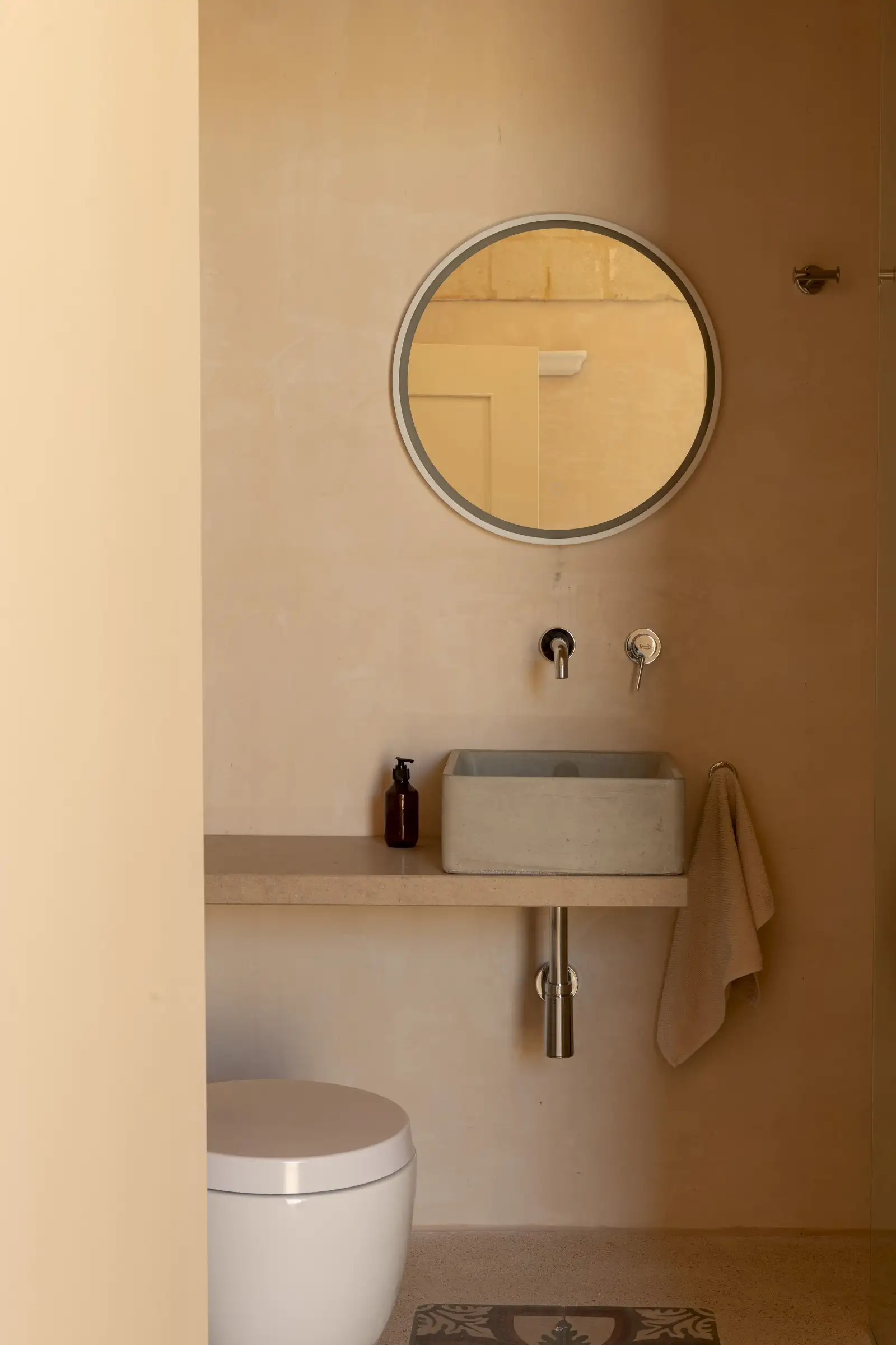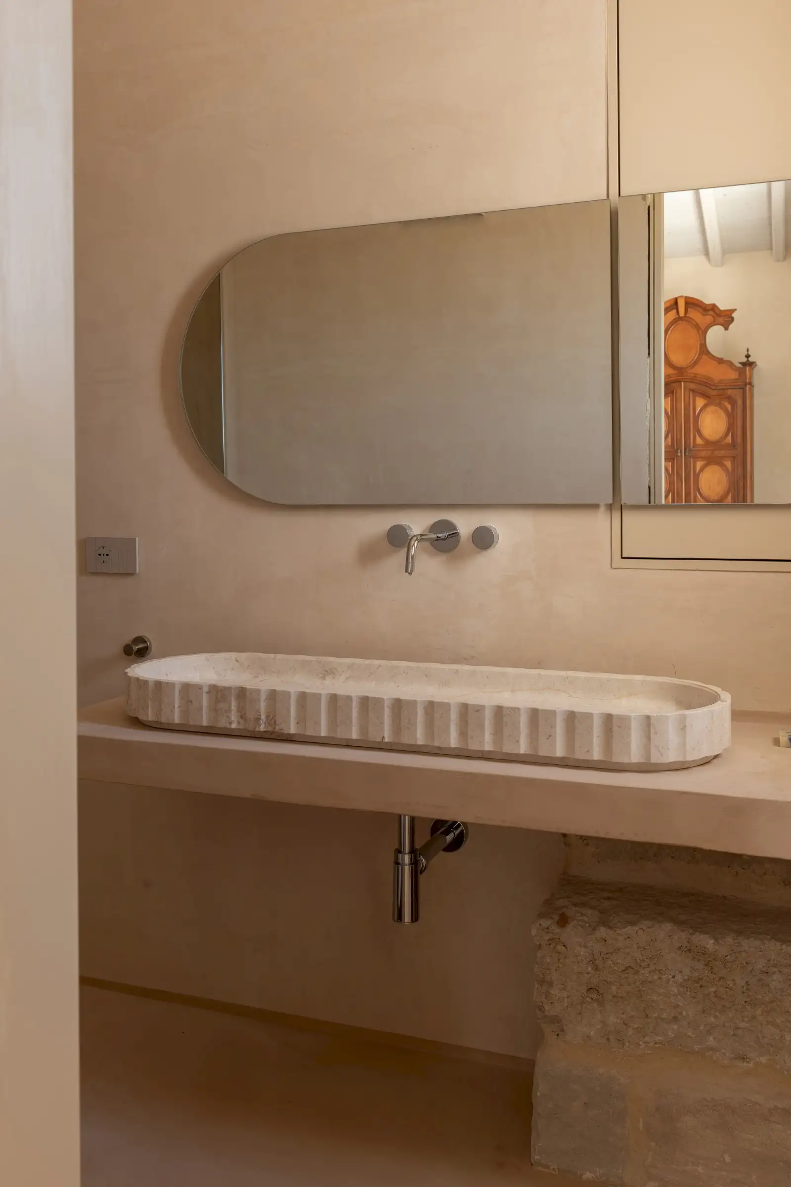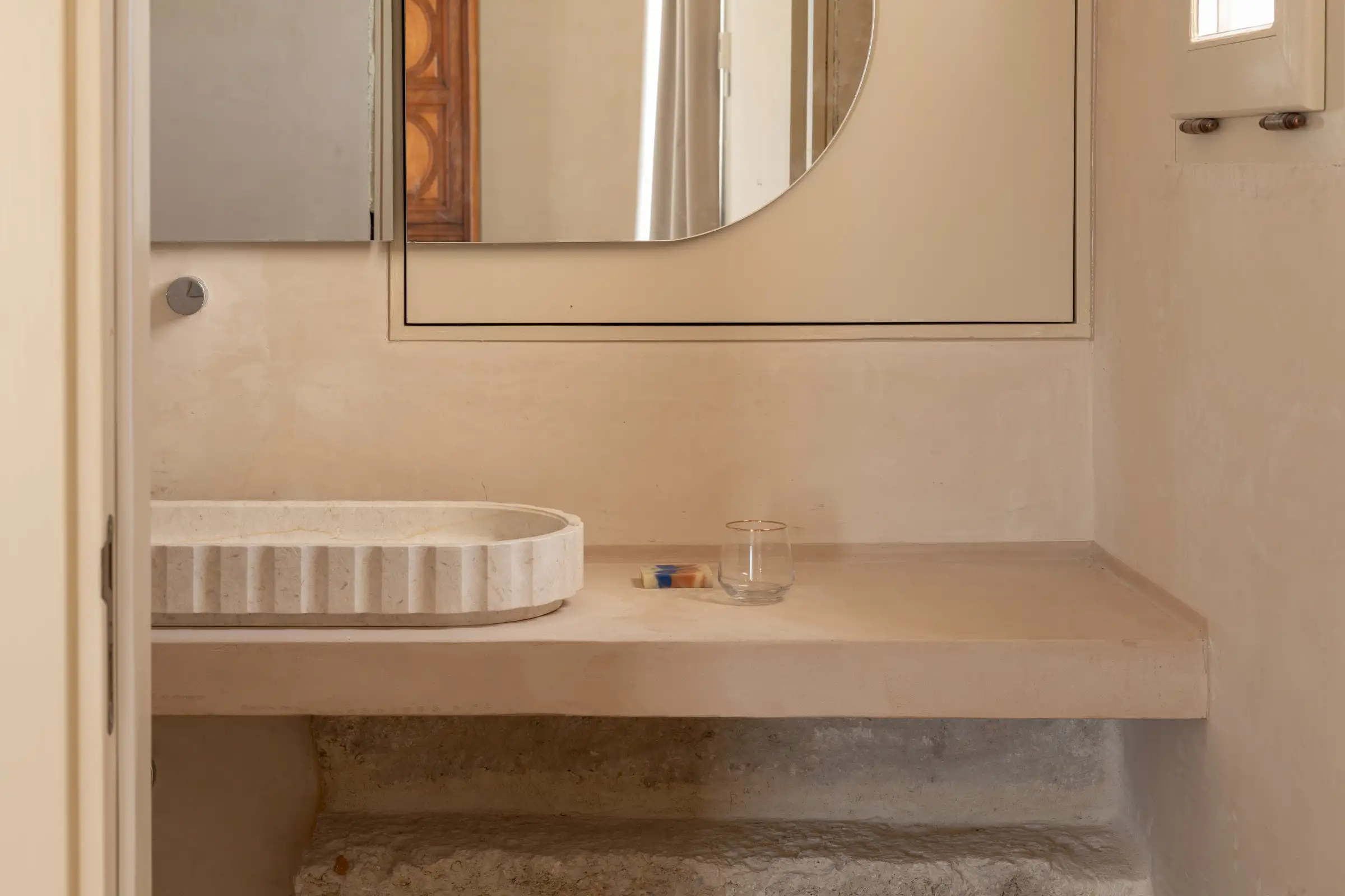 The polished plaster walls of the shower rooms are combined with beautiful shallow, fluted stone basins, vintage mirrors and modern fixtures and fittings, perfectly melding form with function.