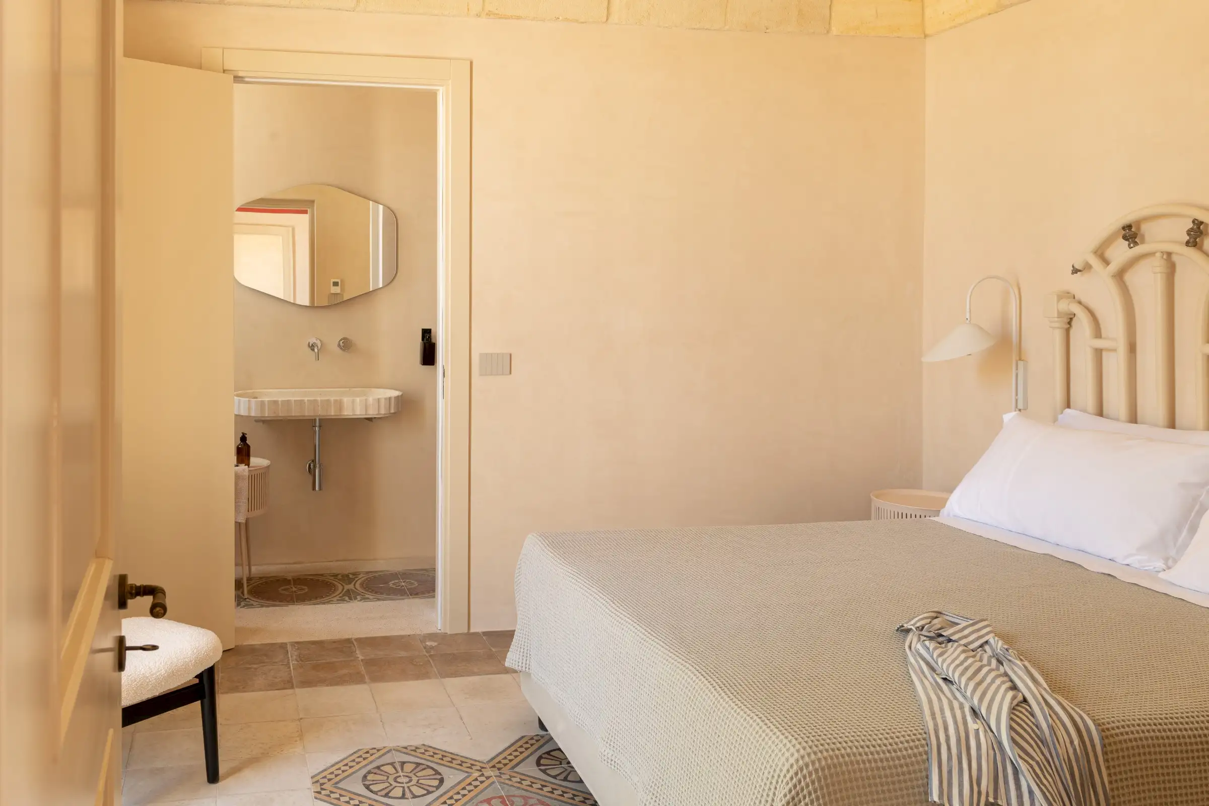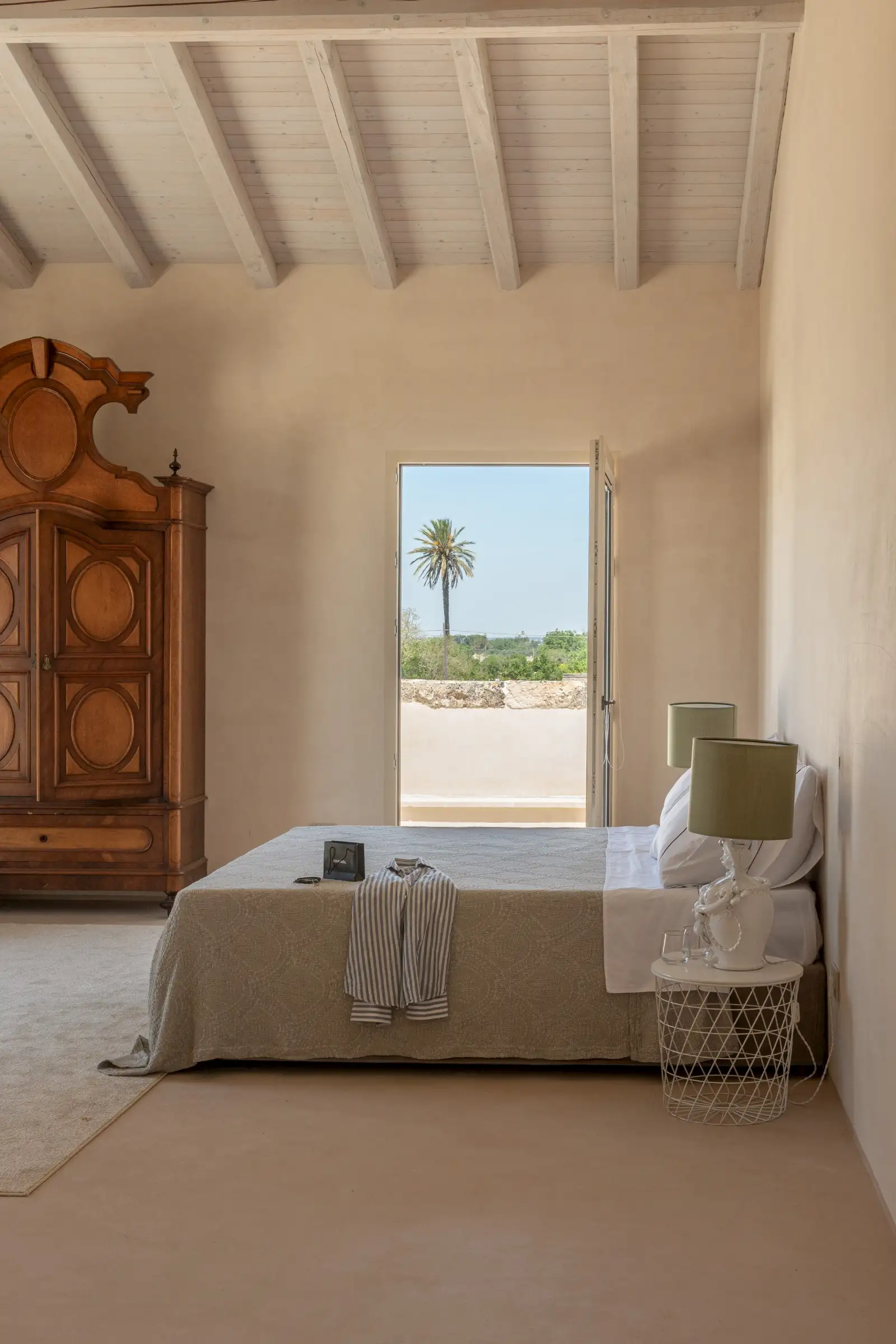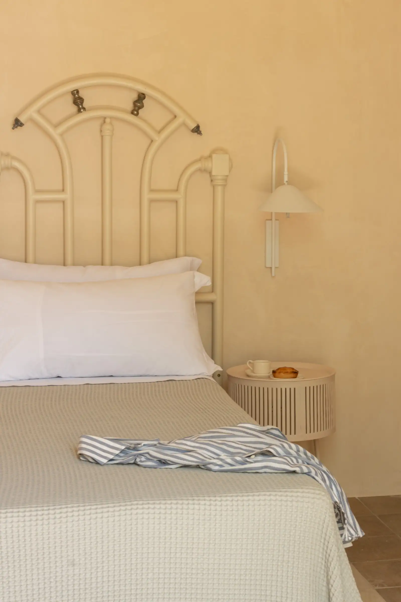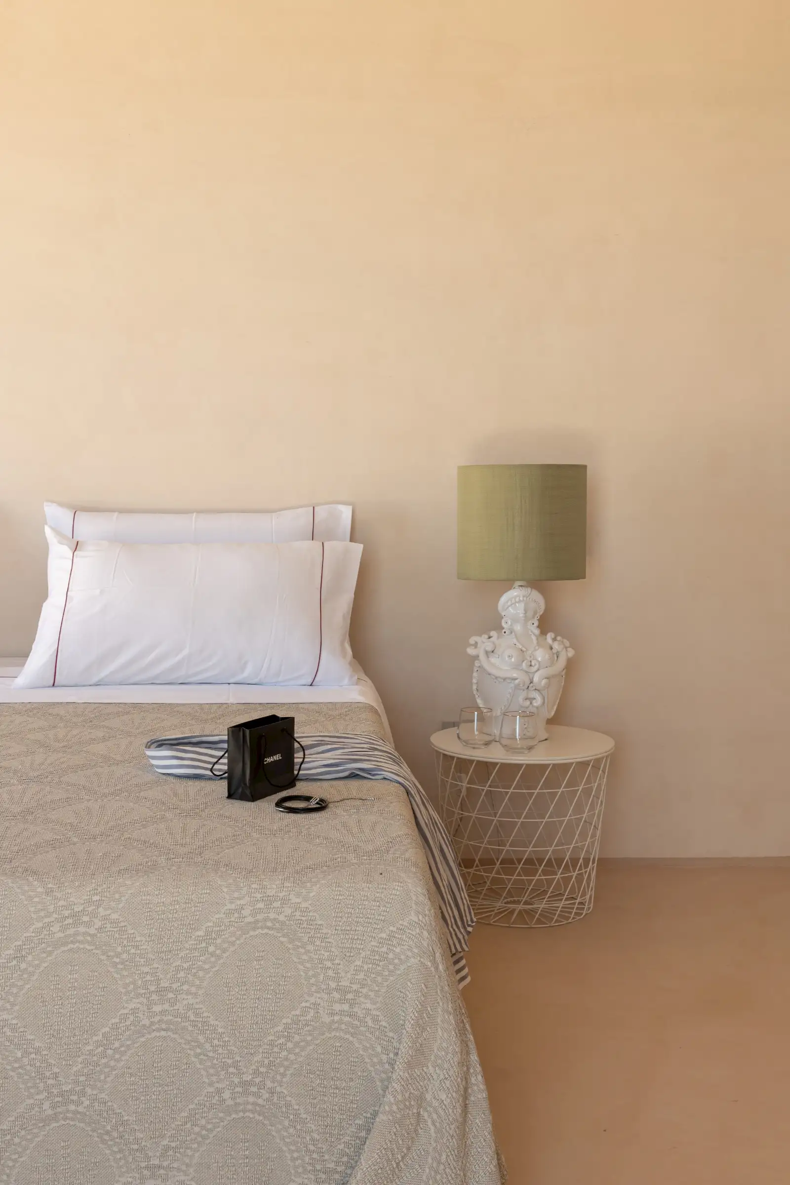 There are four en-suite bedrooms: three on the ground floor and the principal room with its whitewashed ceiling beams and wraparound terrace on the first floor. The sandy-coloured walls, terrazzo floors and stone-vaulted ceilings bounce the soft light around, creating little need for further decoration. Guests will find a mix of antique and modern furniture, comfy beds with crisp white linens and the perfect light to read by.