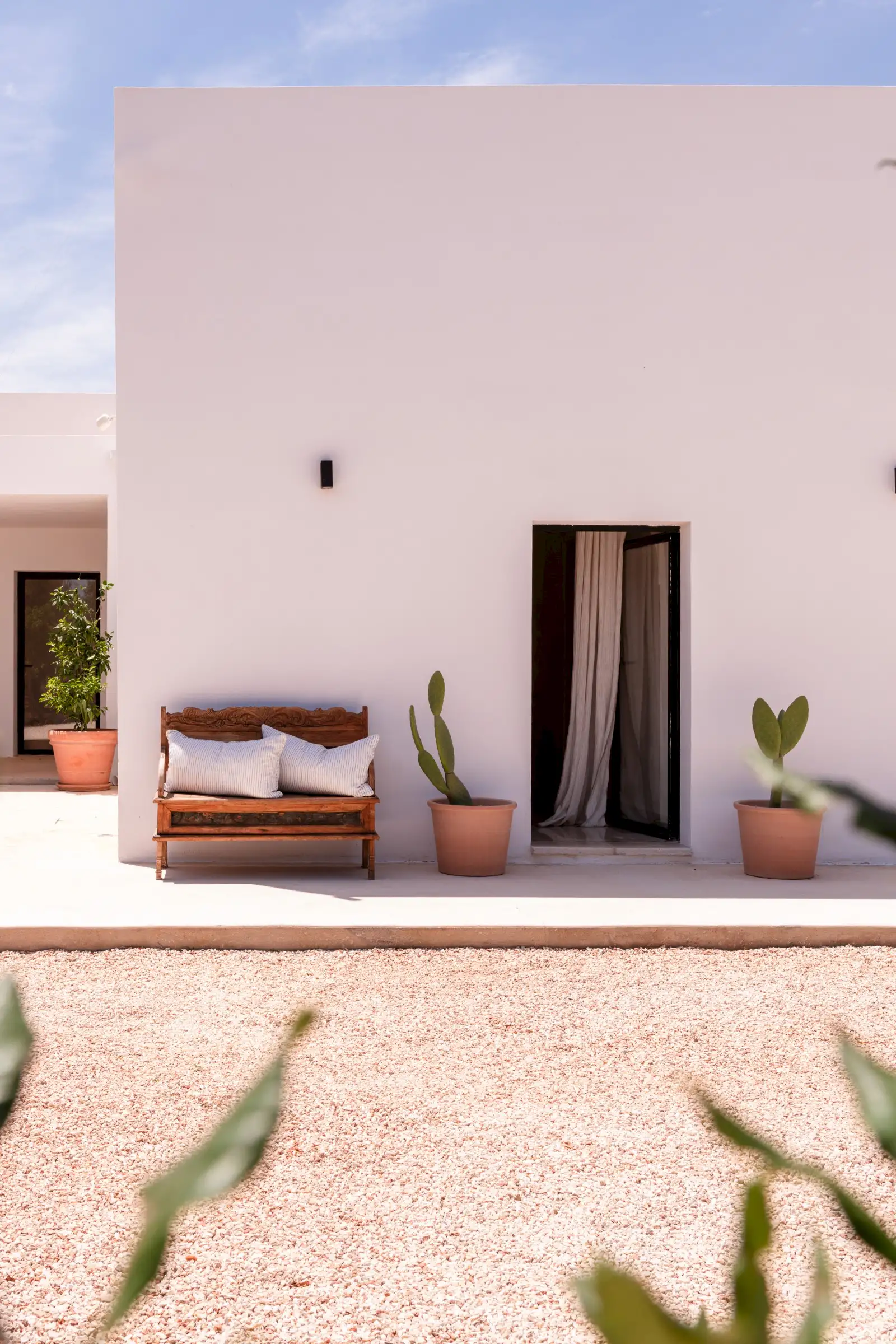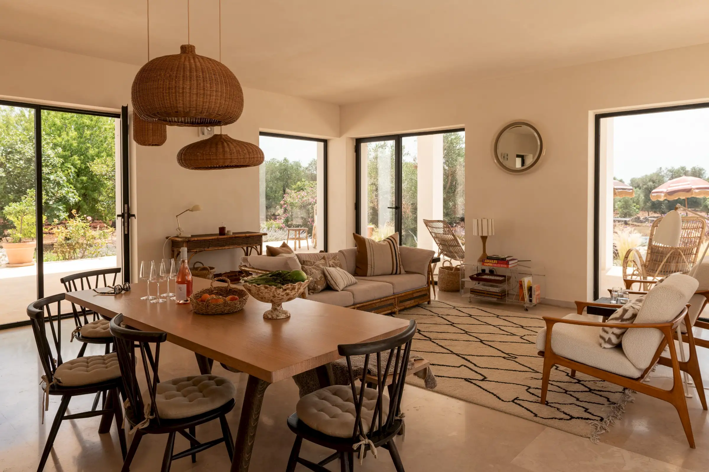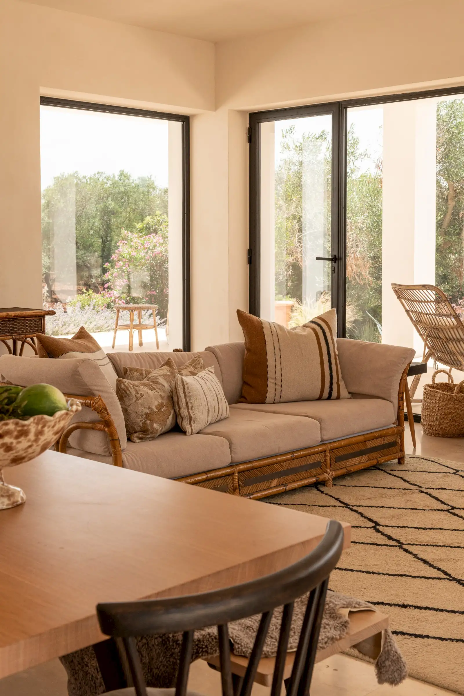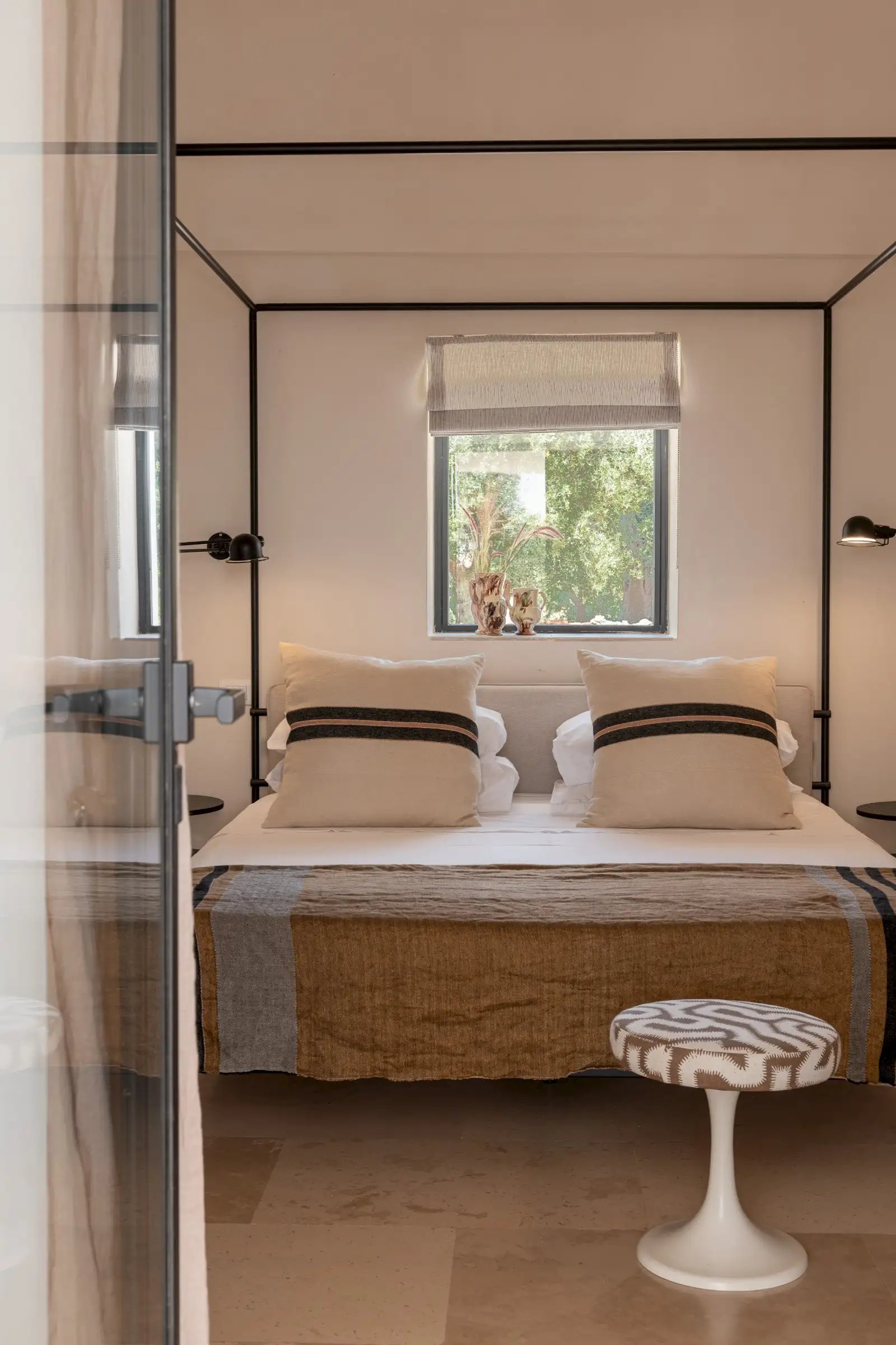 A wrap-around veranda, an abundance of neat, black-framed picture windows, a four-poster bed, a sparkling azure pool and a large roof terrace have squares and rectangles as a unifying design motif. The chalky coloured walls are a warm white, offset by the brass taps in the bathrooms and the use of rattan and linen, local pottery and tiles, and floor rugs. It all combines in a light and bright, comfortable and luxurious aesthetic..