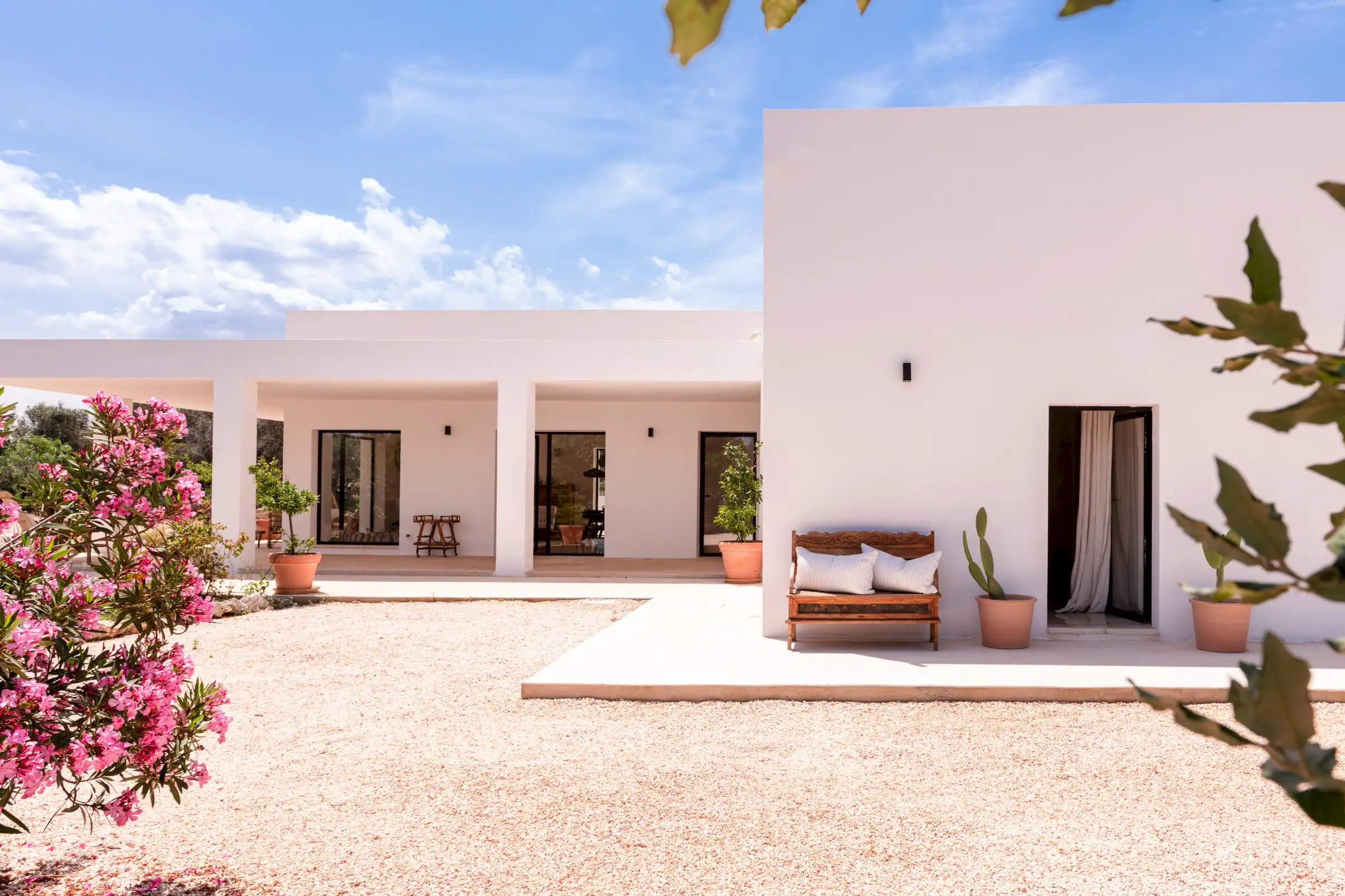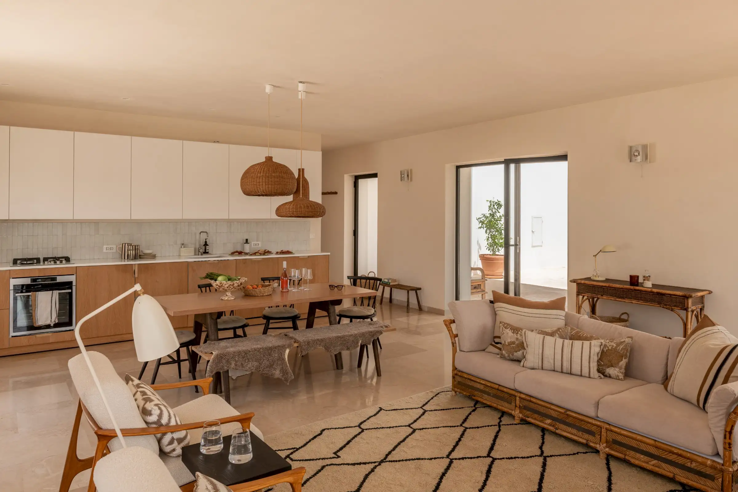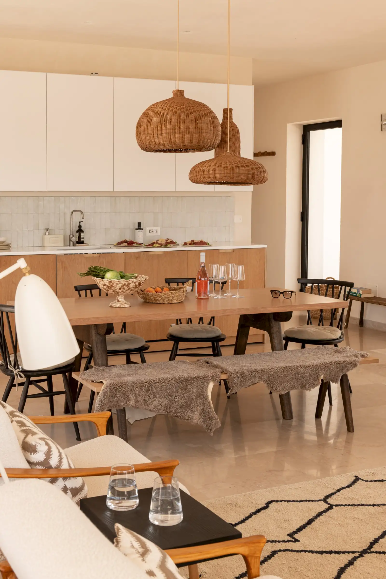 A wrap-around veranda, an abundance of neat, black-framed picture windows, a four-poster bed, a sparkling azure pool and a large roof terrace have squares and rectangles as a unifying design motif. The chalky coloured walls are a warm white, offset by the brass taps in the bathrooms and the use of rattan and linen, local pottery and tiles, and floor rugs. It all combines in a light and bright, comfortable and luxurious aesthetic..