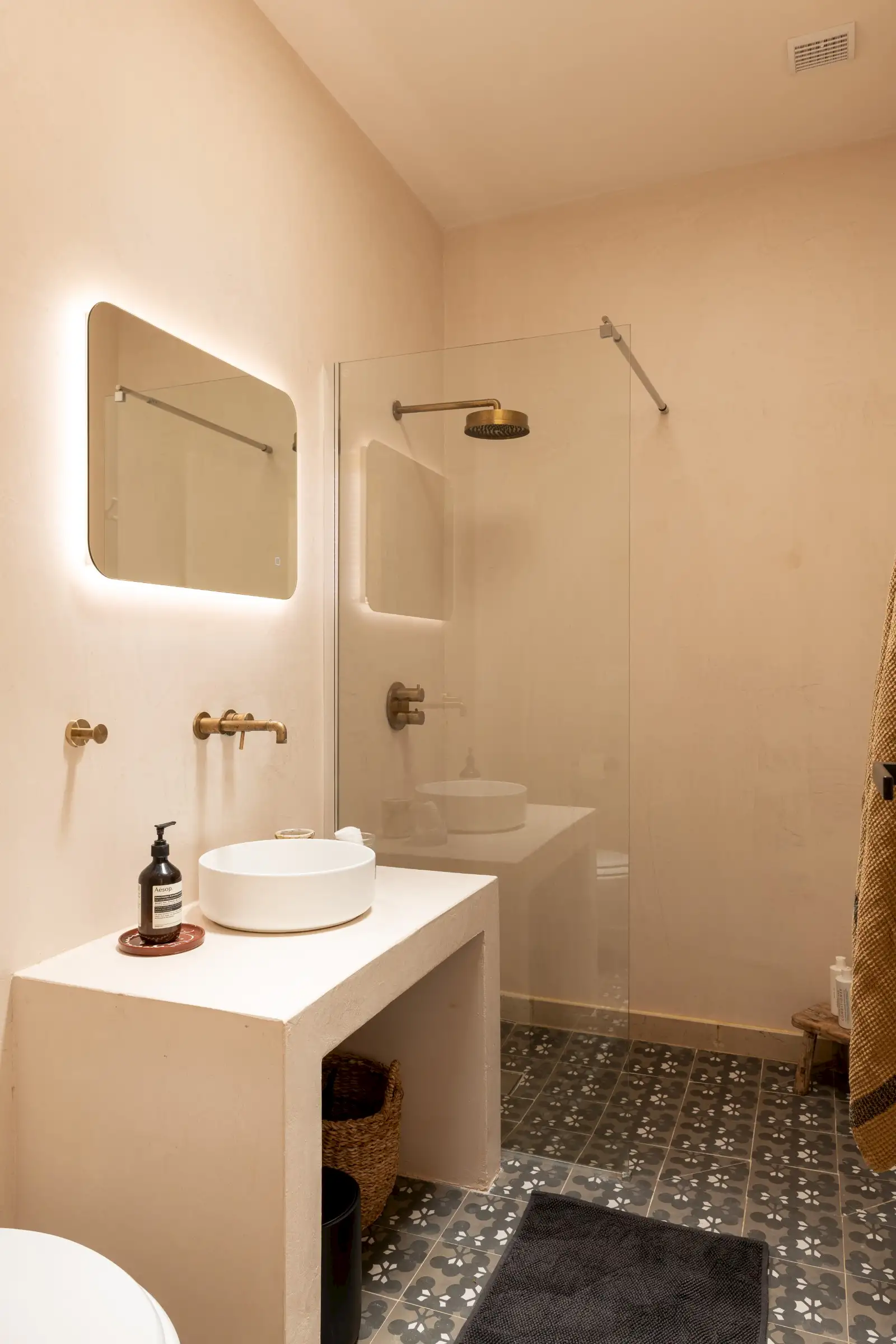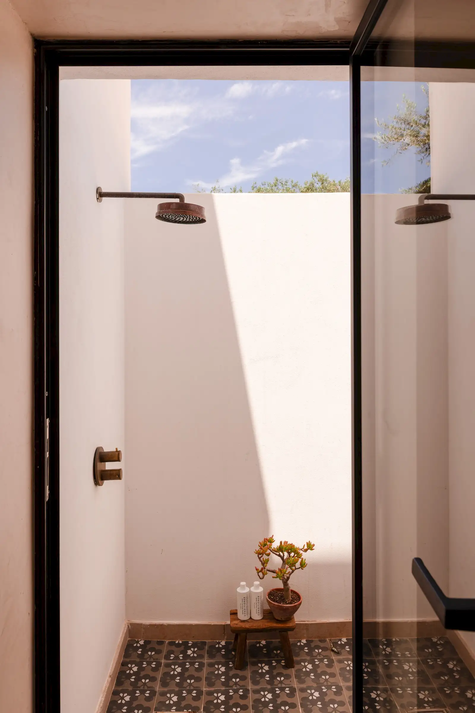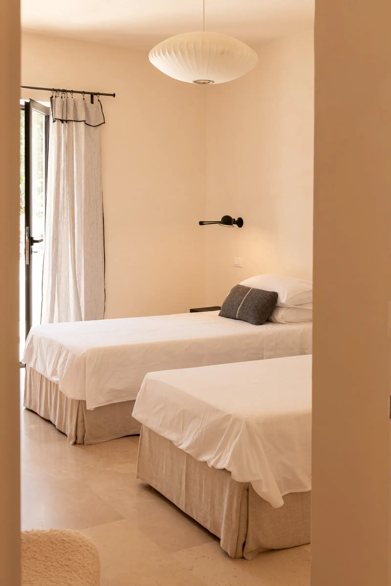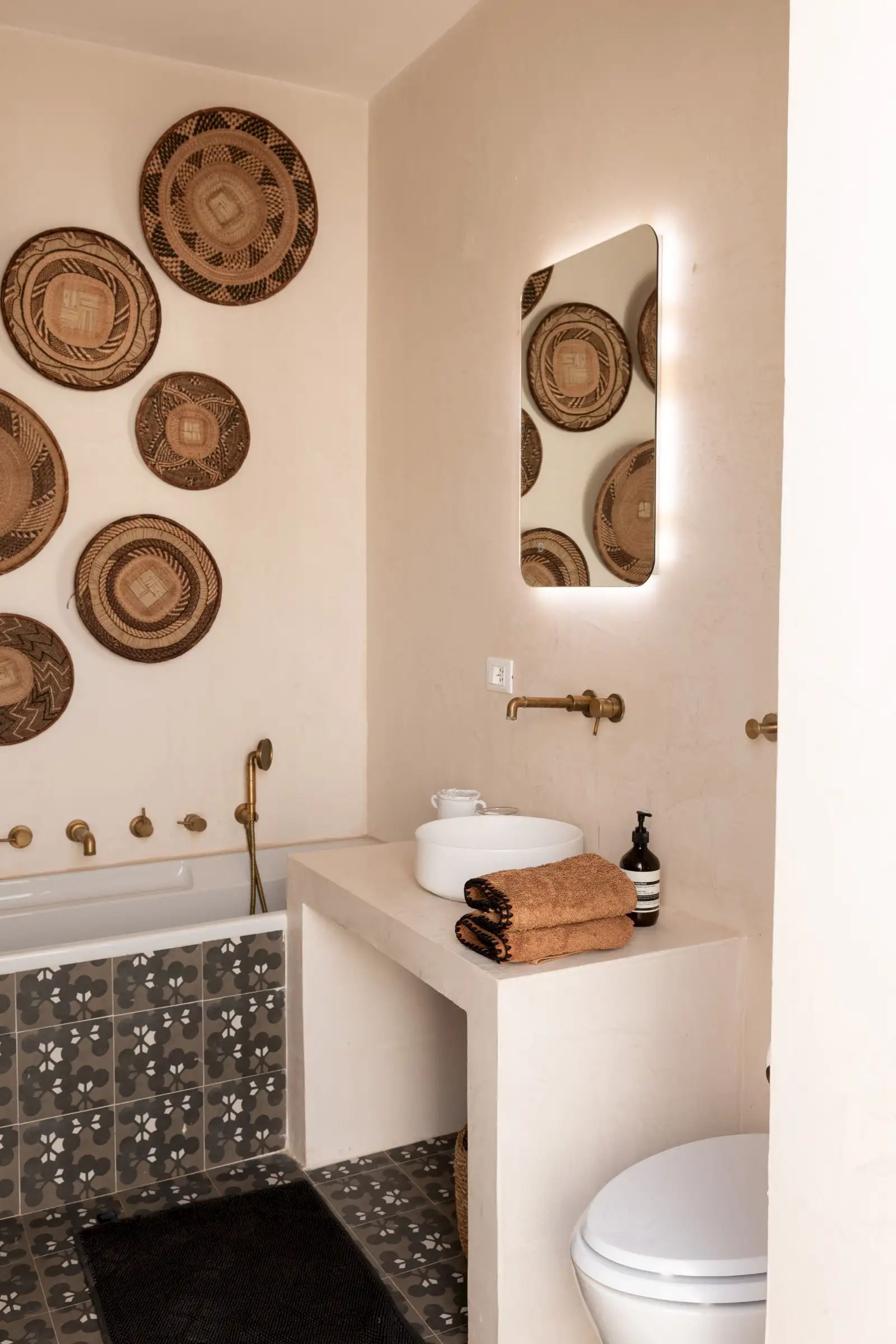 A wrap-around veranda, an abundance of neat, black-framed picture windows, a four-poster bed, a sparkling azure pool and a large roof terrace have squares and rectangles as a unifying design motif. The chalky coloured walls are a warm white, offset by the brass taps in the bathrooms and the use of rattan and linen, local pottery and tiles, and floor rugs. It all combines in a light and bright, comfortable and luxurious aesthetic..