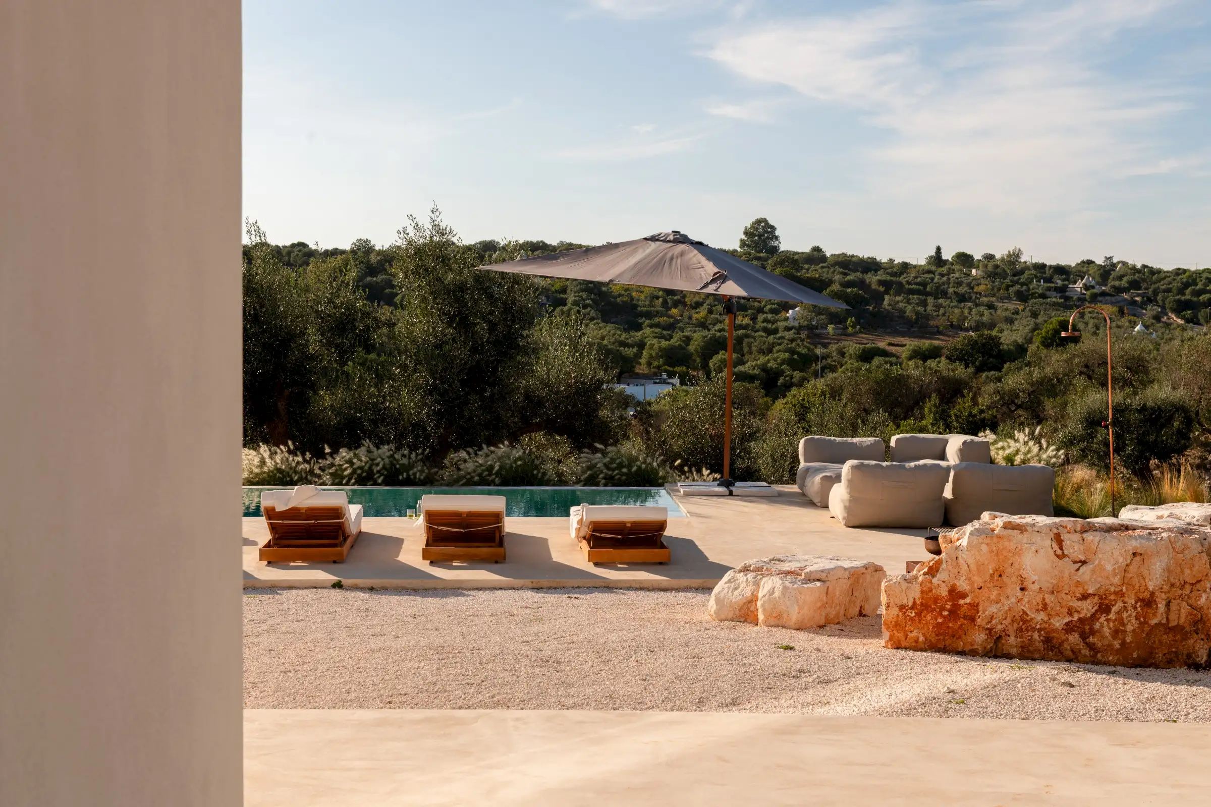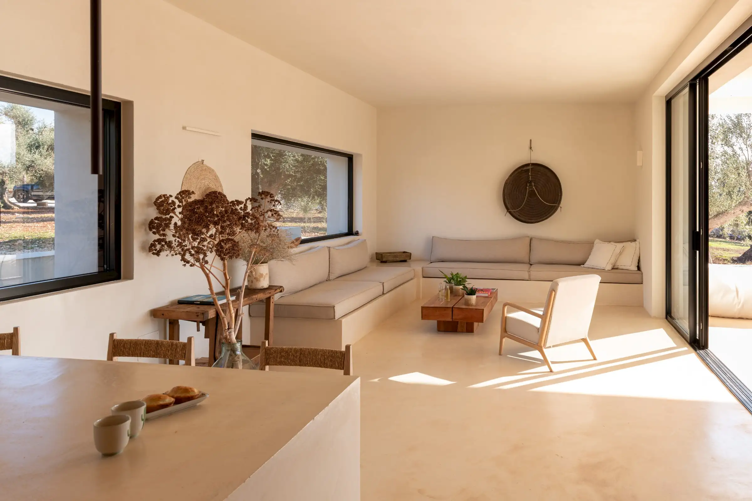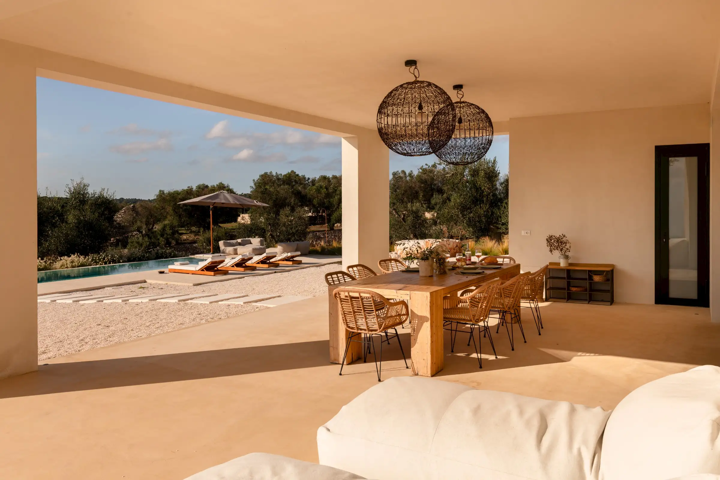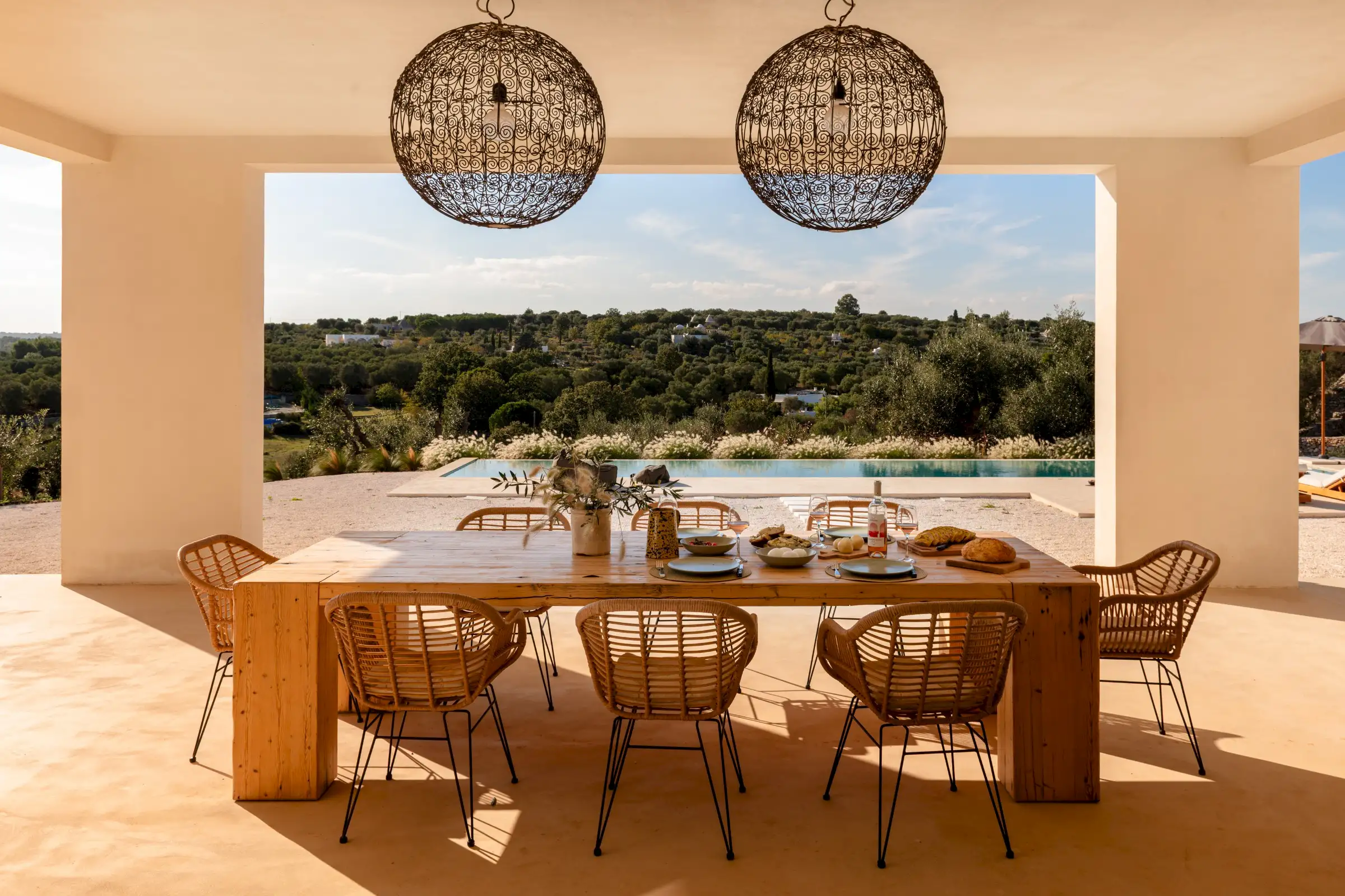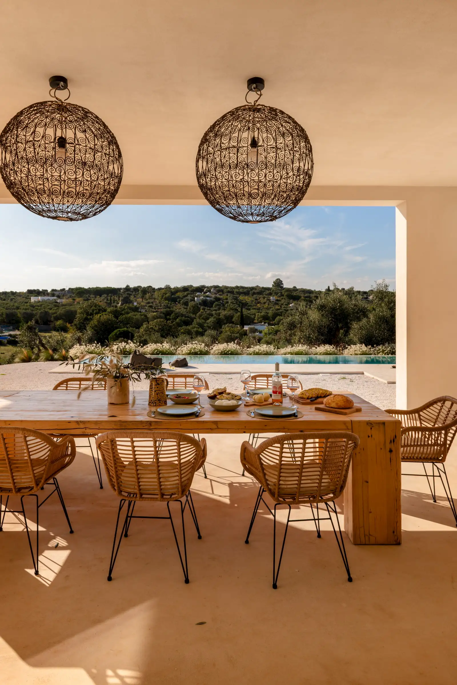A big, solid wooden table on the veranda is the ideal dining spot with views across the pool from one side or through the house to the olive groves beyond from the other.