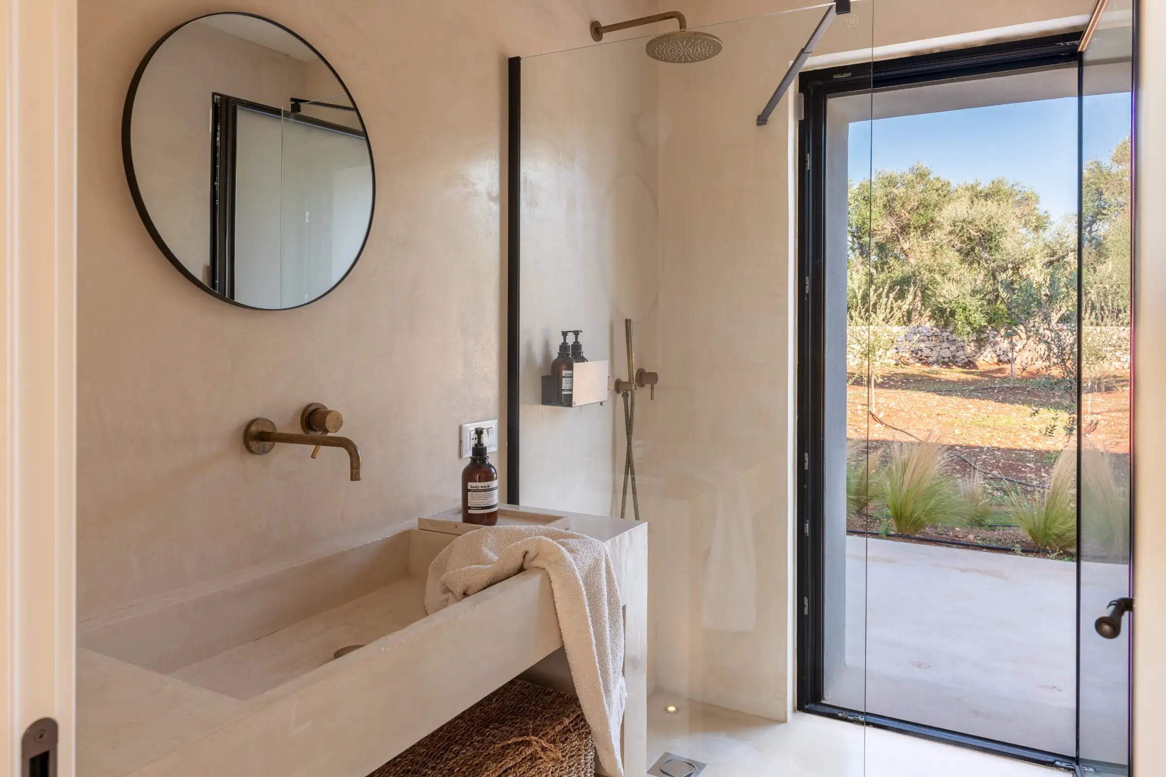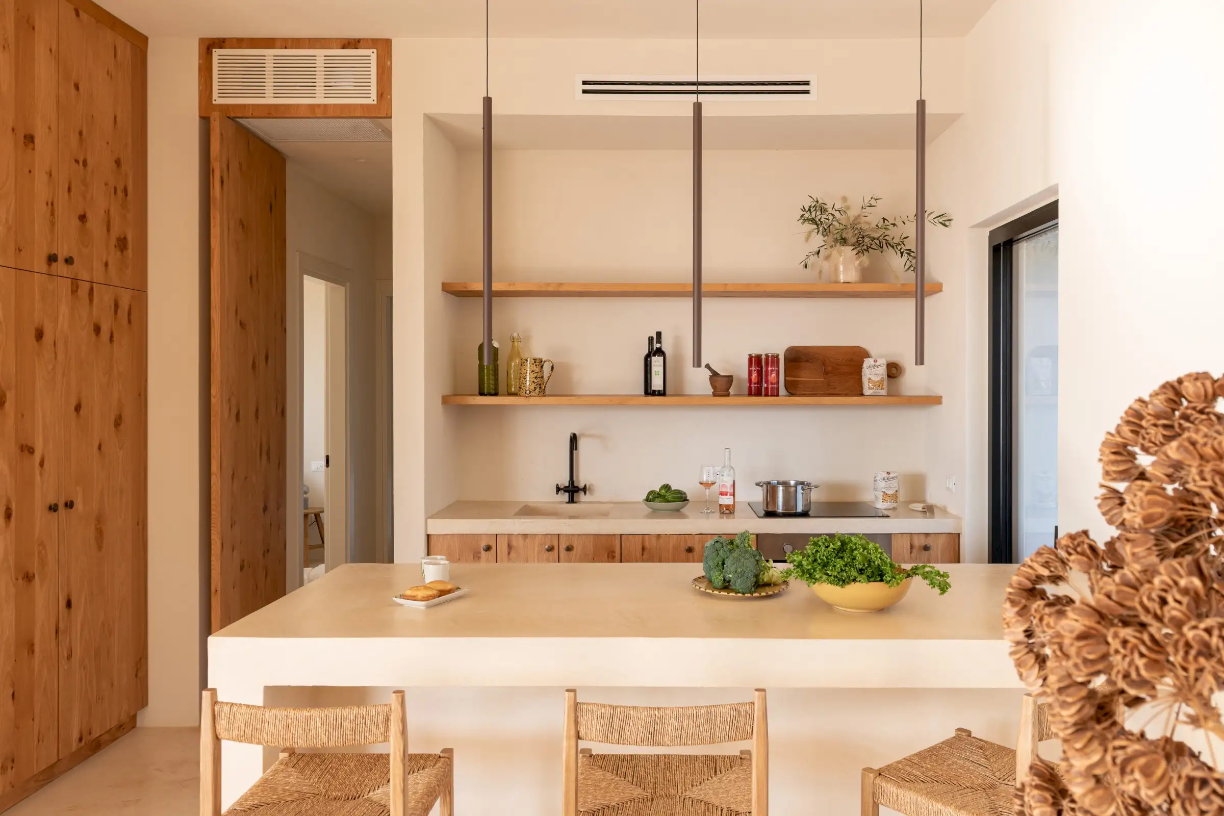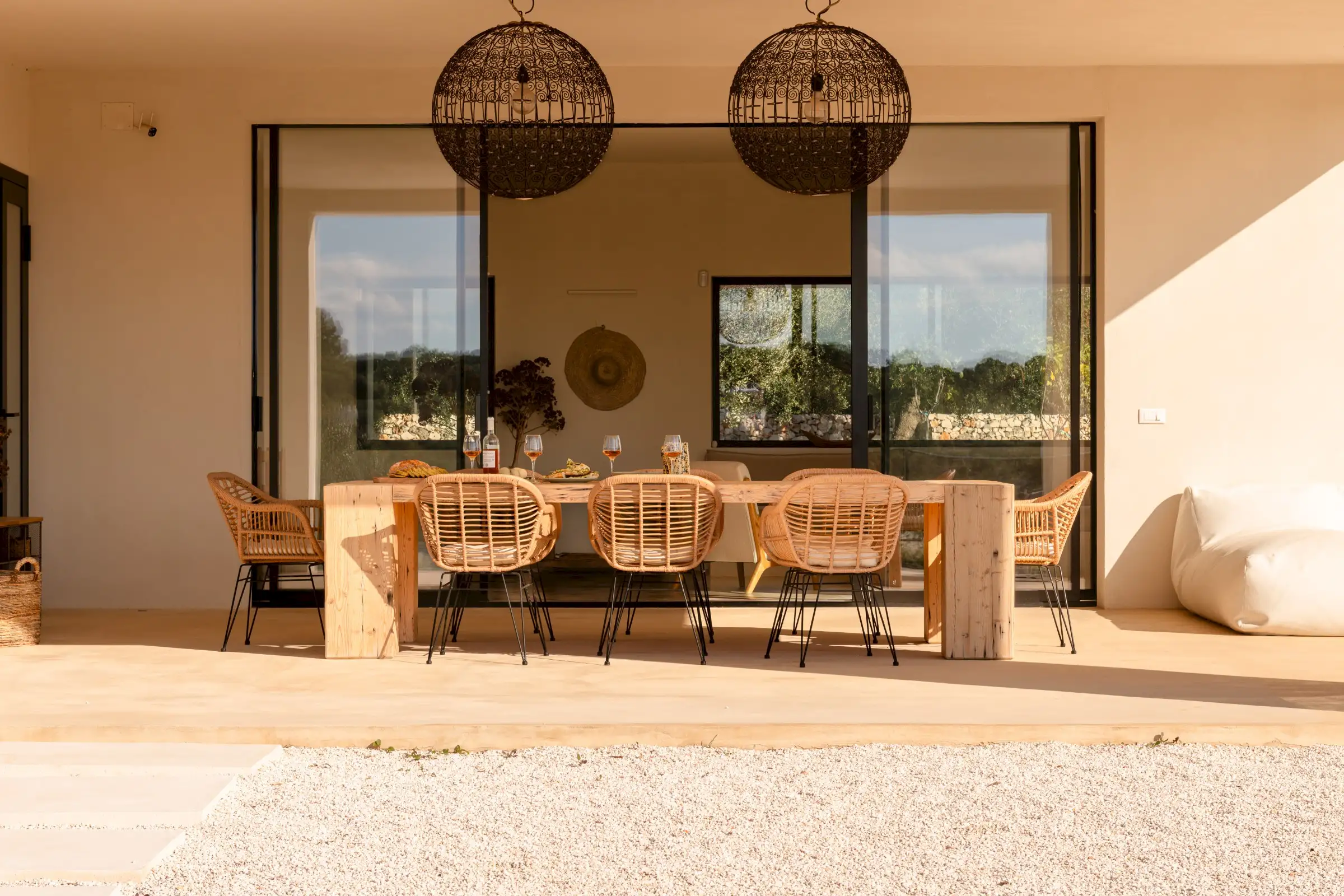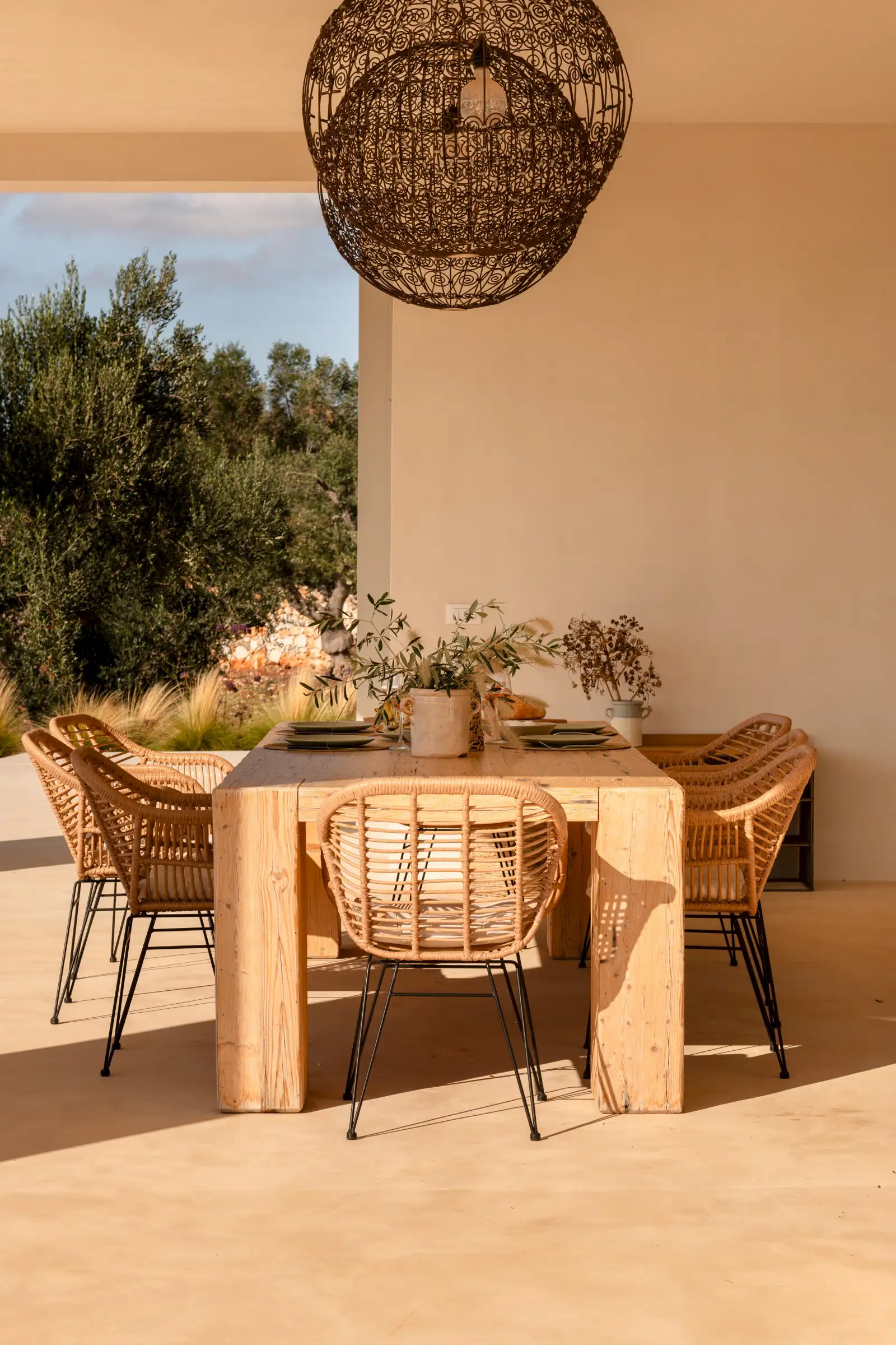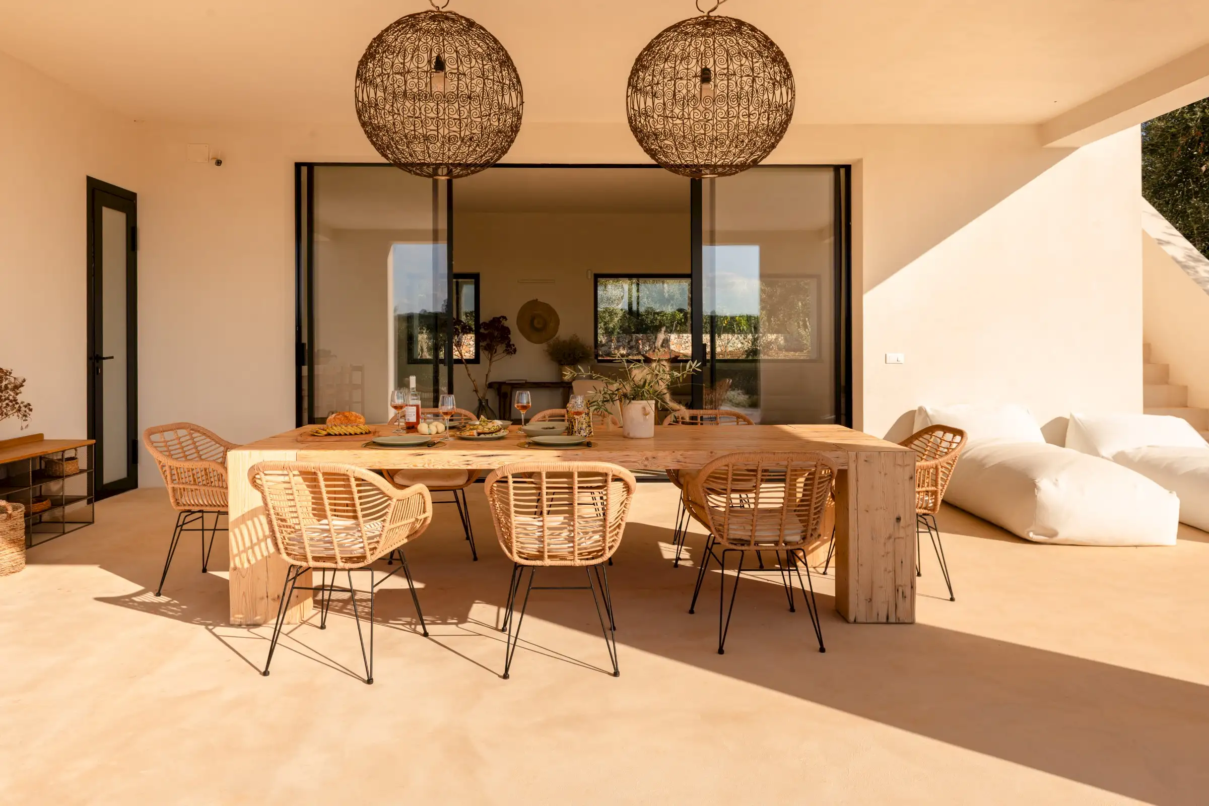 A big, solid wooden table on the veranda is the ideal dining spot with views across the pool from one side or through the house to the olive groves beyond from the other.