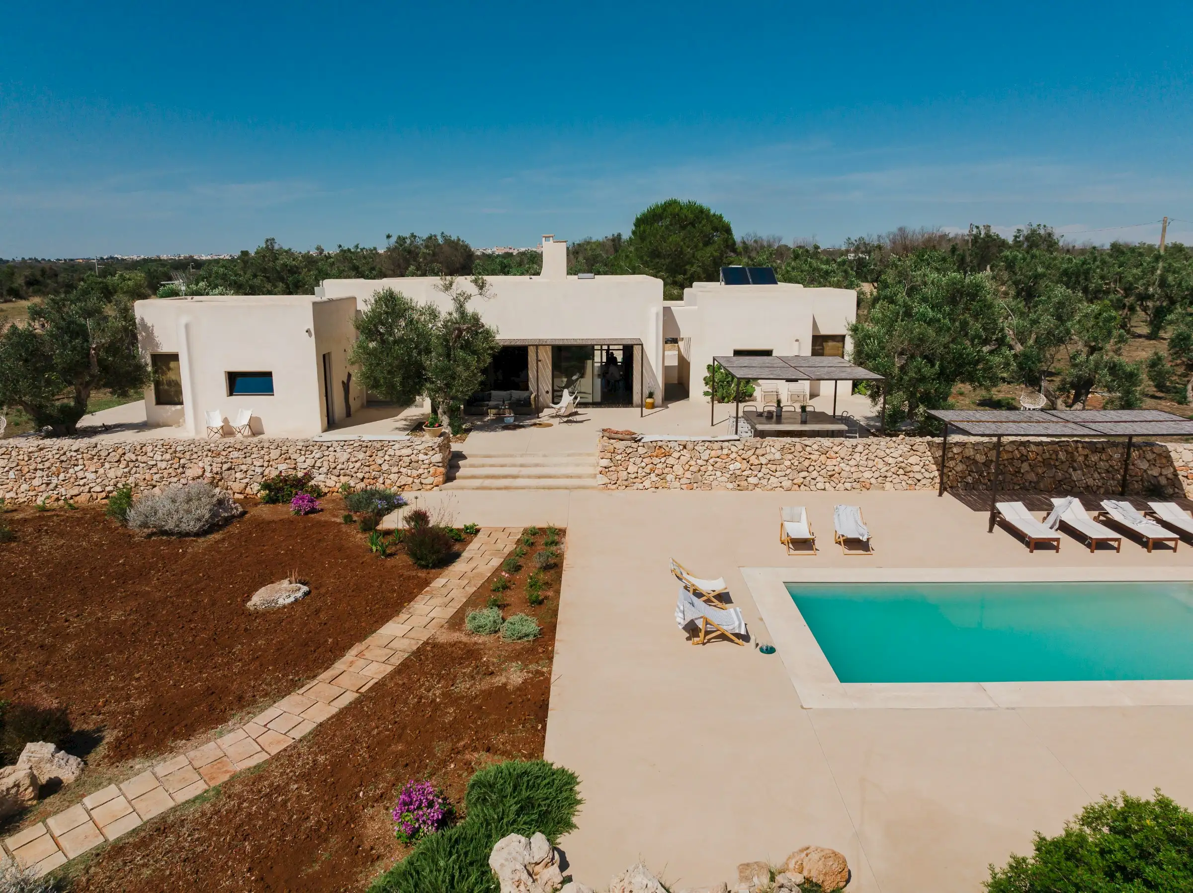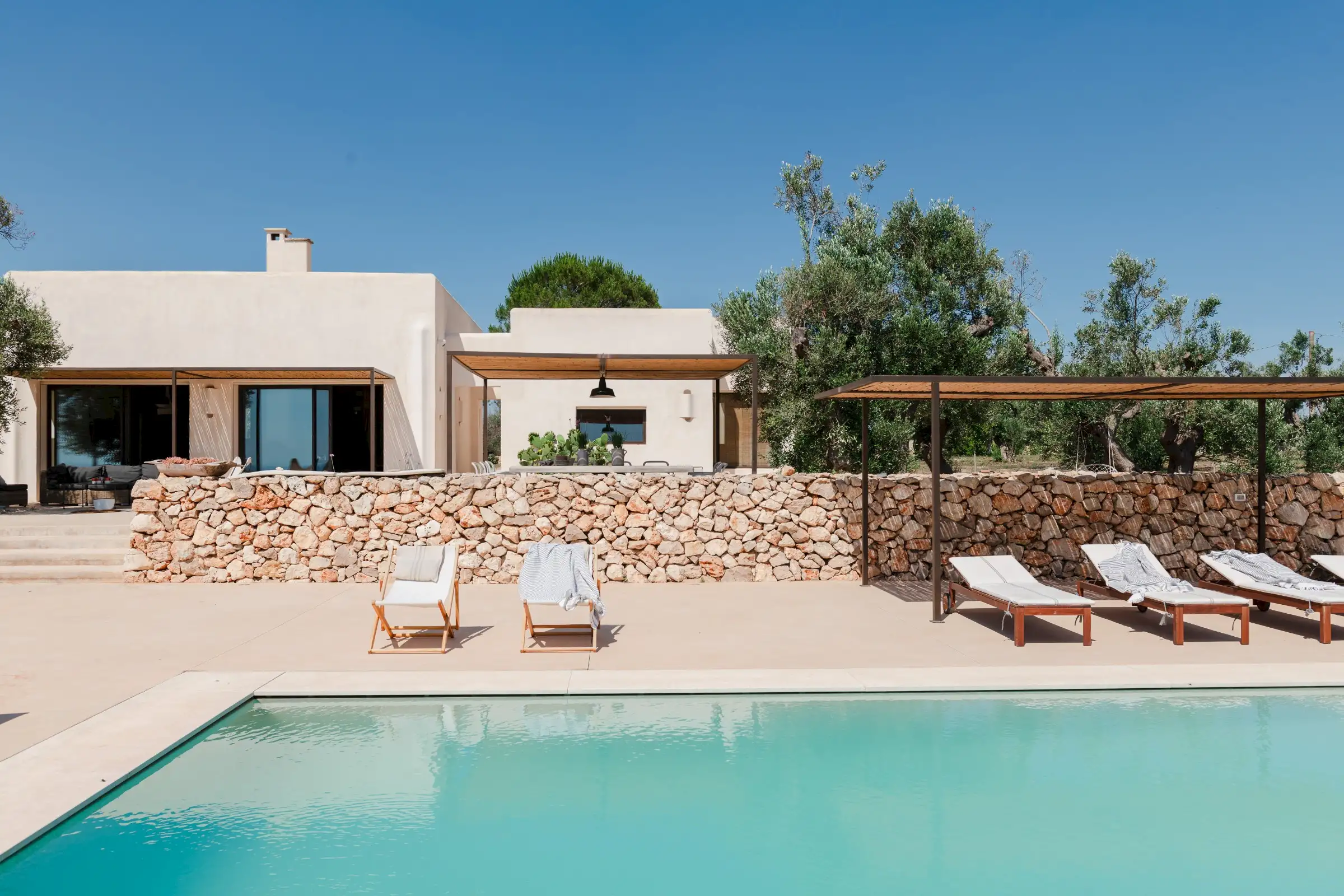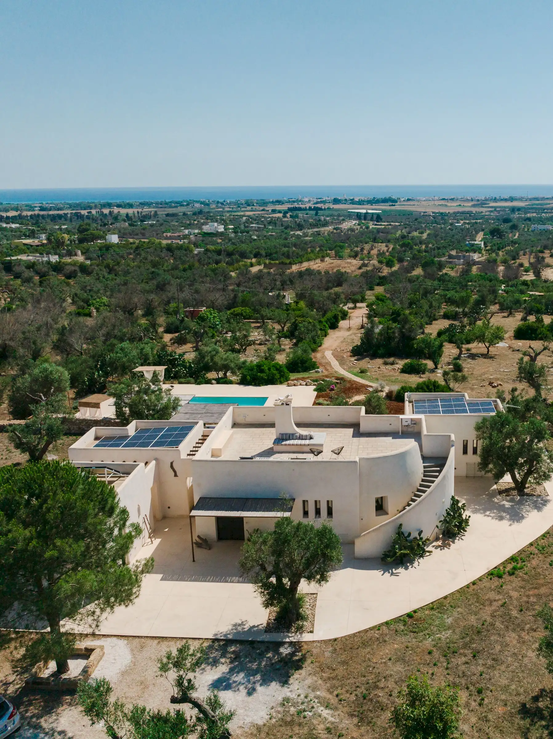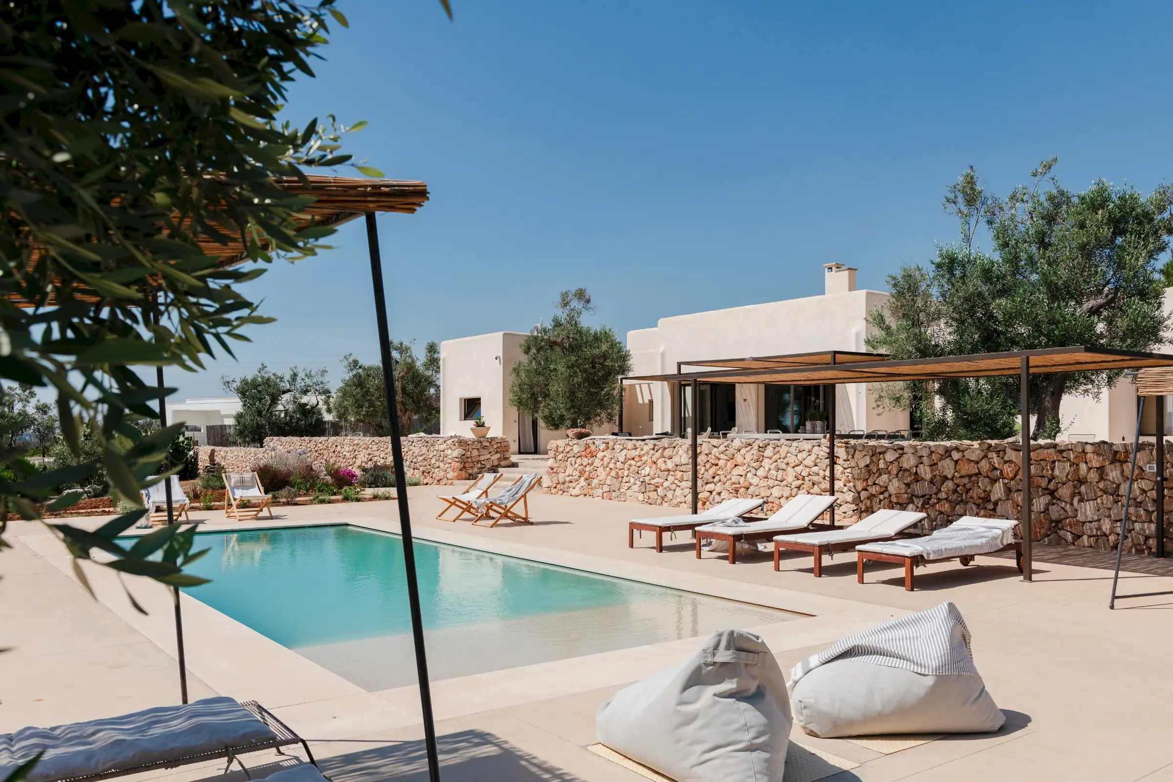 Just a short drive from the rocky coves and white sandy beaches of this exquisitely beautiful and relatively untouched part of Puglia is Loliva, a smooth white villa with sculptural architectural lines and an azure-blue pool.