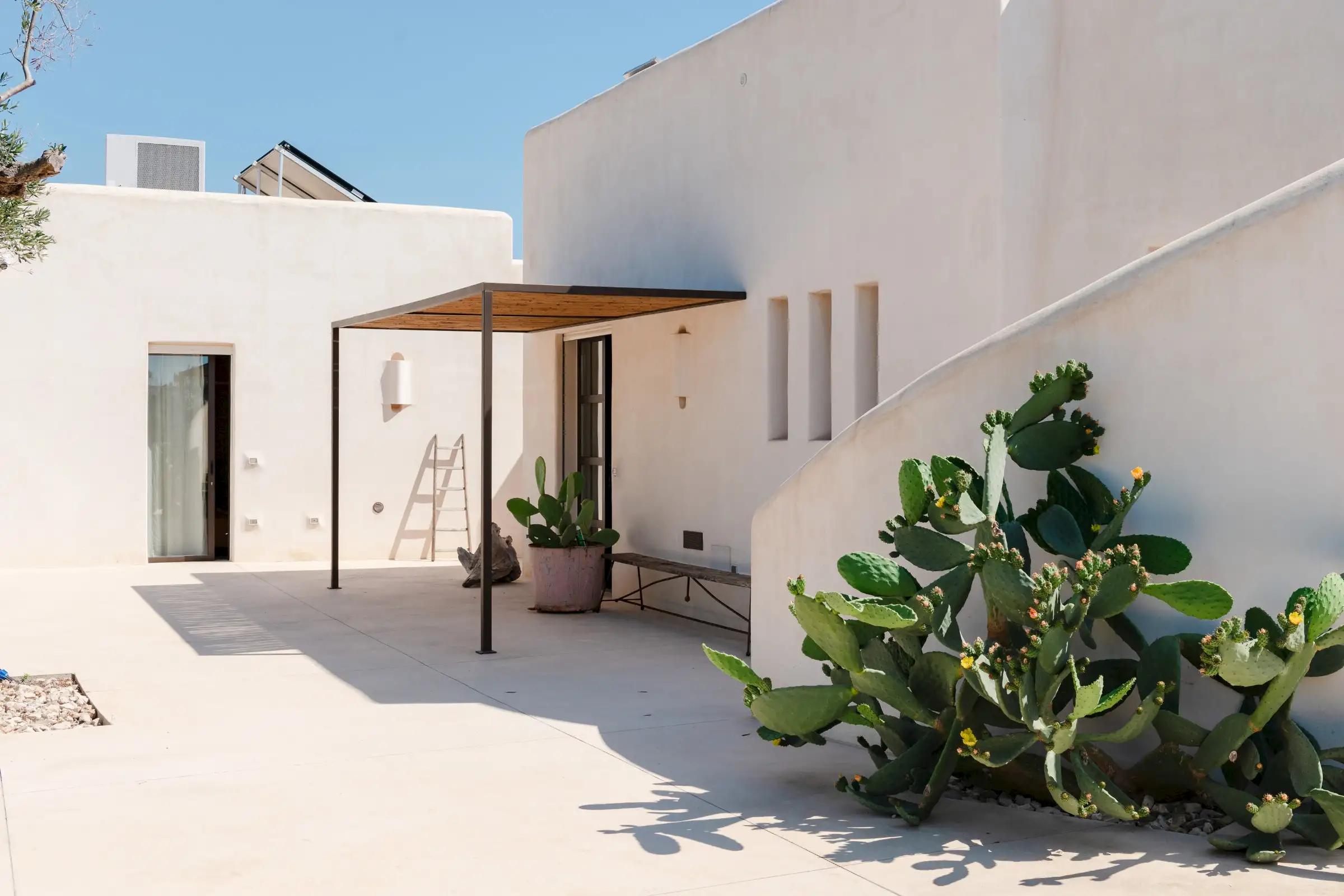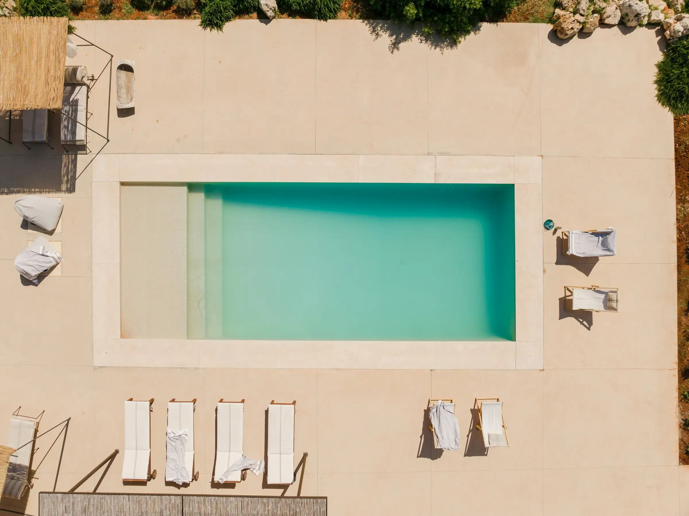 The smooth walls and floors look like they have been poured into place and are the perfect backdrop to a barefoot holiday existence of rest and relaxation, punctuated by delicious meals using fresh local ingredients, cooling swims in the saltwater pool and aperitivi watching the sun set over the sea from the rooftop terrace.
