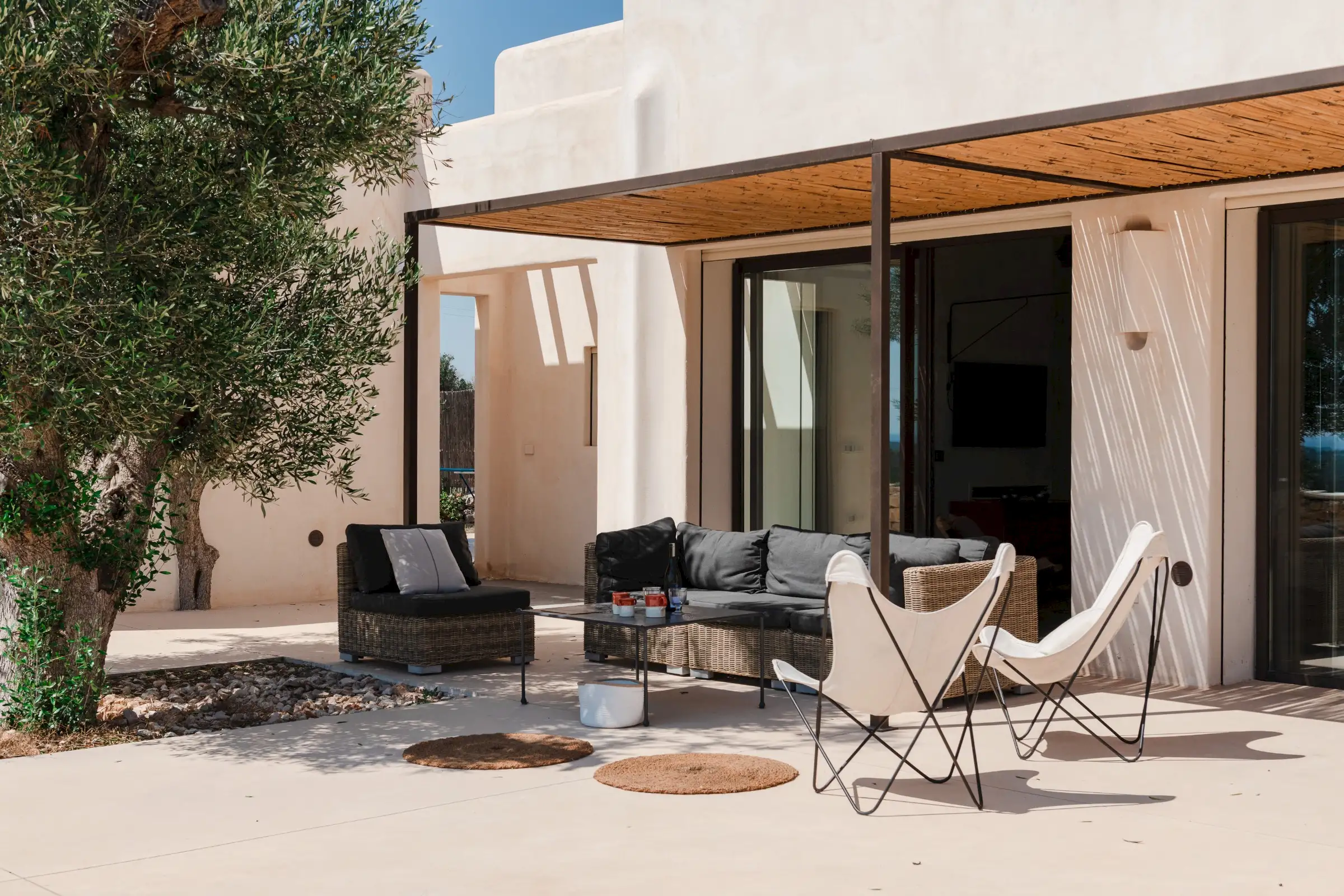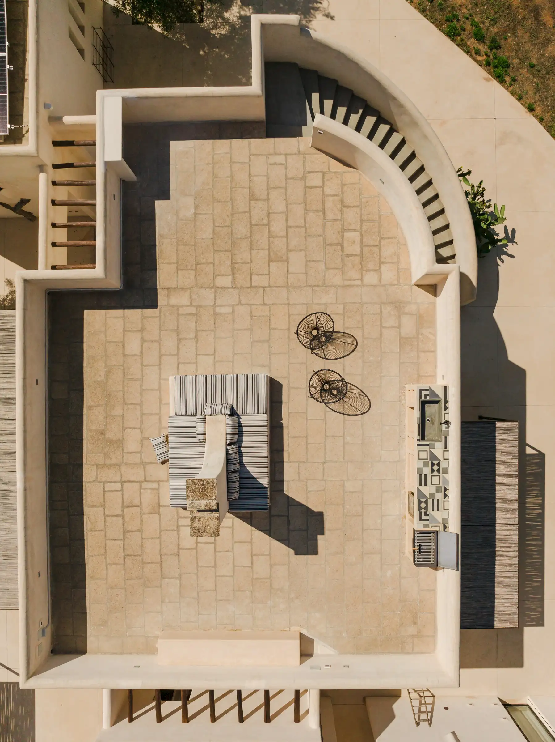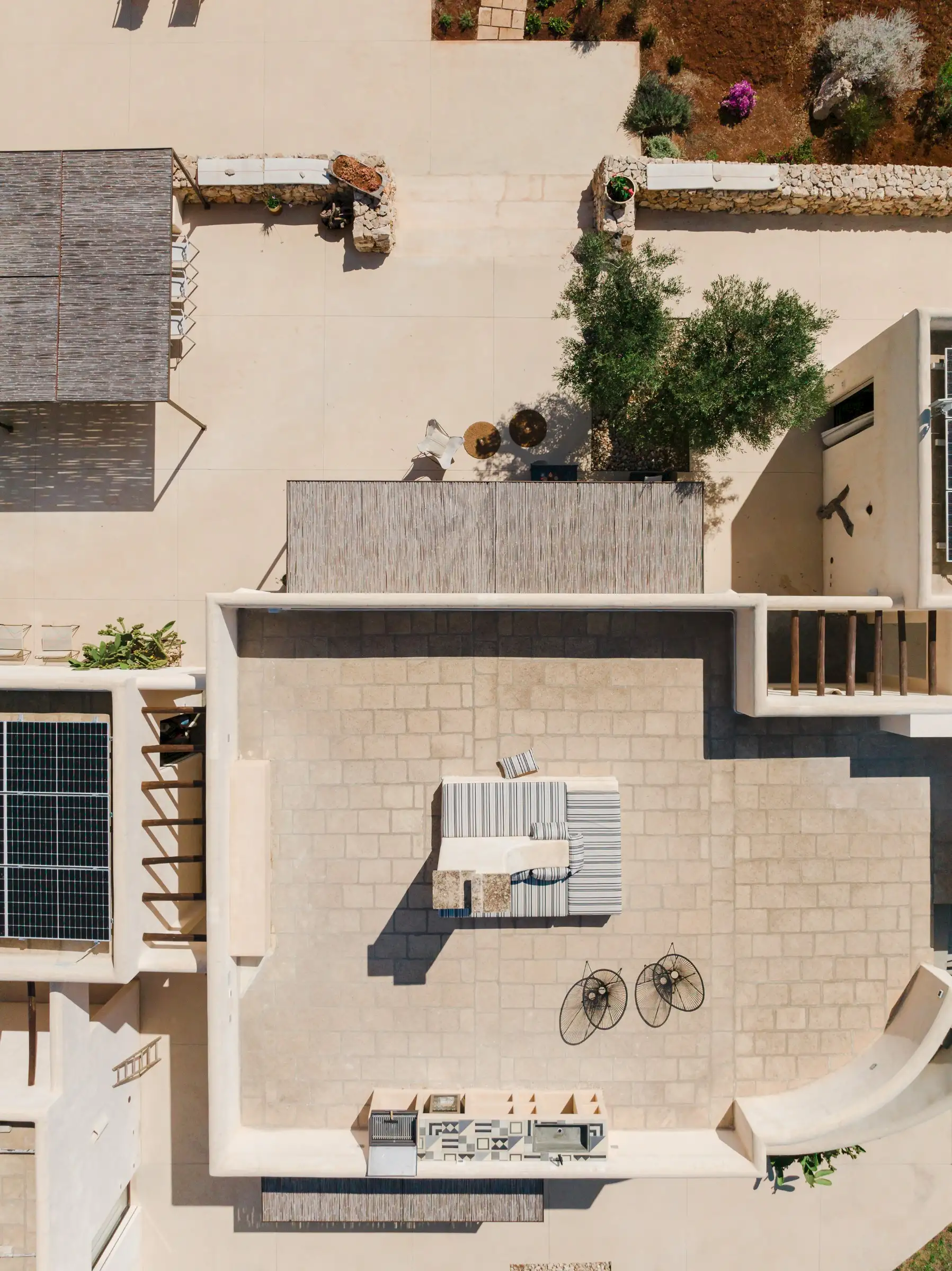 Guests arriving at Loliva need only drive a short distance from the coast to find the villa amongst the olive groves. Traditional stone walls surround the 10,000sqm of private grounds where there are two entrances, both accessed via electric gates. From above it seems that the house slots together like pieces of a puzzle laid out on a smooth terrace base that circles the building. A curved stairway leads up to the roof terrace which offers the perfect spot to watch the sun set. Mediterranean planting, including cactus plants and ancient olive trees, add sculptural form and there are lots of places to sit or lie, including a hammock, sun loungers and chairs. A 12-seater outdoor dining table in the shade of the pergola is close to the house and looks out over the 10m x 4m saltwater swimming pool. Here there is an outdoor shower threaded through the gnarled trunk of an old olive tree. There is a ping pong table in the shade, a BBQ and more than enough space for everyone to find a little peace and quiet.