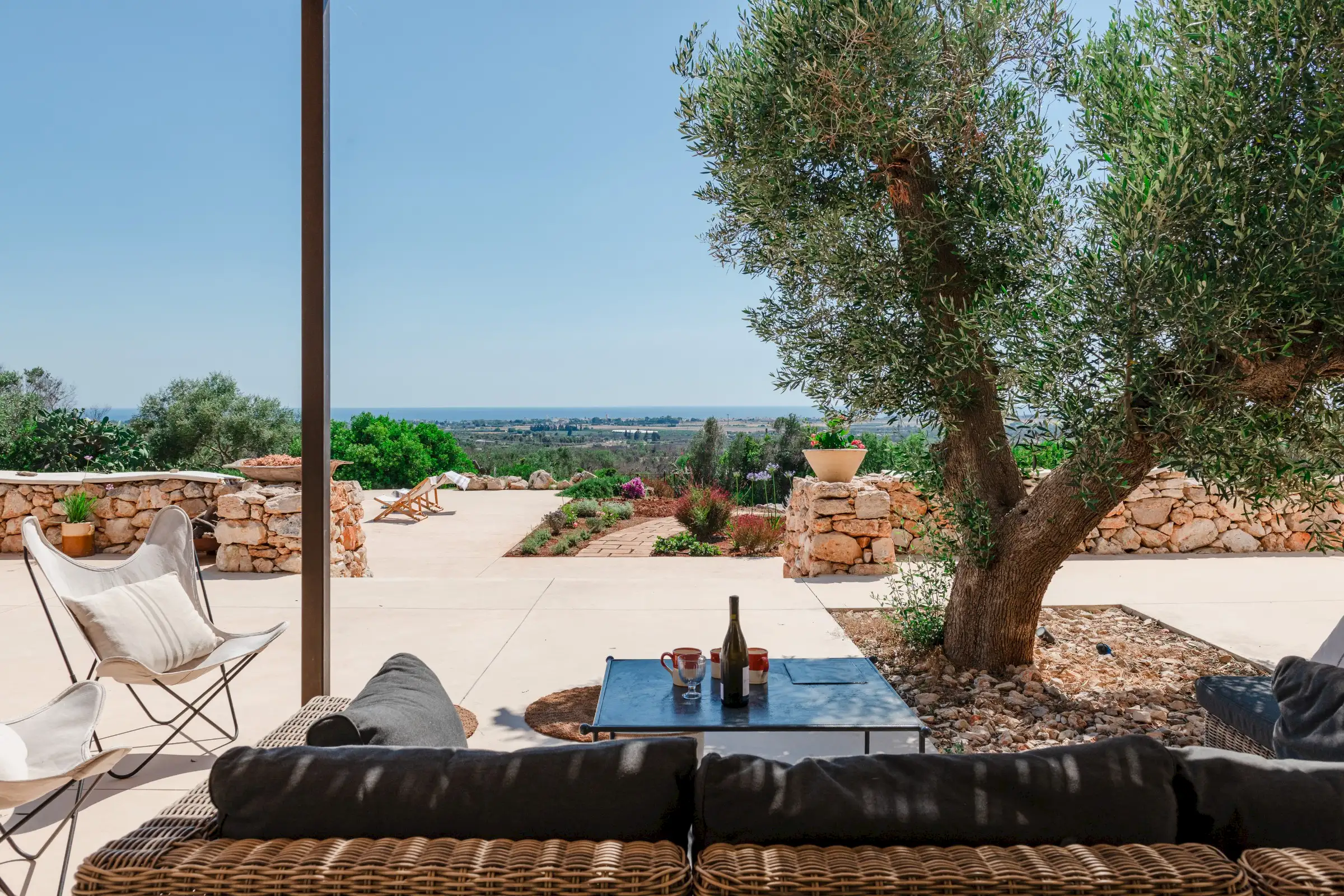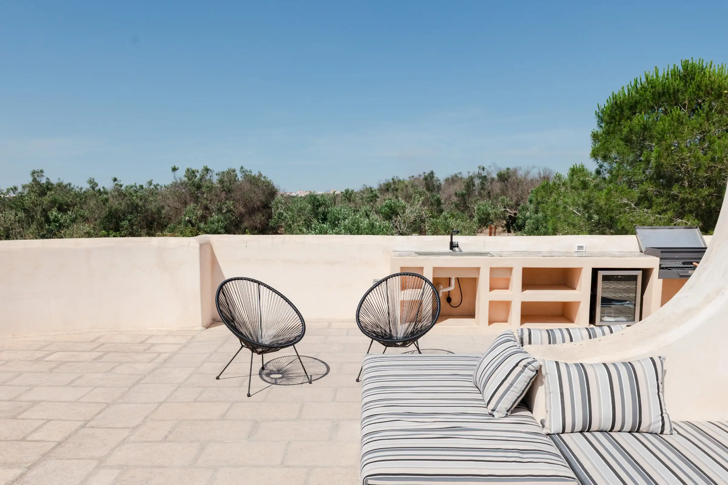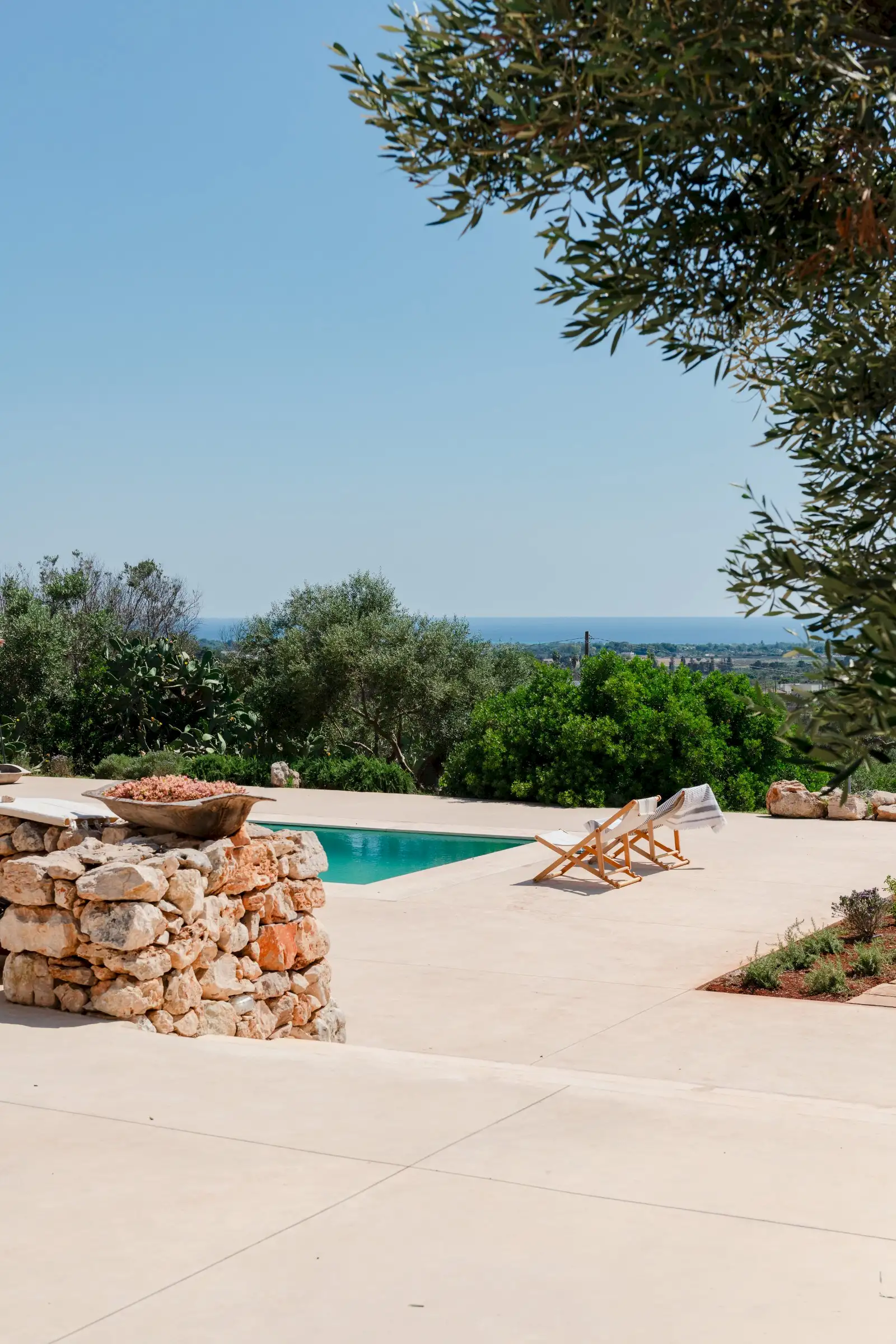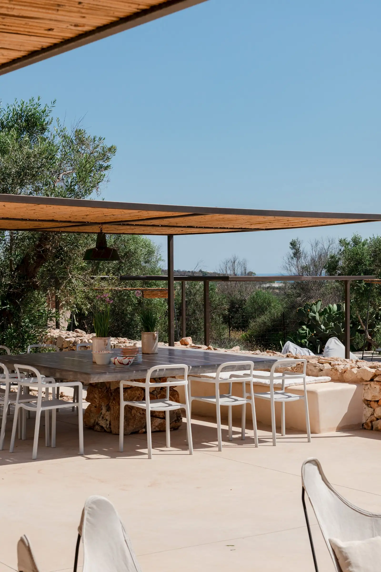 The spacious, open-plan central room combines the villa’s living, dining and kitchen areas. All on one level and with a smooth floor perfect for bare feet, it is a welcoming space that celebrates natural materials and forms. Understated in style yet expertly equipped, the kitchen has everything guests might need to make anything from a simple breakfast to a full-on feast. Flooded with light from three slim windows behind the smoothly sculpted island and from the sliding glass doors on one side of the room and the Critall-style doors on the other, the free-form design includes a huge plywood cupboard with rustic tree branch handles. A wine fridge and Lavazza espresso machine provide just the right level of sophistication and comfort to counterbalance the rustic aesthetic. An oval fire stove on a pillar in the middle of the room warms the villa in the cooler months and near it is the indoor dining table that seats eight. Outside, a larger dining table for 12 in the shade provides the perfect place for long al fresco meals with views of three beautiful Puglian blues: pool, sky and sea