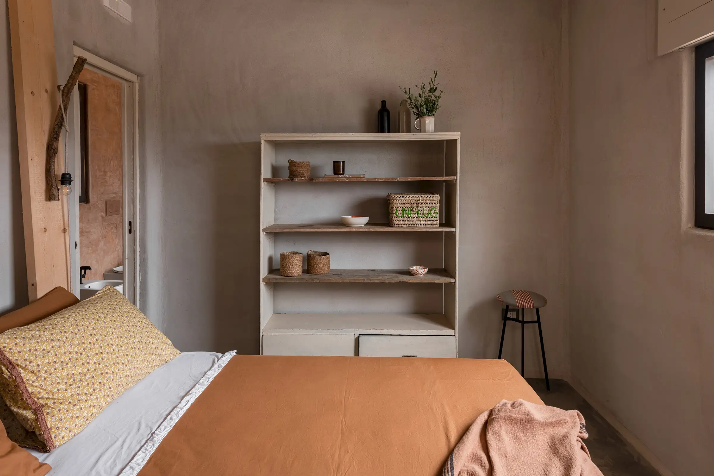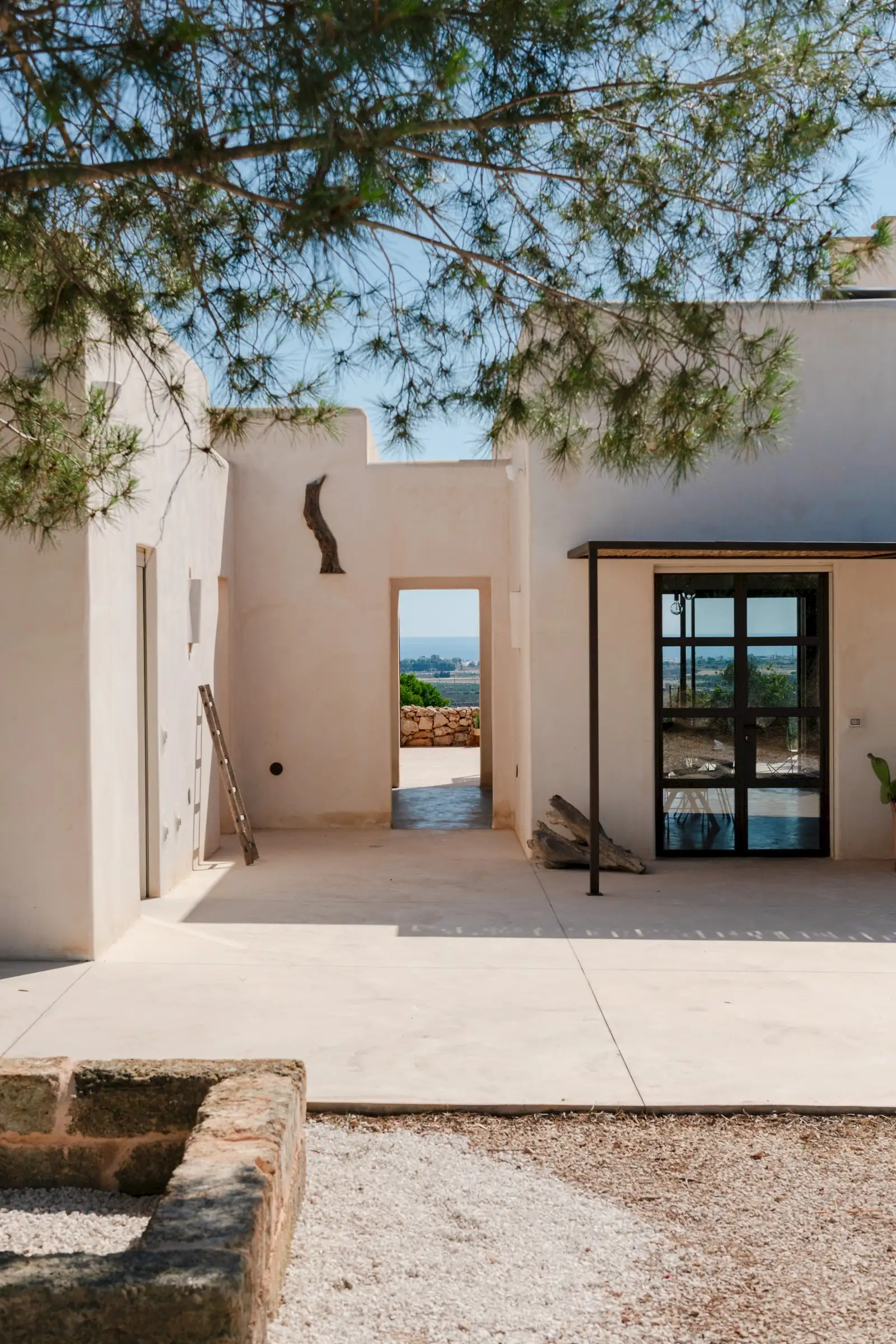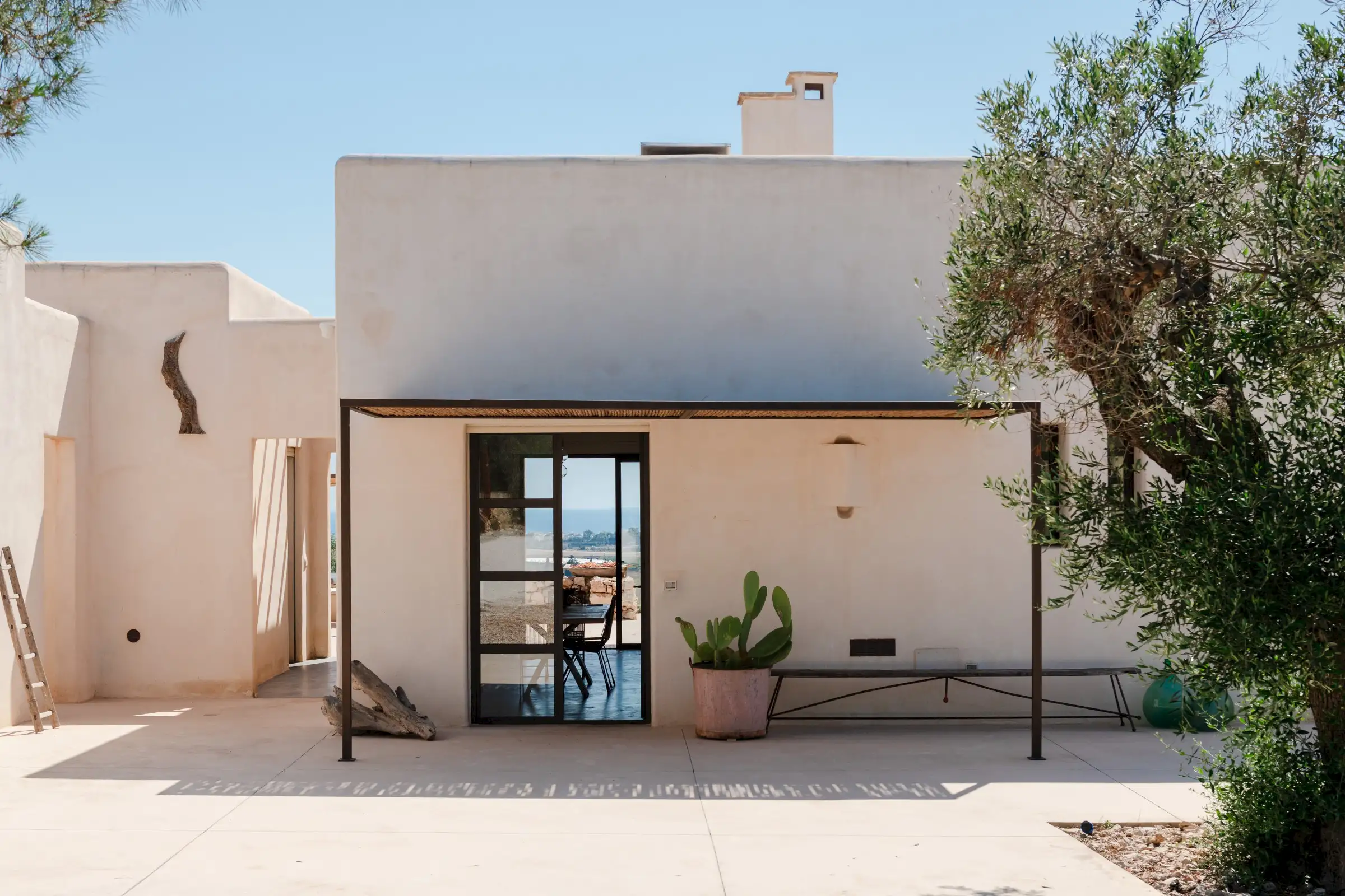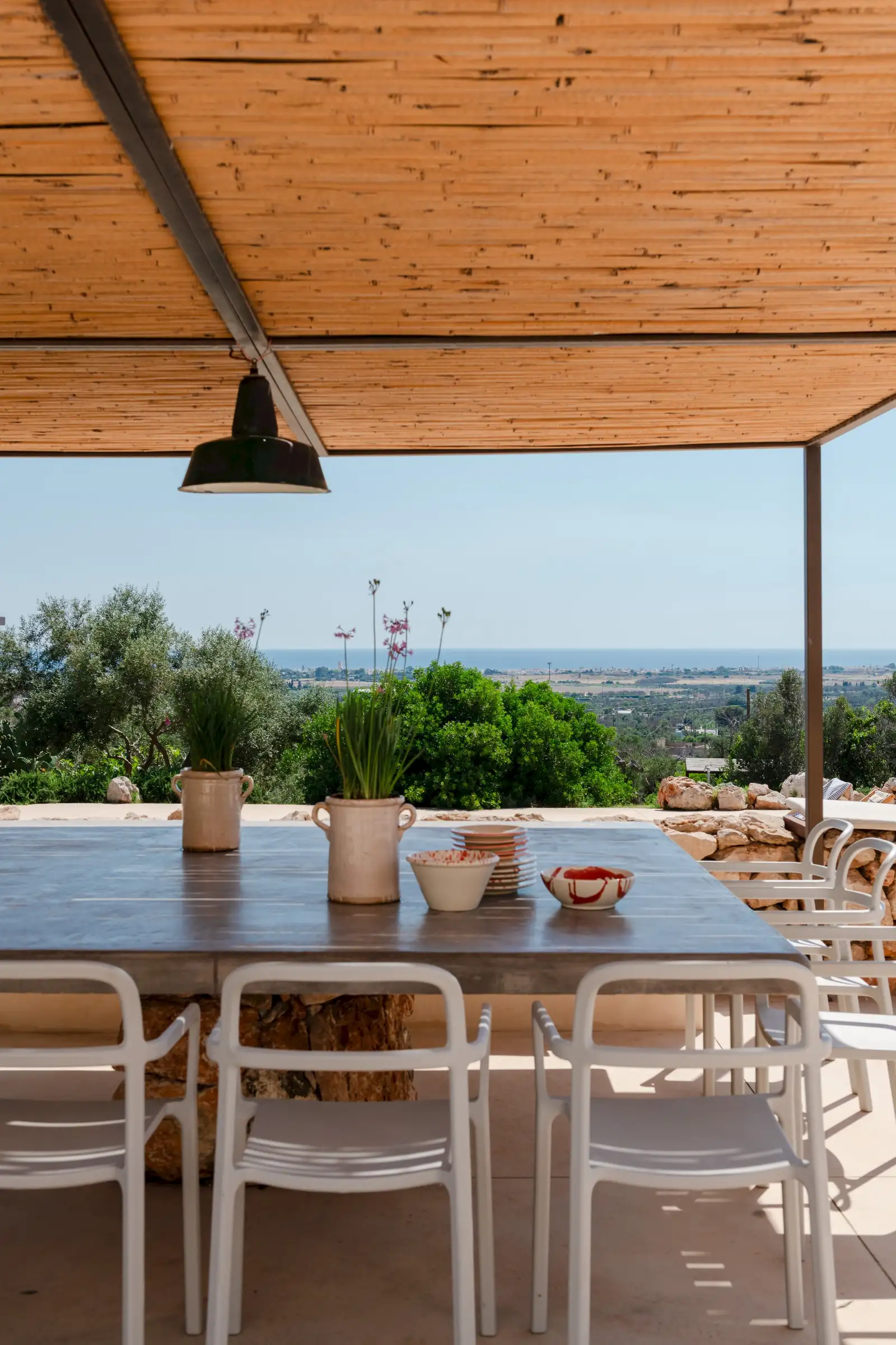 The spacious, open-plan central room combines the villa’s living, dining and kitchen areas. All on one level and with a smooth floor perfect for bare feet, it is a welcoming space that celebrates natural materials and forms. Understated in style yet expertly equipped, the kitchen has everything guests might need to make anything from a simple breakfast to a full-on feast. Flooded with light from three slim windows behind the smoothly sculpted island and from the sliding glass doors on one side of the room and the Critall-style doors on the other, the free-form design includes a huge plywood cupboard with rustic tree branch handles. A wine fridge and Lavazza espresso machine provide just the right level of sophistication and comfort to counterbalance the rustic aesthetic. An oval fire stove on a pillar in the middle of the room warms the villa in the cooler months and near it is the indoor dining table that seats eight. Outside, a larger dining table for 12 in the shade provides the perfect place for long al fresco meals with views of three beautiful Puglian blues: pool, sky and sea