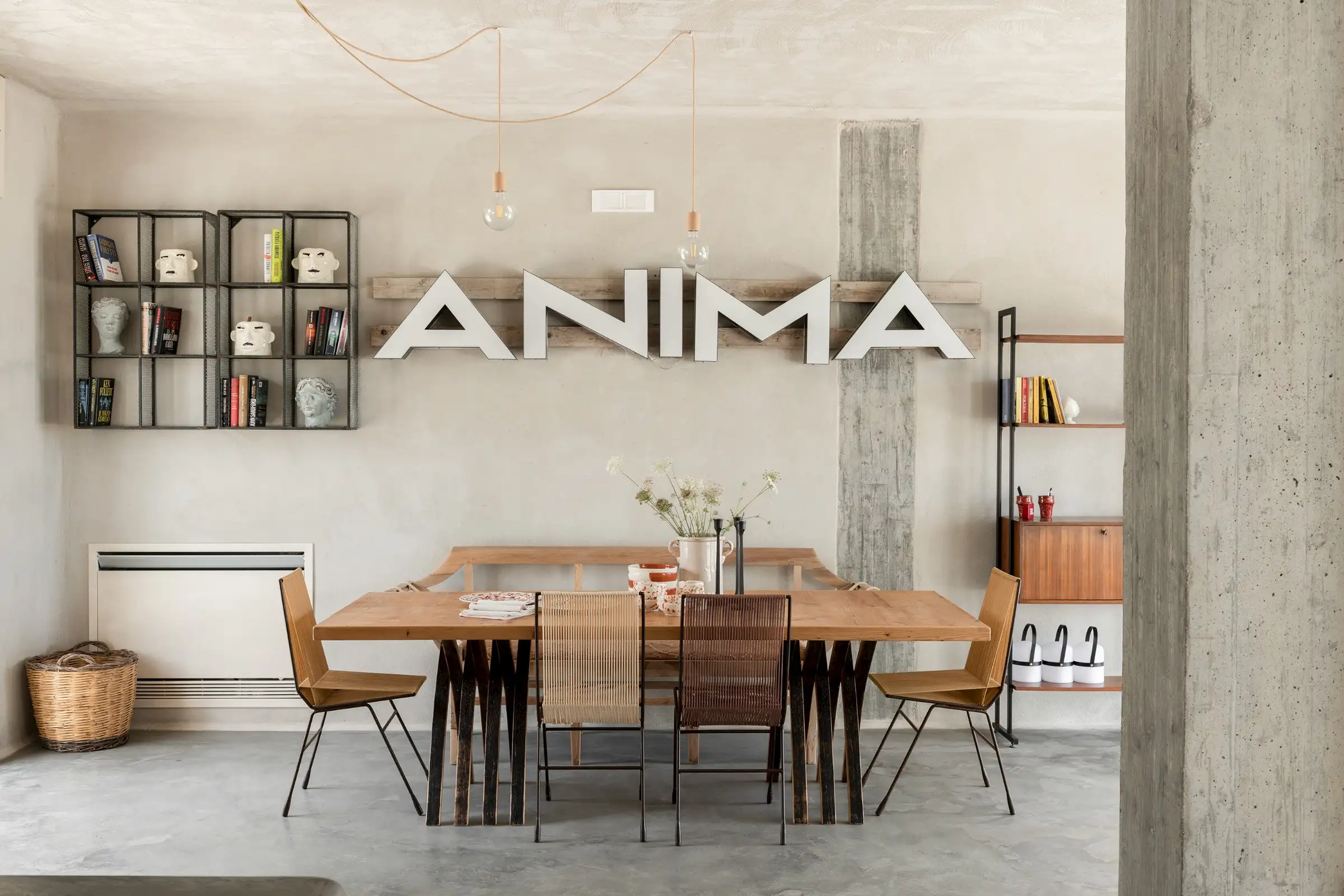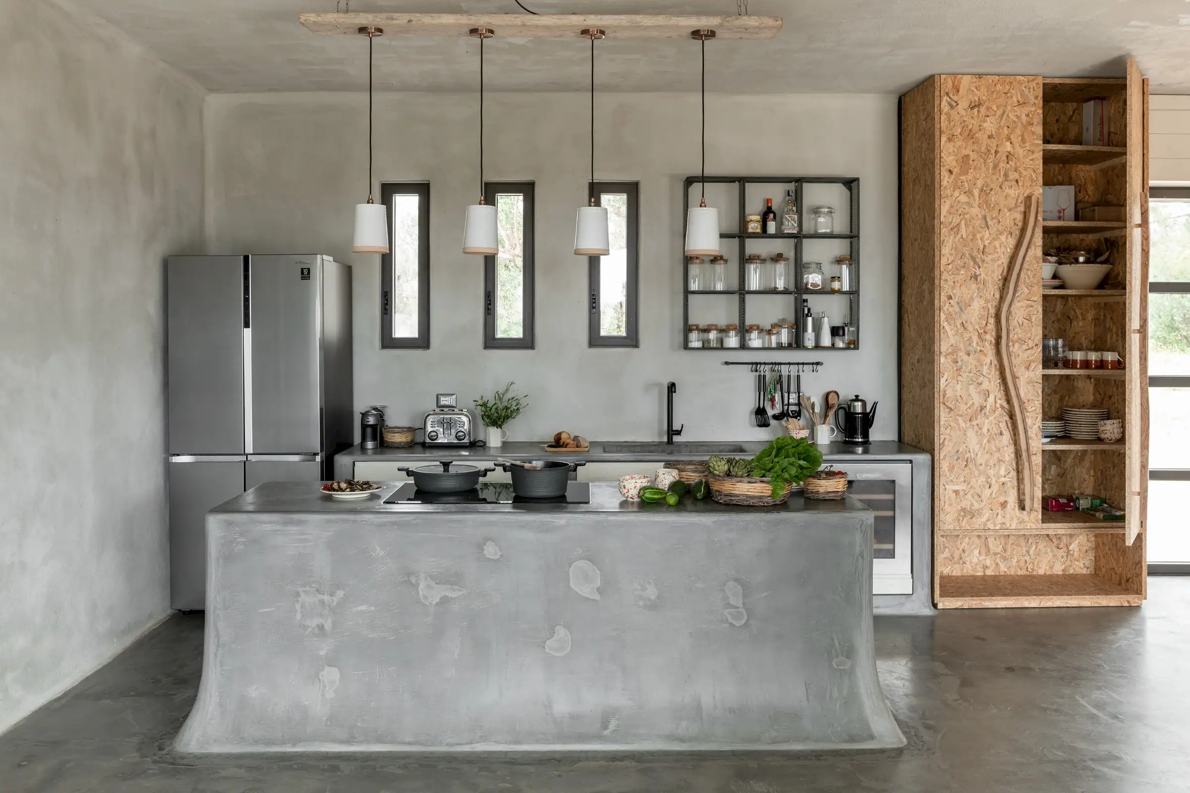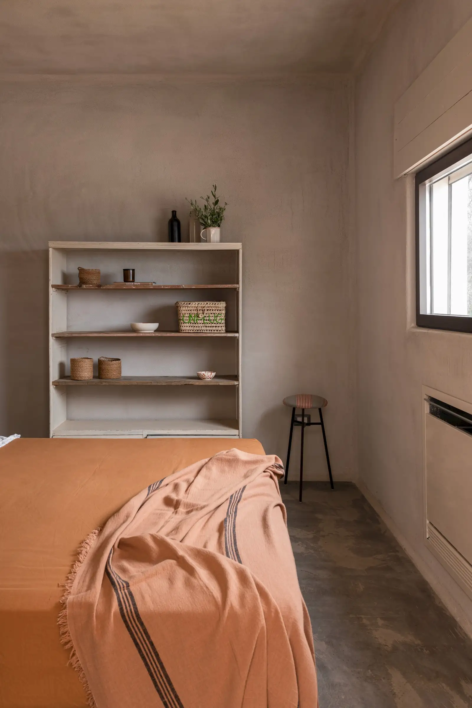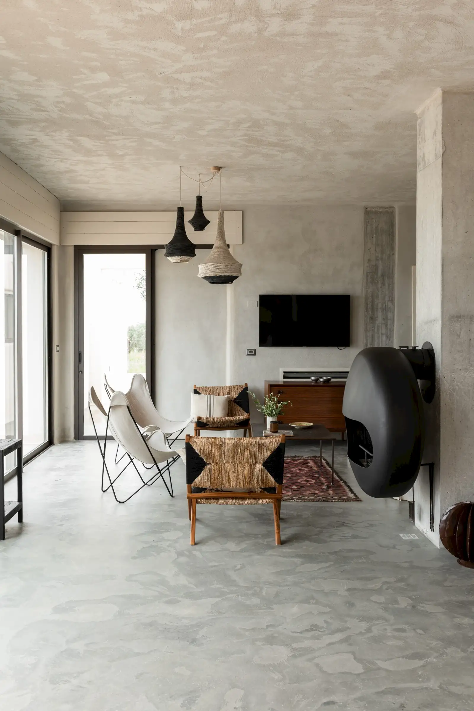 The spacious, open-plan central room combines the villa’s living, dining and kitchen areas. All on one level and with a smooth floor perfect for bare feet, it is a welcoming space that celebrates natural materials and forms. Understated in style yet expertly equipped, the kitchen has everything guests might need to make anything from a simple breakfast to a full-on feast. Flooded with light from three slim windows behind the smoothly sculpted island and from the sliding glass doors on one side of the room and the Critall-style doors on the other, the free-form design includes a huge plywood cupboard with rustic tree branch handles. A wine fridge and Lavazza espresso machine provide just the right level of sophistication and comfort to counterbalance the rustic aesthetic. An oval fire stove on a pillar in the middle of the room warms the villa in the cooler months and near it is the indoor dining table that seats eight. Outside, a larger dining table for 12 in the shade provides the perfect place for long al fresco meals with views of three beautiful Puglian blues: pool, sky and sea