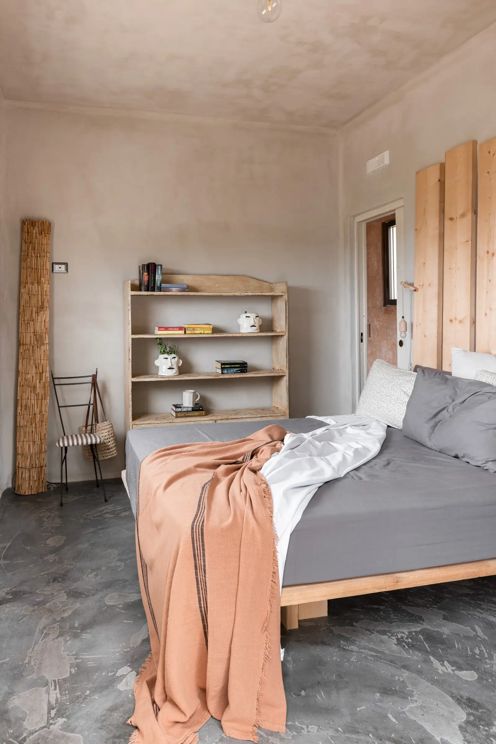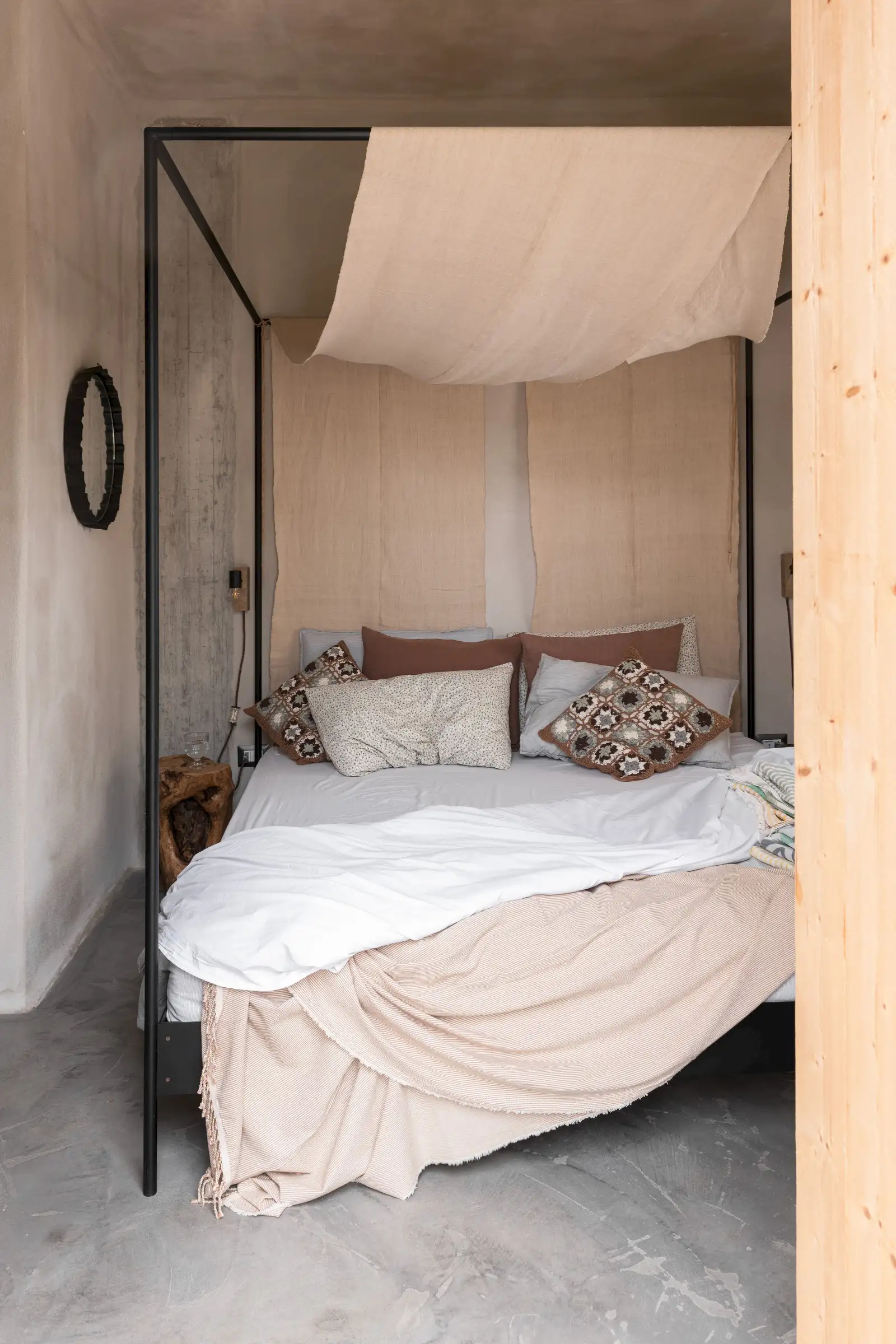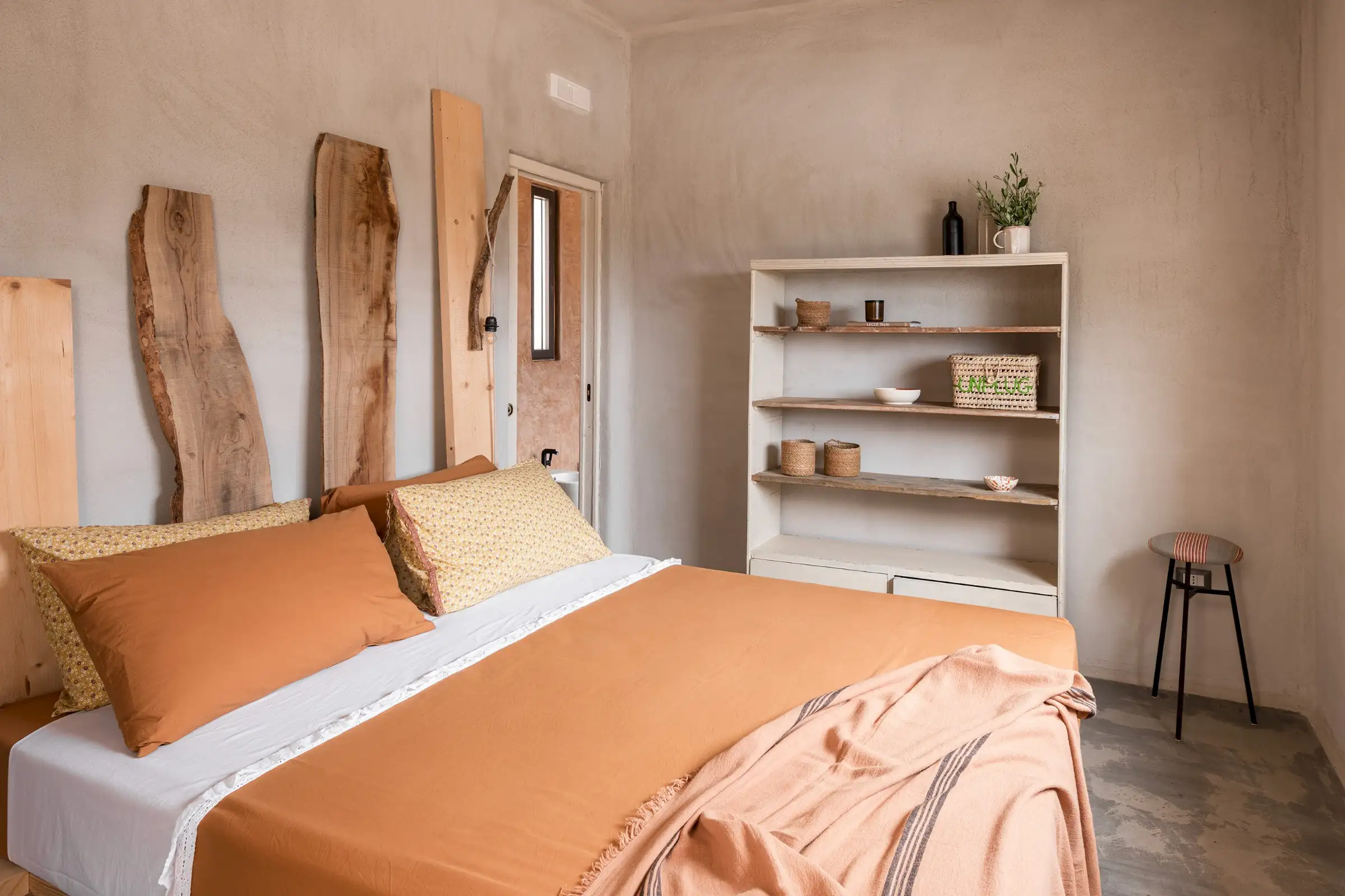 The rooms are simply decorated in earthy tones with sculptural driftwood headboards or draped linen canopies and light fixtures crafted from wood. There are three king-size doubles and one twin room with fabulous four-poster beds in a bold desert orange.