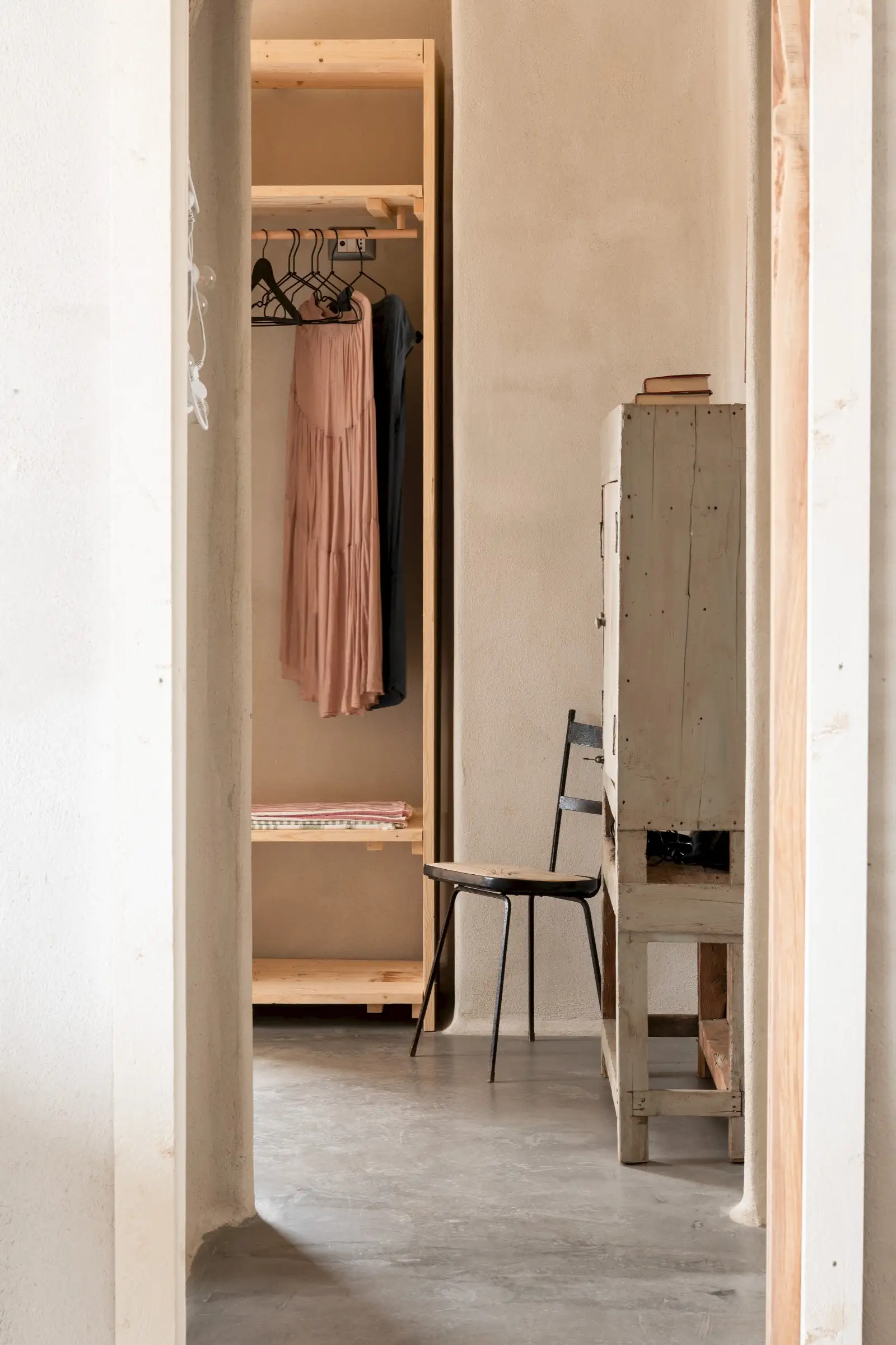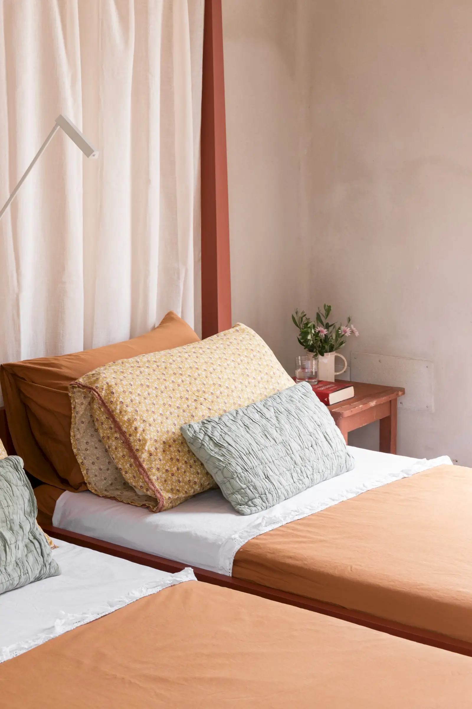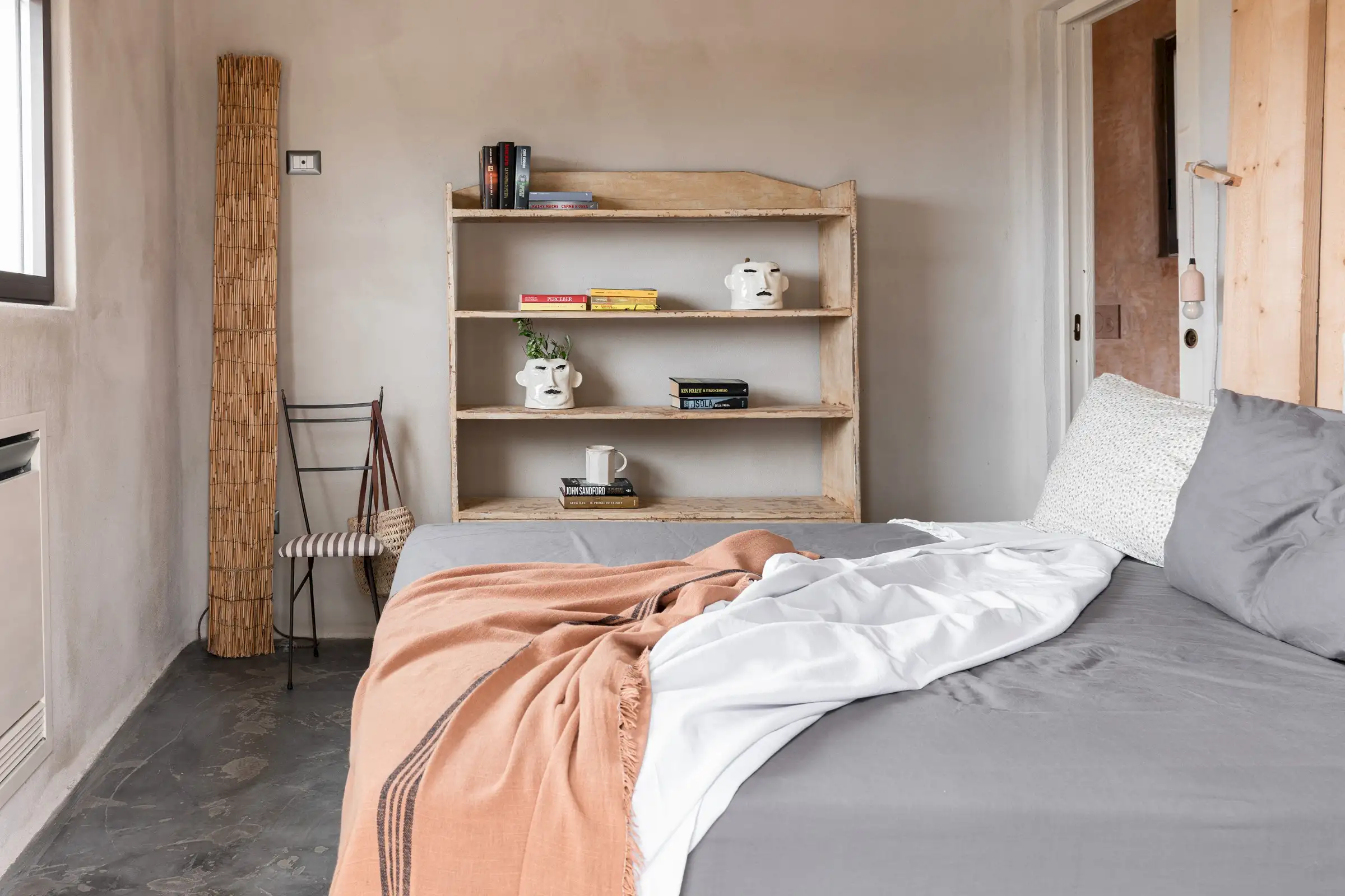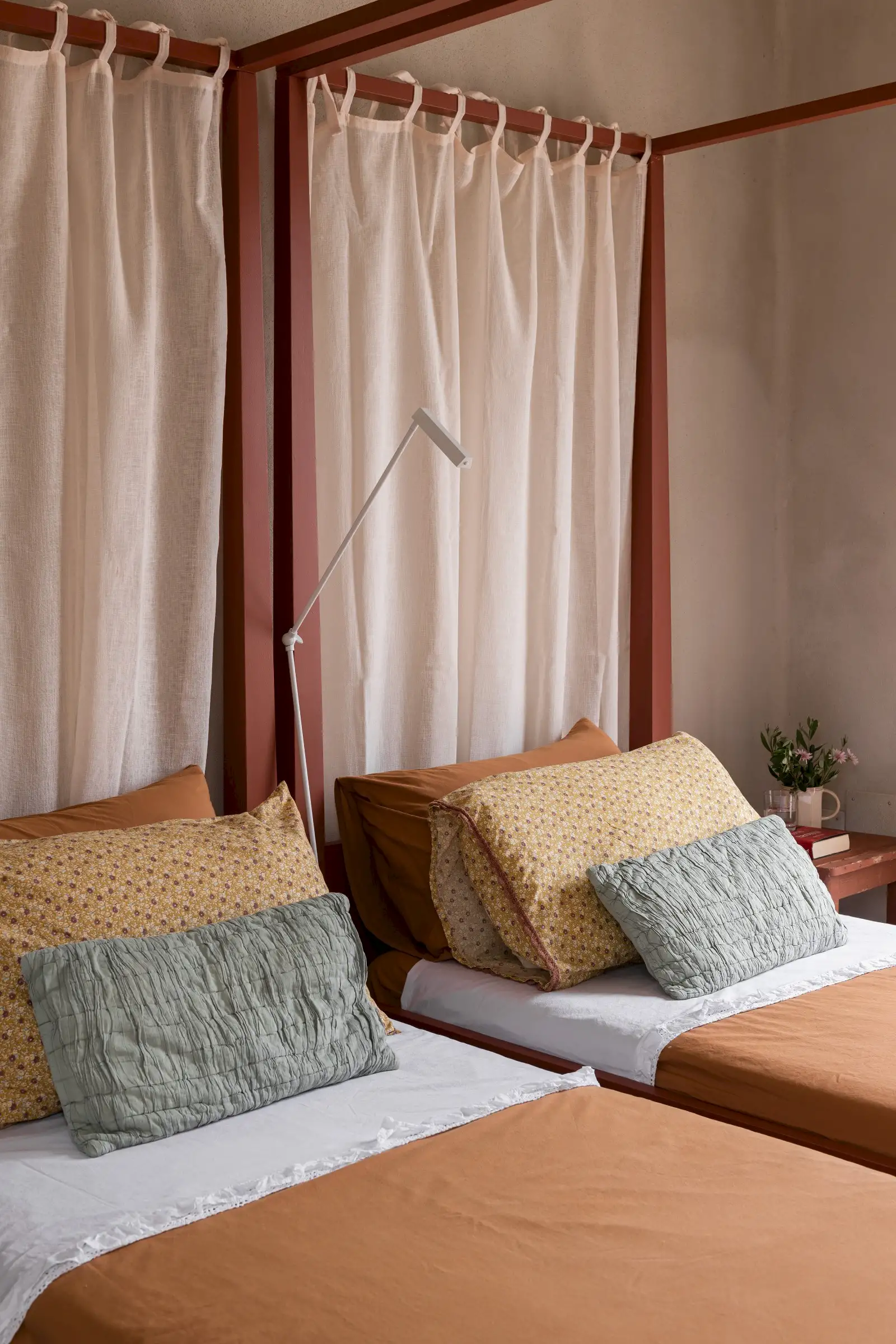 The rooms are simply decorated in earthy tones with sculptural driftwood headboards or draped linen canopies and light fixtures crafted from wood. There are three king-size doubles and one twin room with fabulous four-poster beds in a bold desert orange.