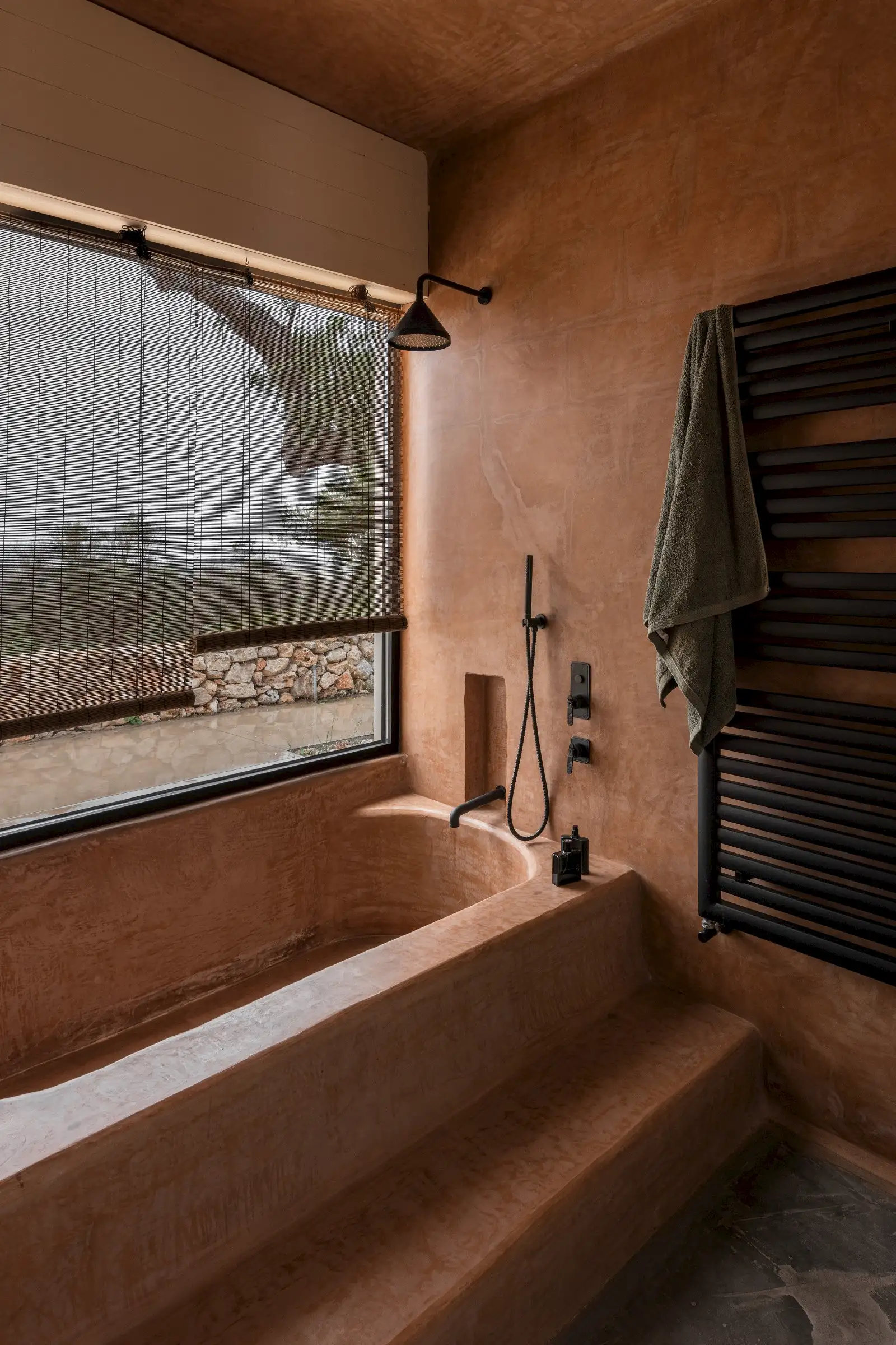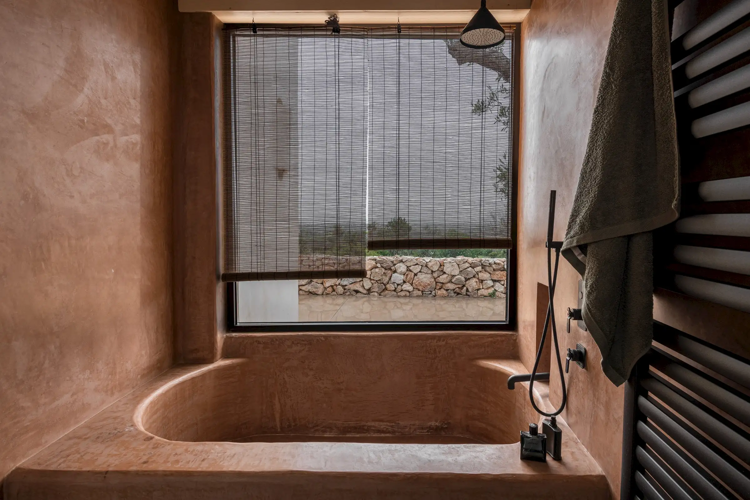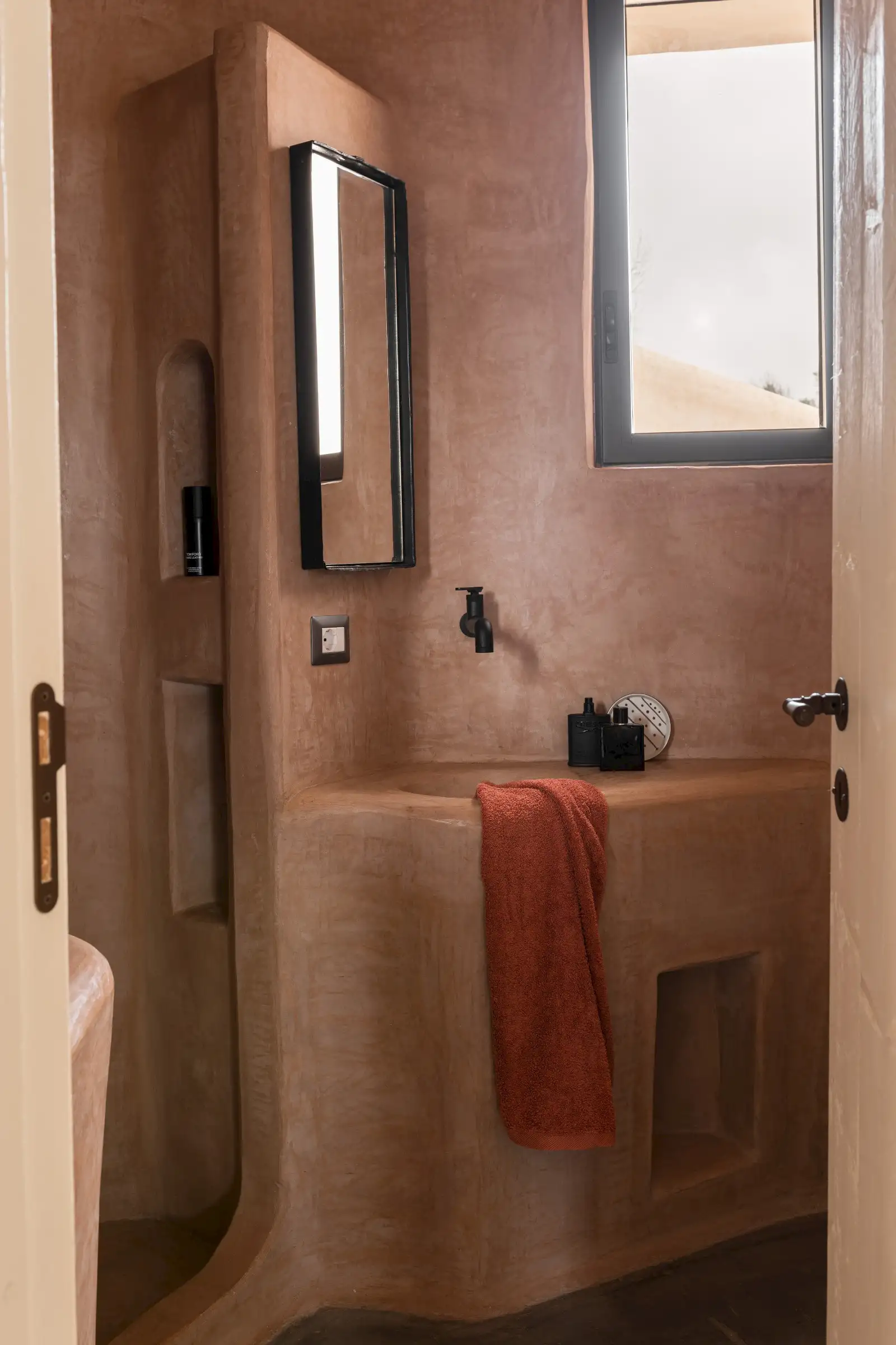 There are four en-suite bathrooms, all with showers and two with a bath, as well. Smooth Moroccan-style walls in earthy colours continue and form the shower walls, the sculptural form being matched by functional niches for lotions and potions as well as hi-spec fixtures and fittings. One of the baths is flush with a large picture window making for a soak with a spectacular view towards the sea.