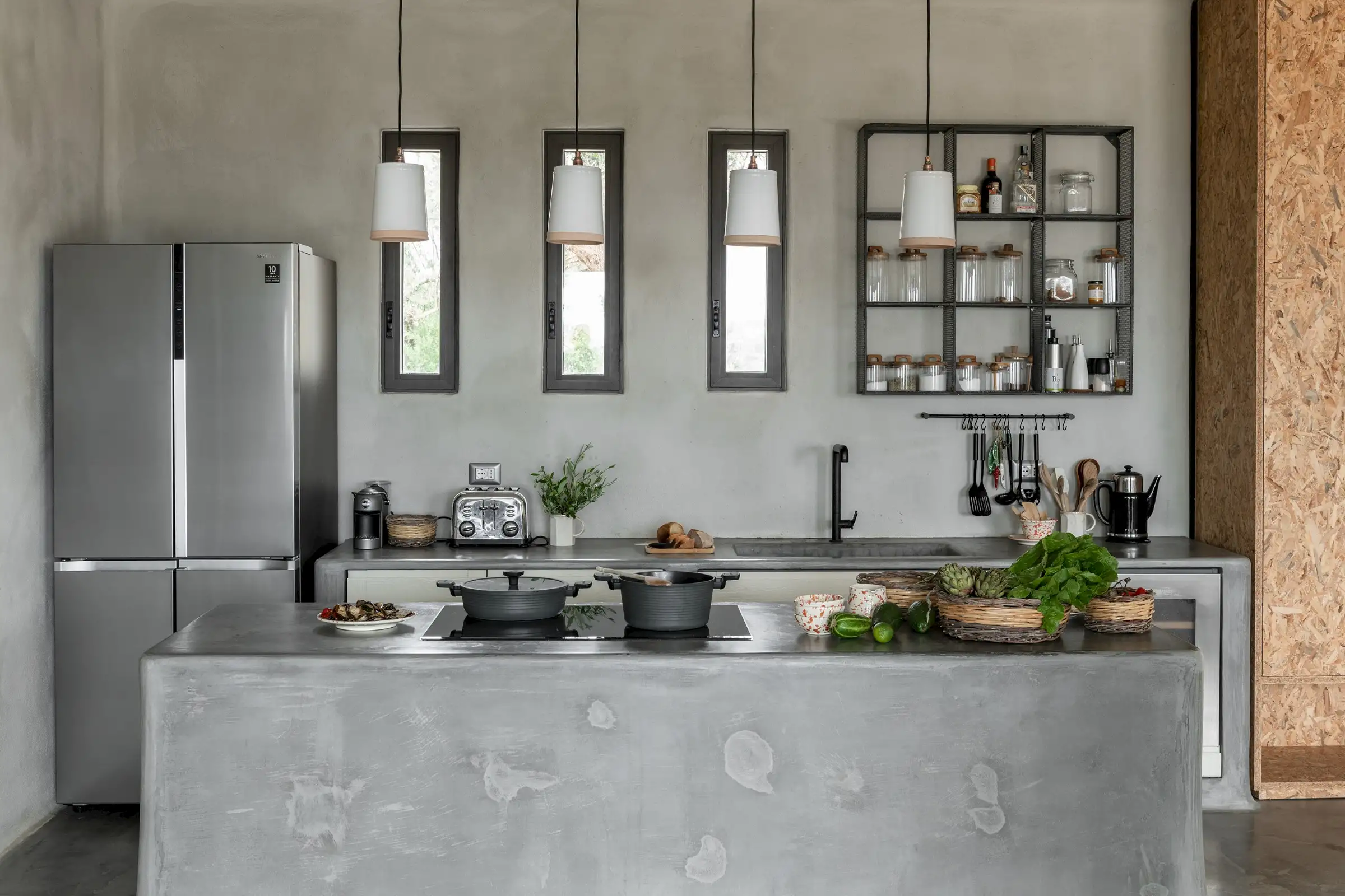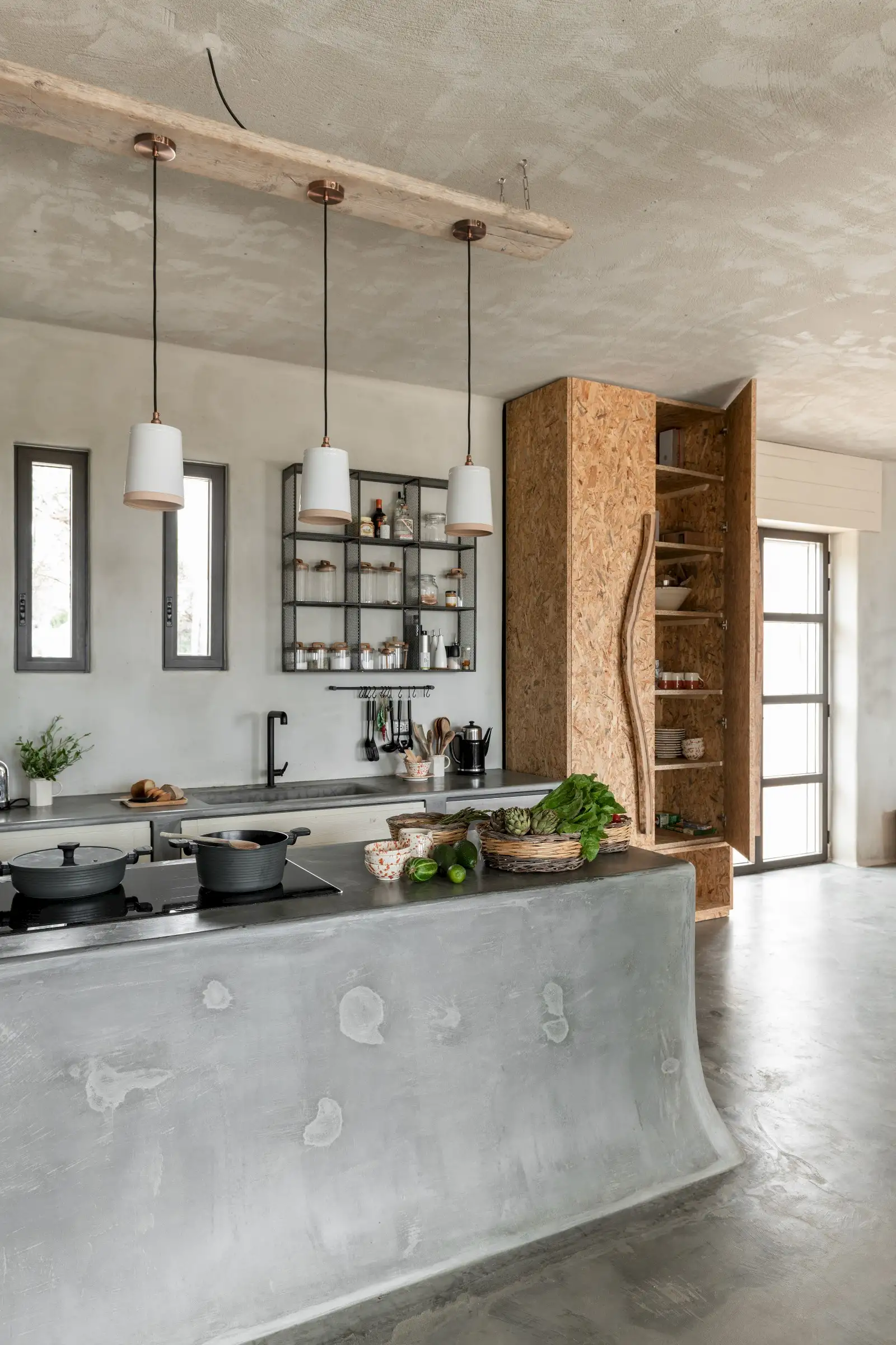 As part of the main room, the living area is a comfy spot to relax out of the heat of the summer sun or near the woodburning stove out of season. A simple space with a sofa and chairs is all that is required given the various outside lounge areas, including a day bed on the roof terrace, an outdoor sitting room on the terrace, and sun loungers, easy chairs and even a hammock that are dotted around the garden.