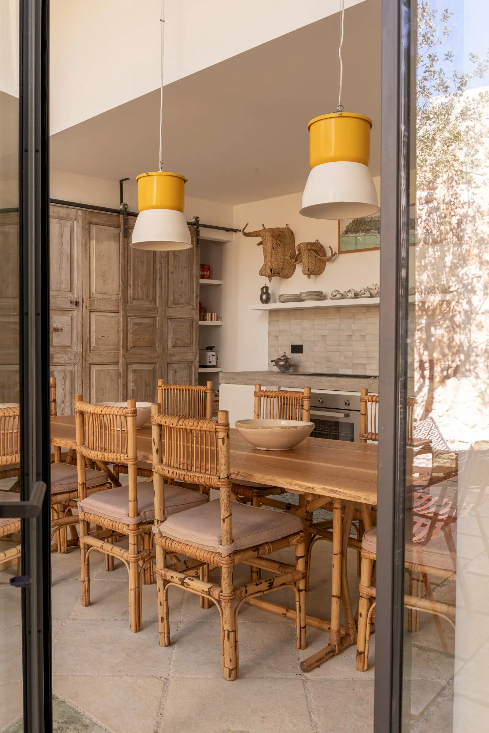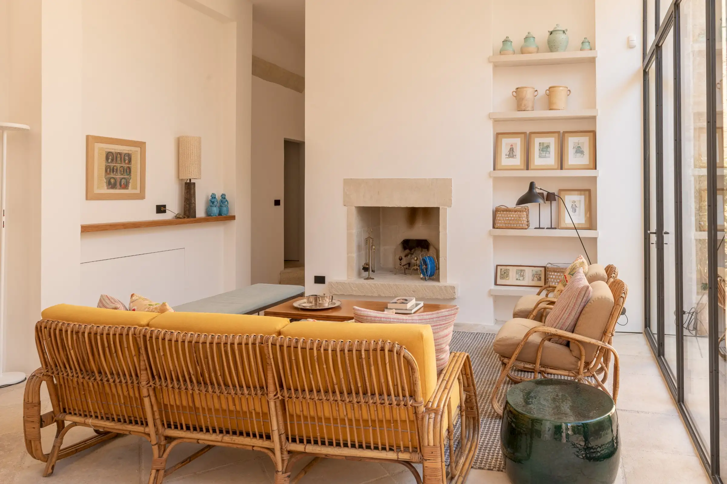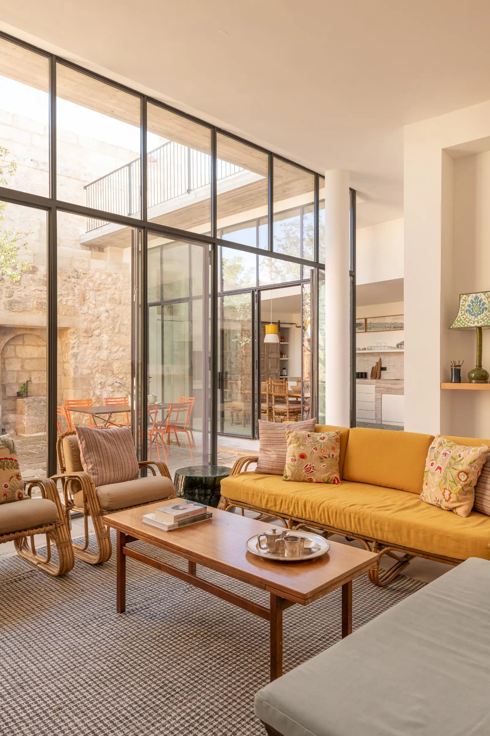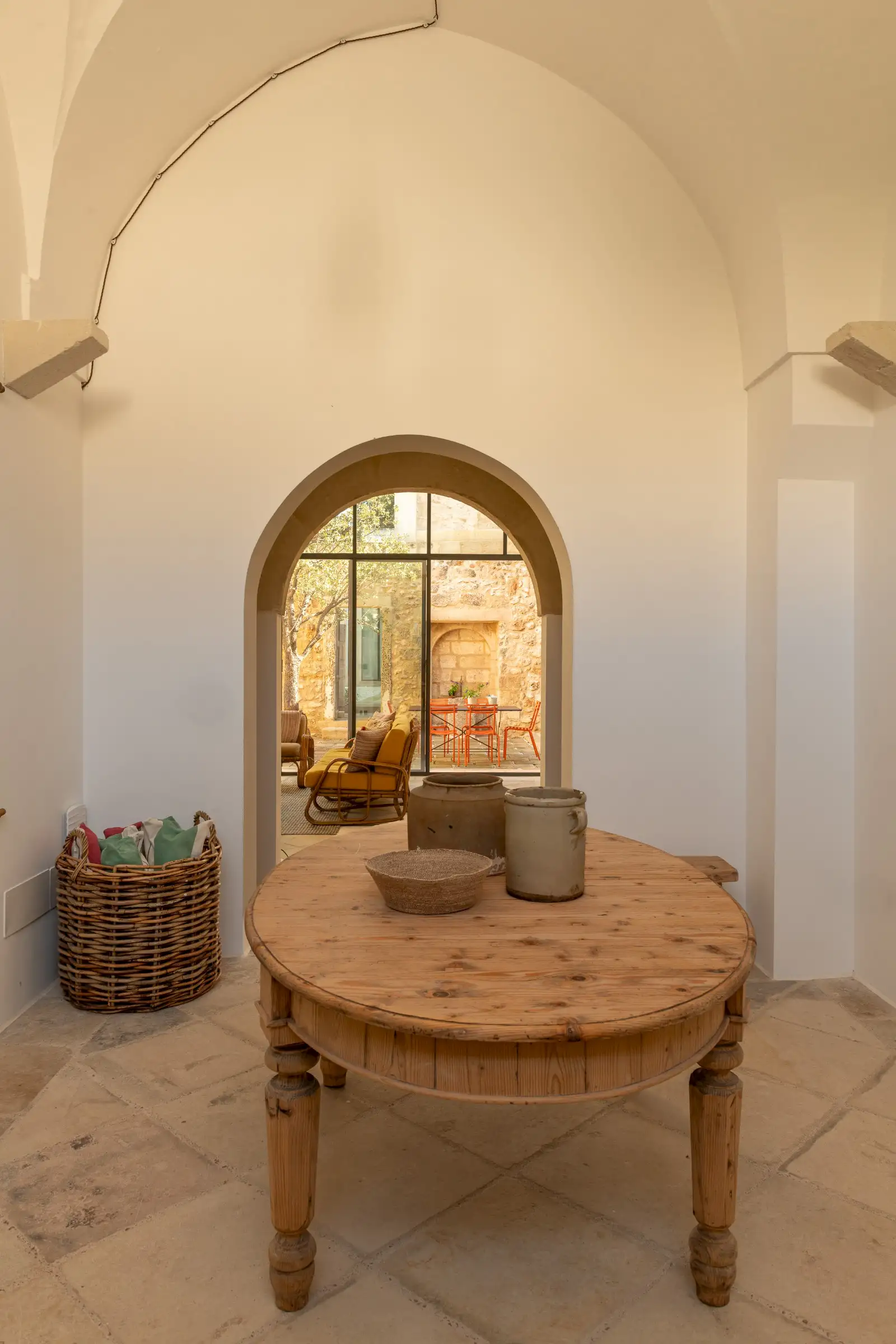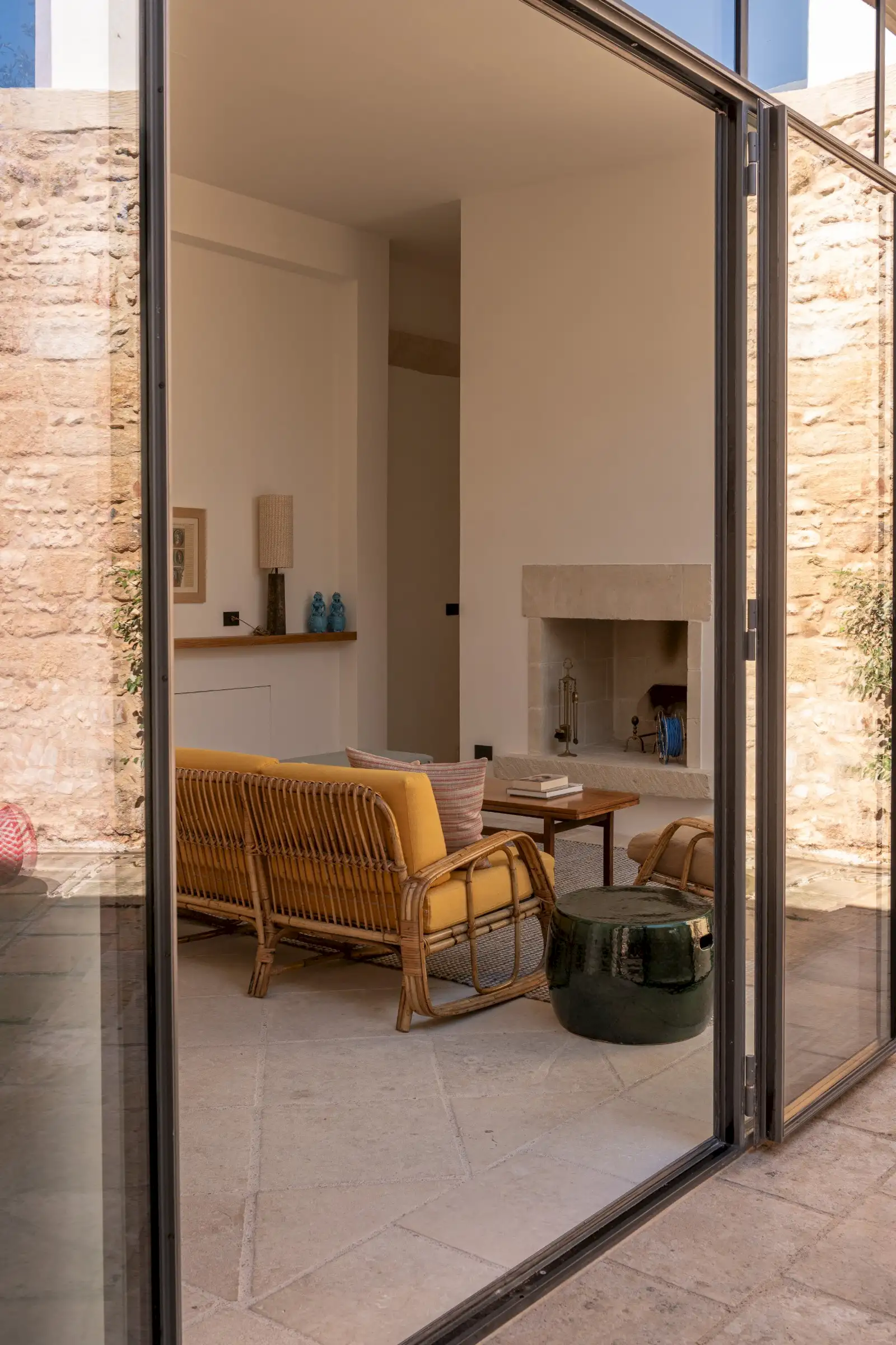Guests leave the sun-baked street via a wooden door and step into the delicious cool of the entrance hall with its stone floor and star-vaulted ceiling. A ground-floor courtyard garden bathes the downstairs living room in soft light through the wall of floor-to-ceiling glass, while a small pool sits on top of the new kitchen extension.