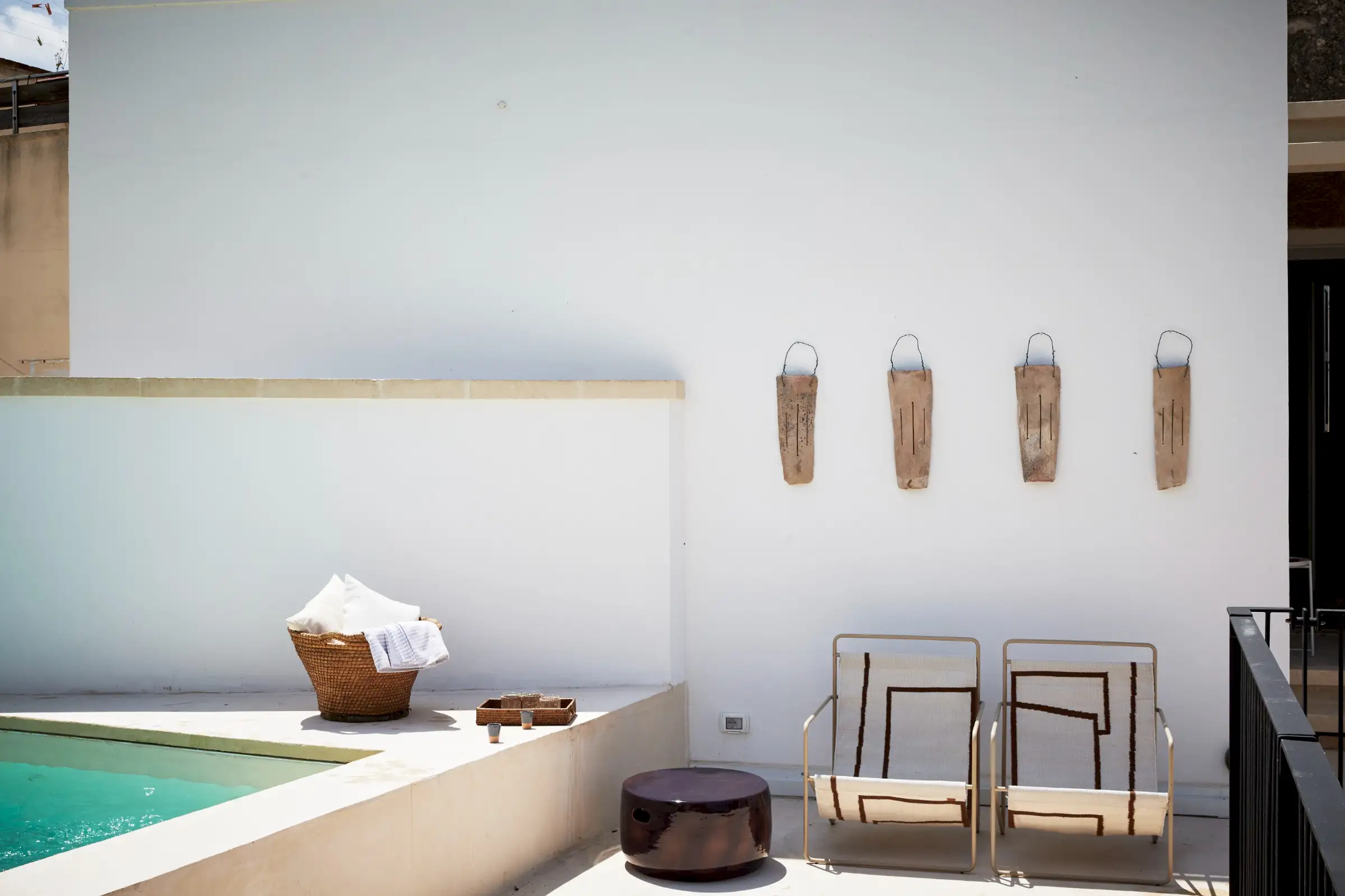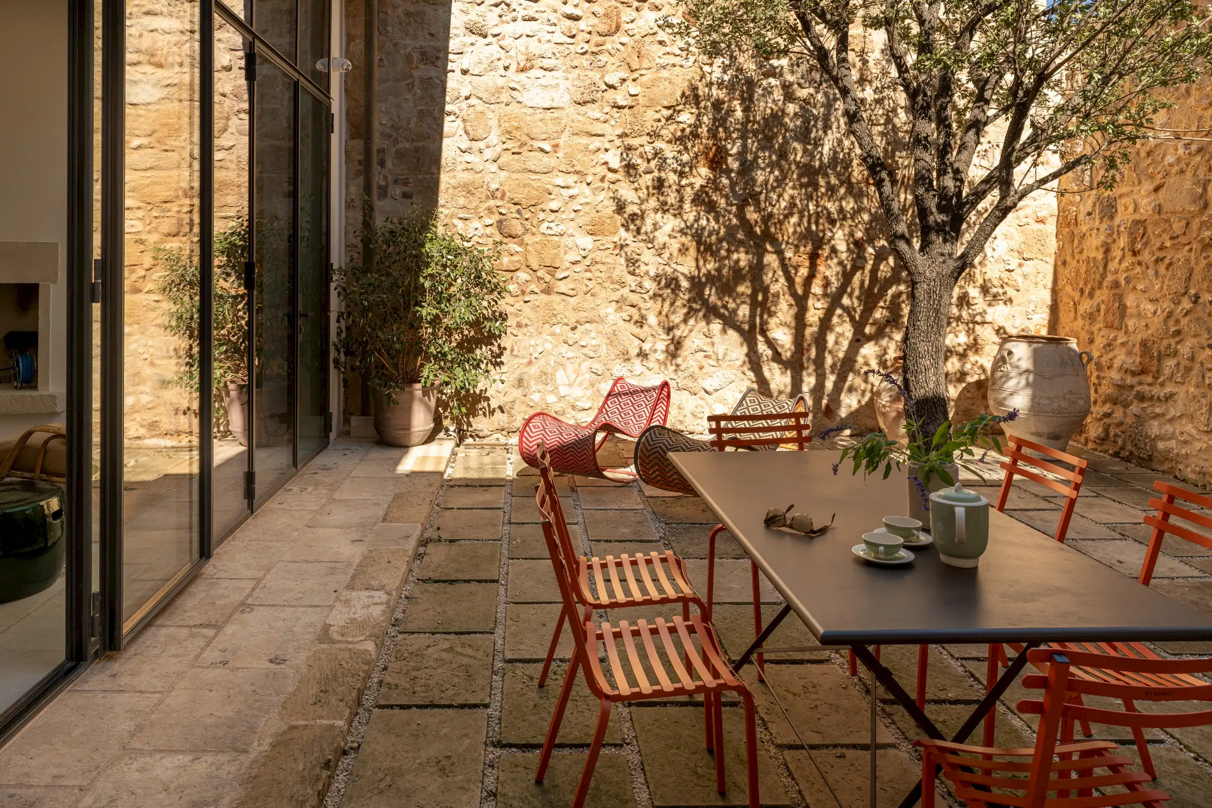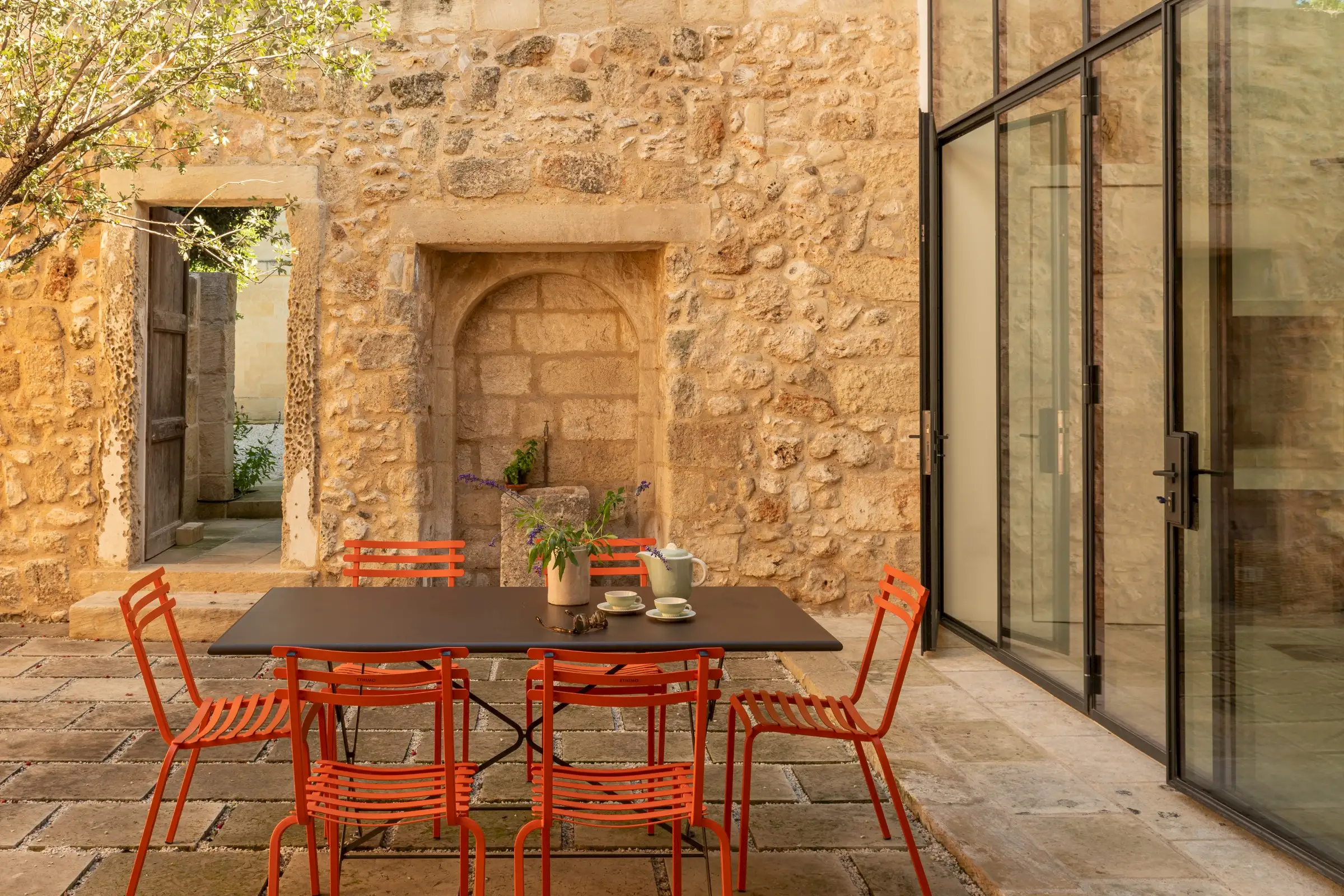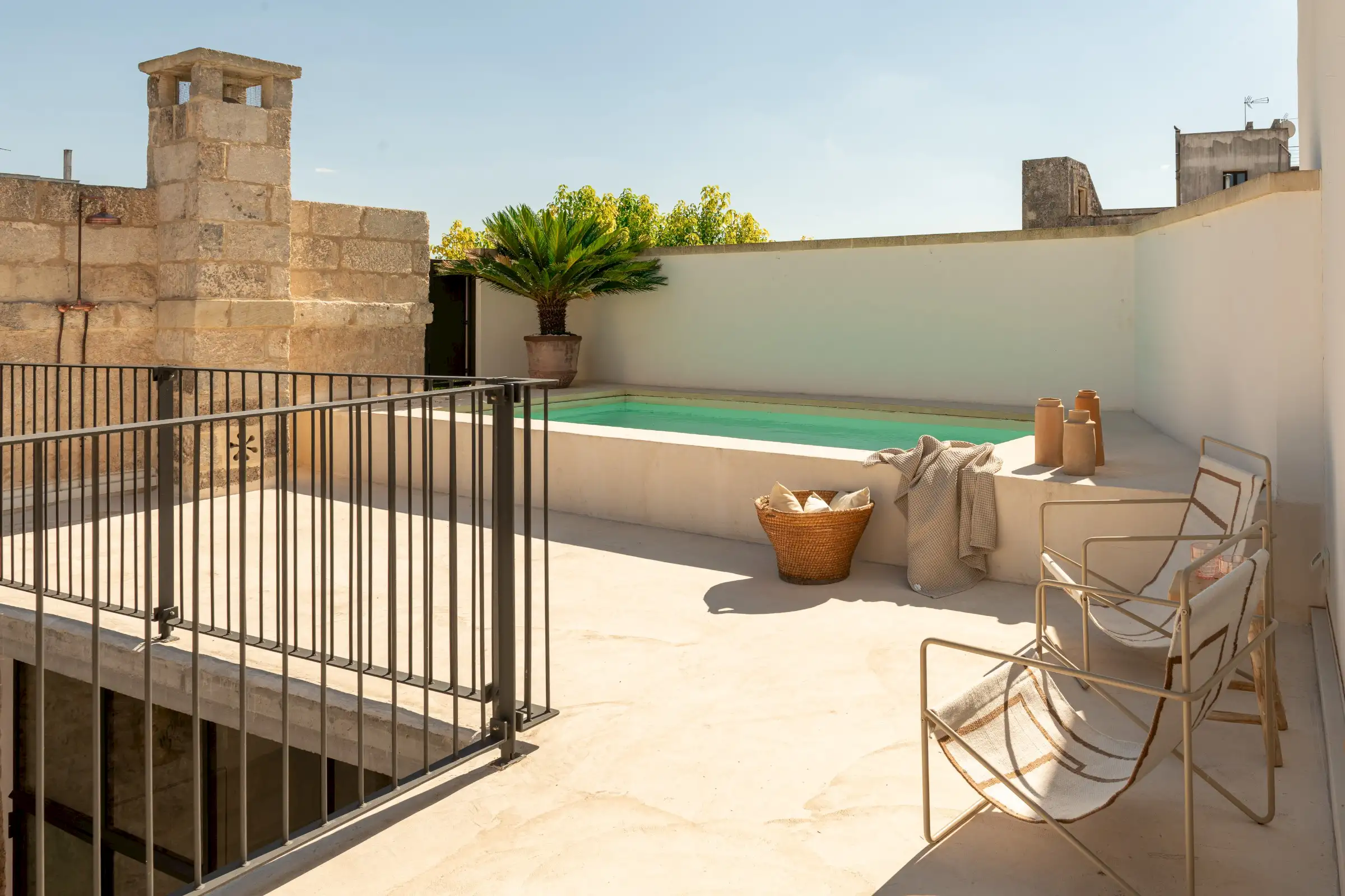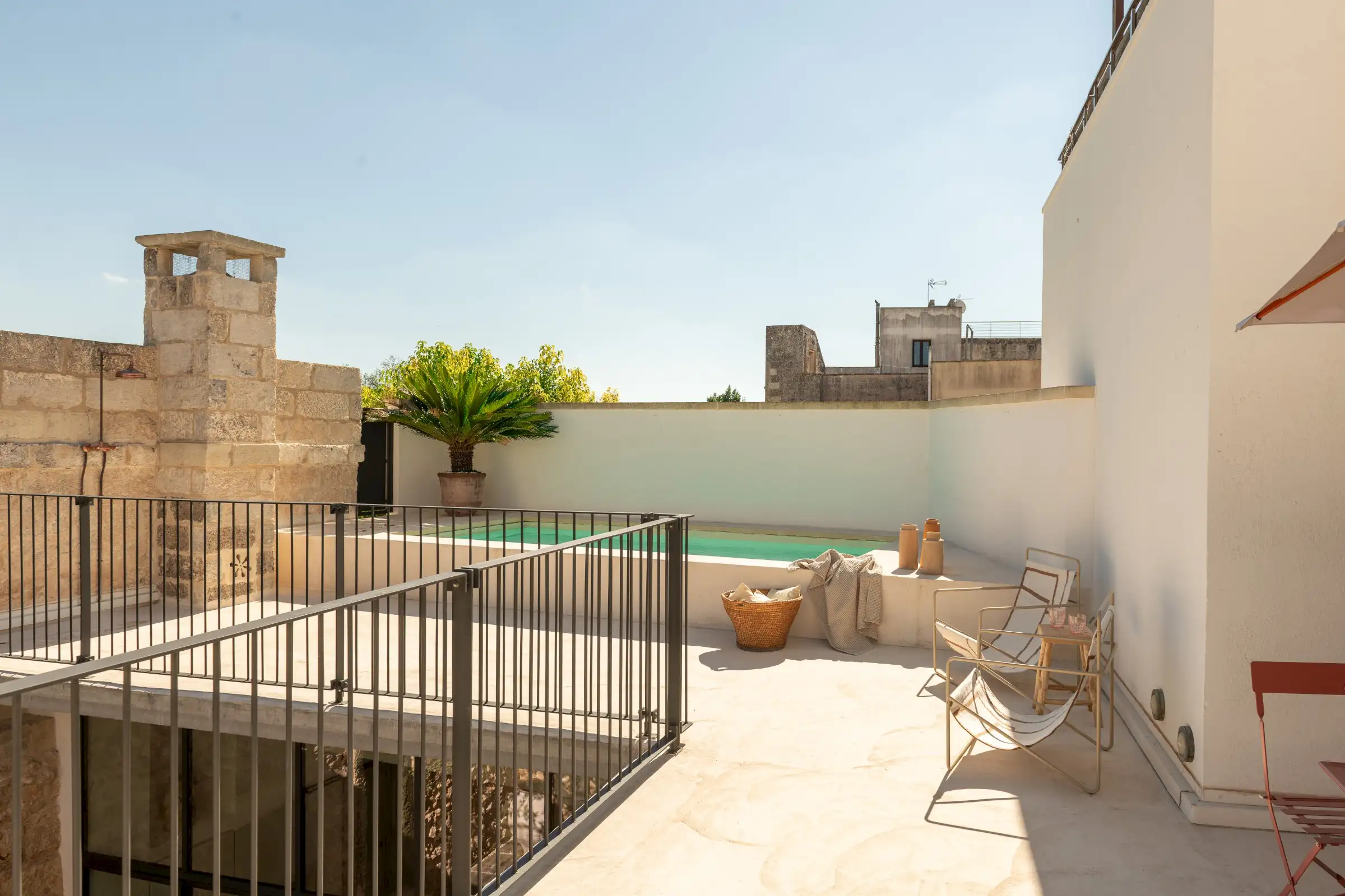 Guests leave the sun-baked street via a wooden door and step into the delicious cool of the entrance hall with its stone floor and star-vaulted ceiling. A ground-floor courtyard garden bathes the downstairs living room in soft light through the wall of floor-to-ceiling glass, while a small pool sits on top of the new kitchen extension.