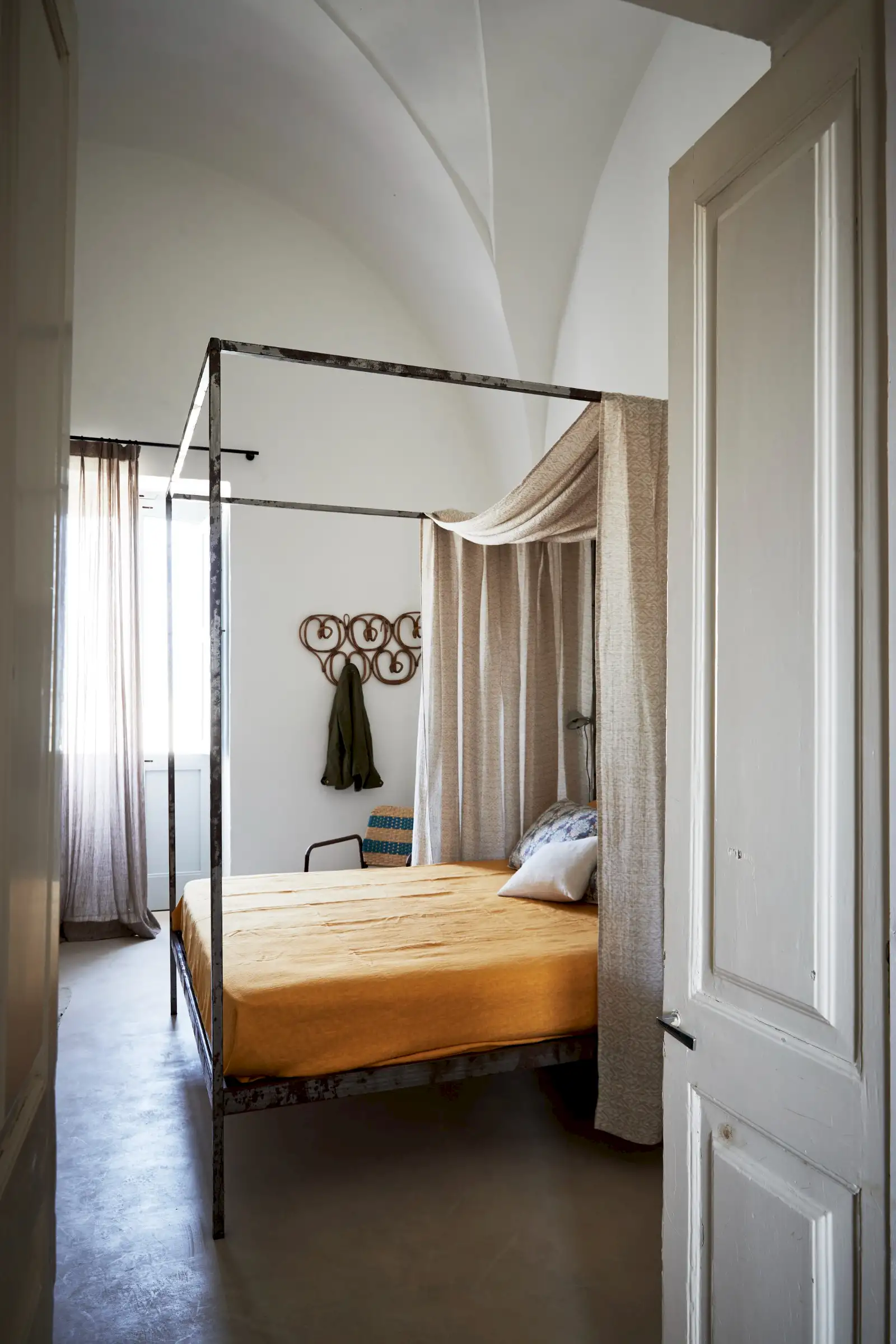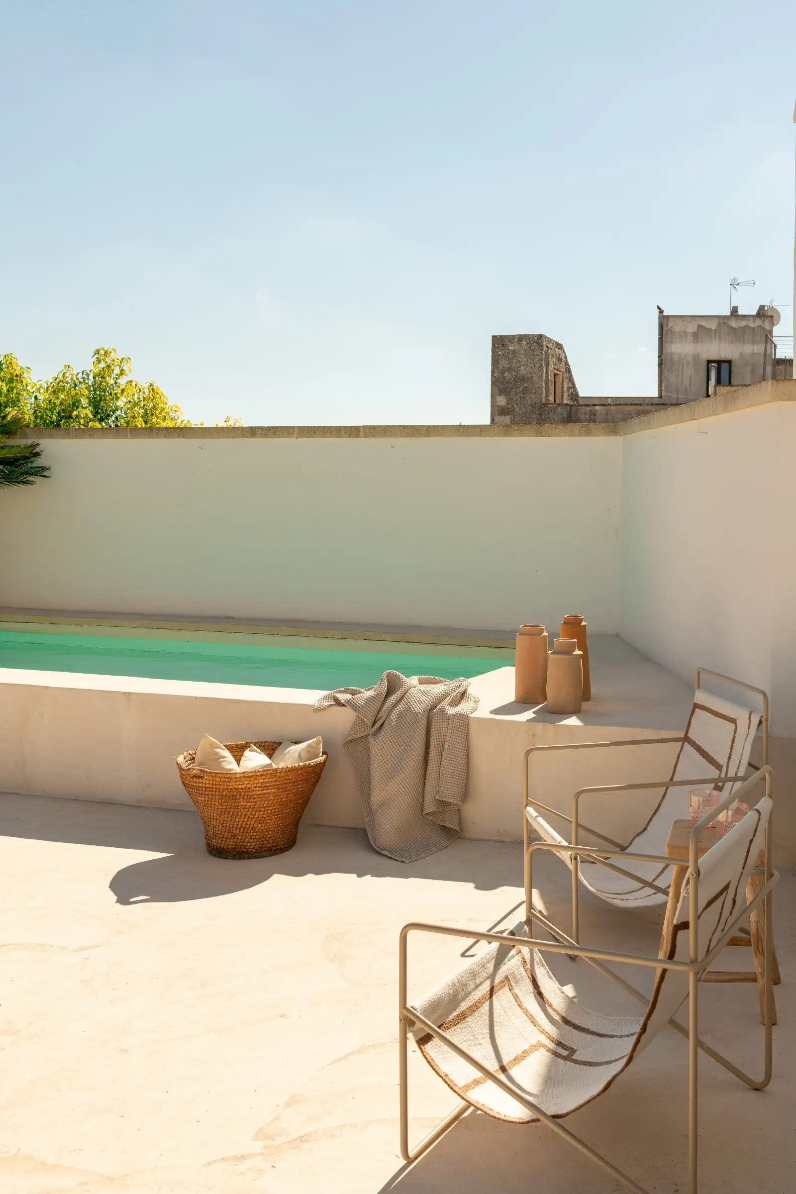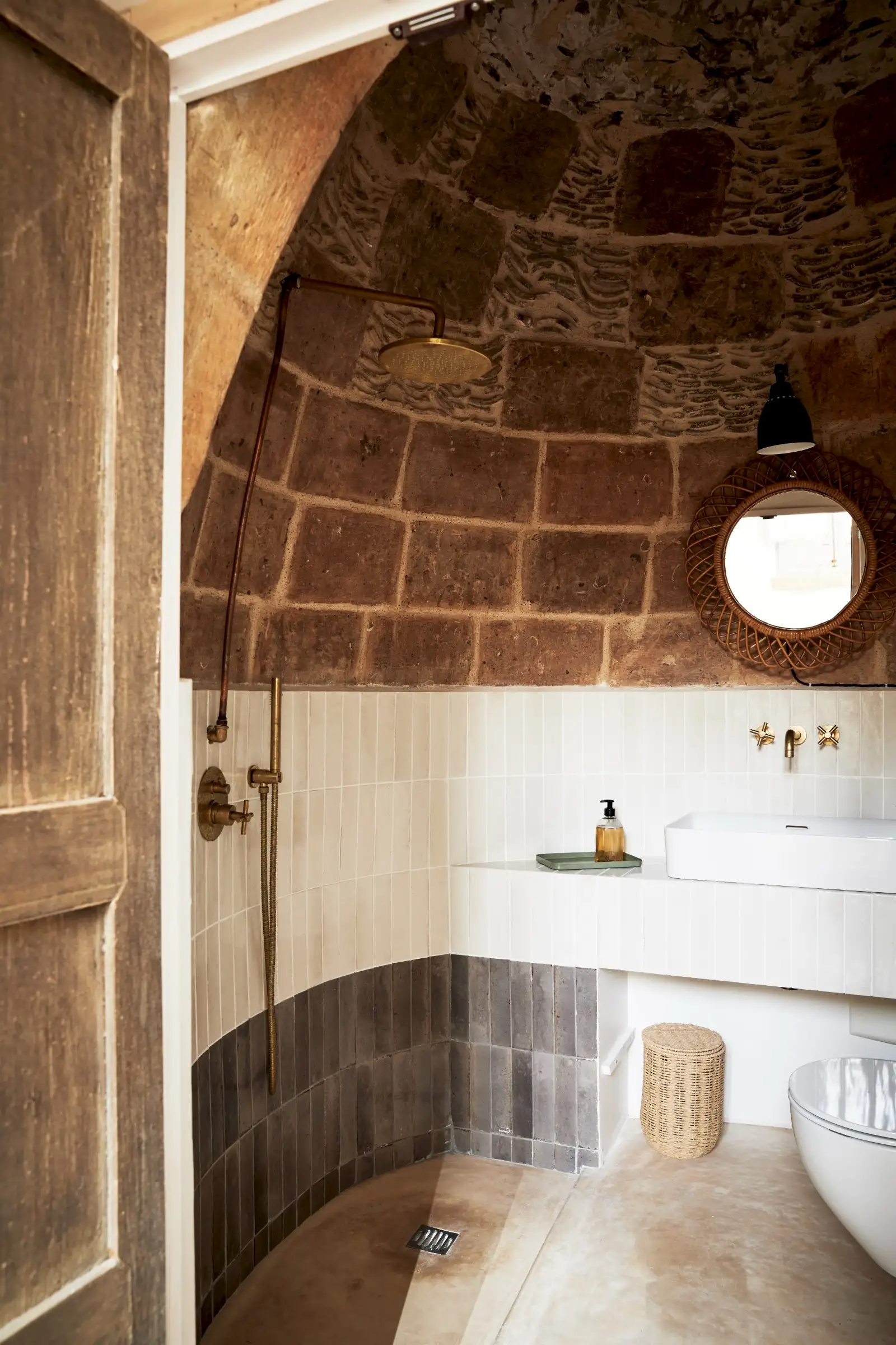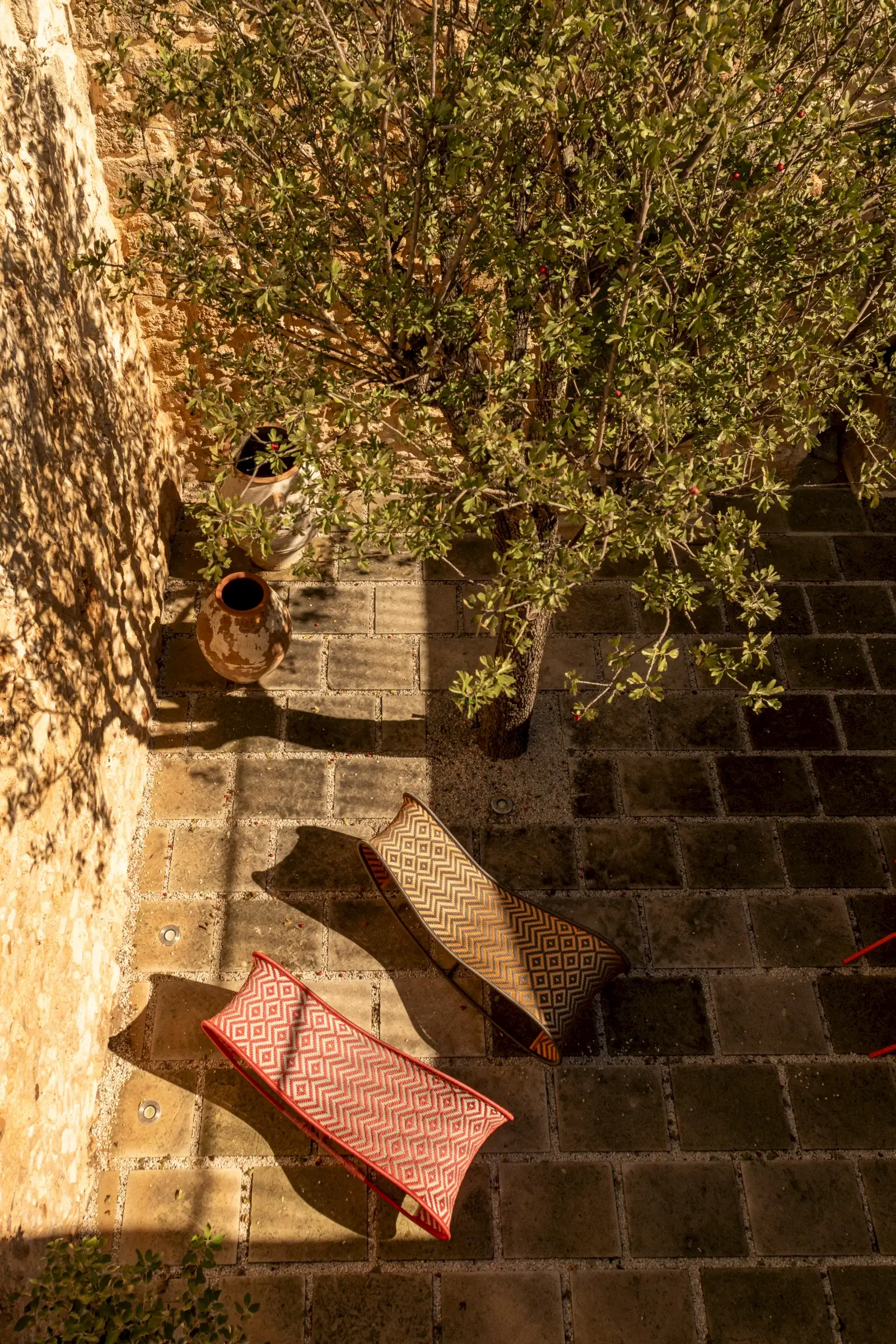 Guests leave the sun-baked street via a wooden door and step into the delicious cool of the entrance hall with its stone floor and star-vaulted ceiling. A ground-floor courtyard garden bathes the downstairs living room in soft light through the wall of floor-to-ceiling glass, while a small pool sits on top of the new kitchen extension.