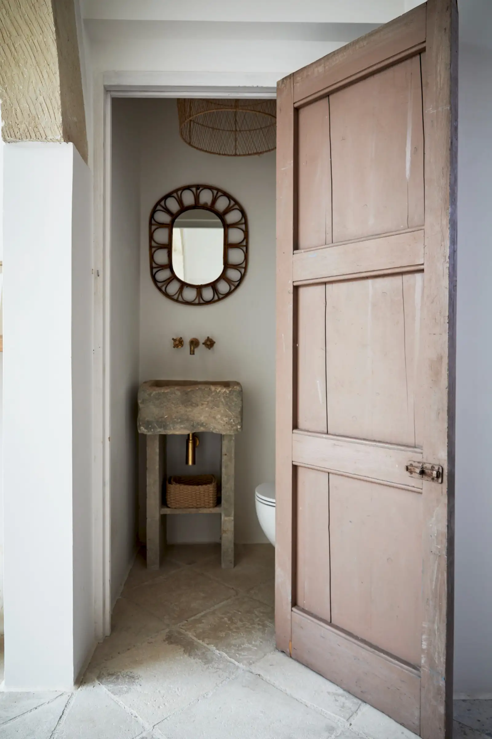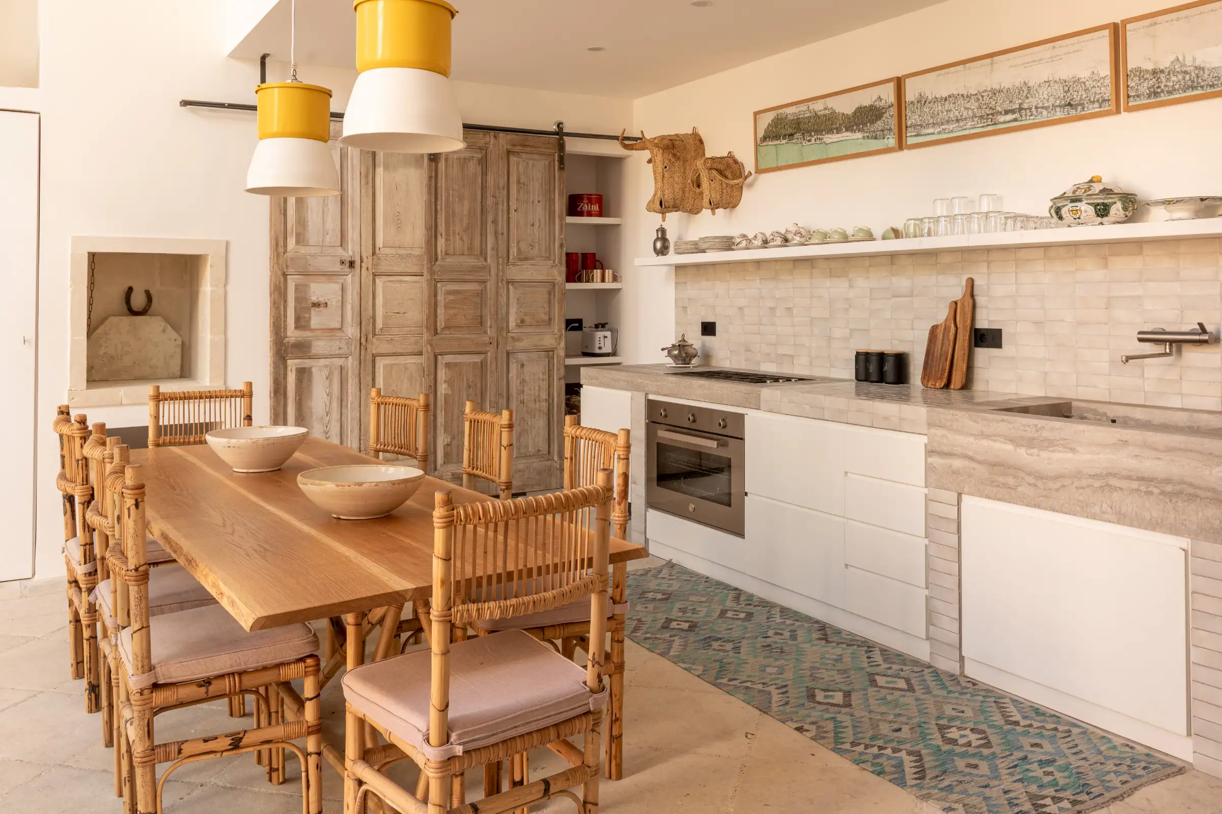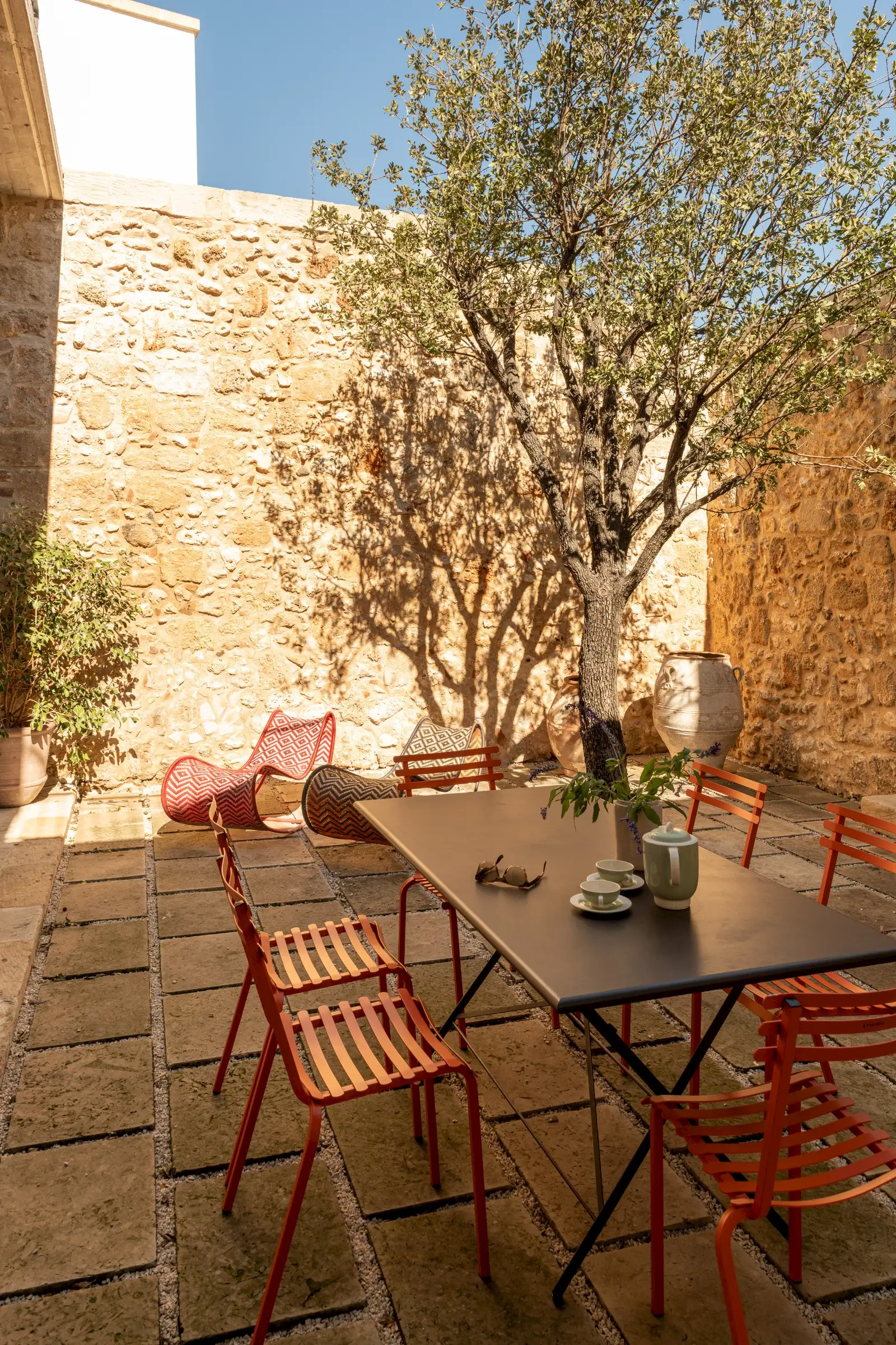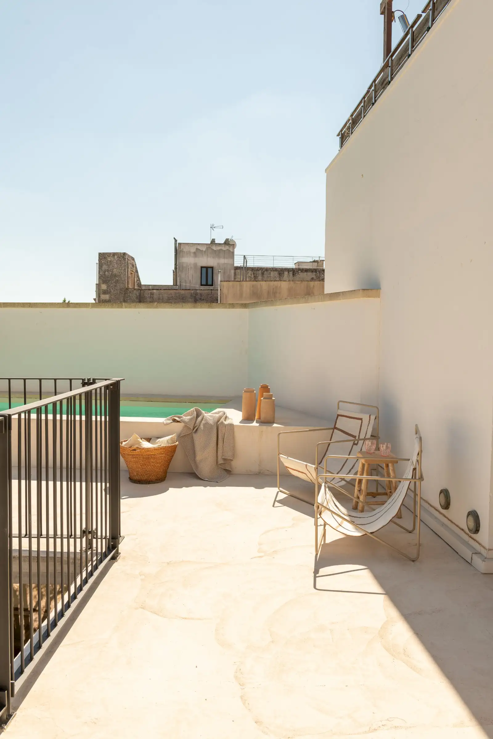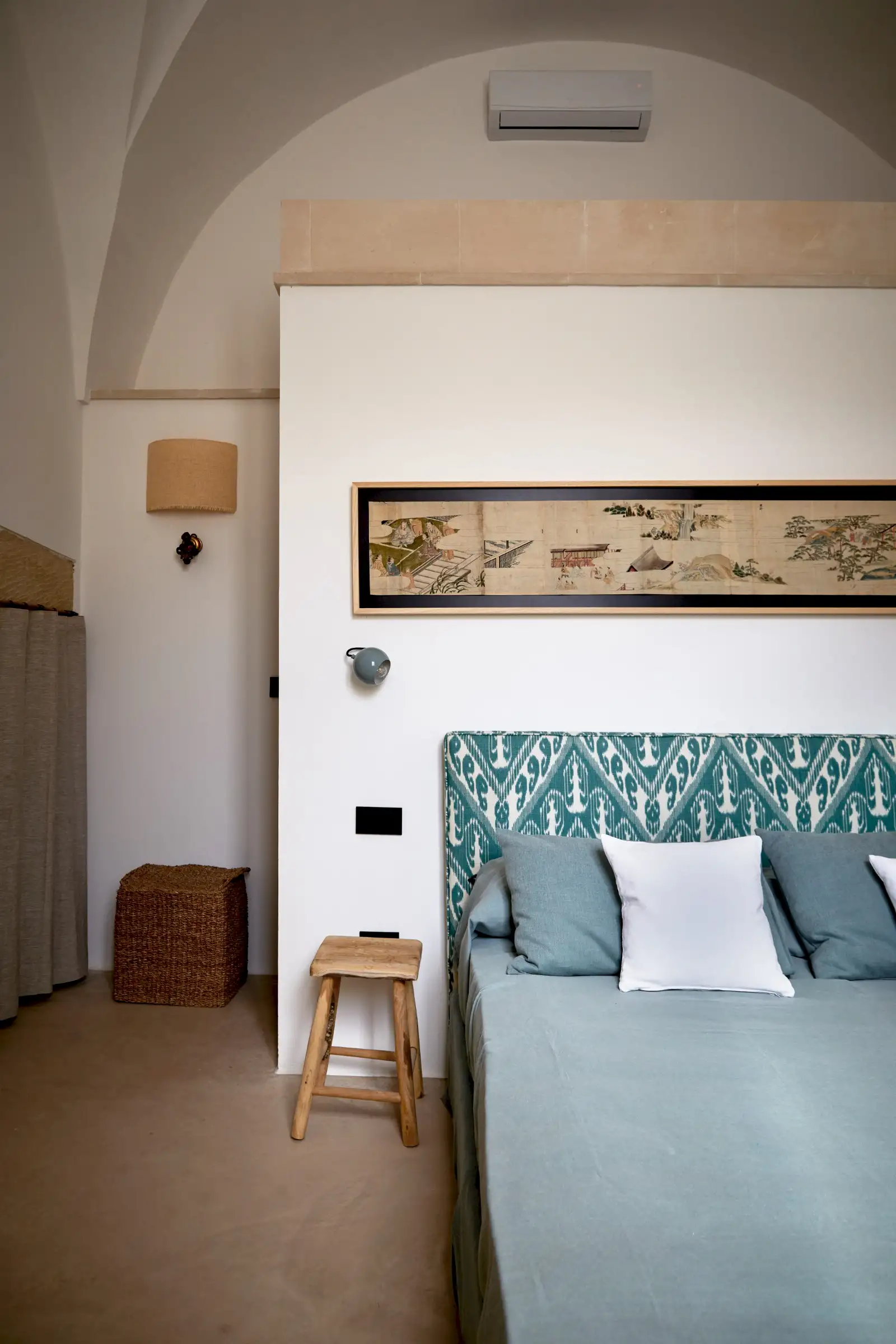 Guests leave the sun-baked street via a wooden door and step into the delicious cool of the entrance hall with its stone floor and star-vaulted ceiling. A ground-floor courtyard garden bathes the downstairs living room in soft light through the wall of floor-to-ceiling glass, while a small pool sits on top of the new kitchen extension.