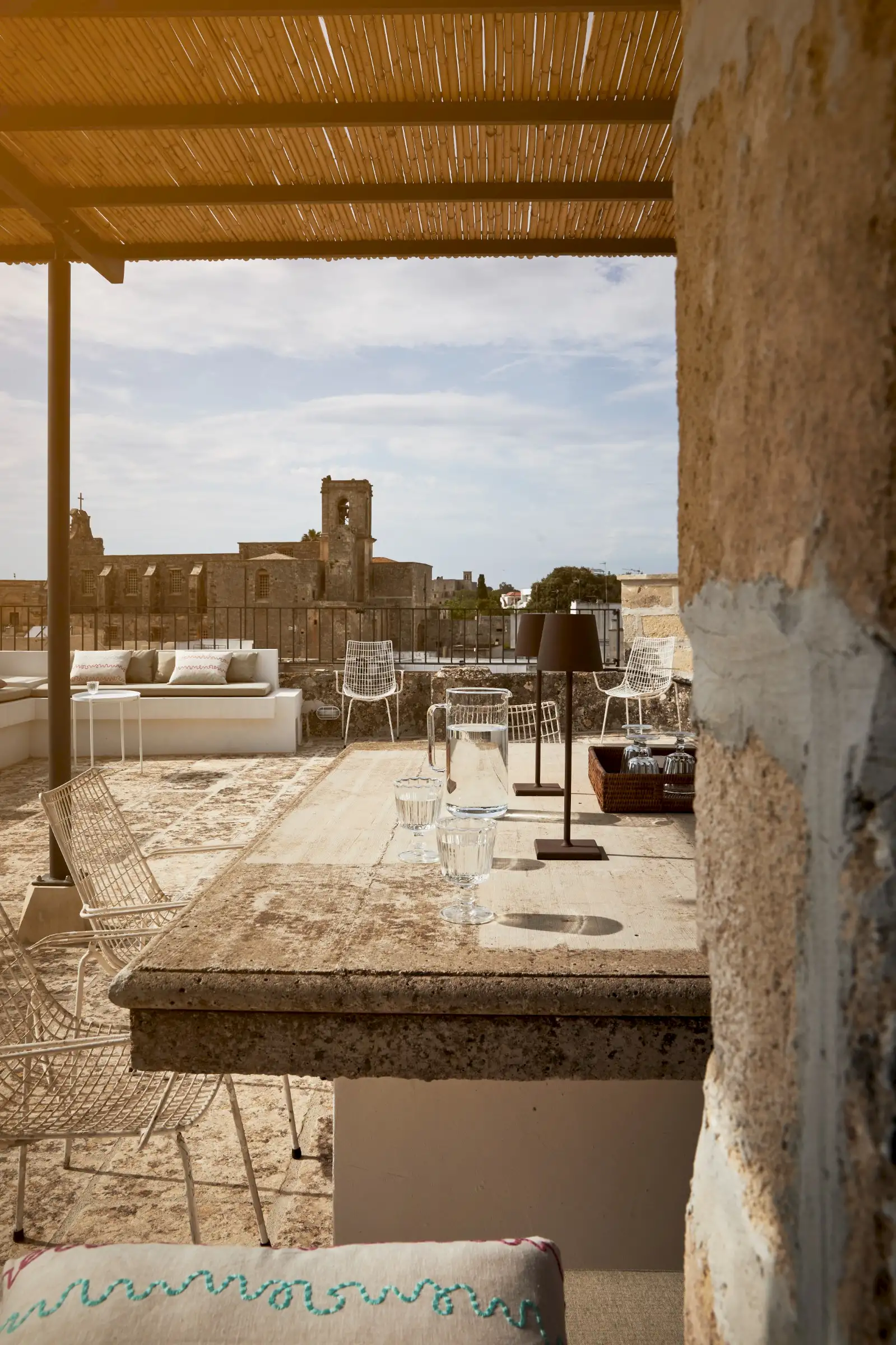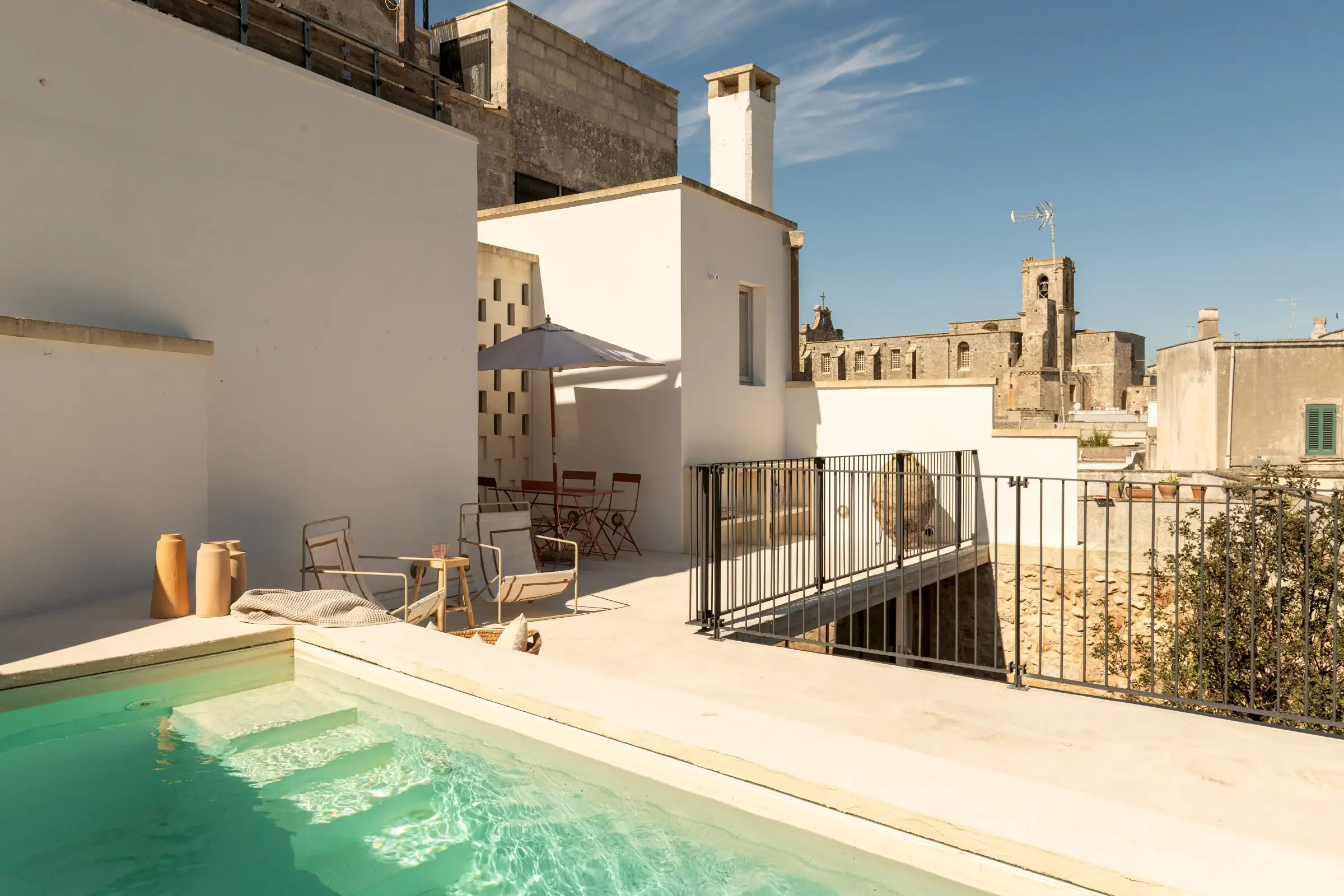 There are three spacious doubles and one twin – all with soaring star-vaulted ceilings and en-suite shower rooms. Then there are the outside spaces: a ground-floor courtyard, a first-floor plunge pool and sun terrace and, finally, a rooftop terrace with built-in sofas, a small kitchen, a large stone dining table and beautiful views over the town’s ancient rooftops.