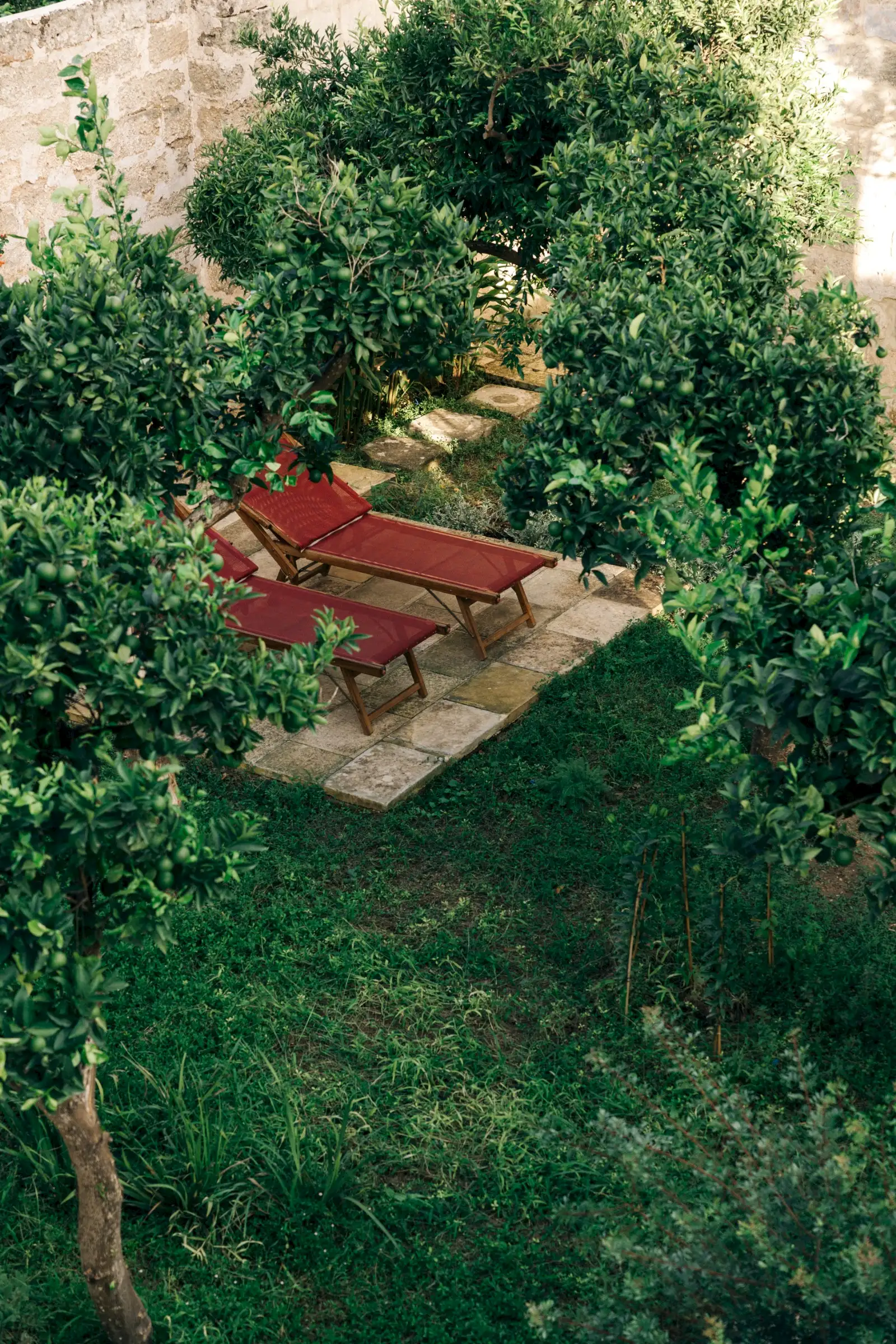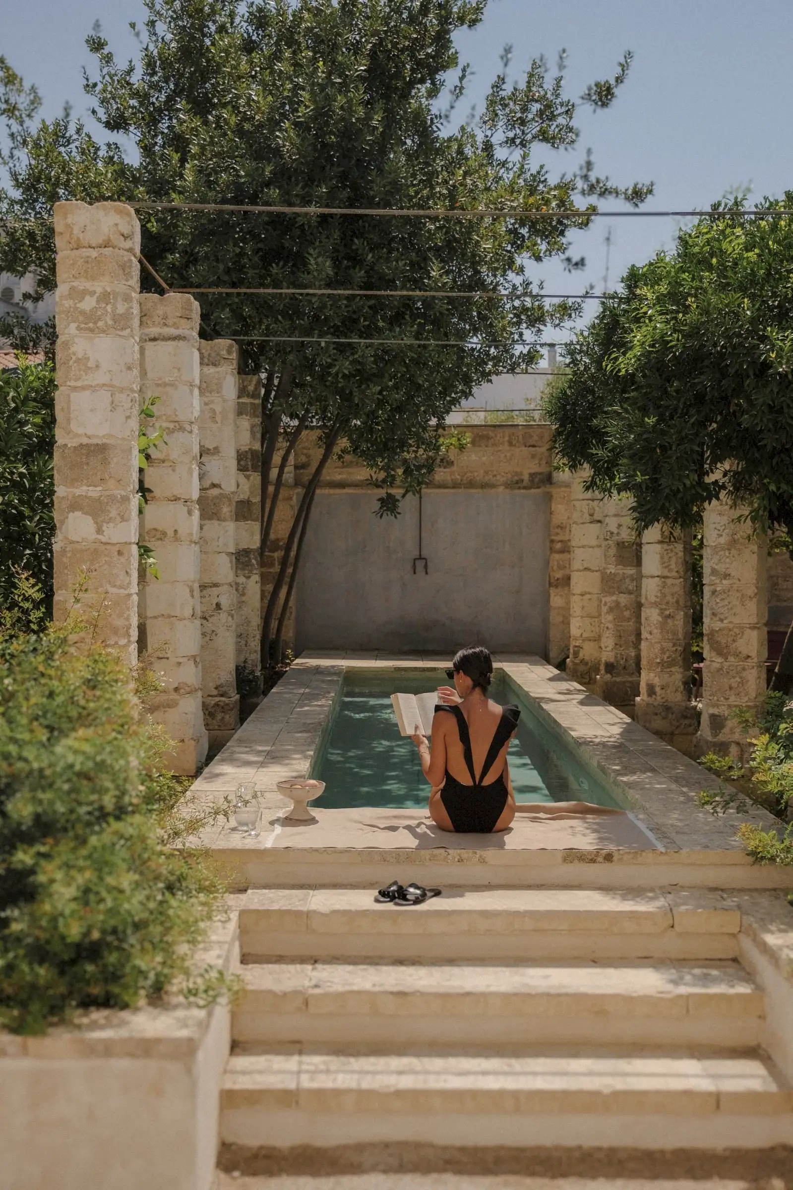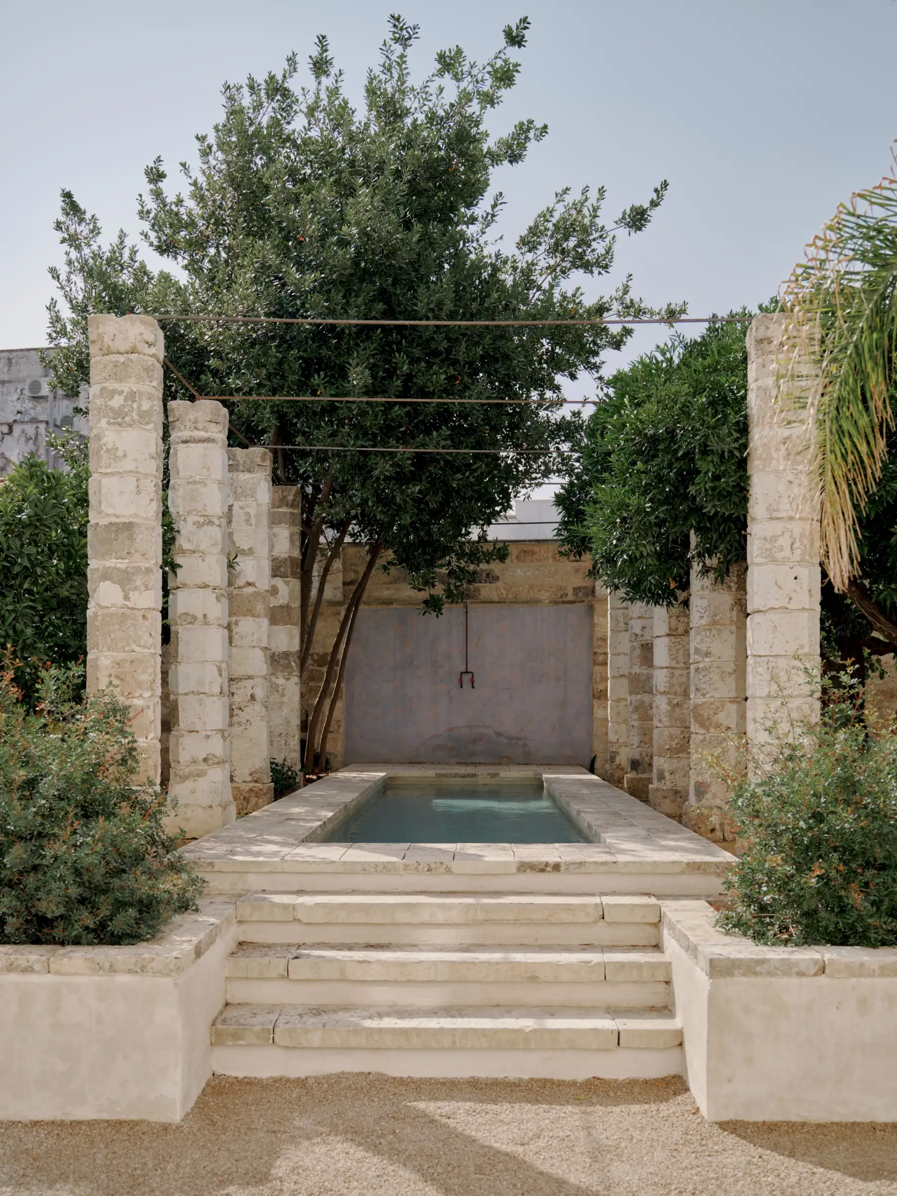 Outside, there is a lush walled garden with a long, colonnaded pool, fruit trees and palm trees, and a dining table under a pergola. Even better, the house is just a few steps from the town’s main piazza and guests can stroll to the restaurants, bars, shops and nearby food market.