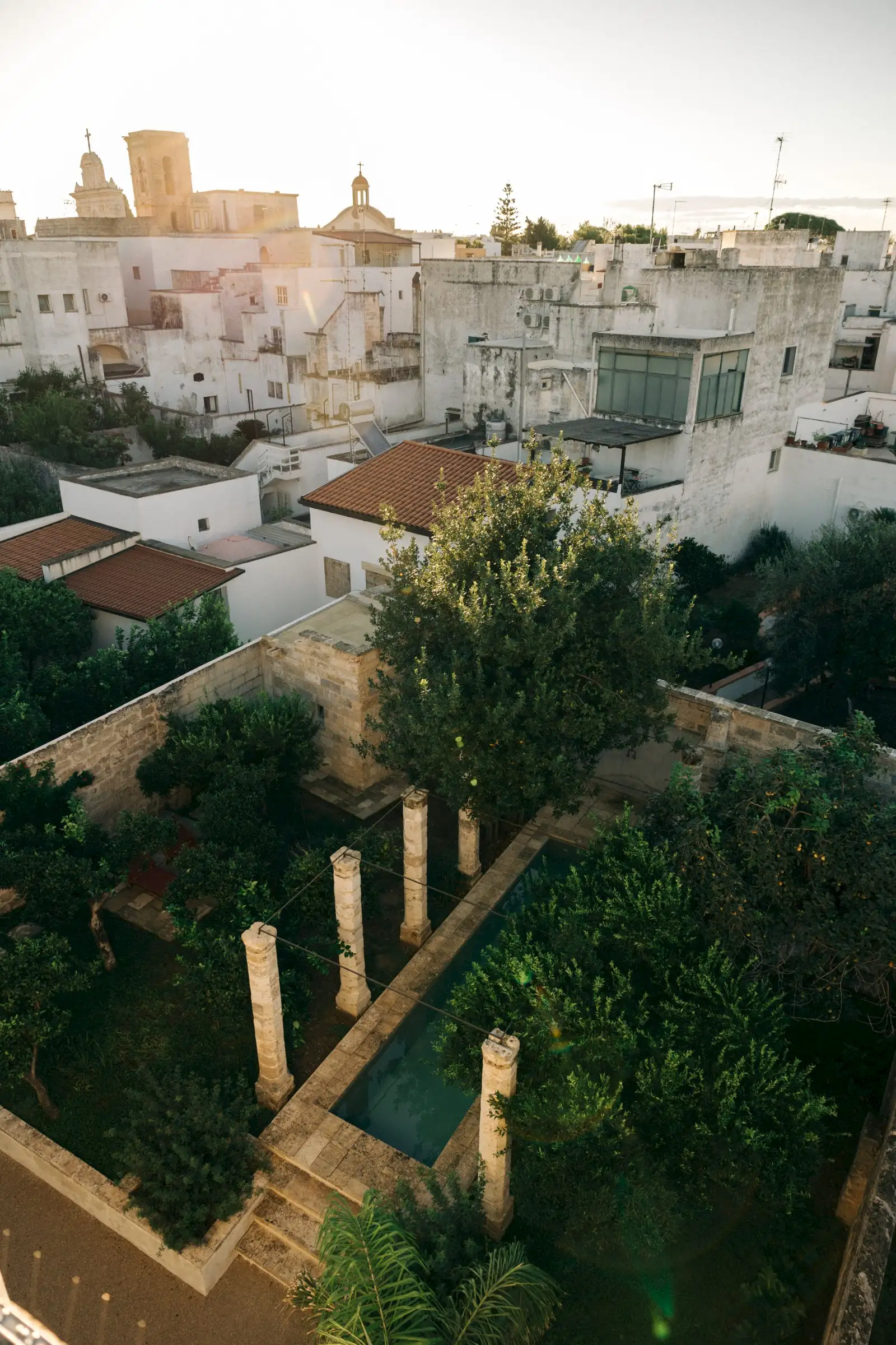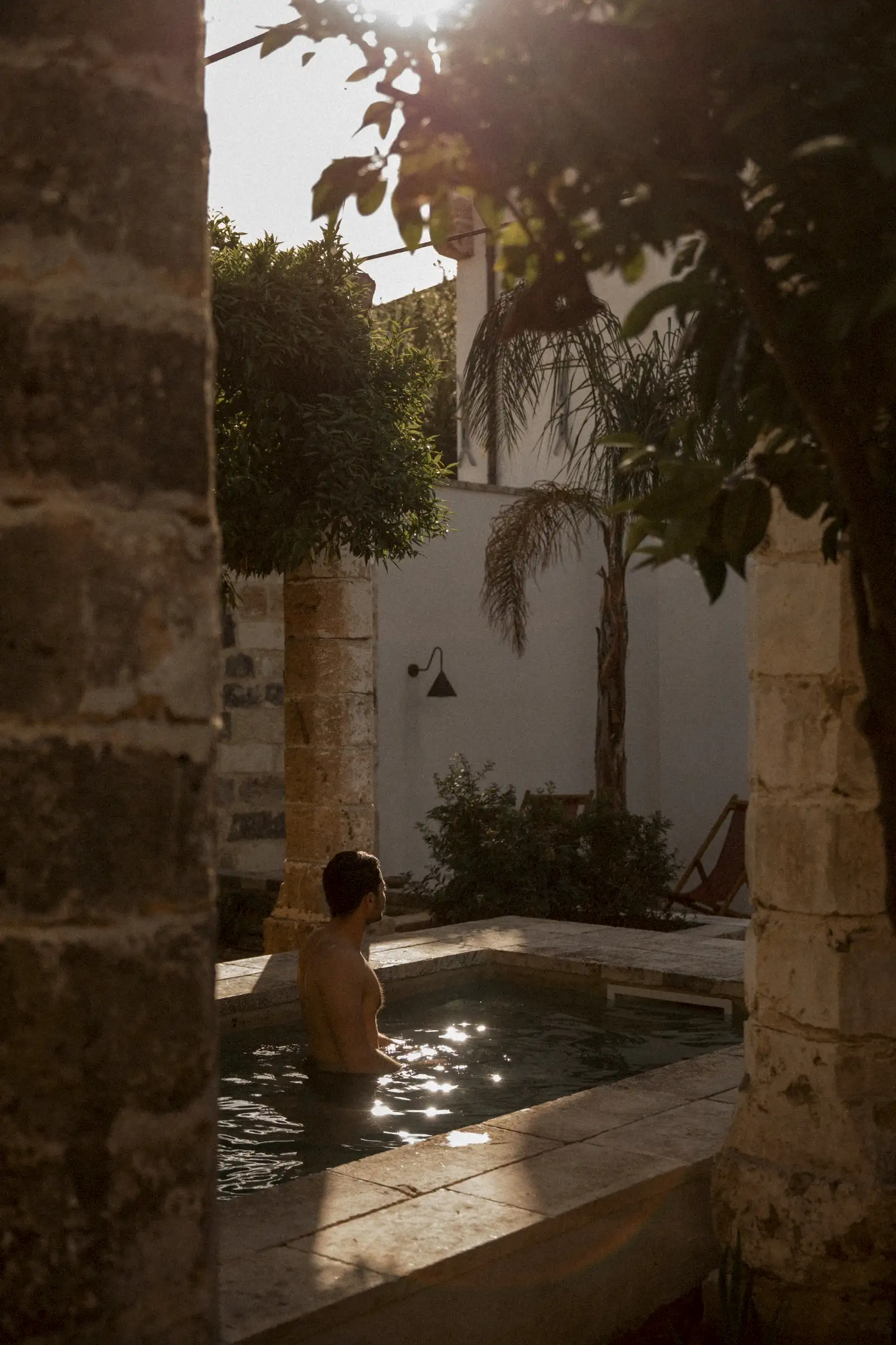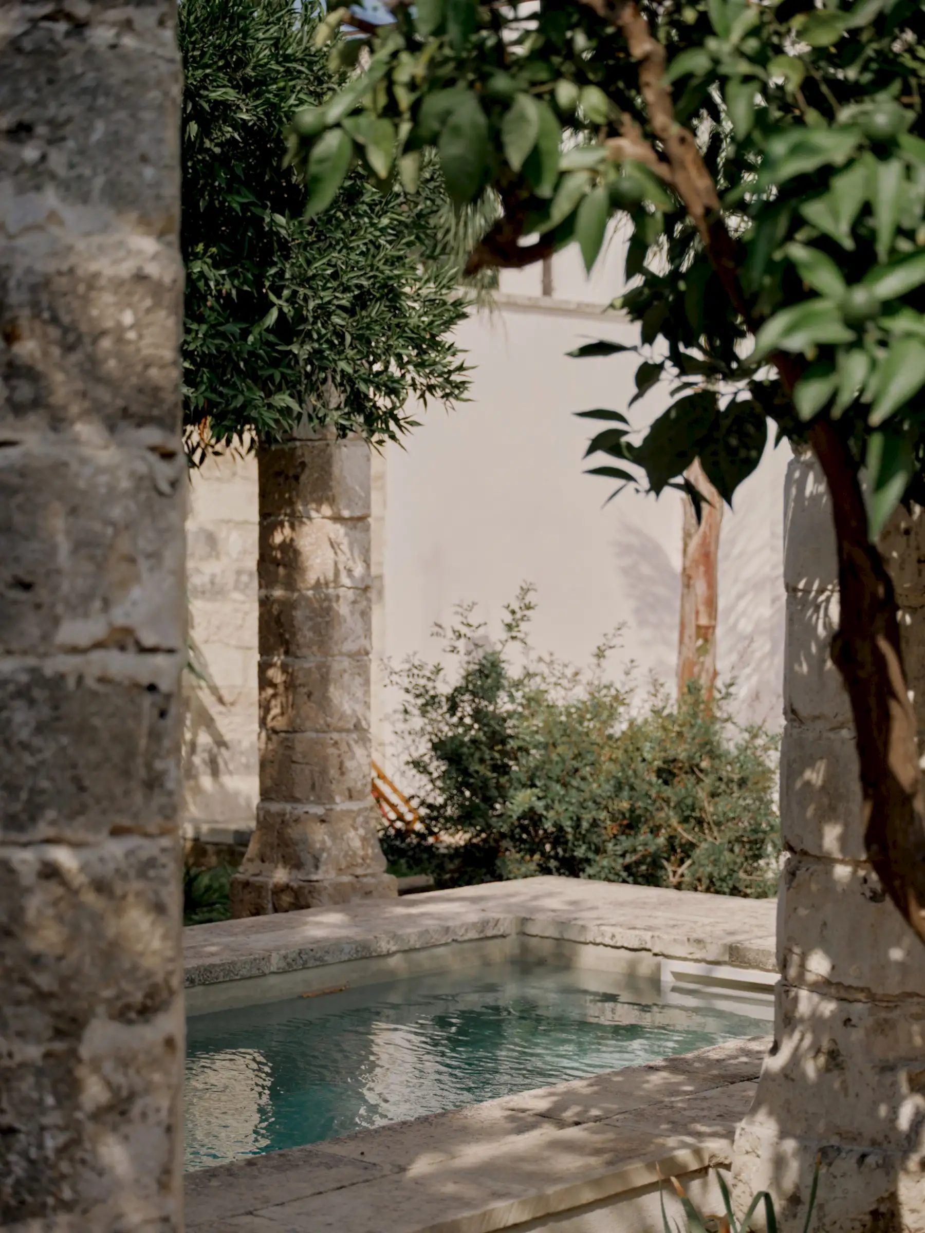 Outside, there is a lush walled garden with a long, colonnaded pool, fruit trees and palm trees, and a dining table under a pergola. Even better, the house is just a few steps from the town’s main piazza and guests can stroll to the restaurants, bars, shops and nearby food market.