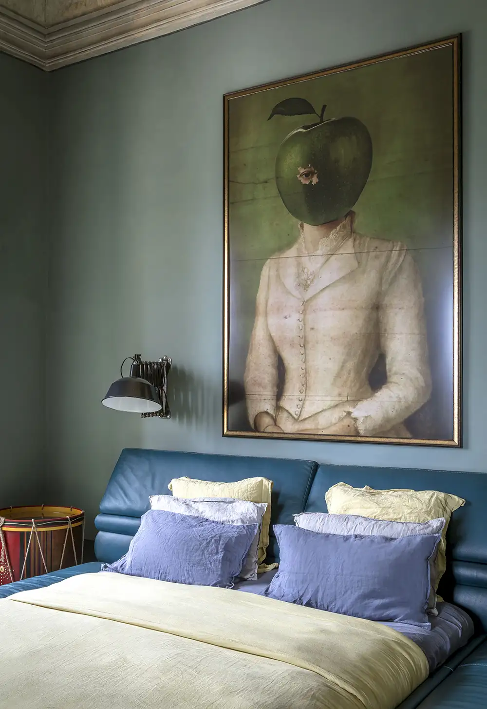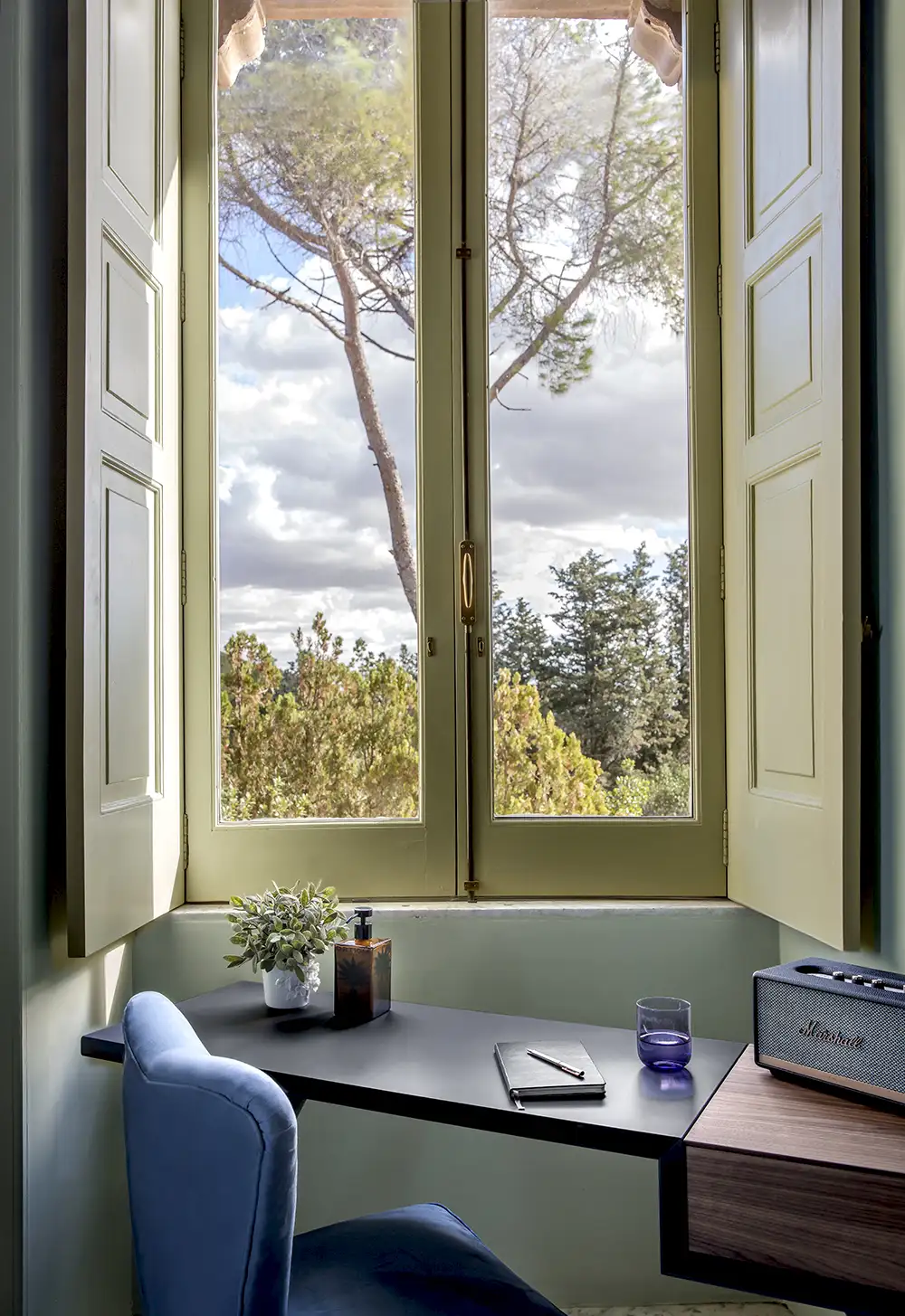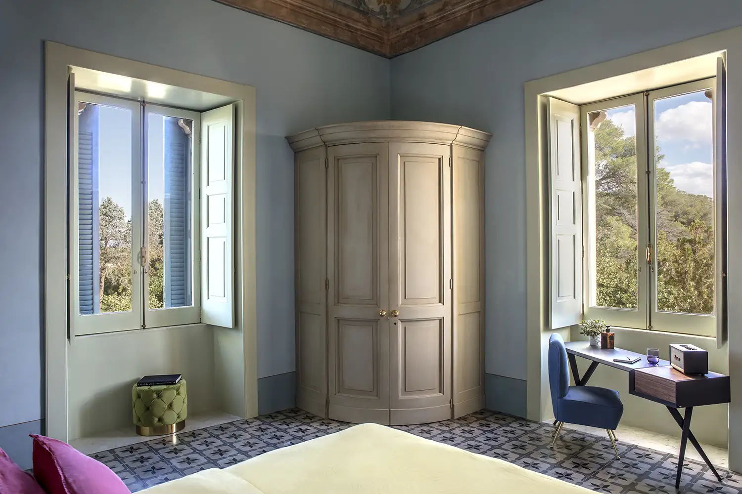 The Prince Suite is a regal shade of pale blue to complement the intricate design and colours of the restored fresco in the star-vault ceiling. The sumptuous super-king-size bed, upholstered in button-back velvet and dressed in pure linen is suitably princely. Original artwork decorates the walls and high-end modern technology comes as standard, hidden behind the restored historic features. The en-suite bathroom is equally grand and has a powerful rainfall shower and luxury bath products. Guests of the Prince and Princess suites have exclusive access to a private salon with a balcony overlooking parkland and an olive grove.