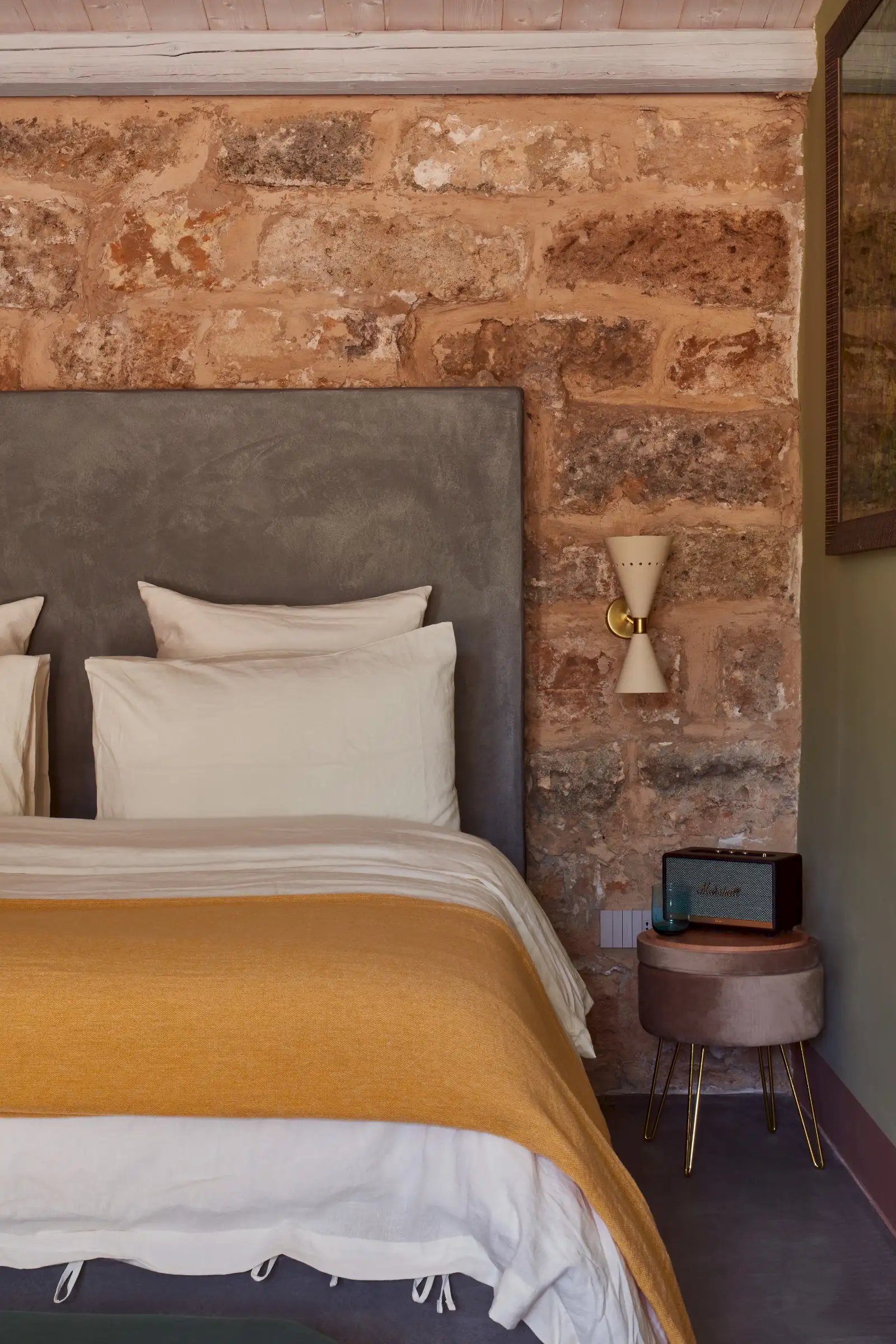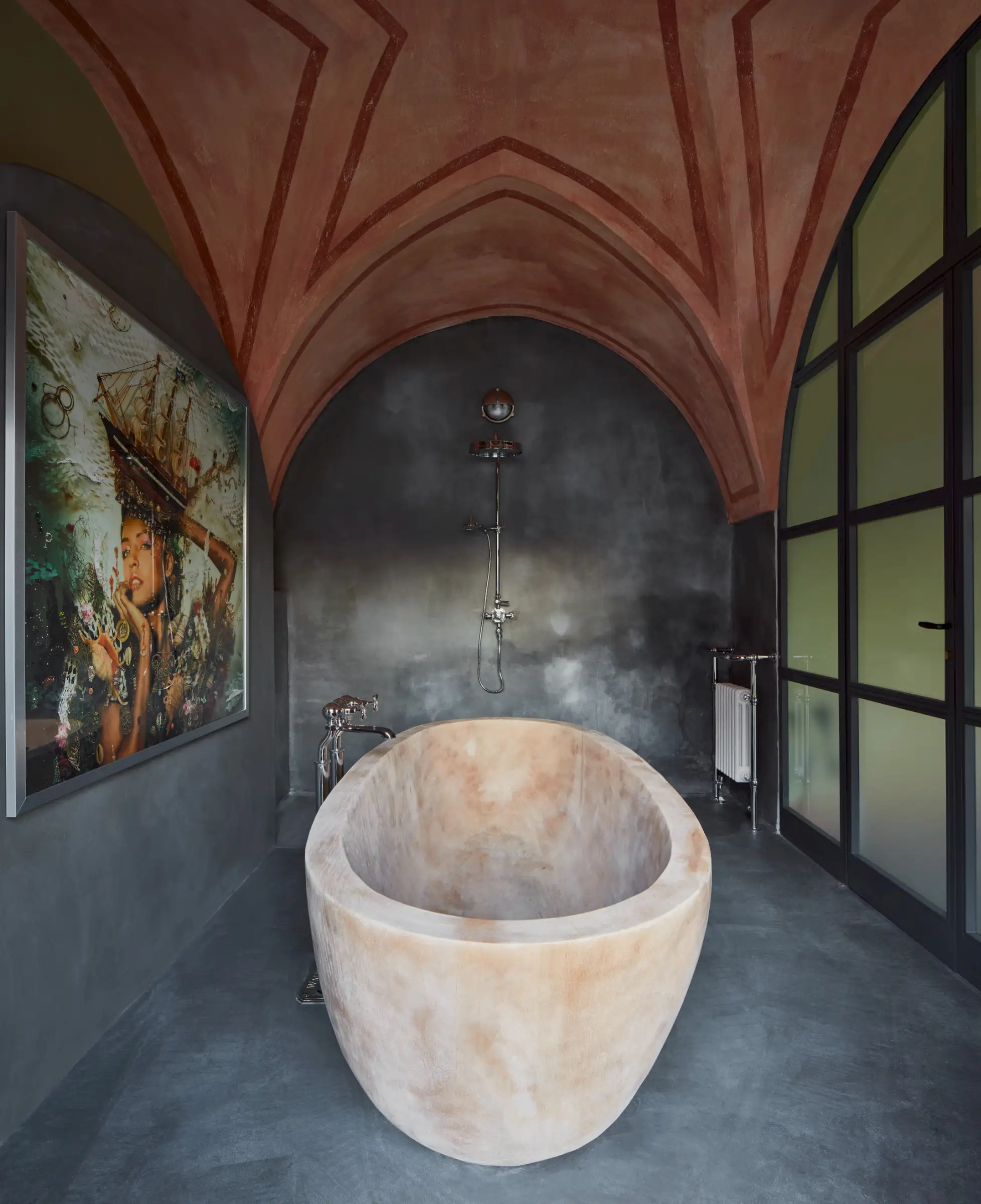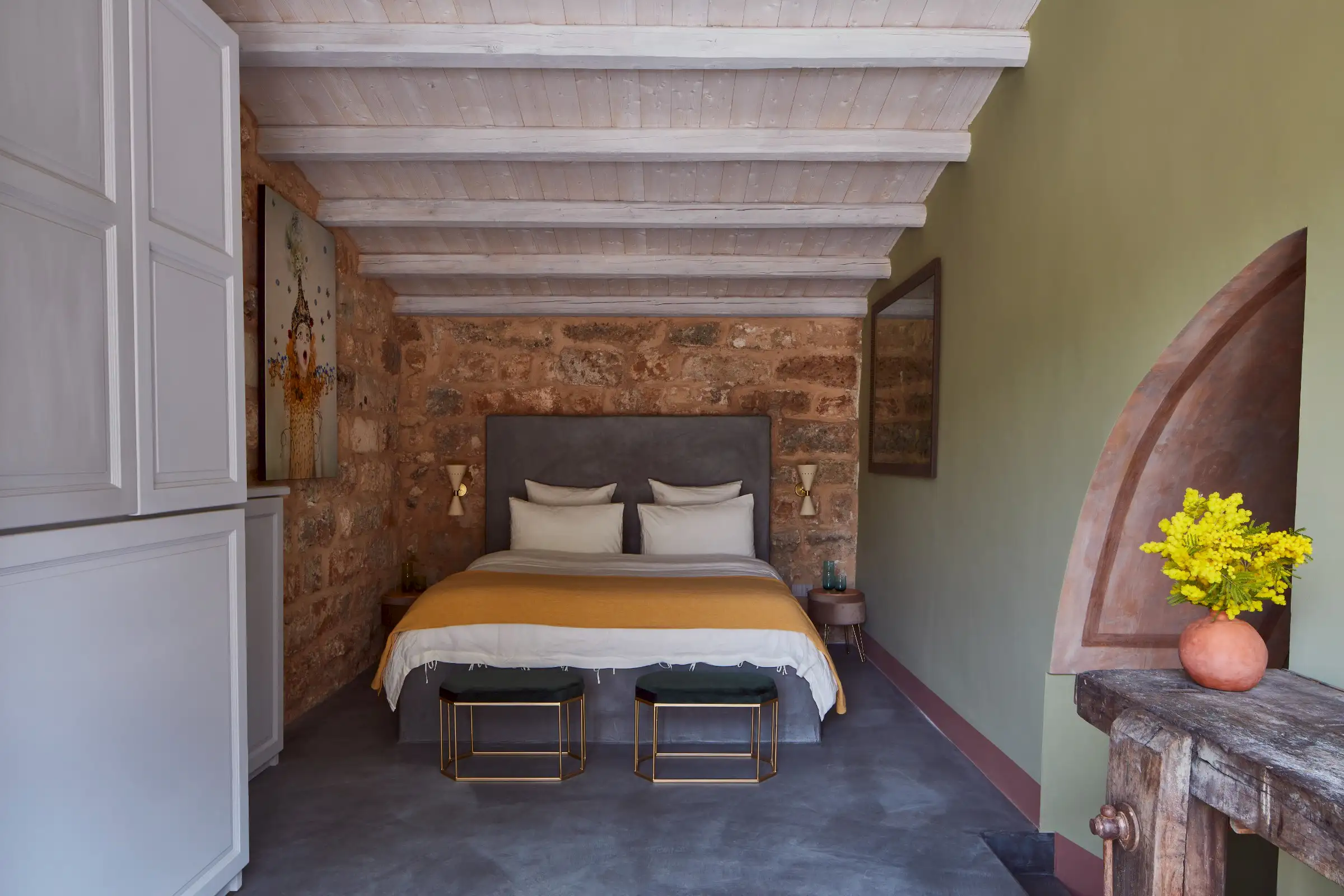 In the en-suite, a carved marble bath sits behind a Crittall screen with a beautiful sculptural day bed on the other side, encouraging guests to bathe like royalty and to lounge around in blissful privacy. The Queen suite also provides a luxurious private salon overlooking the pool and garden: the perfect spot for a morning coffee or evening cocktail.