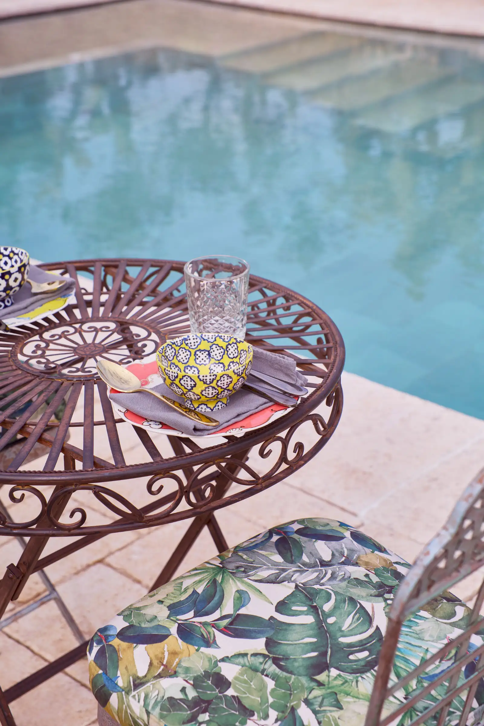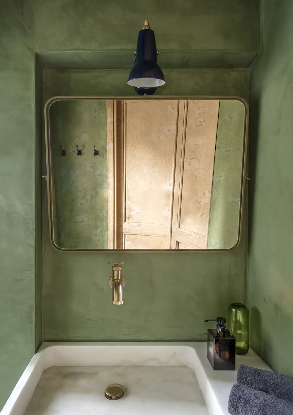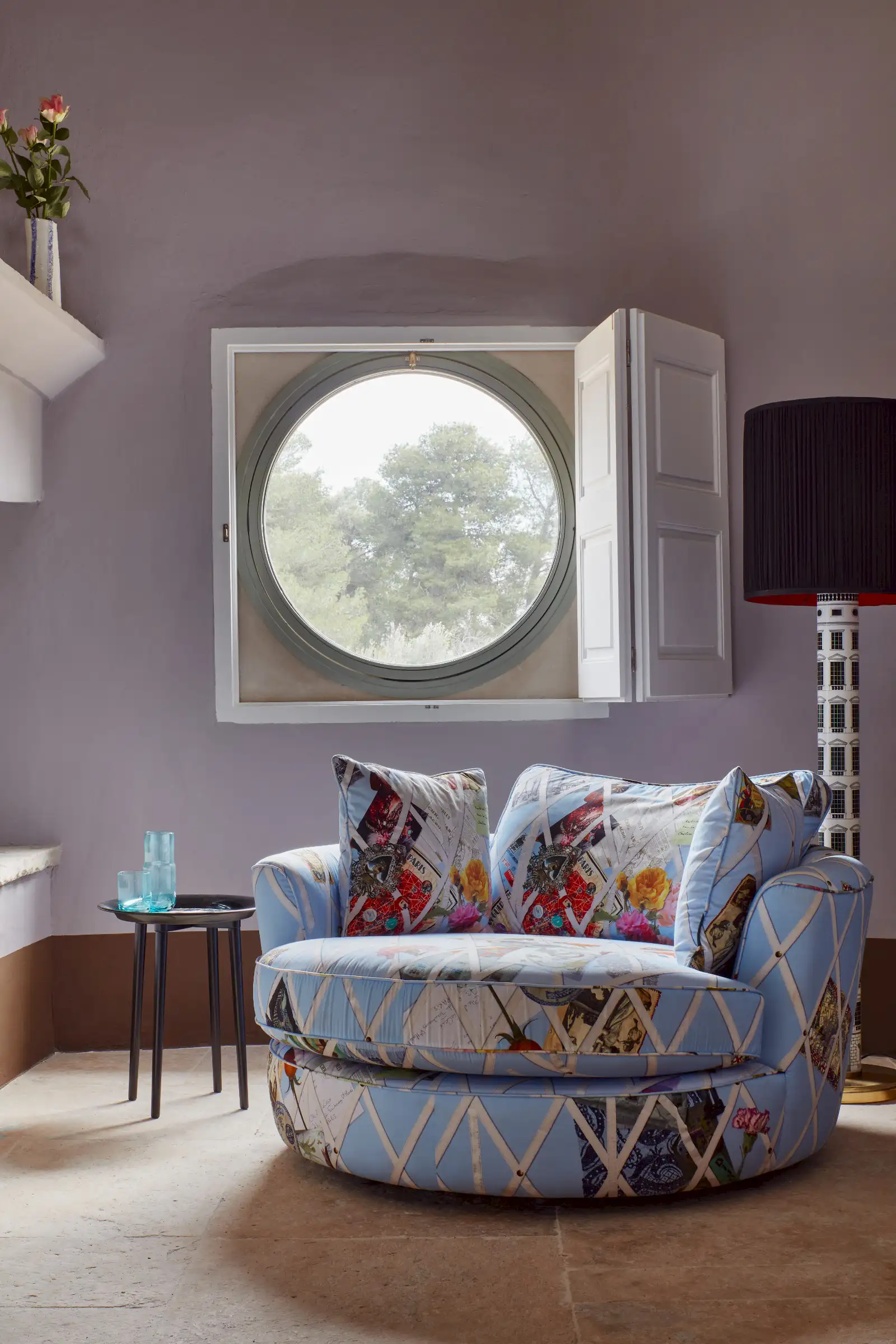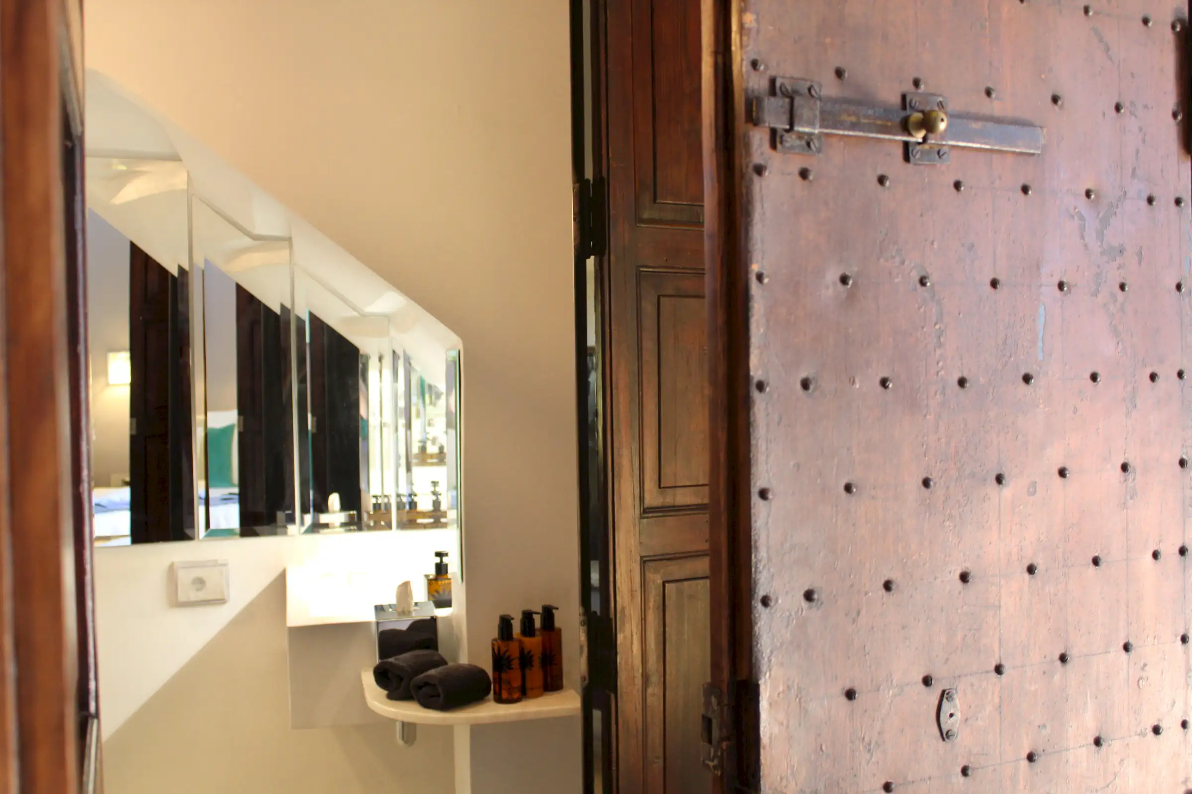 In the en-suite, a carved marble bath sits behind a Crittall screen with a beautiful sculptural day bed on the other side, encouraging guests to bathe like royalty and to lounge around in blissful privacy. The Queen suite also provides a luxurious private salon overlooking the pool and garden: the perfect spot for a morning coffee or evening cocktail.